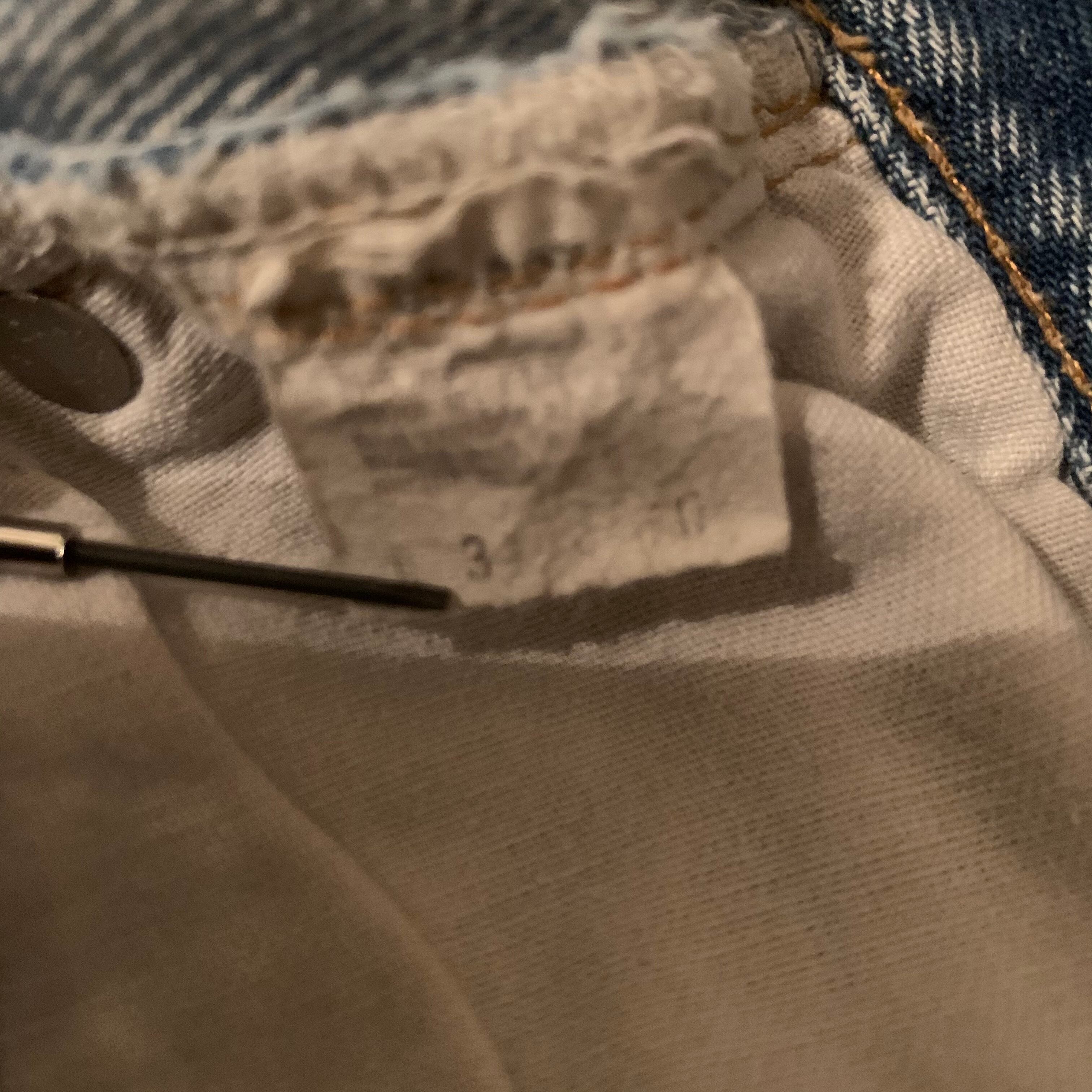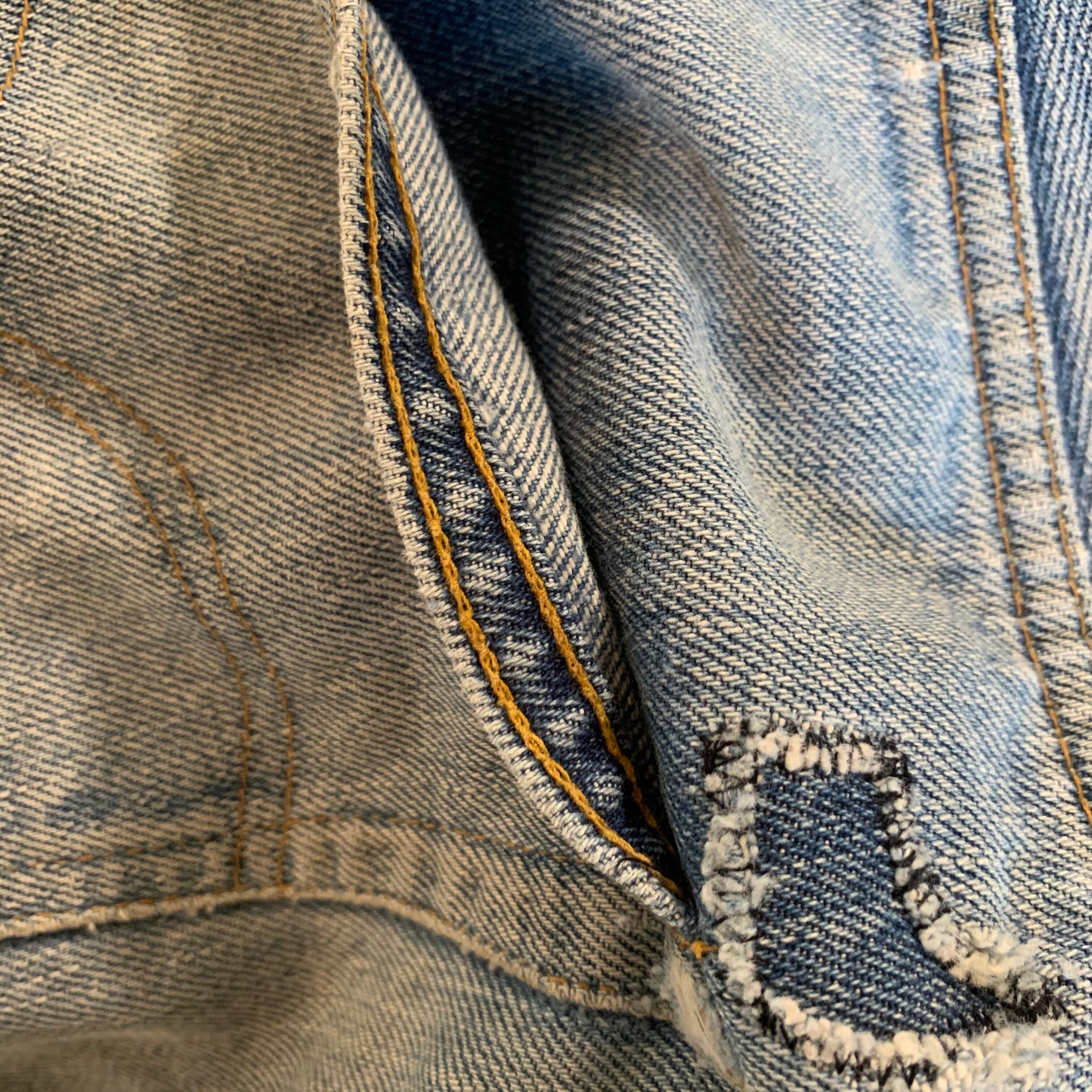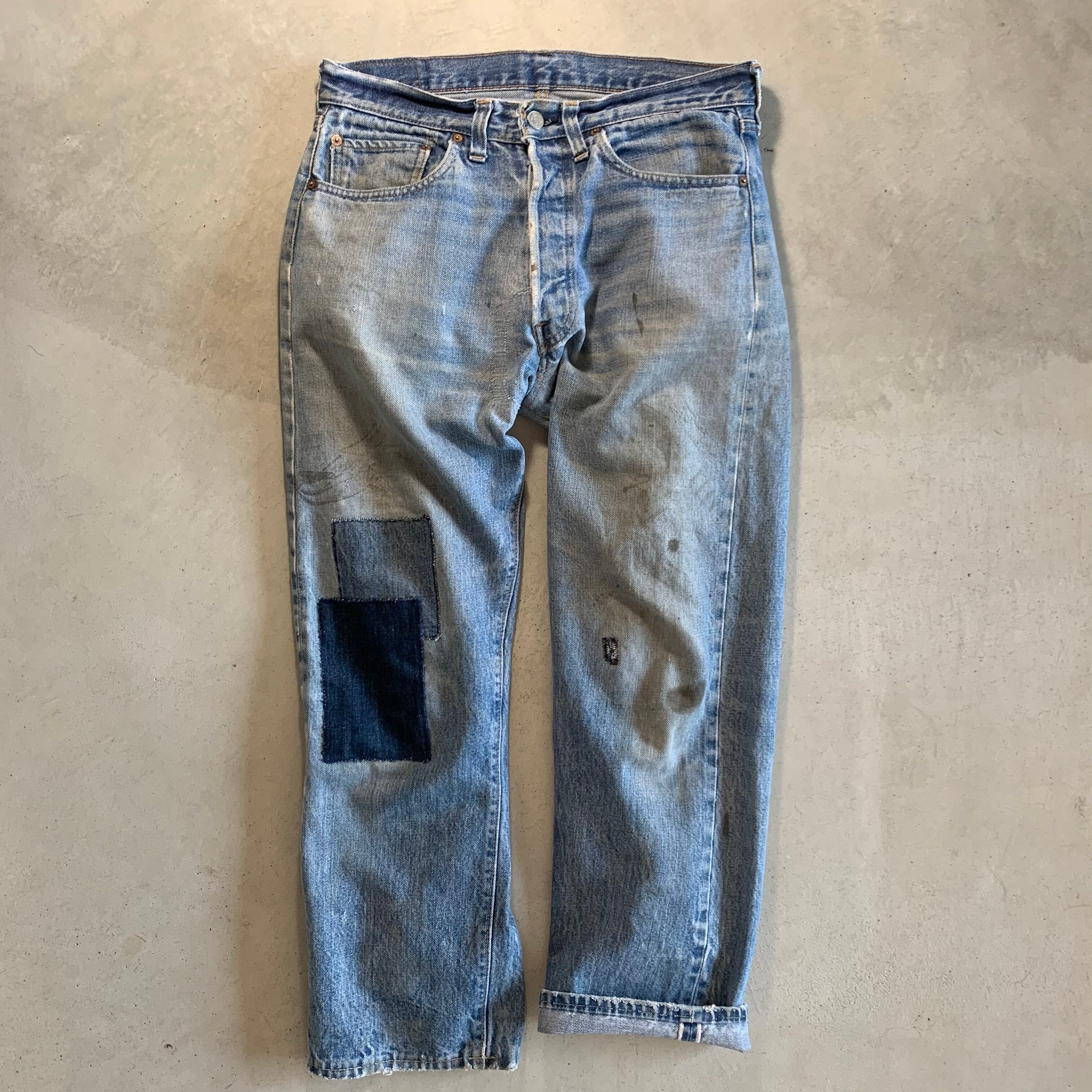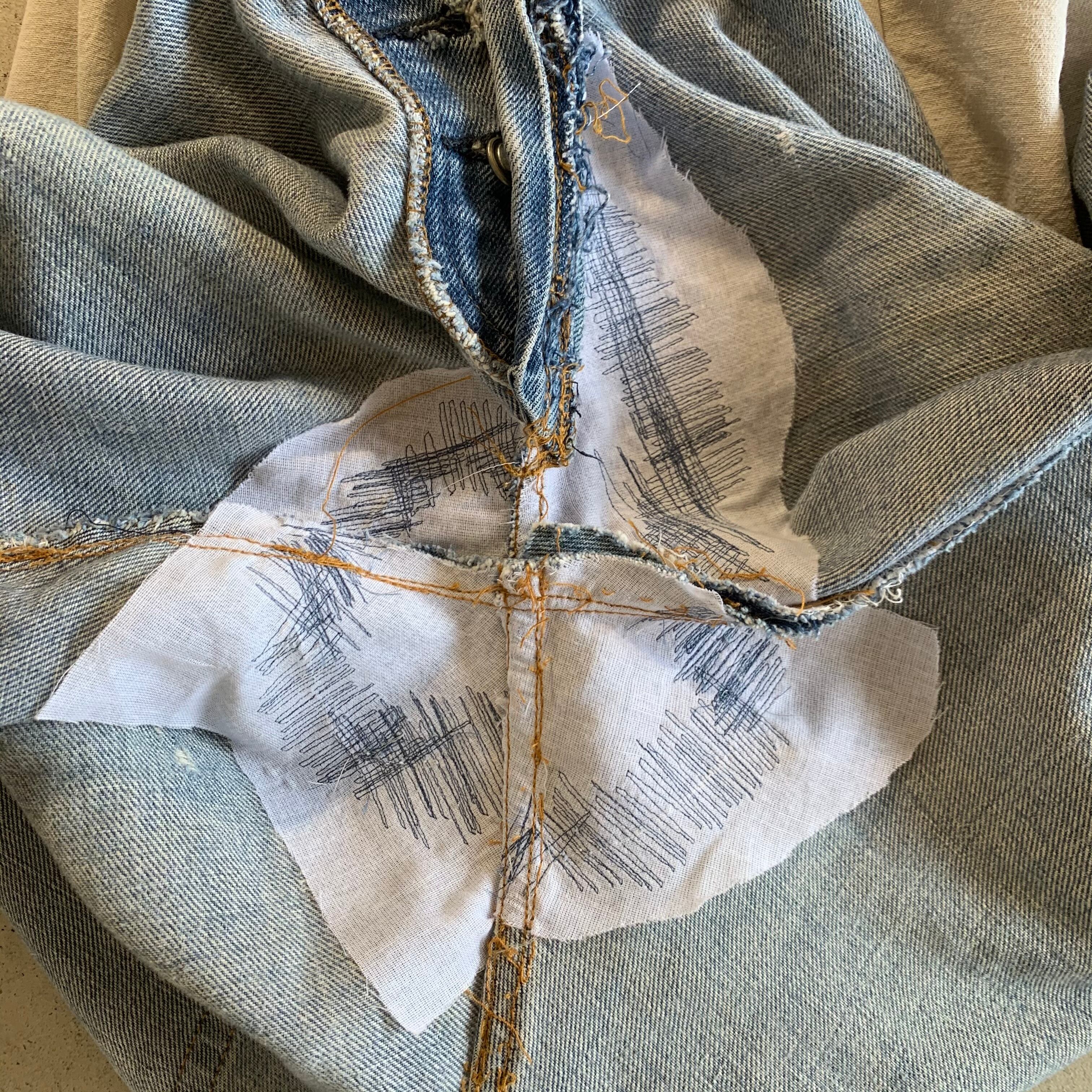 股のダメージが酷かったため別の501のデニムパンツから生地を移植してたたいて修繕(メンディング)しております。
