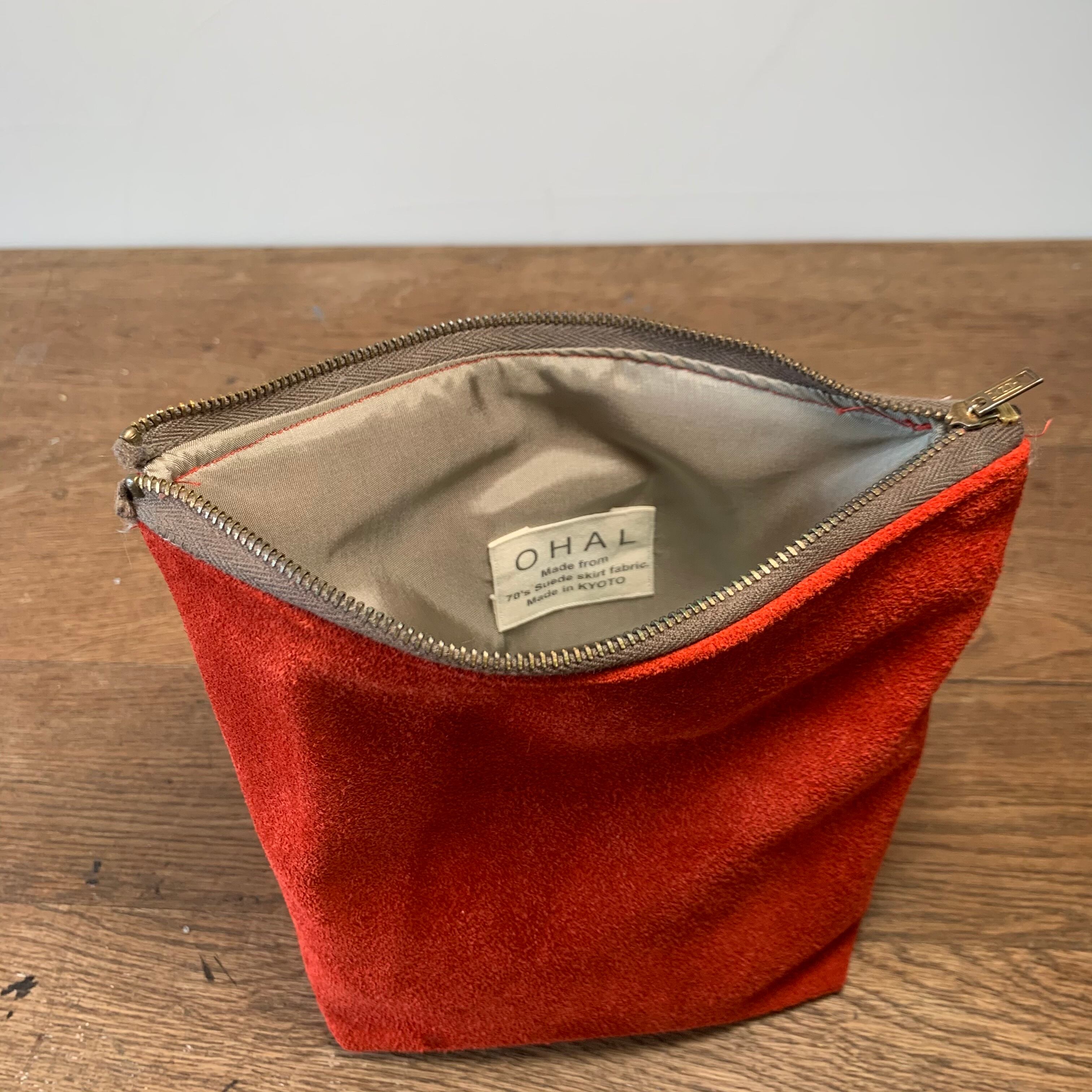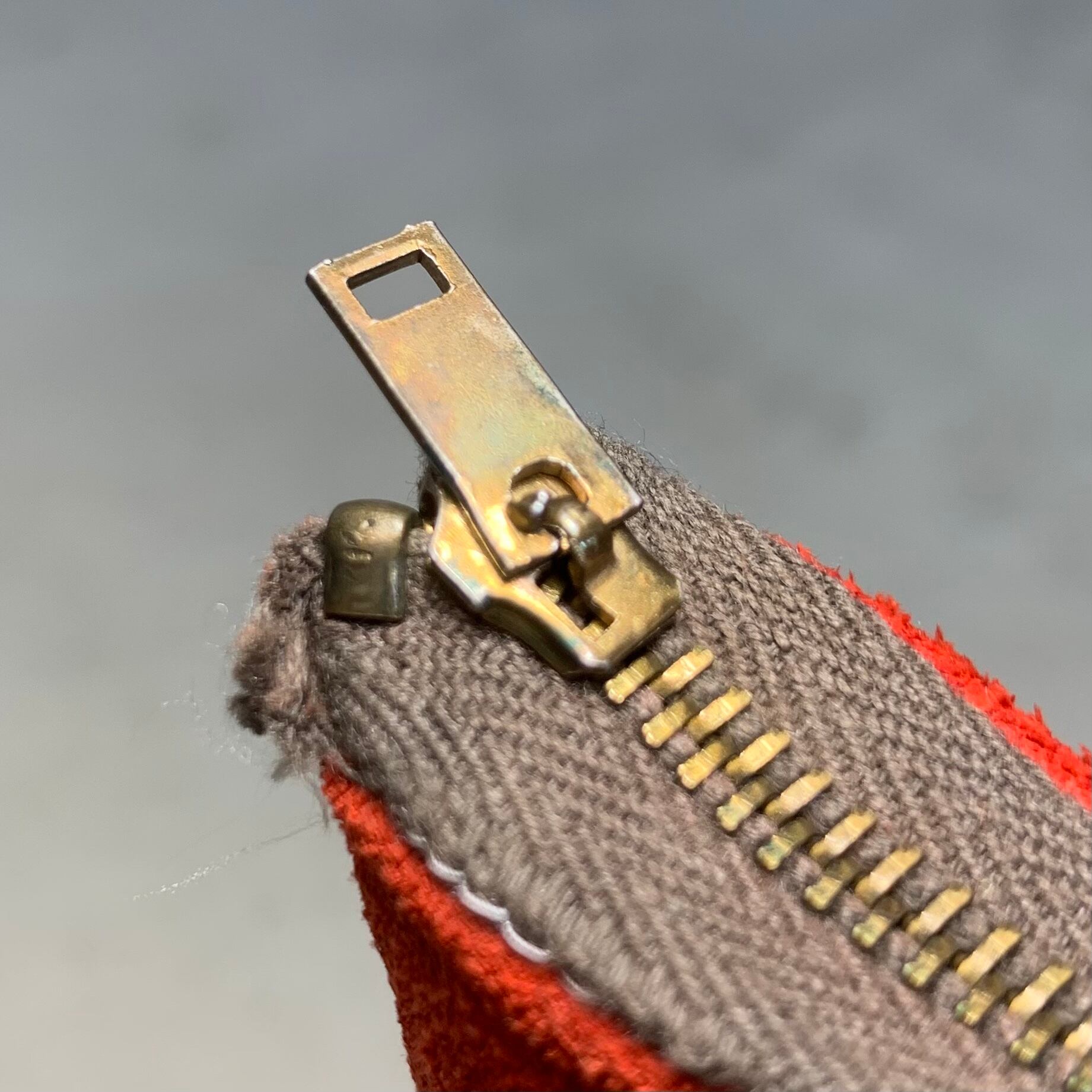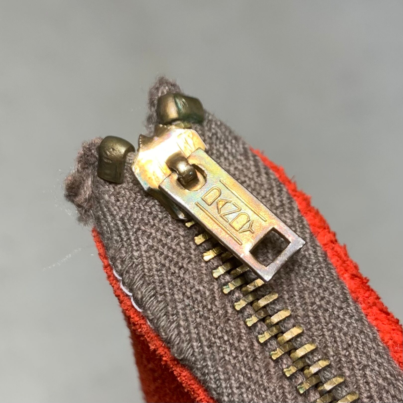 70年代のスエードスカートの生地で作ったマチ付きのポーチです。ジップはスカートで使われていたヴィンテージのジップになります。片爪のファスナーで"DANDY"と記載されています。ヴィンテージのファスナーですが滑りもよく開け閉めしやすいです。良い味だしています。