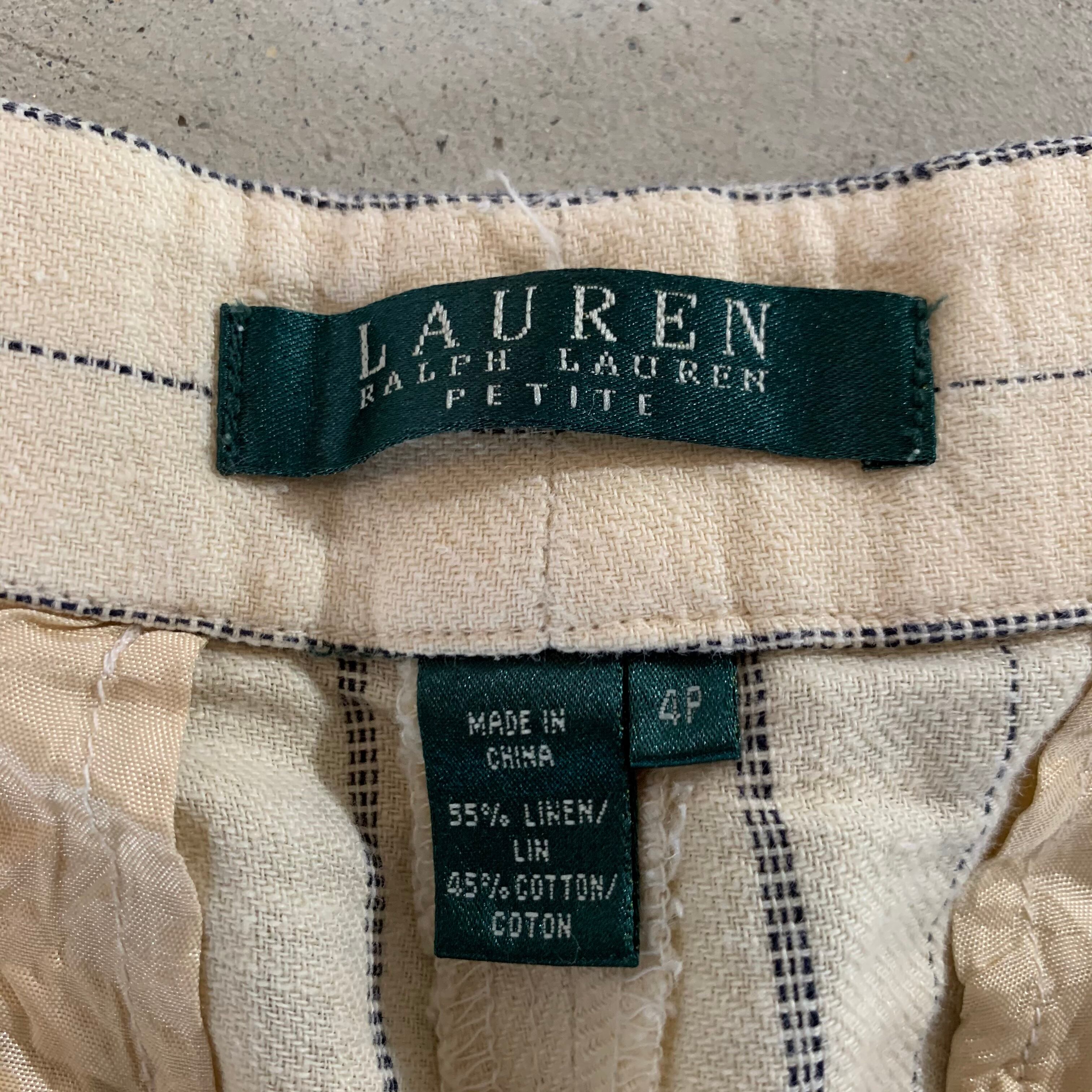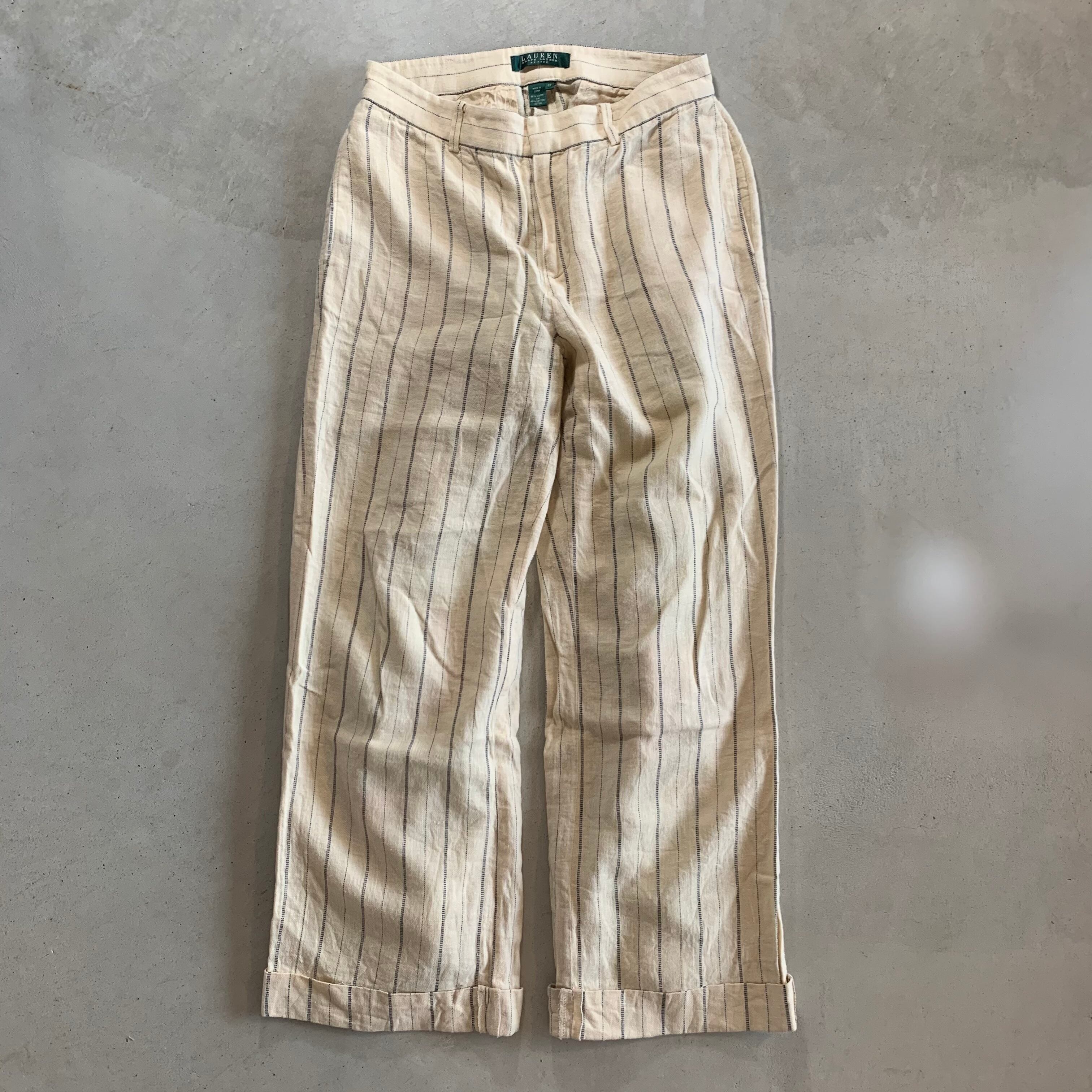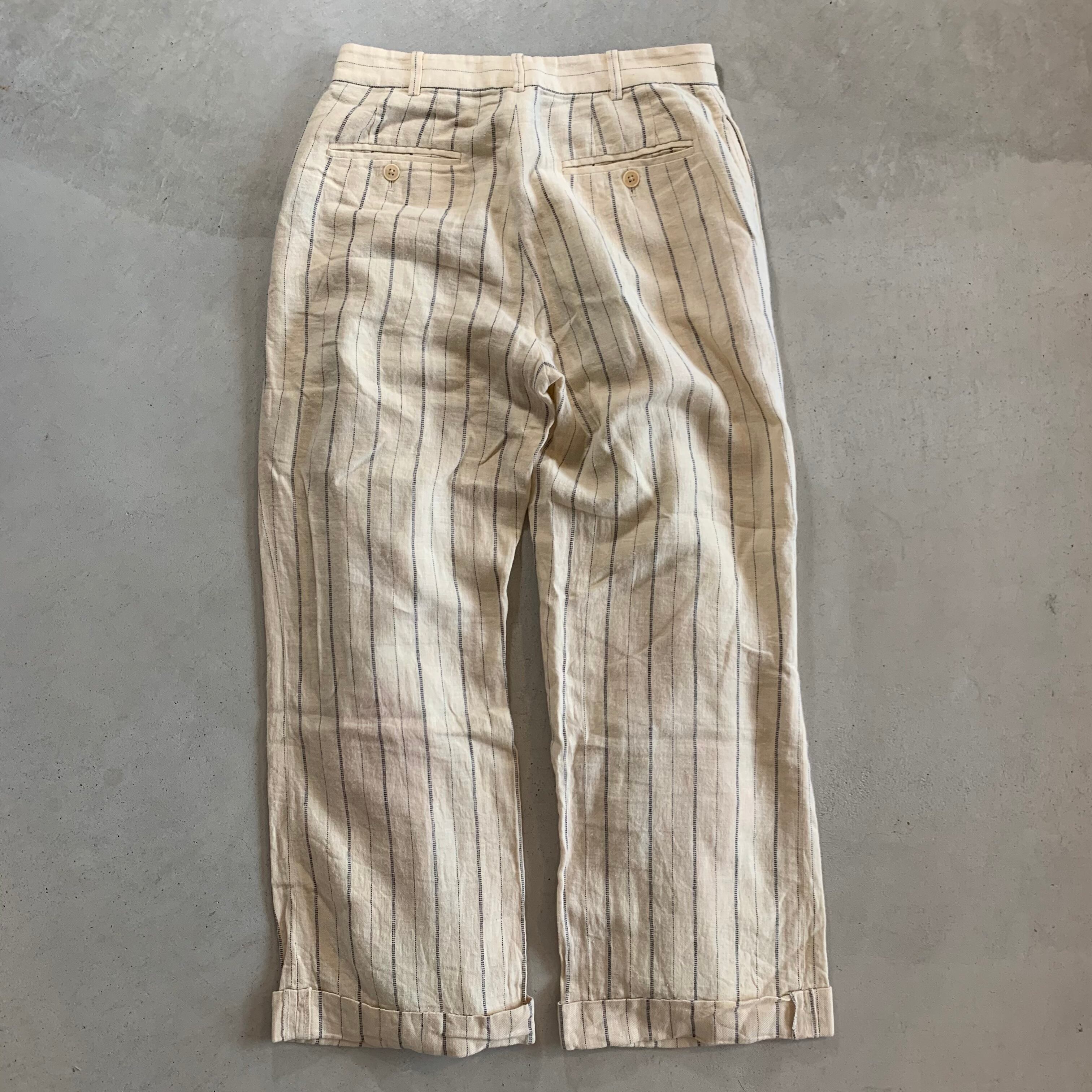 Laurenのリネンワイドパンツ。ストライプはプリントではなくジャガード。生地からこだわって作られた一本。