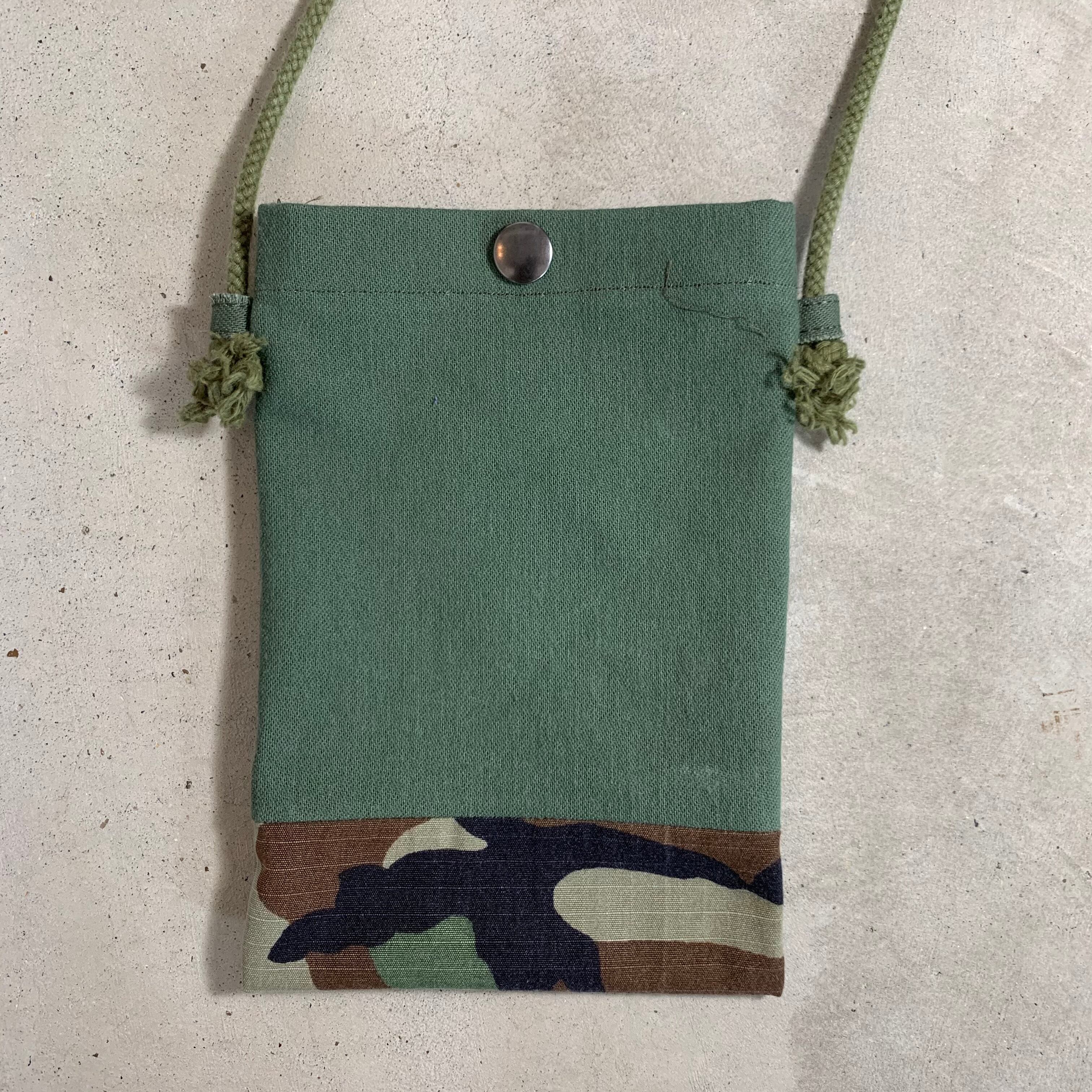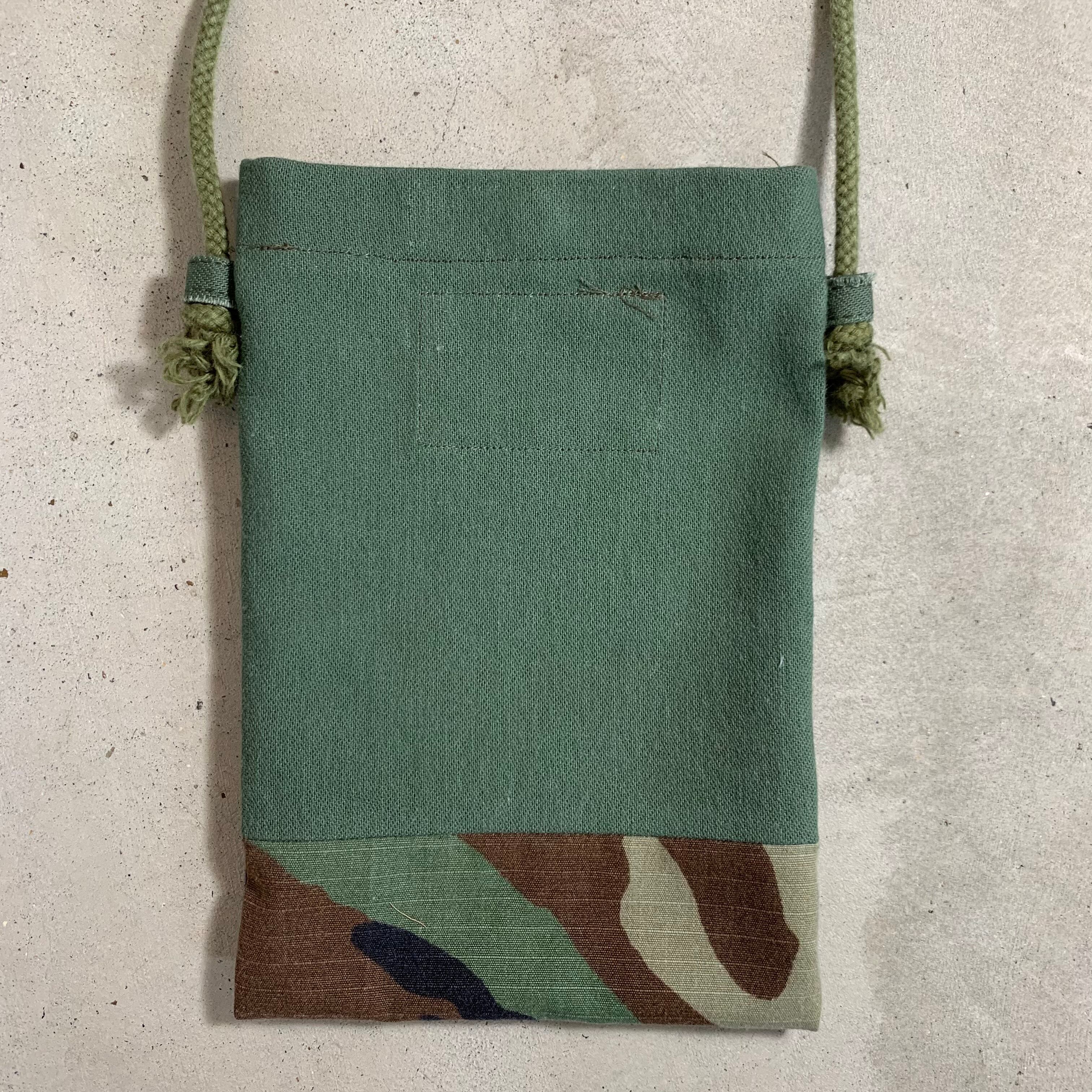 米軍のランドリーバッグを解体し作成したサコッシュです。下部の切り替え部分も米軍のウッドランドカモの生地、ドローコードも米軍で使われていた物を使用しております。ドットボタンは新品の物になります。