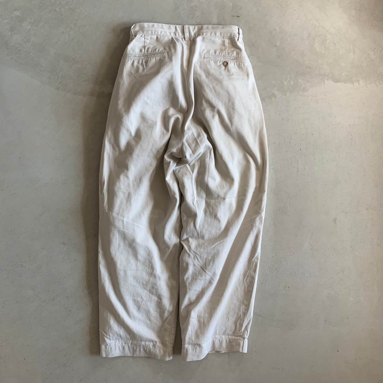 ラルフローレンのタックパンツで表記のサイズには32とありめすが、ウエストをつめてタックをつくっているので表記サイズと実寸サイズは異なります。