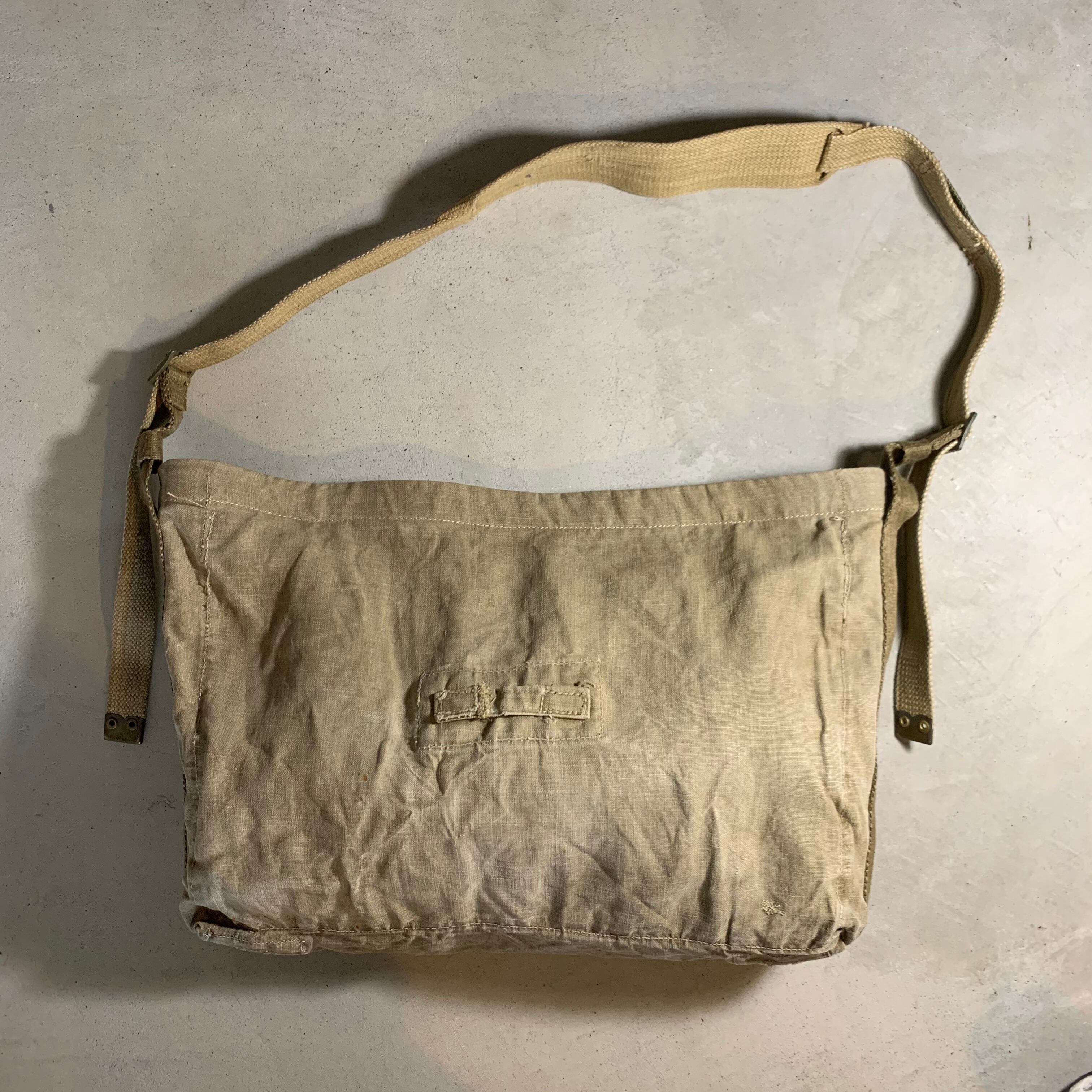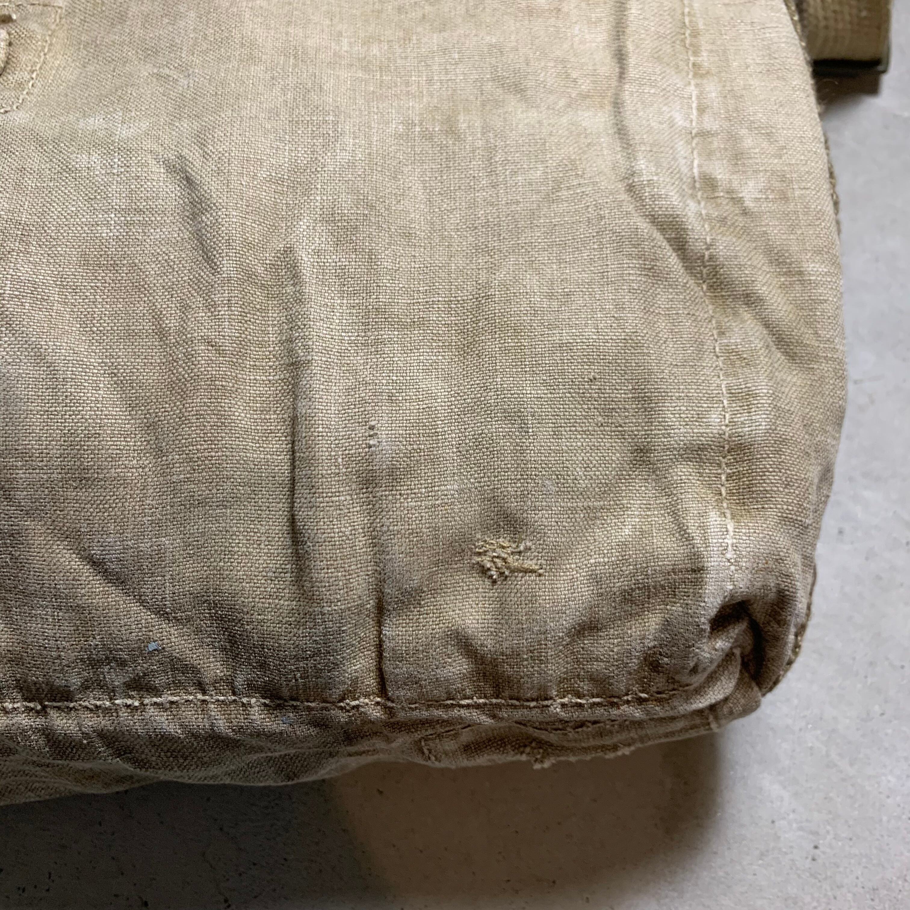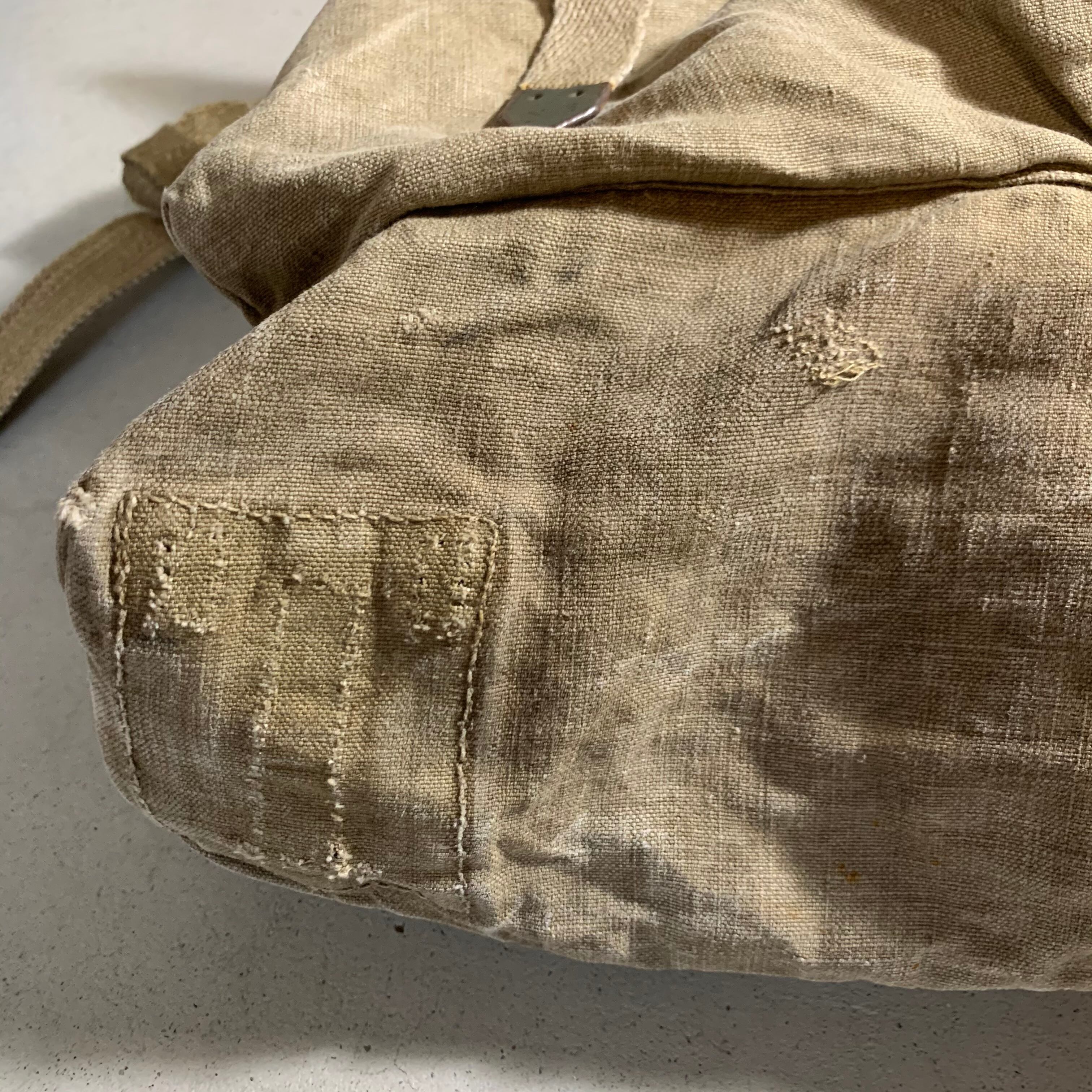 50年代のスウェーデン軍のバックパックをショルダーバックにカスタムしました。素材は分厚い丈夫なリネン。ショルダーベルトは40年代のフランス軍の物になります。
