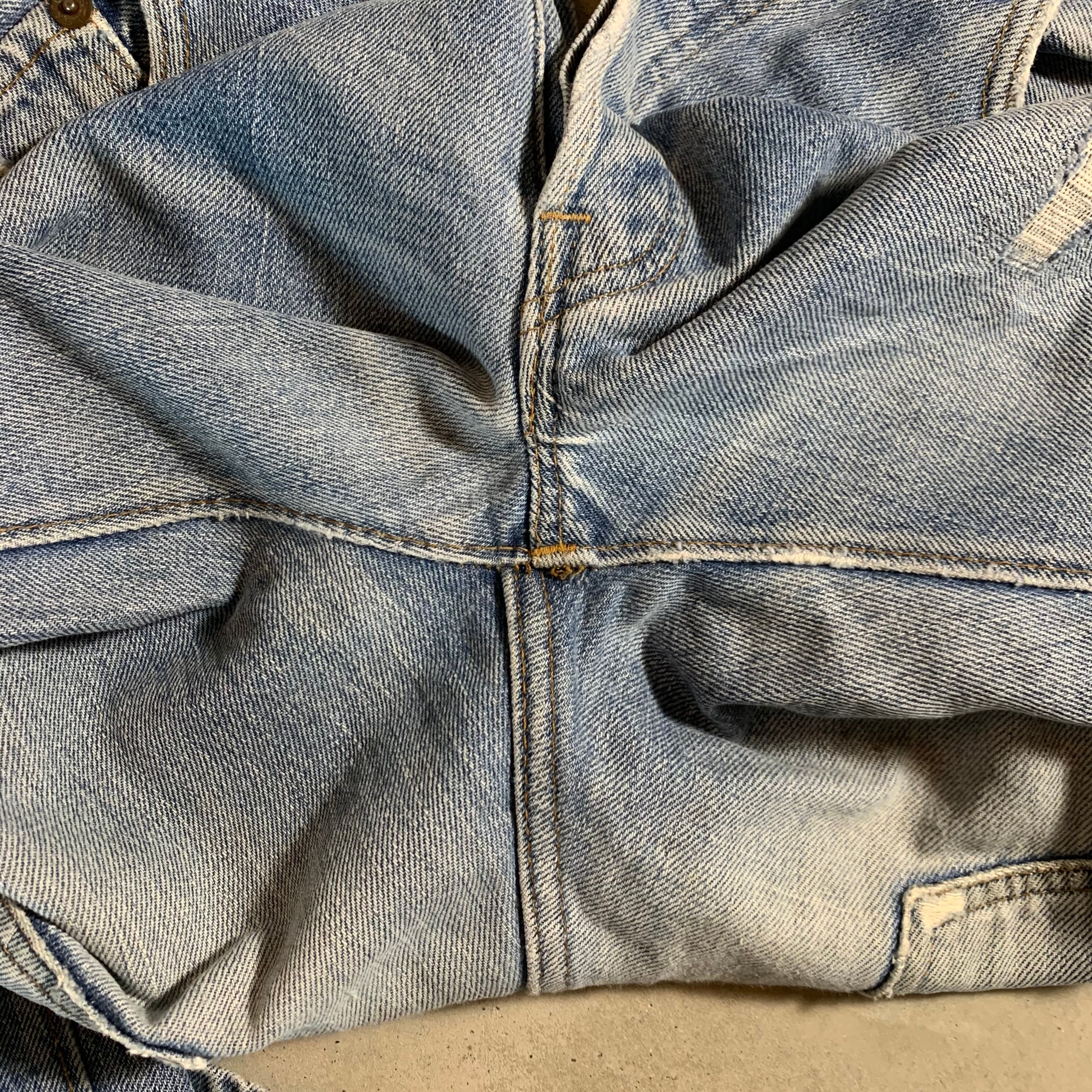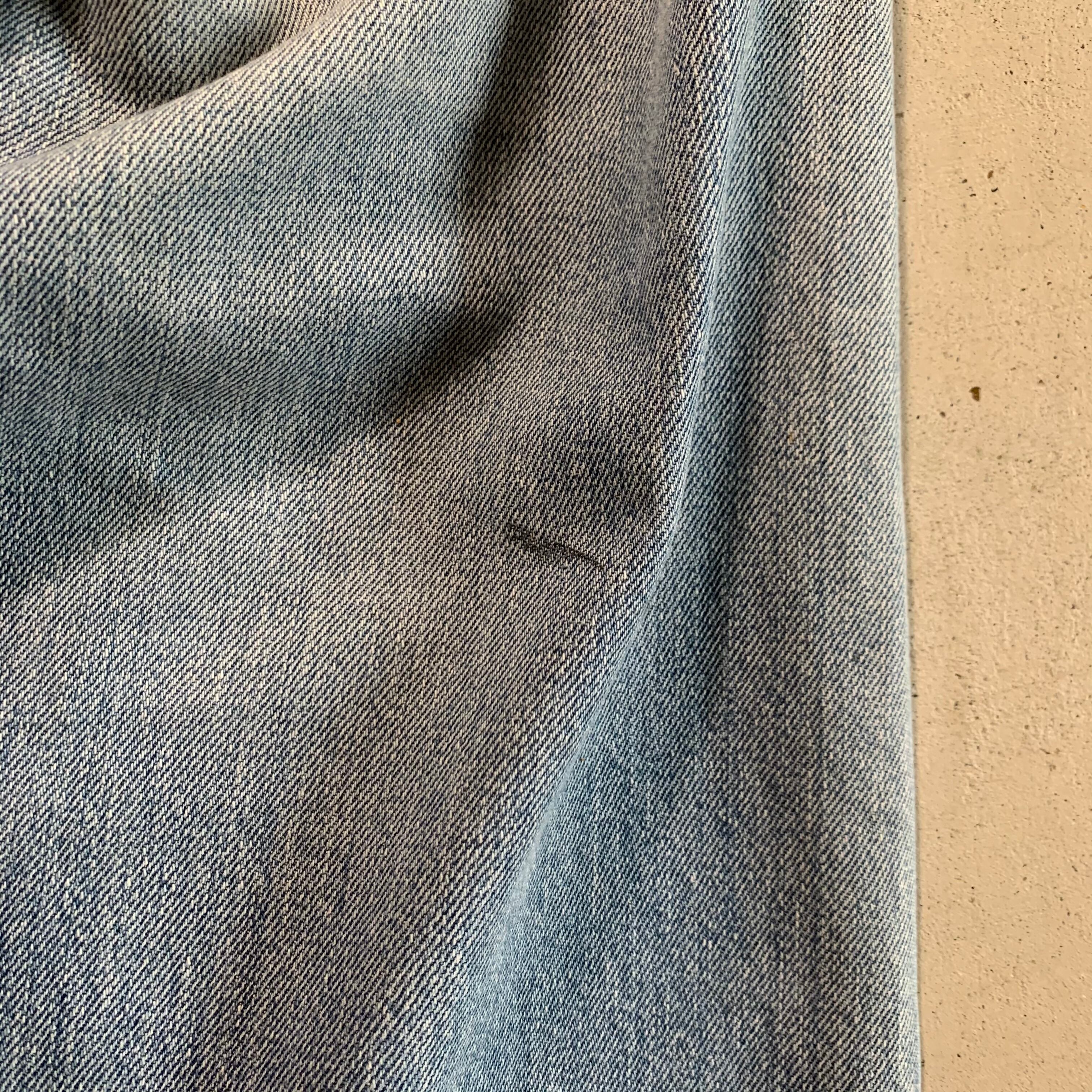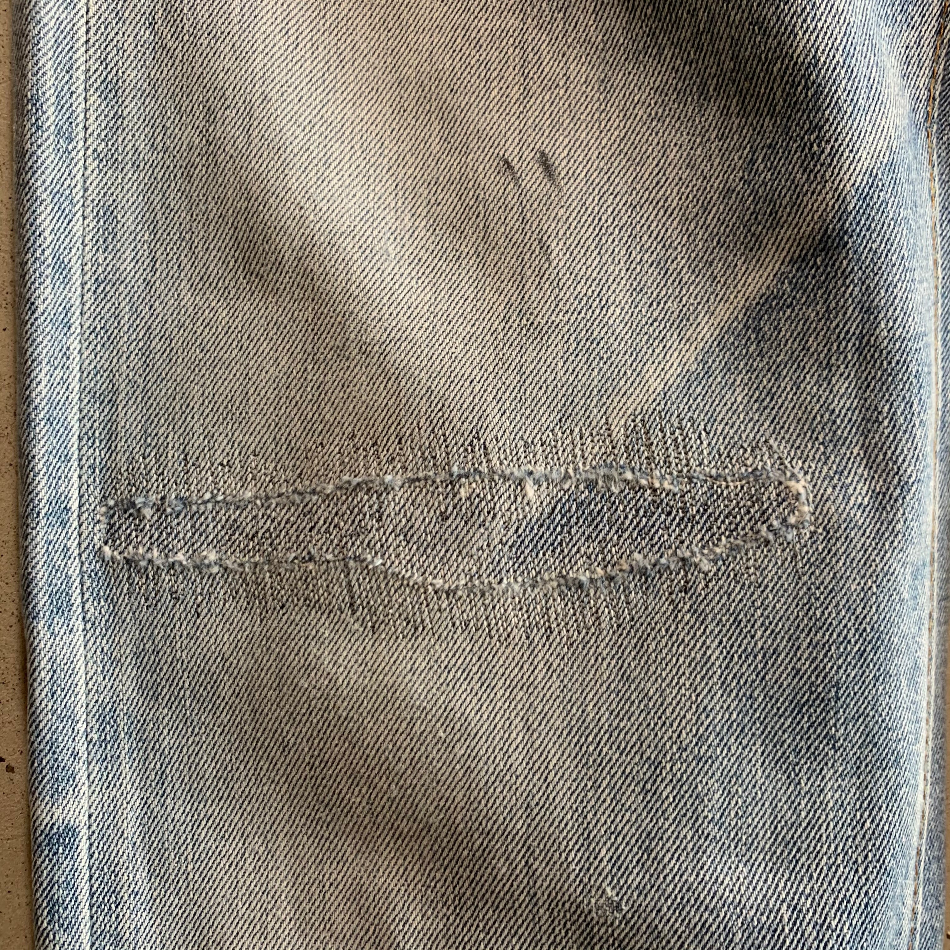 リーバイス501、66前期です。アイスブルーの爽やかな色落ち。両足にダメージがあったため裏に接着芯を貼り、ミシンでたたいてリペアをしております。画像でご確認ください。股破れなどはございませんので、まだまだ履ける一本です。