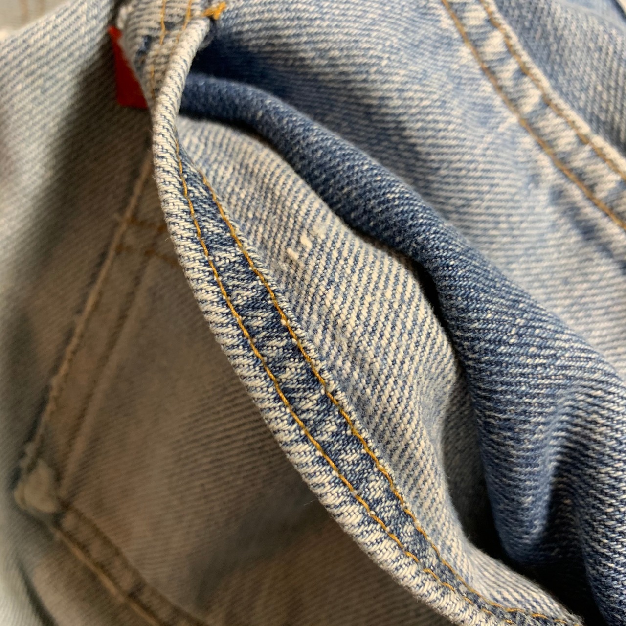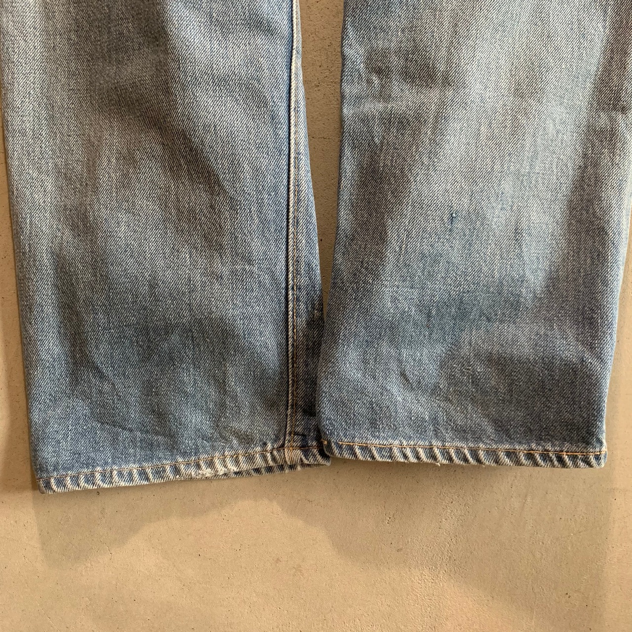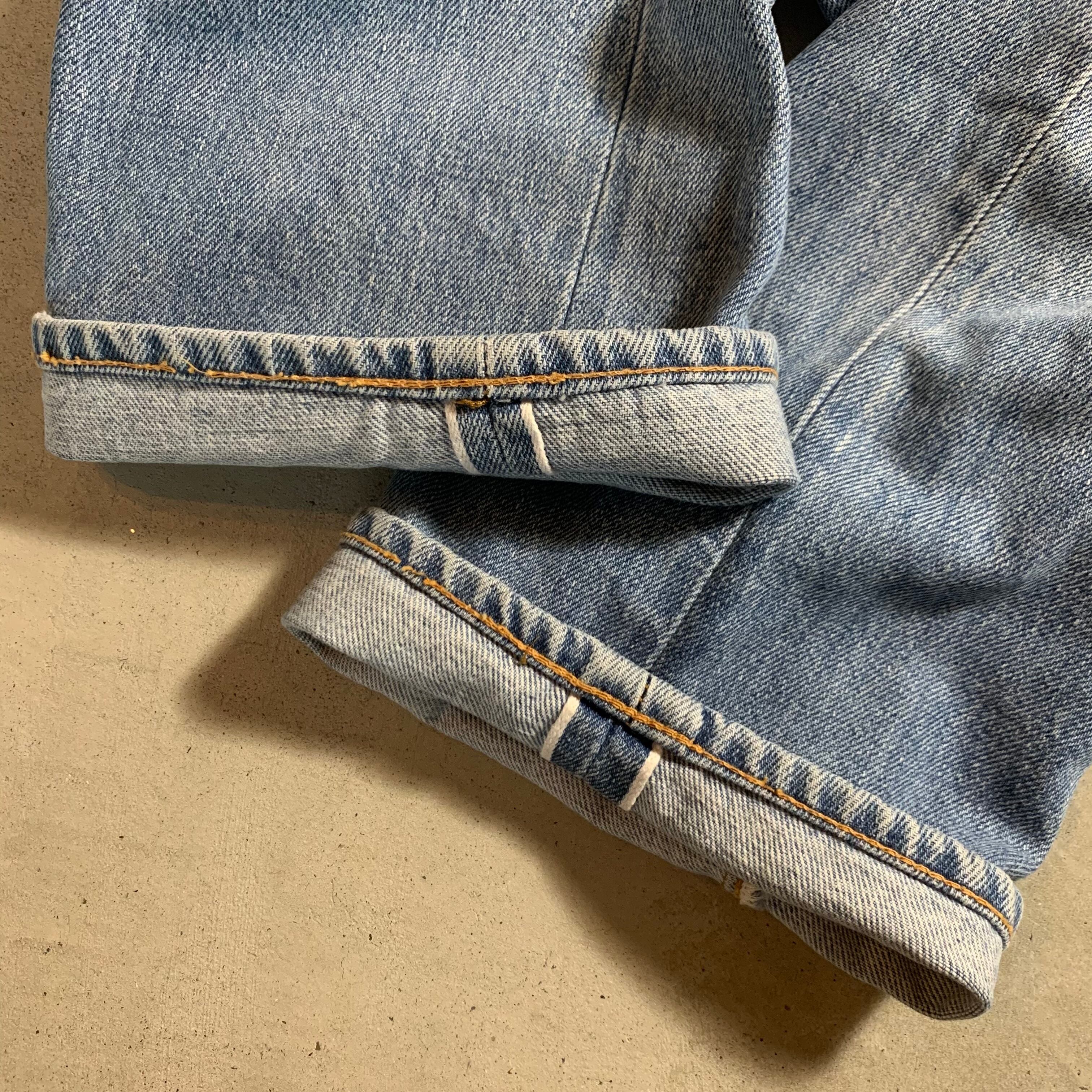 リーバイス501、66前期です。アイスブルーの爽やかな色落ち。両足にダメージがあったため裏に接着芯を貼り、ミシンでたたいてリペアをしております。画像でご確認ください。股破れなどはございませんので、まだまだ履ける一本です。