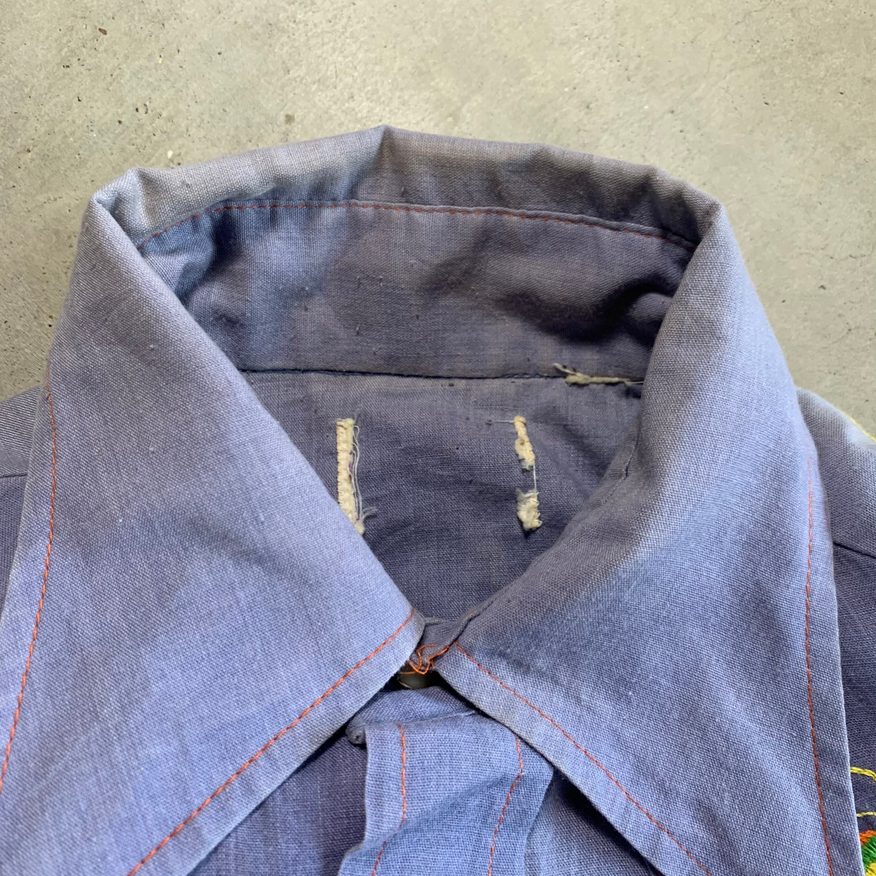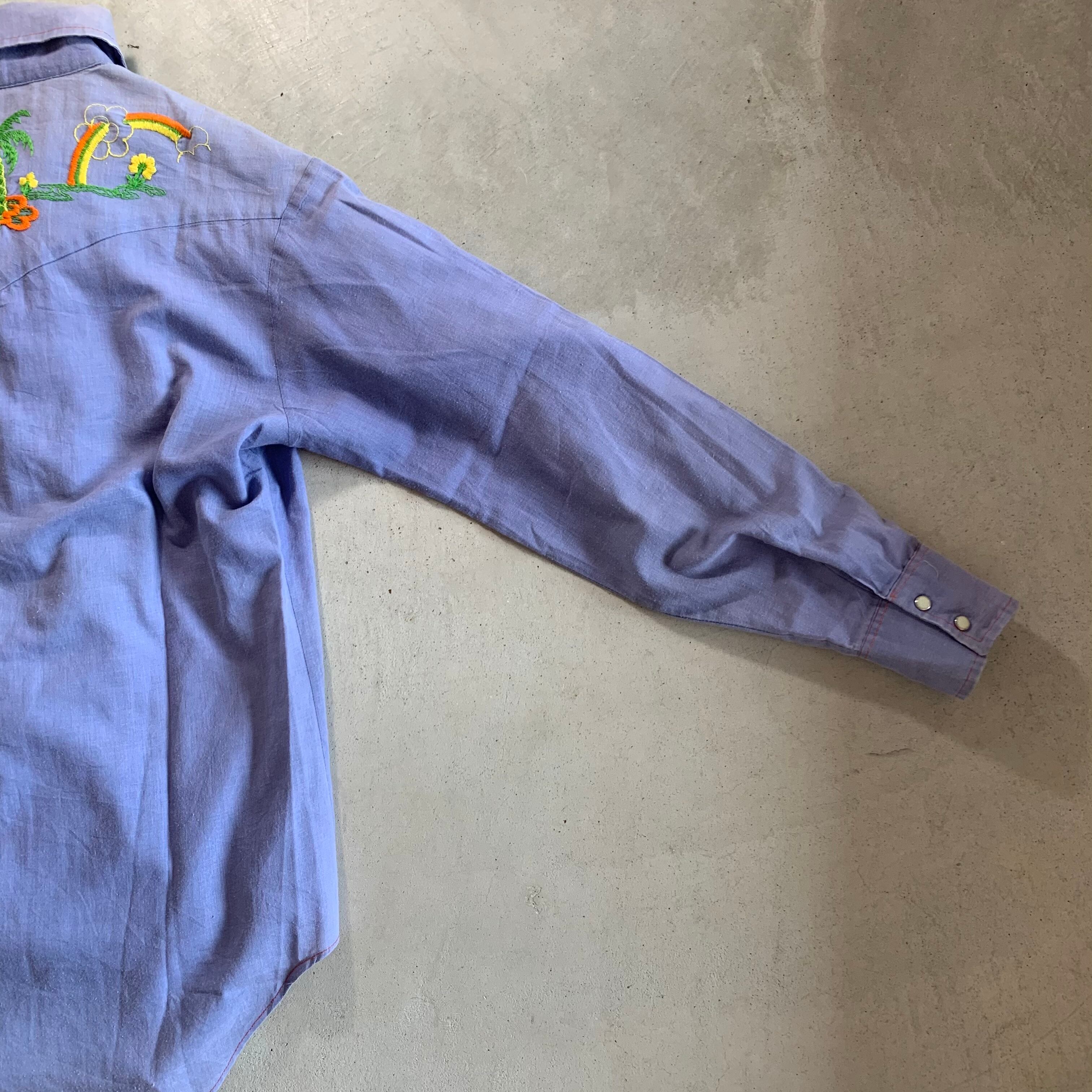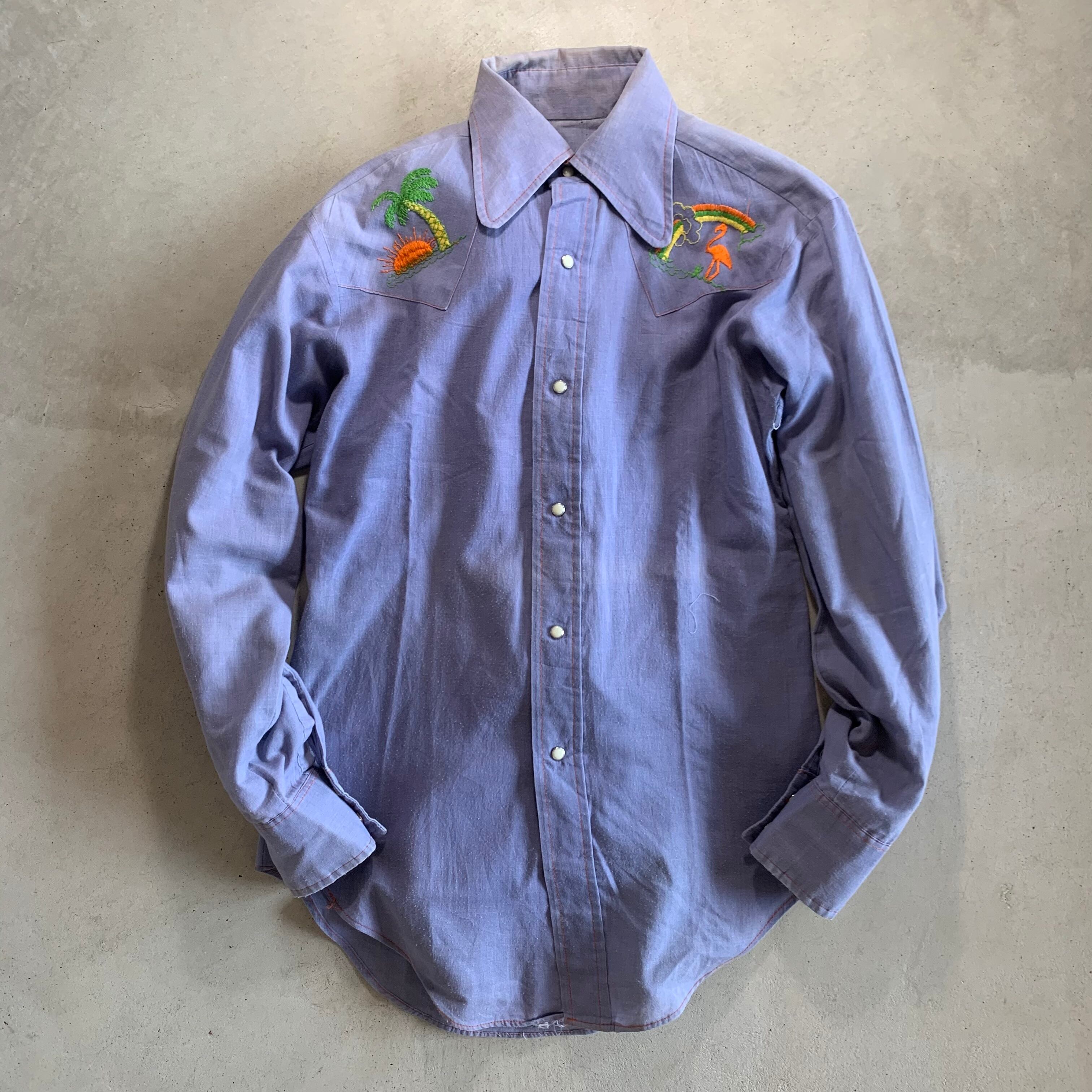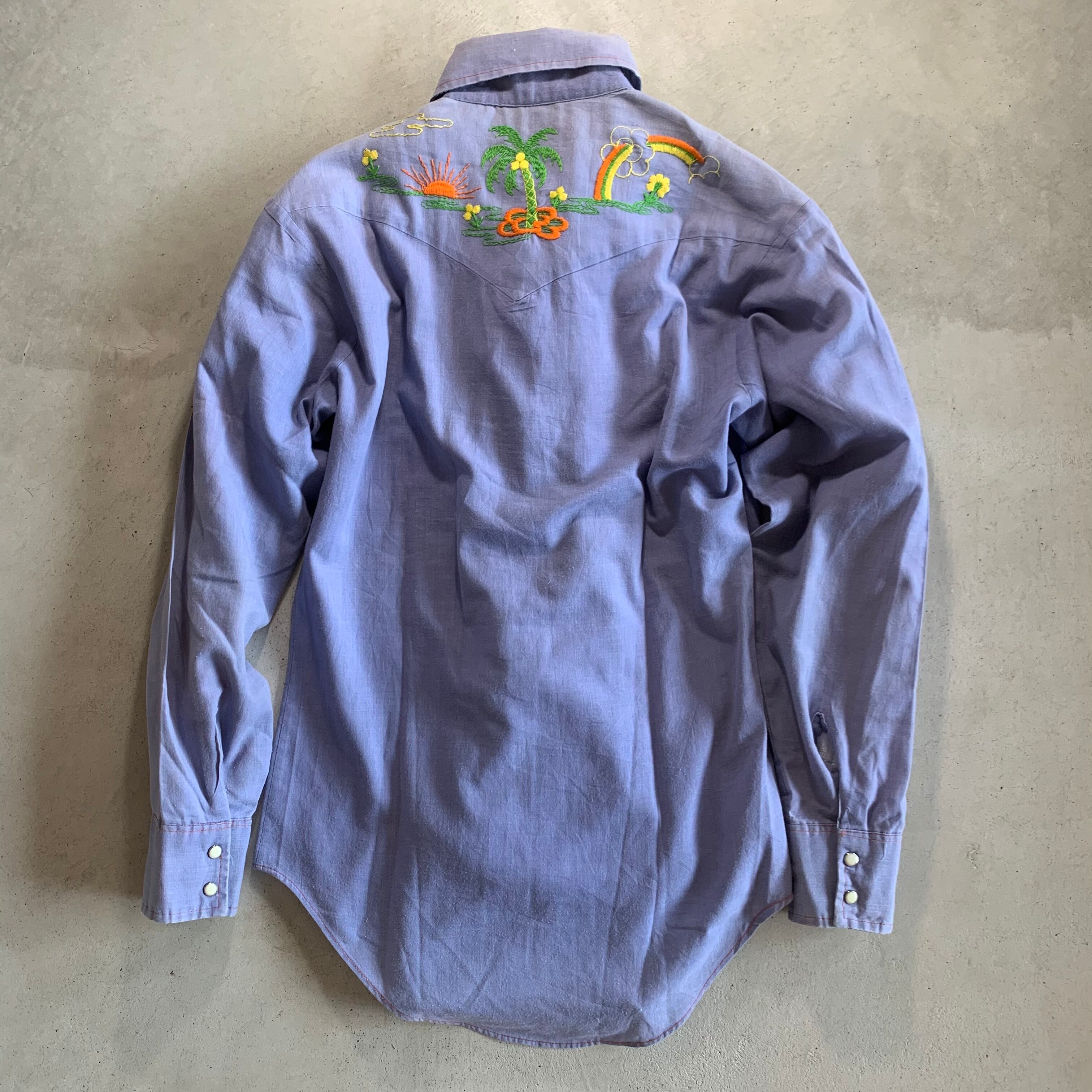 ヴィンテージのシャンブレー素材のウエスタンシャツです。70年代頃かと思われます。ヨークに施された手縫いによる刺繍が可愛らしいです。