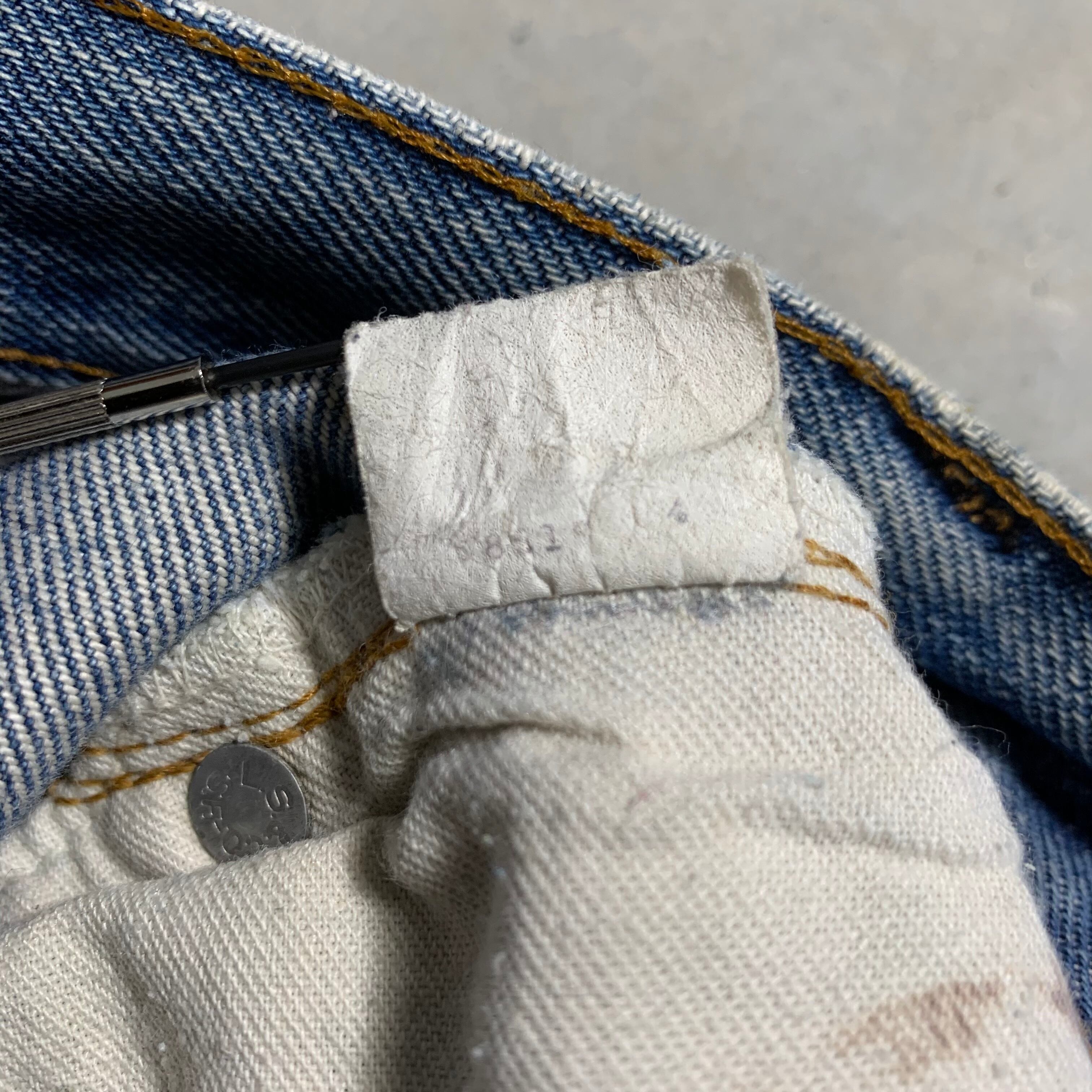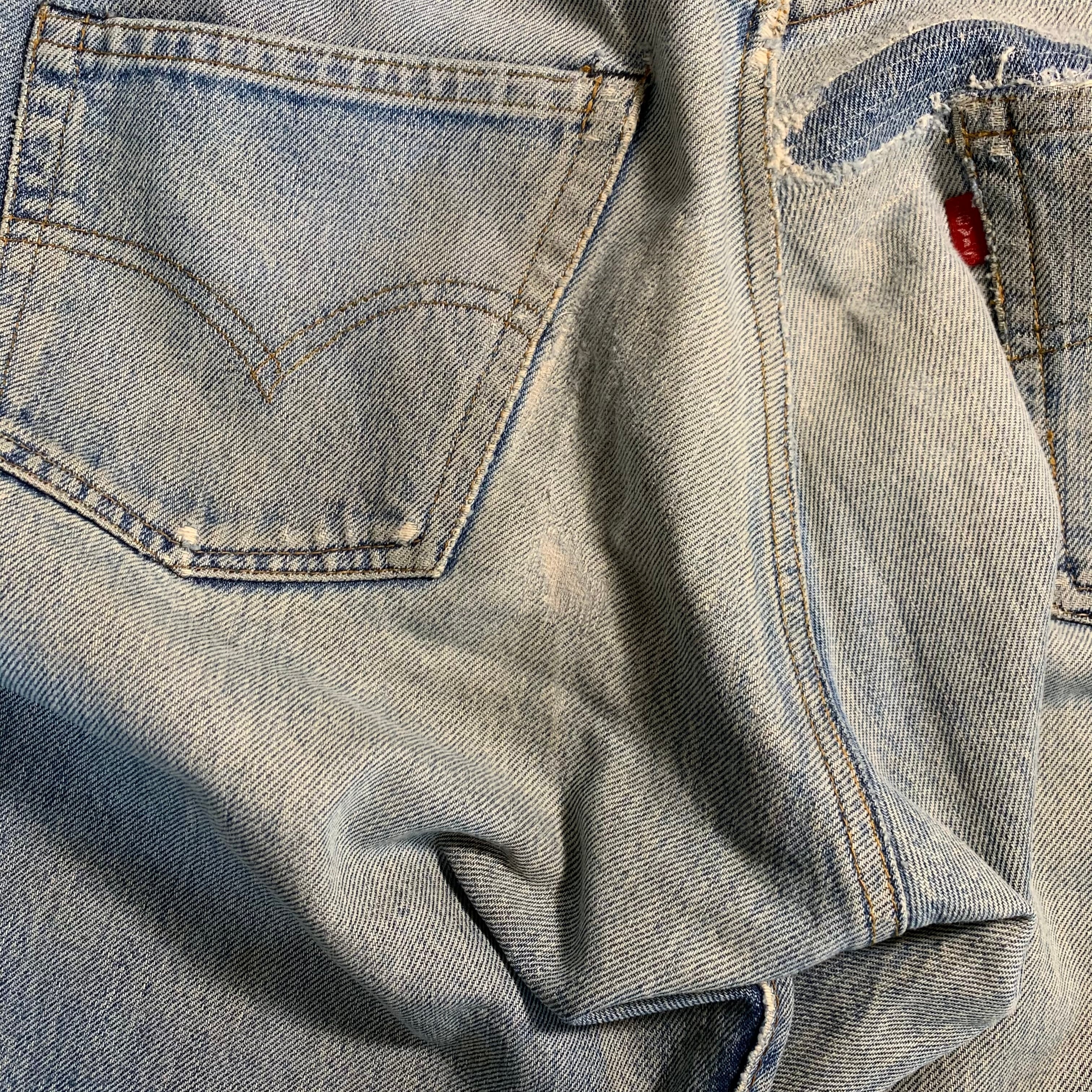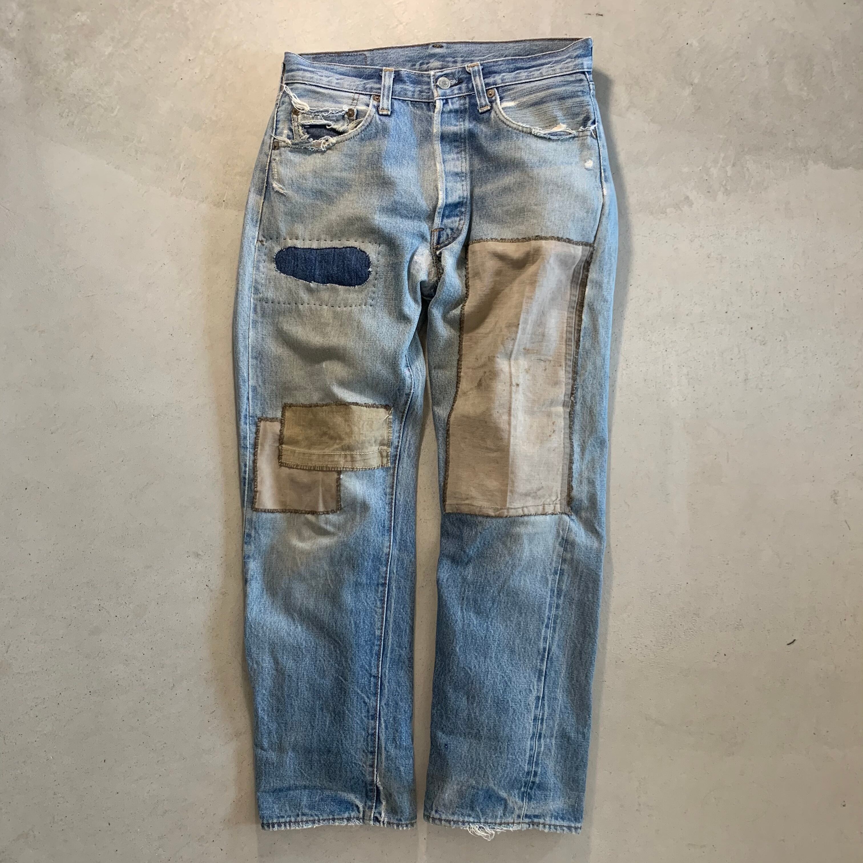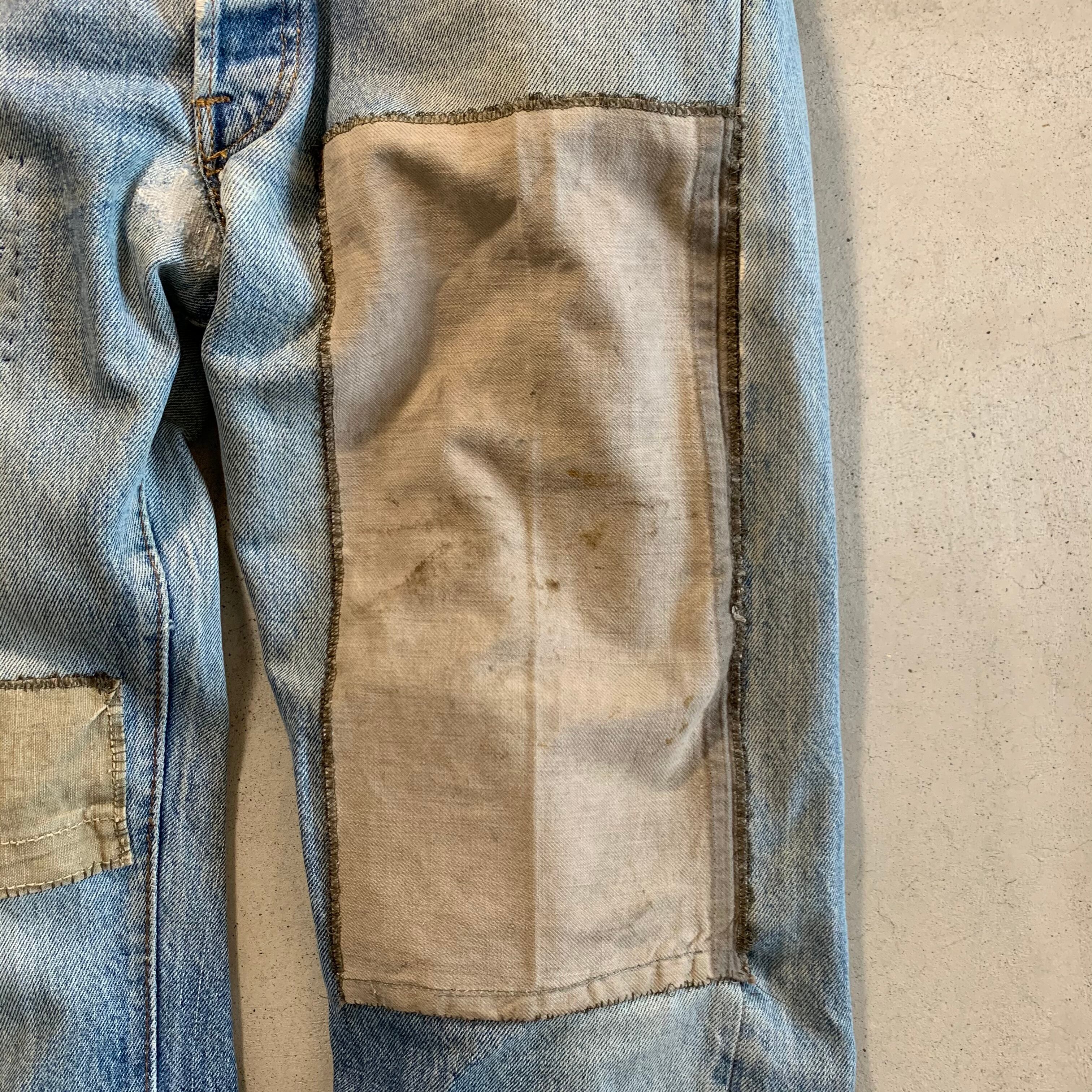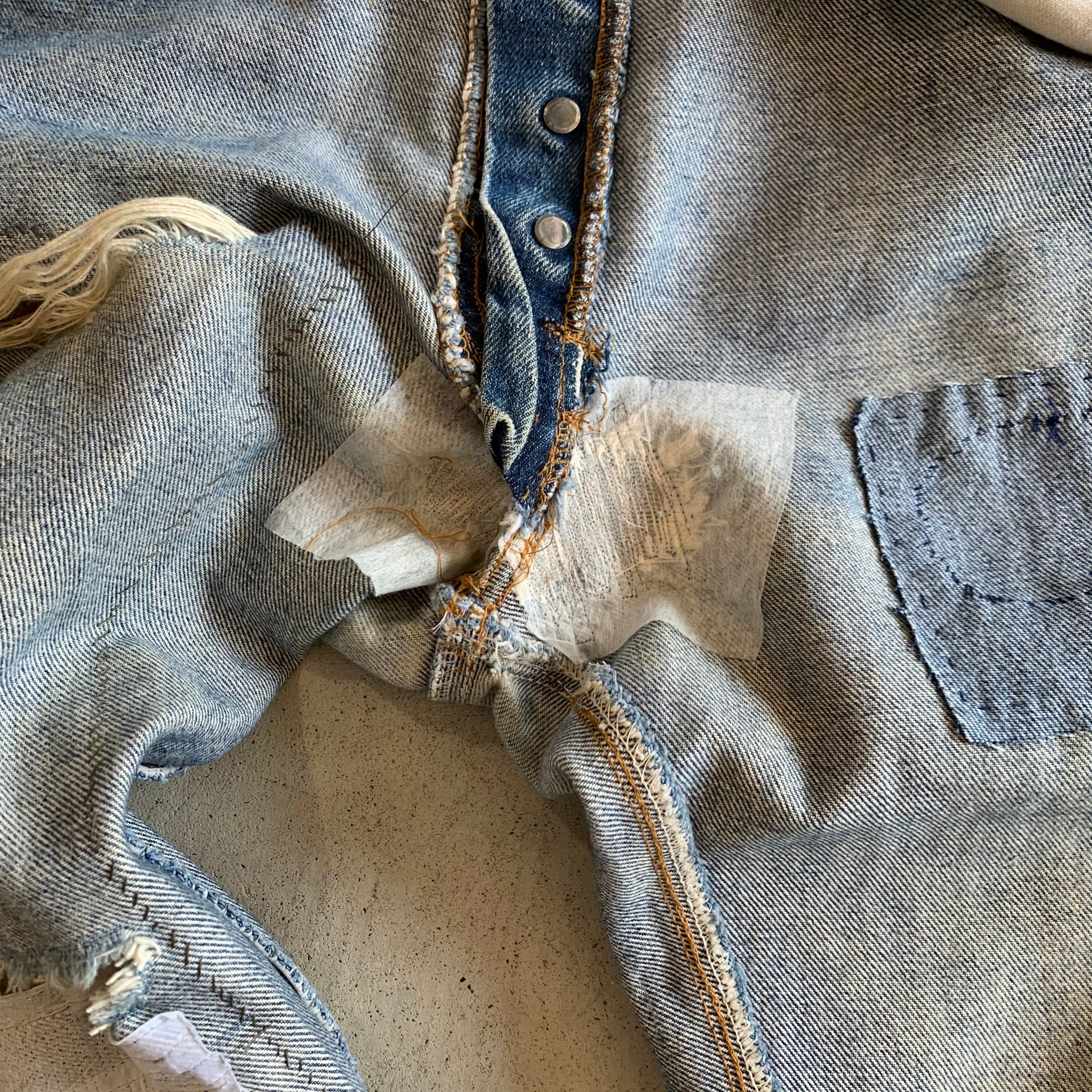 ボロボロで履かれなくなった501の66後期を当店で履けるように修繕(メンディング)しました。