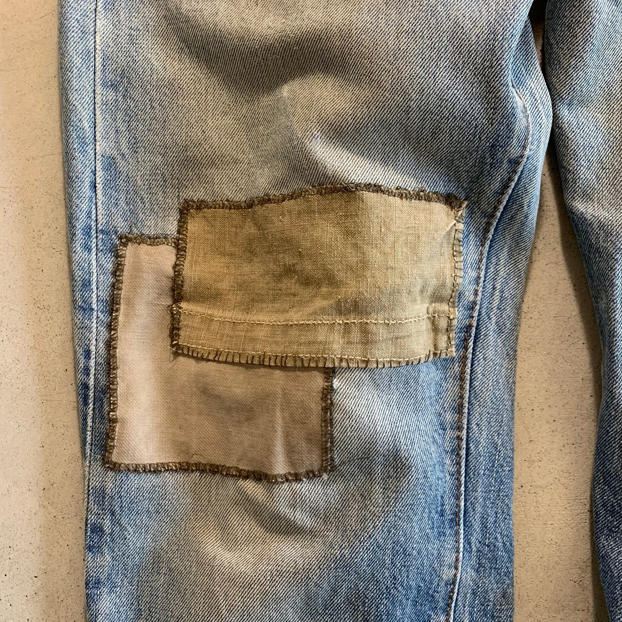 股に大きく開いてしまっていた穴は、できるだけ目立たなくするためにミシンでたたいて穴を塞ぎました。両足のダメージには、30年代のスウェーデン軍のユーティリティーパンツの端切れや、アンティークリネンの端切れ、Levi'sのデニムの端切れをあて布として使用し、ダメージ部分を隠してます。ヴィンテージの雰囲気を損ねることなく修繕できたかと思います。ヒップにも穴があいており、さらには周りの生地も弱っていたので、裏から接着芯をはり穴を塞ぎ、補強しております。
