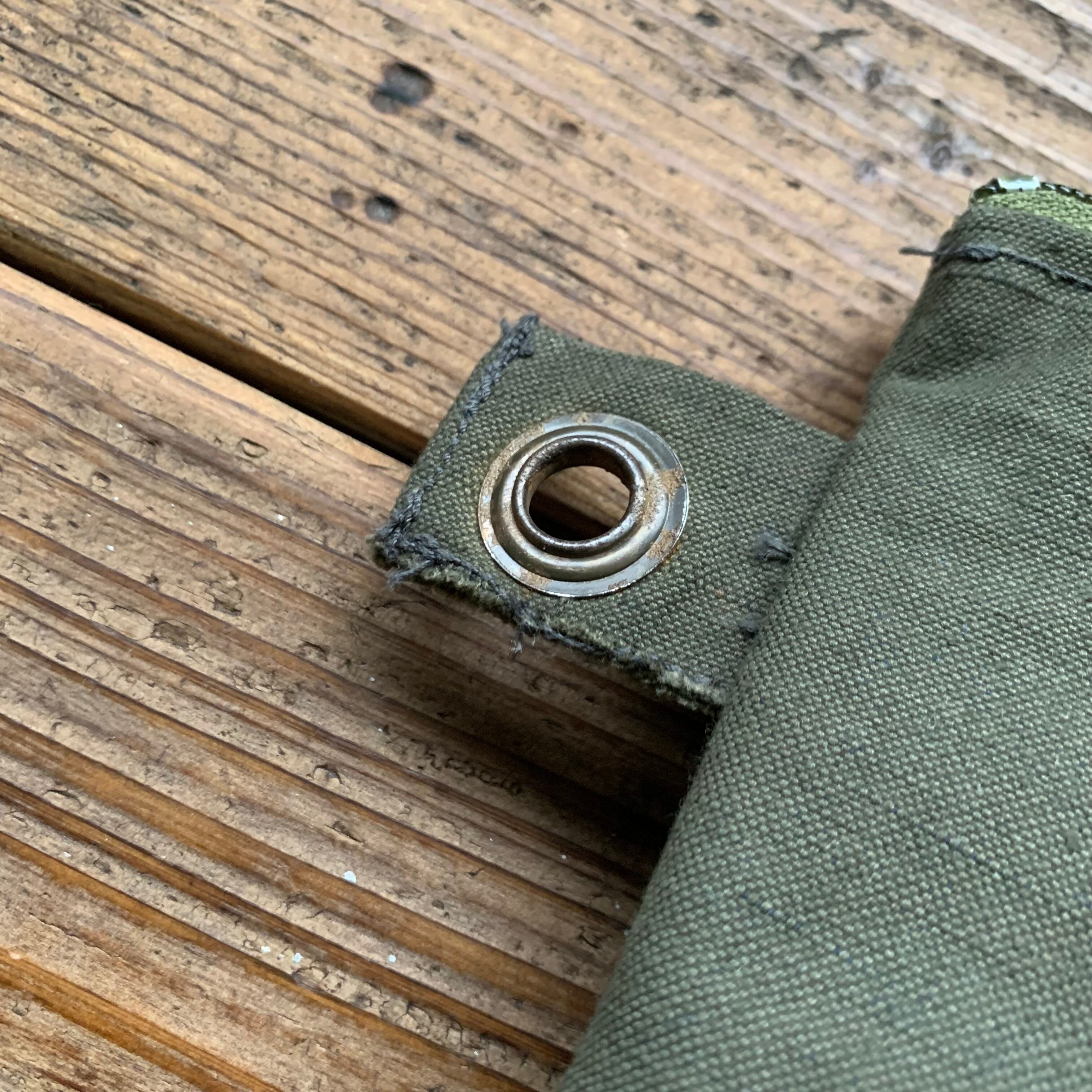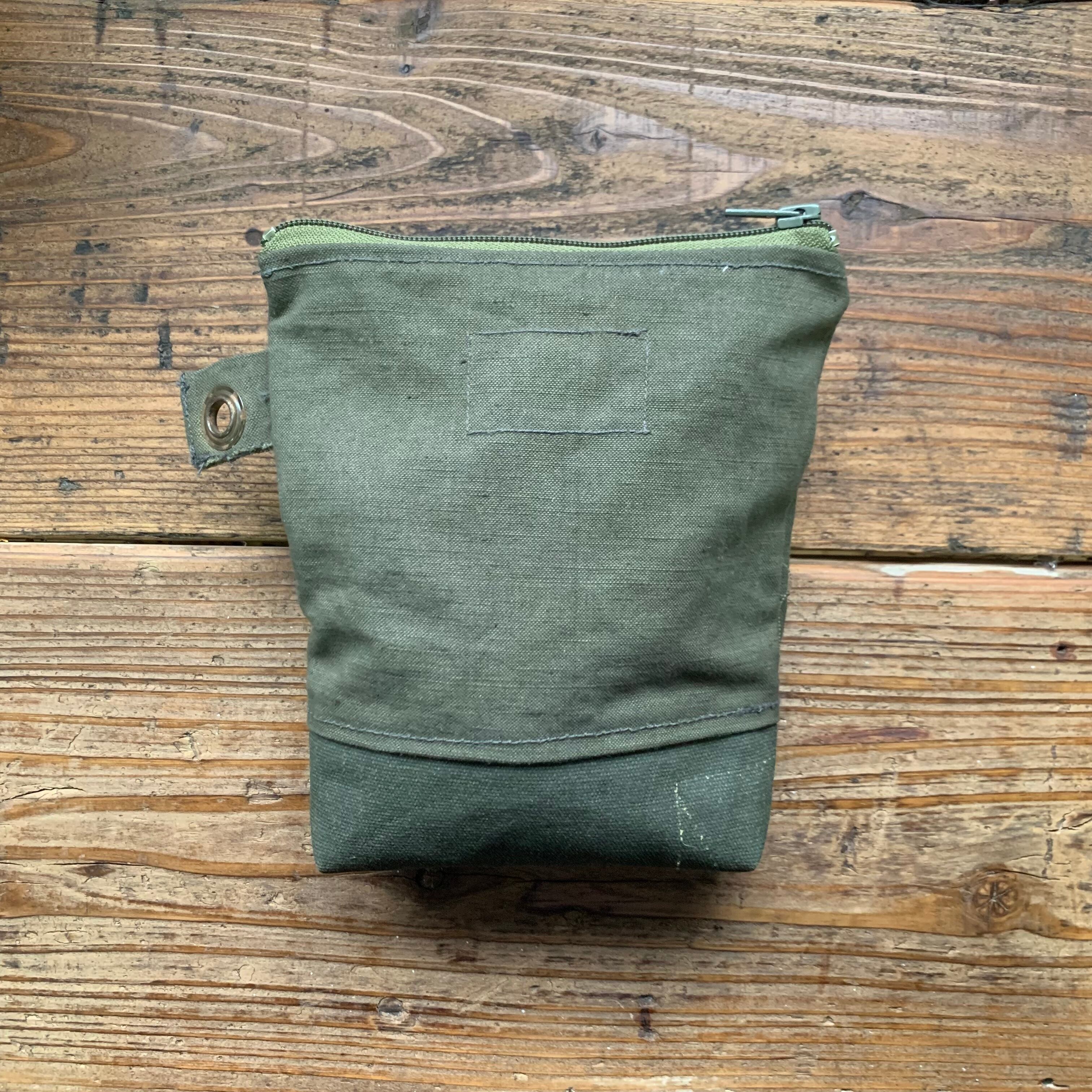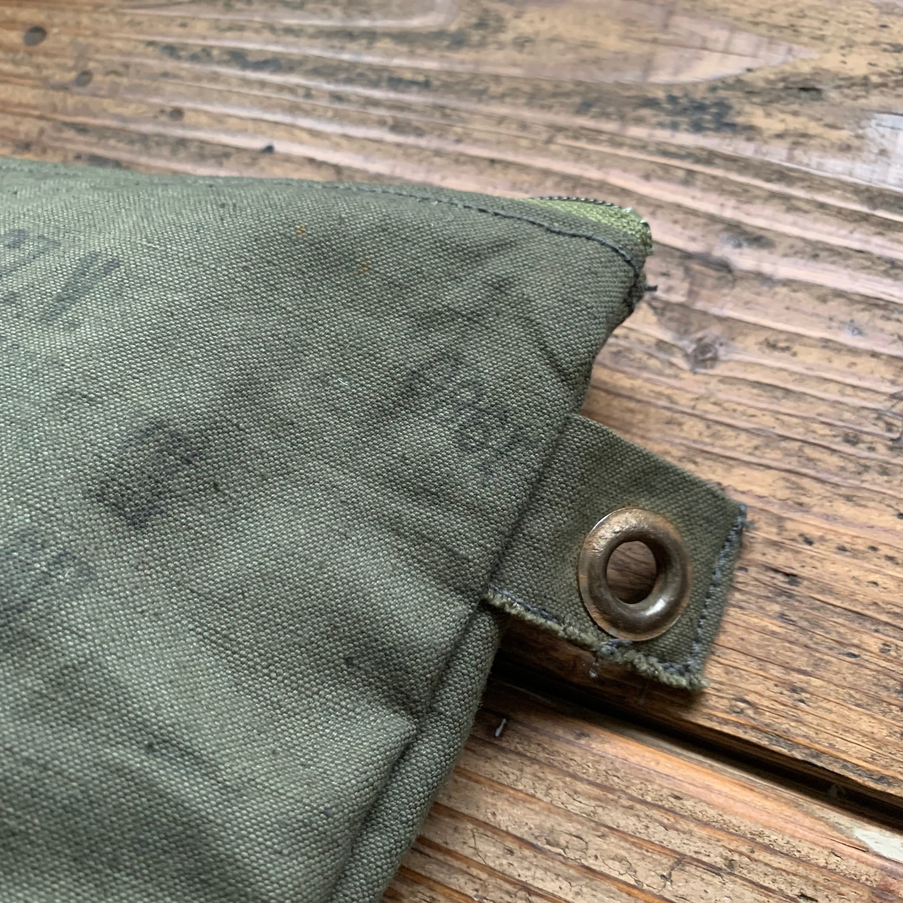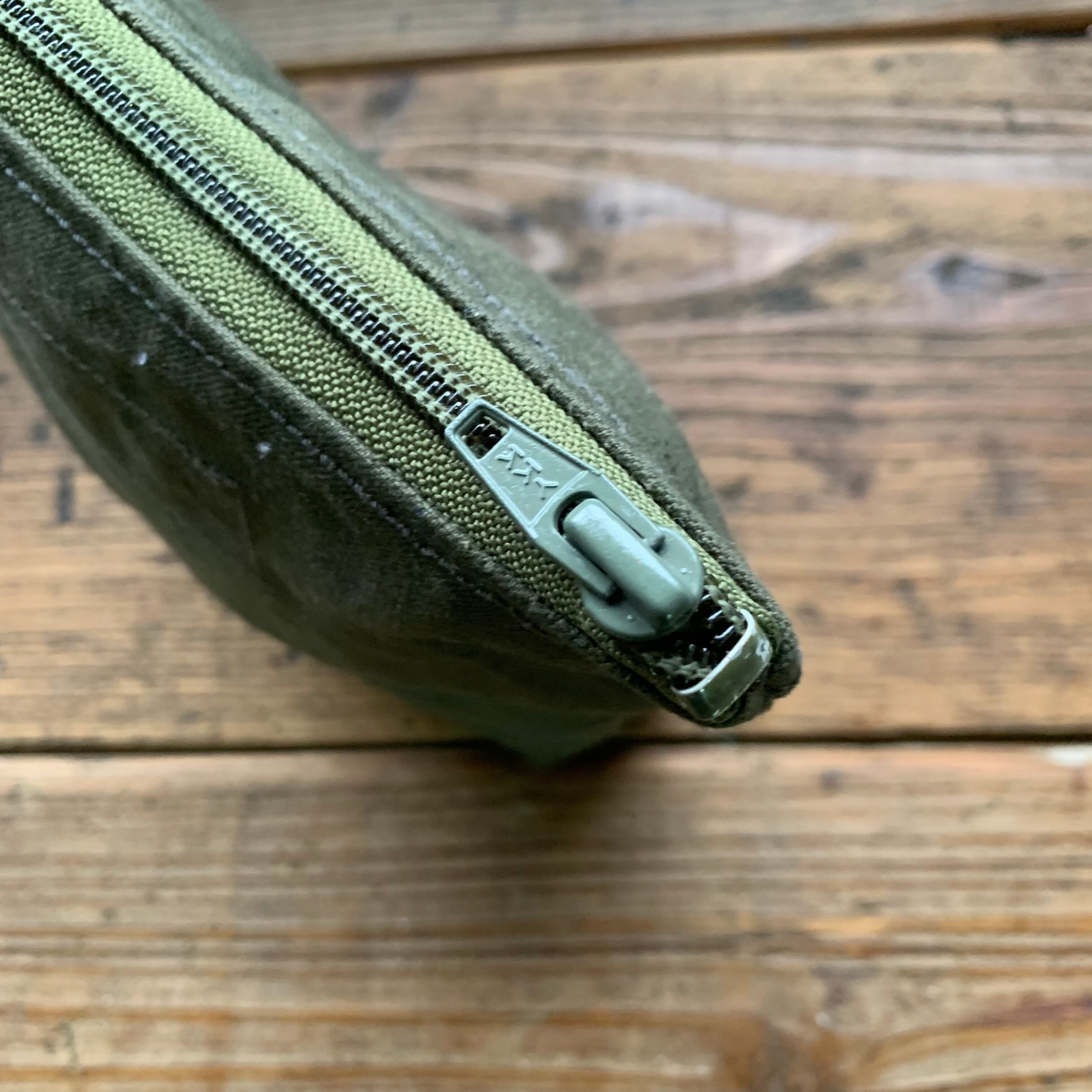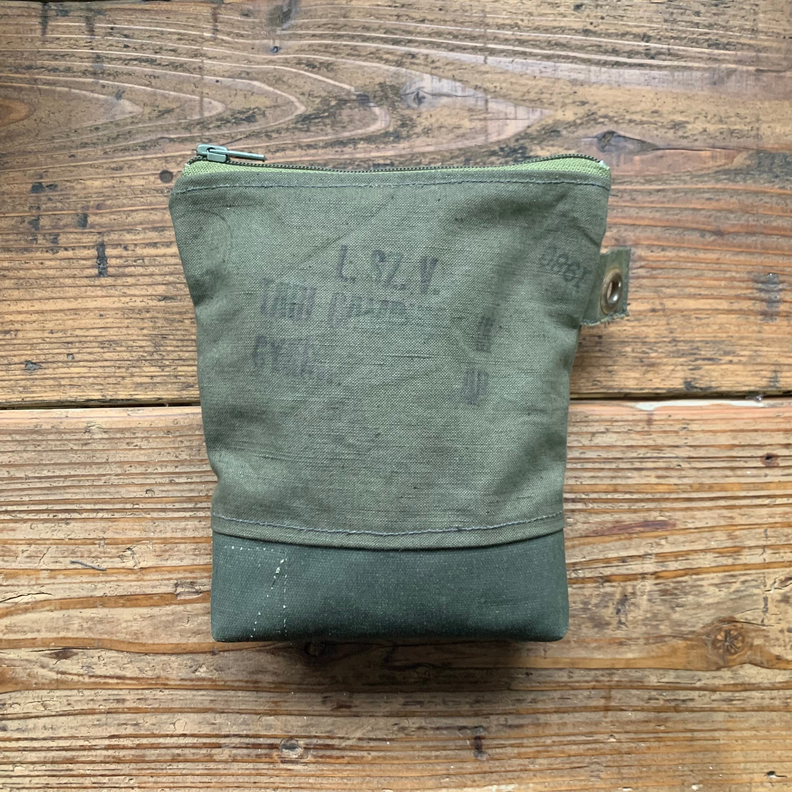1980年代のハンガリー軍で使用されていたダッフルバッグに記載されていた、ステンシル部分の生地を切り取ってポーチを作りました。ボトムには70年代の米軍で使用されていたコーティングキャンバスの生地を使用。開口部のジッパーも80年代に米軍で使われていたジッパーを採用しております。縫い付けの糸以外は全てヴィンテージの素材にこだわった一点物になります。