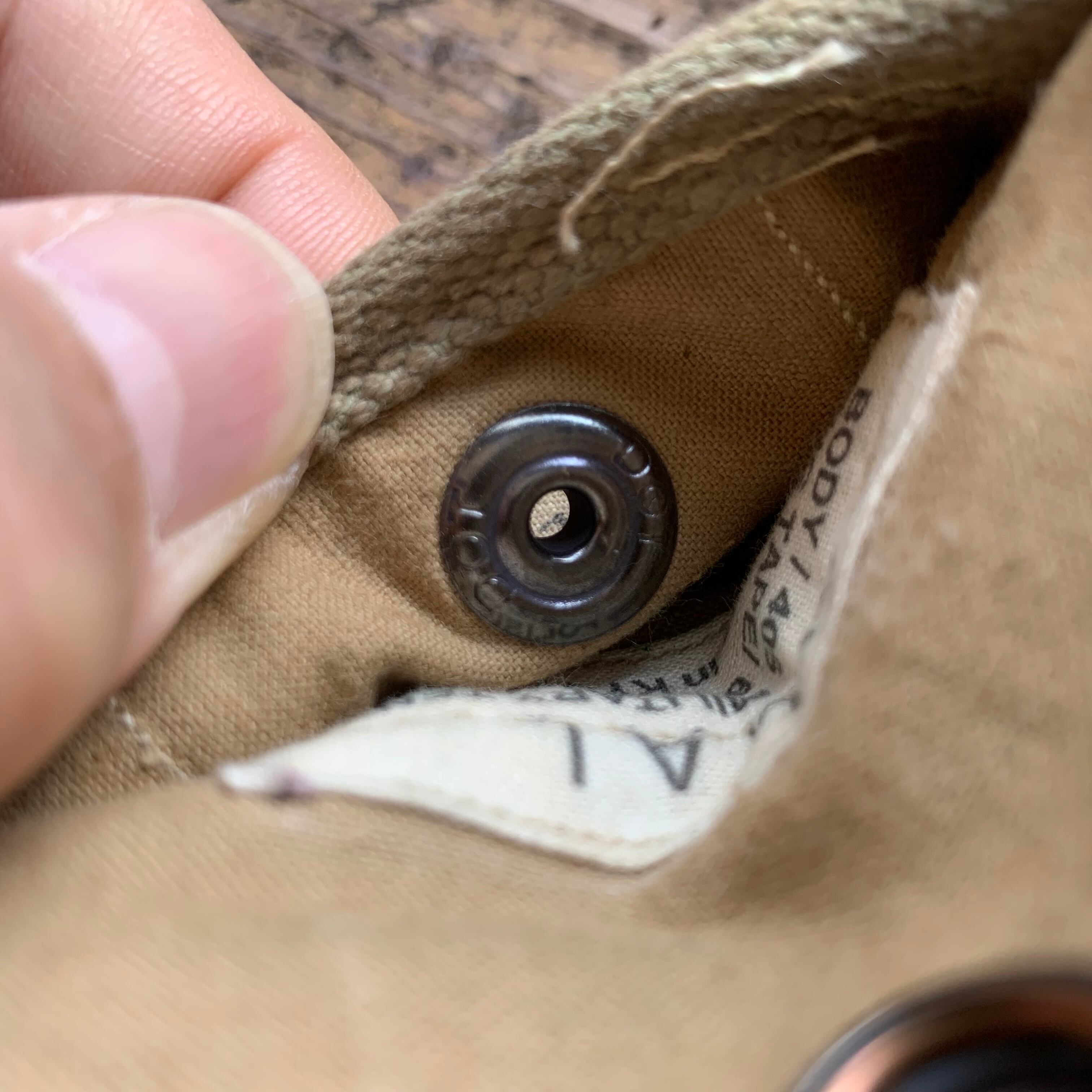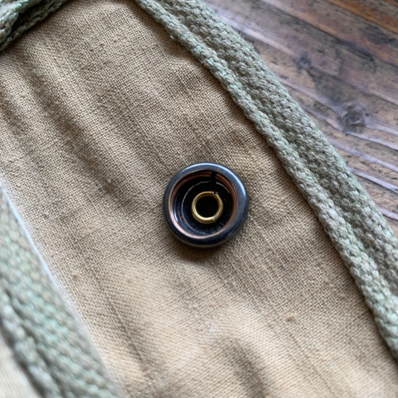 ボディーは40年代頃のミリタリーテントの生地を使用。パイピングテープは60年代のポーランド軍のブレッドショルダーの物。ドットボタンは70年代の米軍に納入された、デッドストックの実物を使用。糸は40年代の生地を使用しているので、綿糸で縫い合わせています。