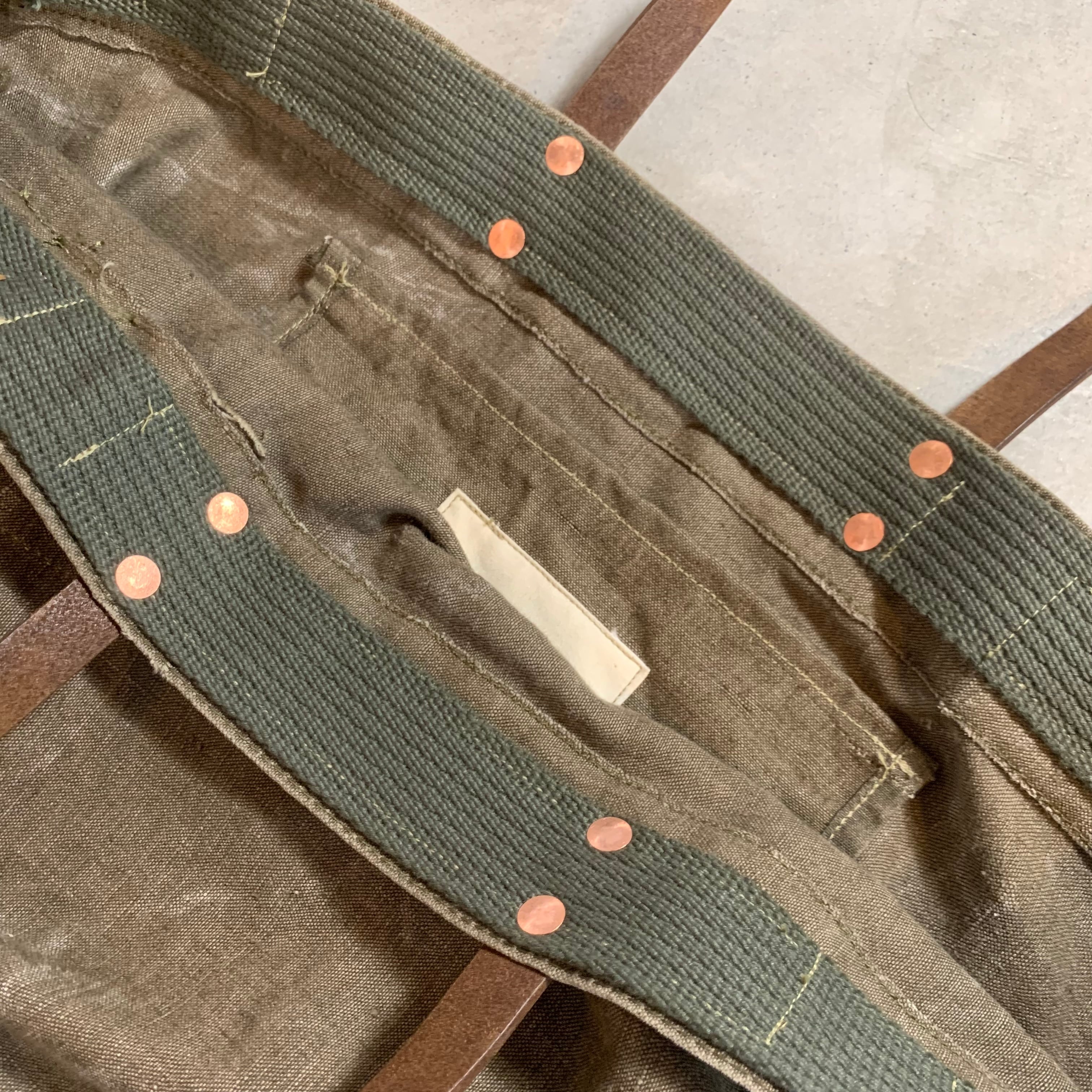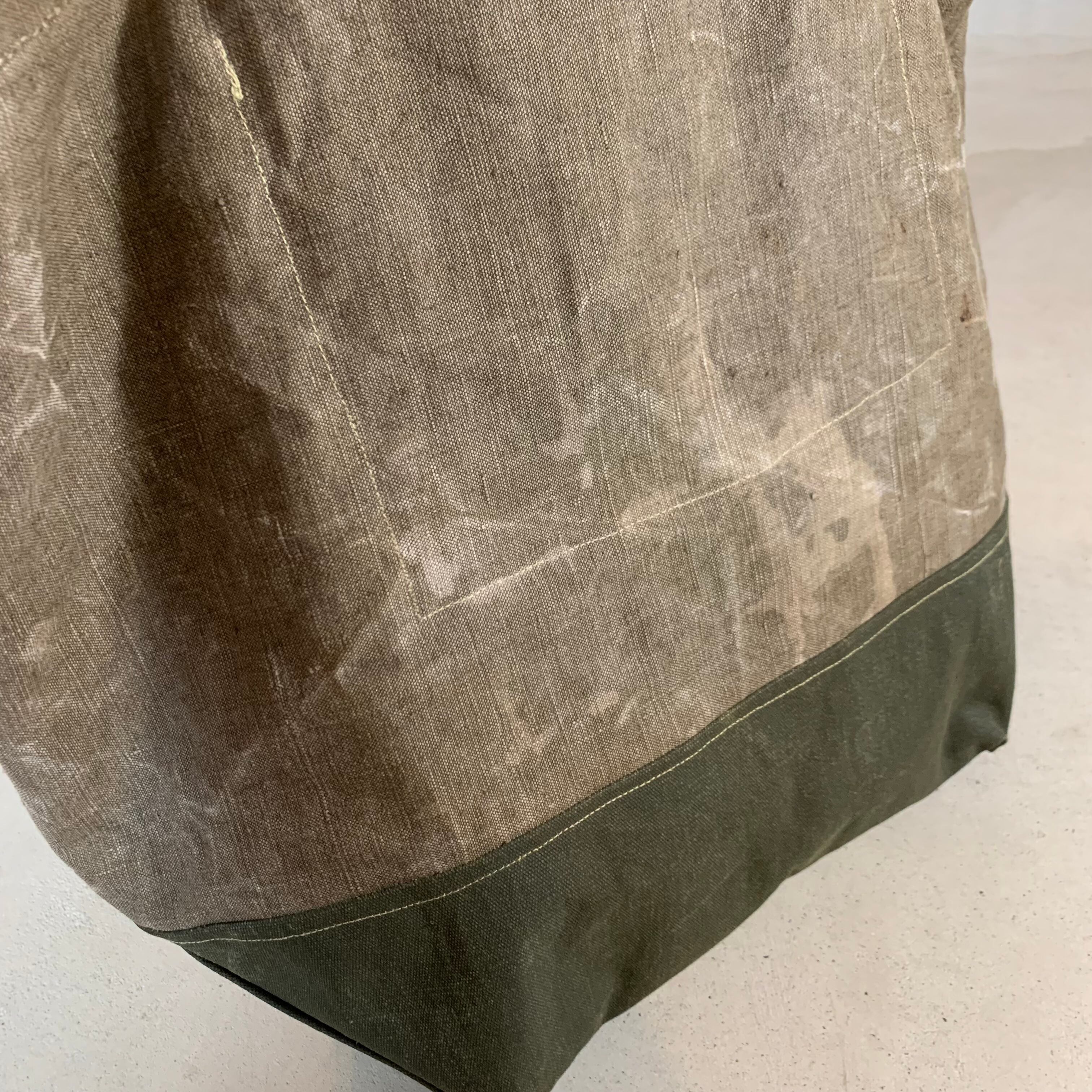 ボディーは60年代のフランス軍のダッフルバッグ。この時代の独特なクタッとしたリネン素材が特徴。中央部あたりにあるタグには手書きで何か書かれています。開口部にキャンバステープを縫い付けることで、クタッとした素材感ですが形が崩れません。こちらのキャンバステープも90年代のイタリア軍の物になります。ボトムはアメリカ軍のダッフルバッグの素材を使ってます。こちらはコーティングキャンバスで水分に強い素材です。持ち手は50年代のスウェーデン軍のバッグに使われていたレザーショルダーを磨いた物を使用しています。中にはポケットが一室ございます。