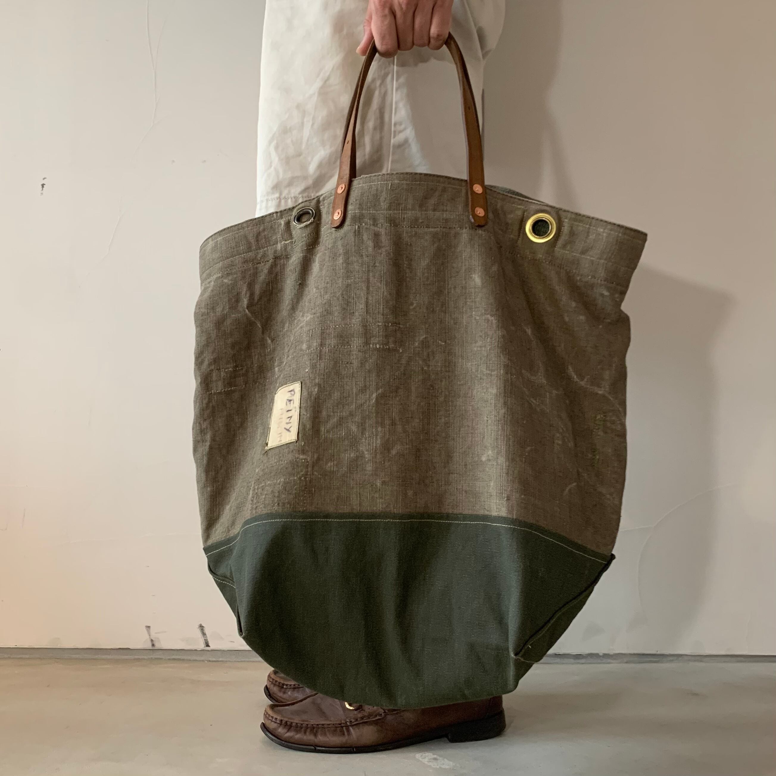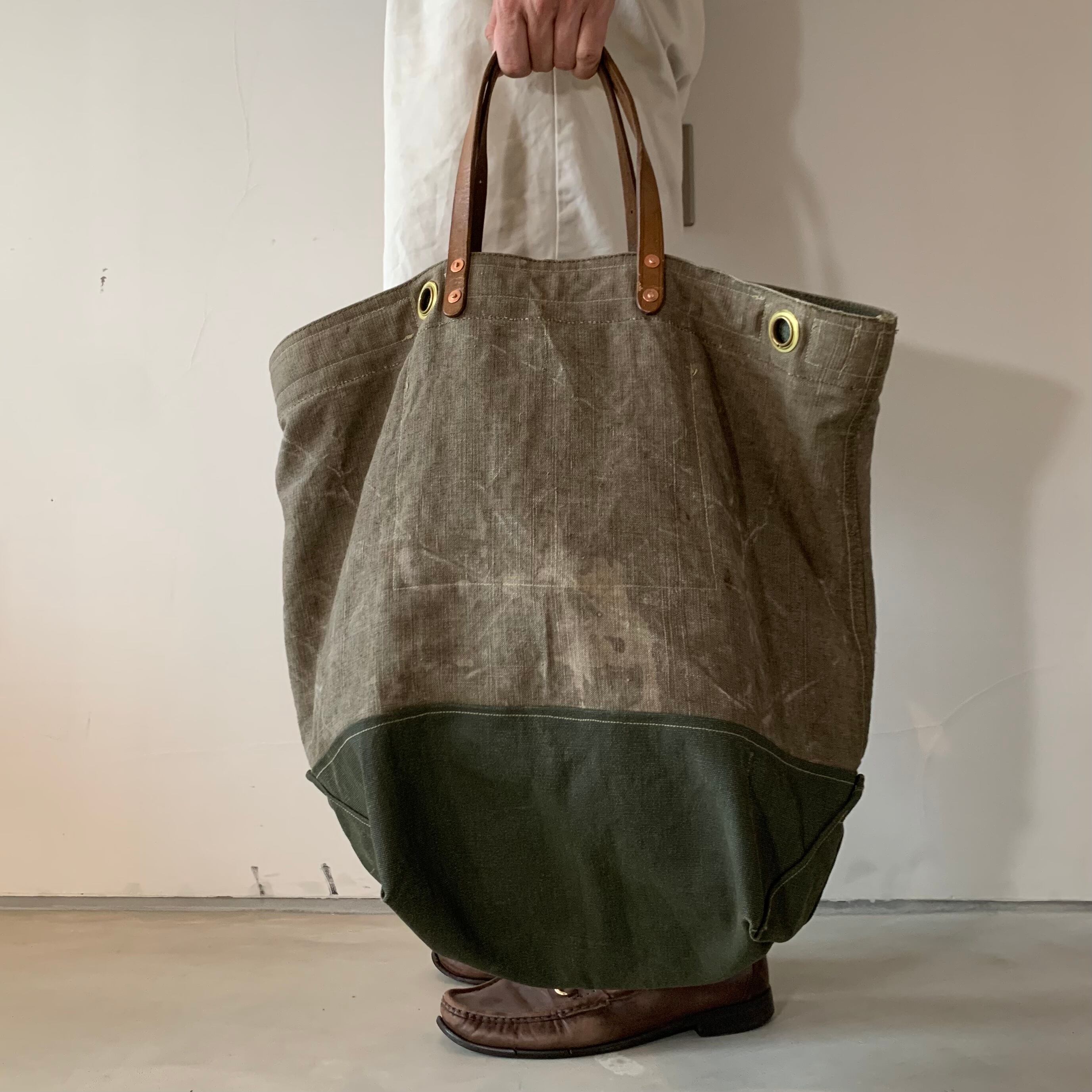ミリタリーのダッフルバッグをベースに、ヴィンテージ素材を組み合わせてトートバッグを作成しました。