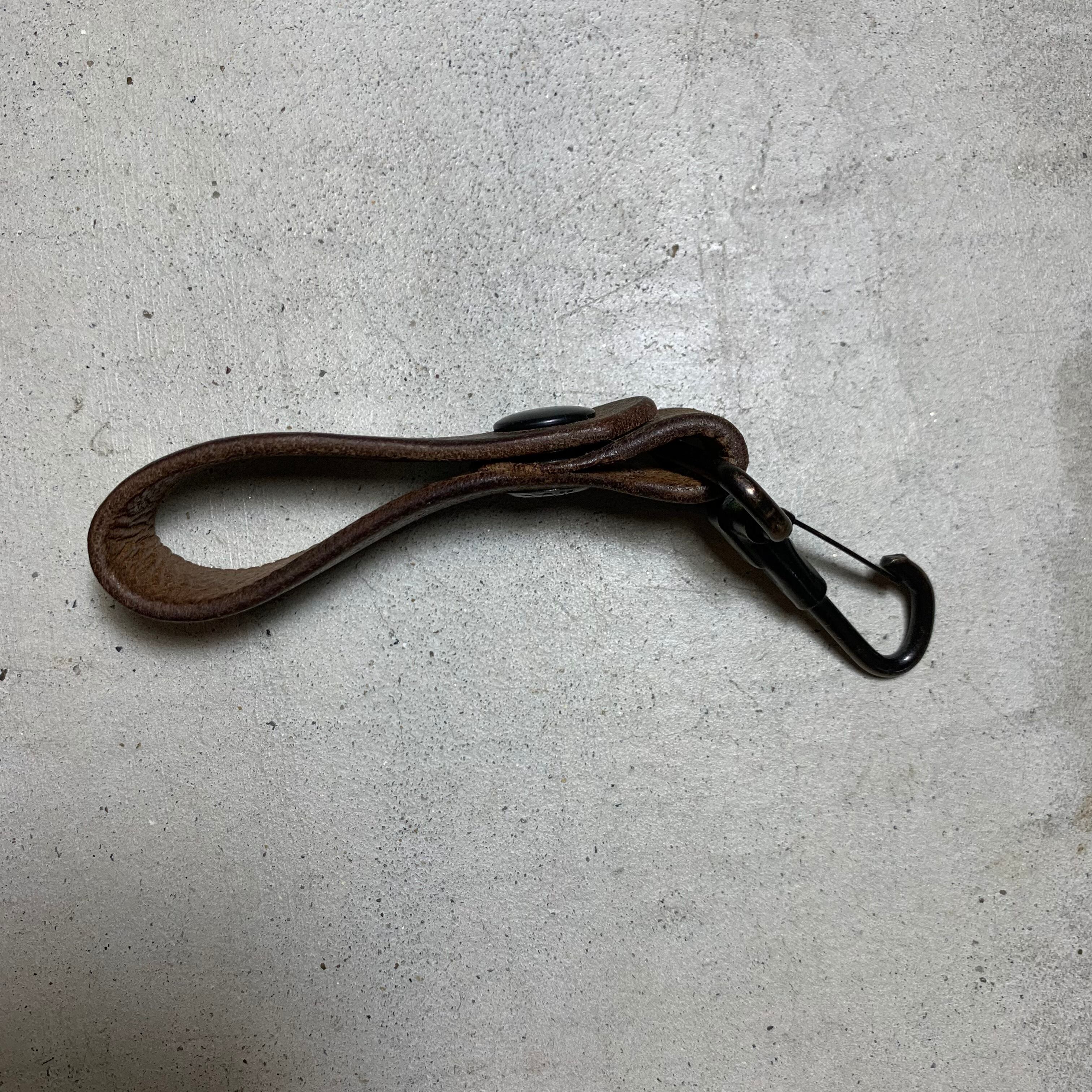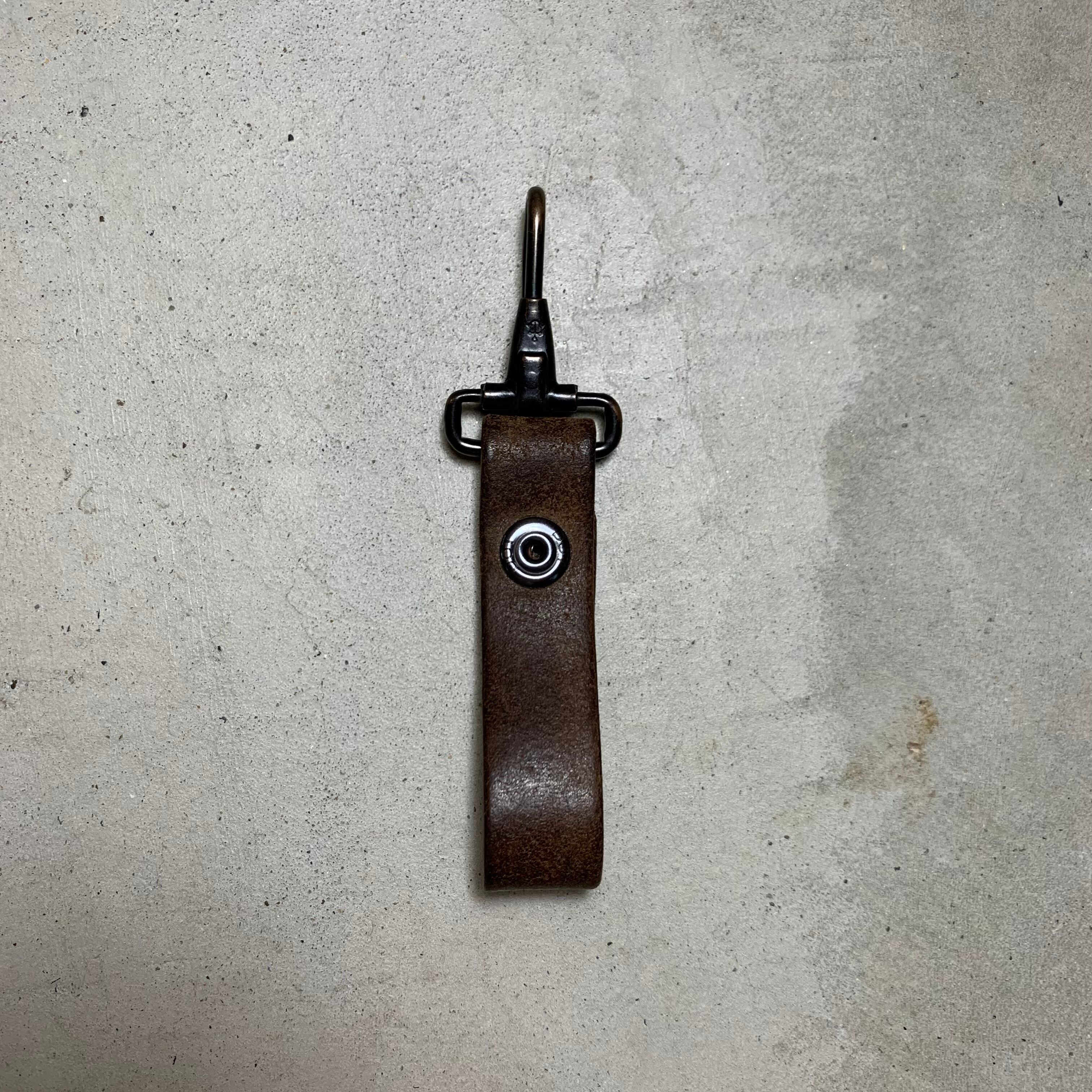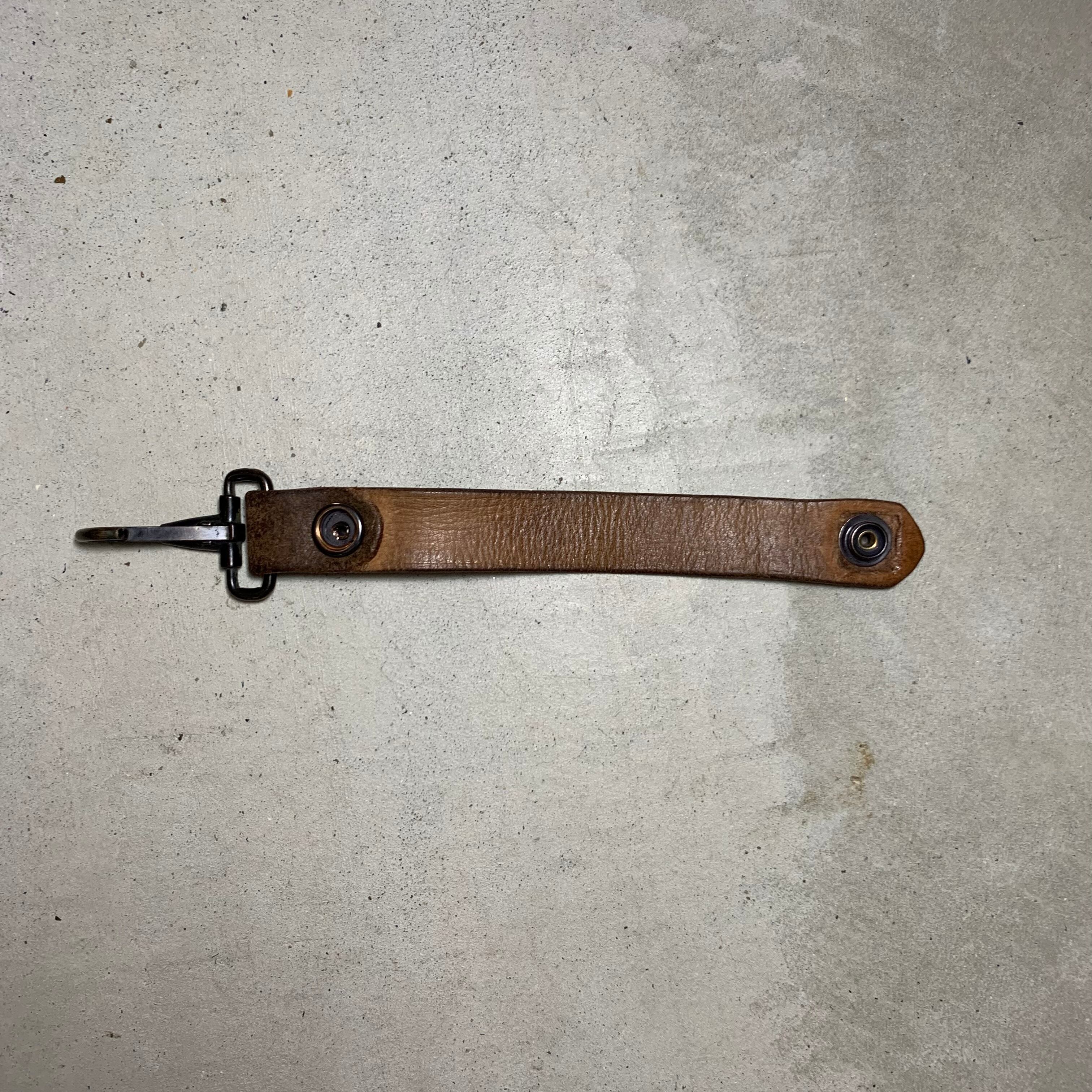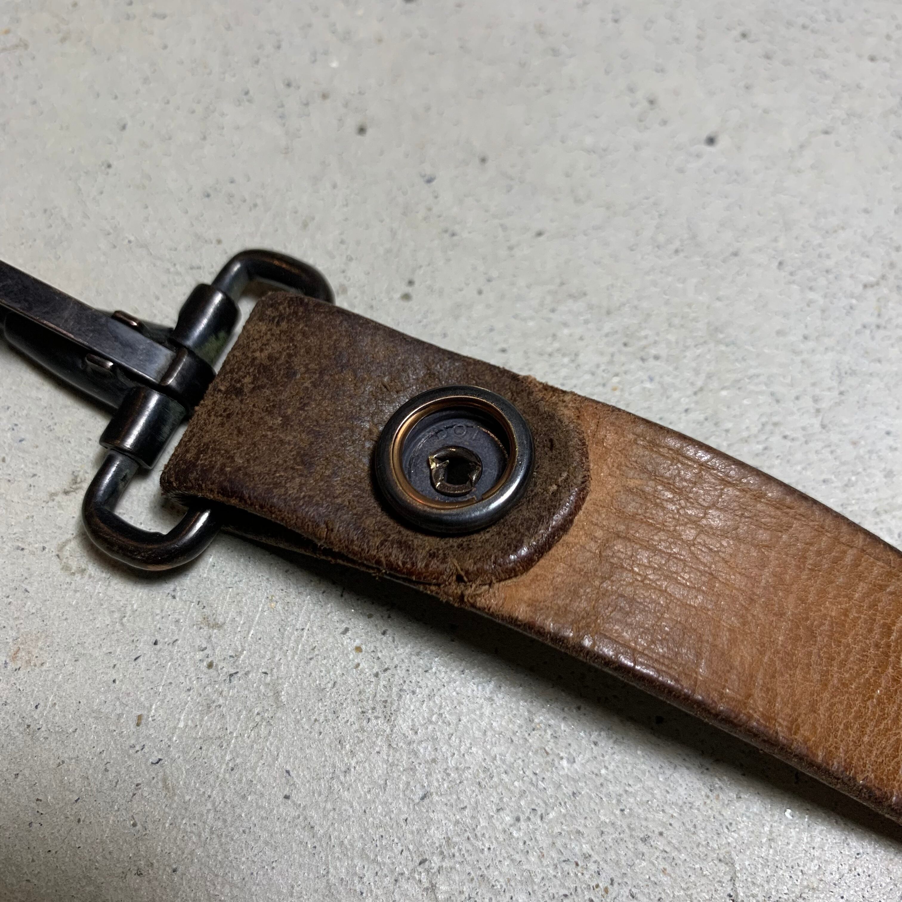 60~70年代頃のユーロミリタリーのレザーベルトを使用しキーホルダーを作りました。ナスカンは60年代の米軍の物で、アンカーマークで有名なNorth&Judd社が納品したナスカンです。ドットボタンも米軍で、70年代のデッドストックの物を使用しております。