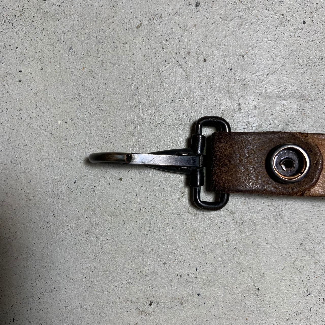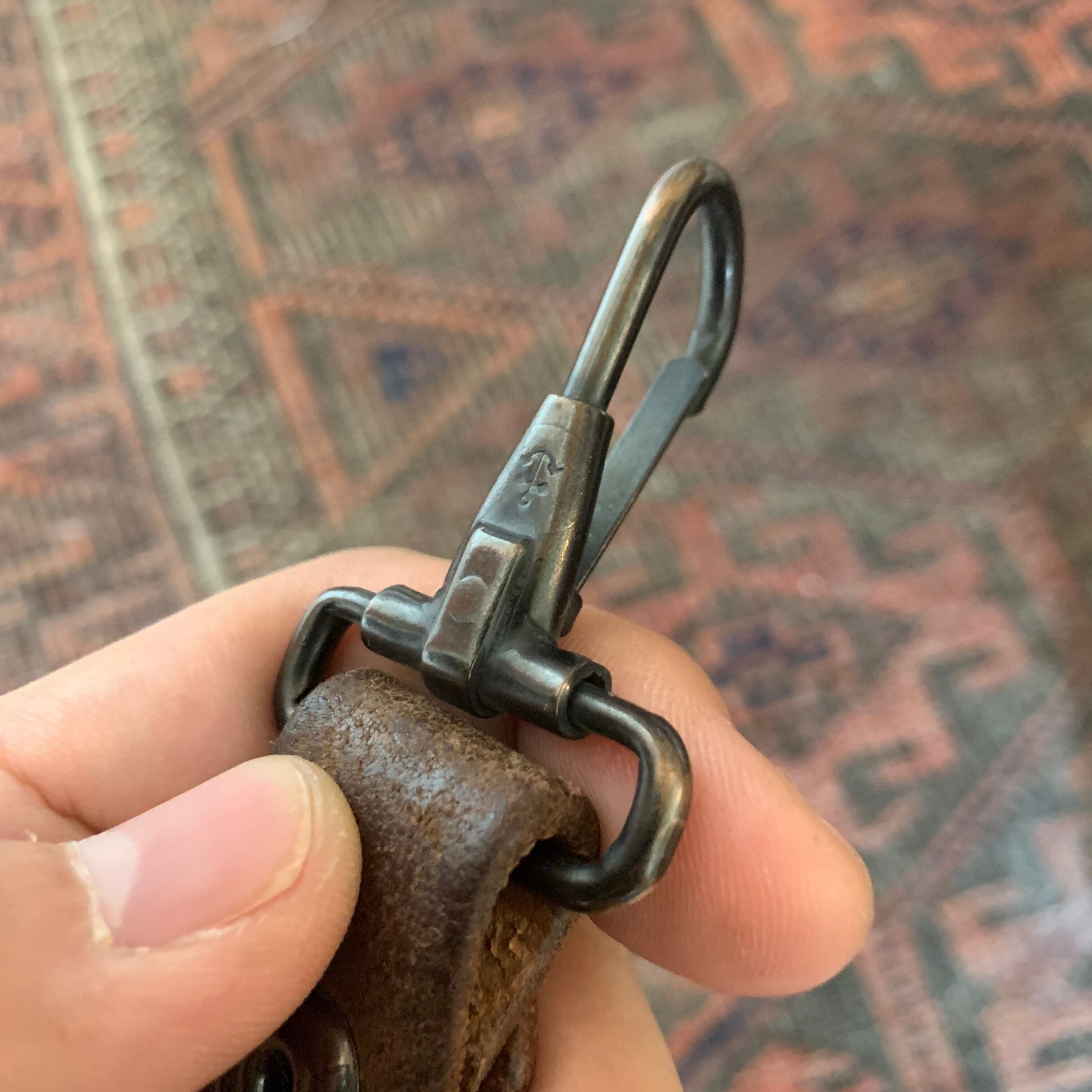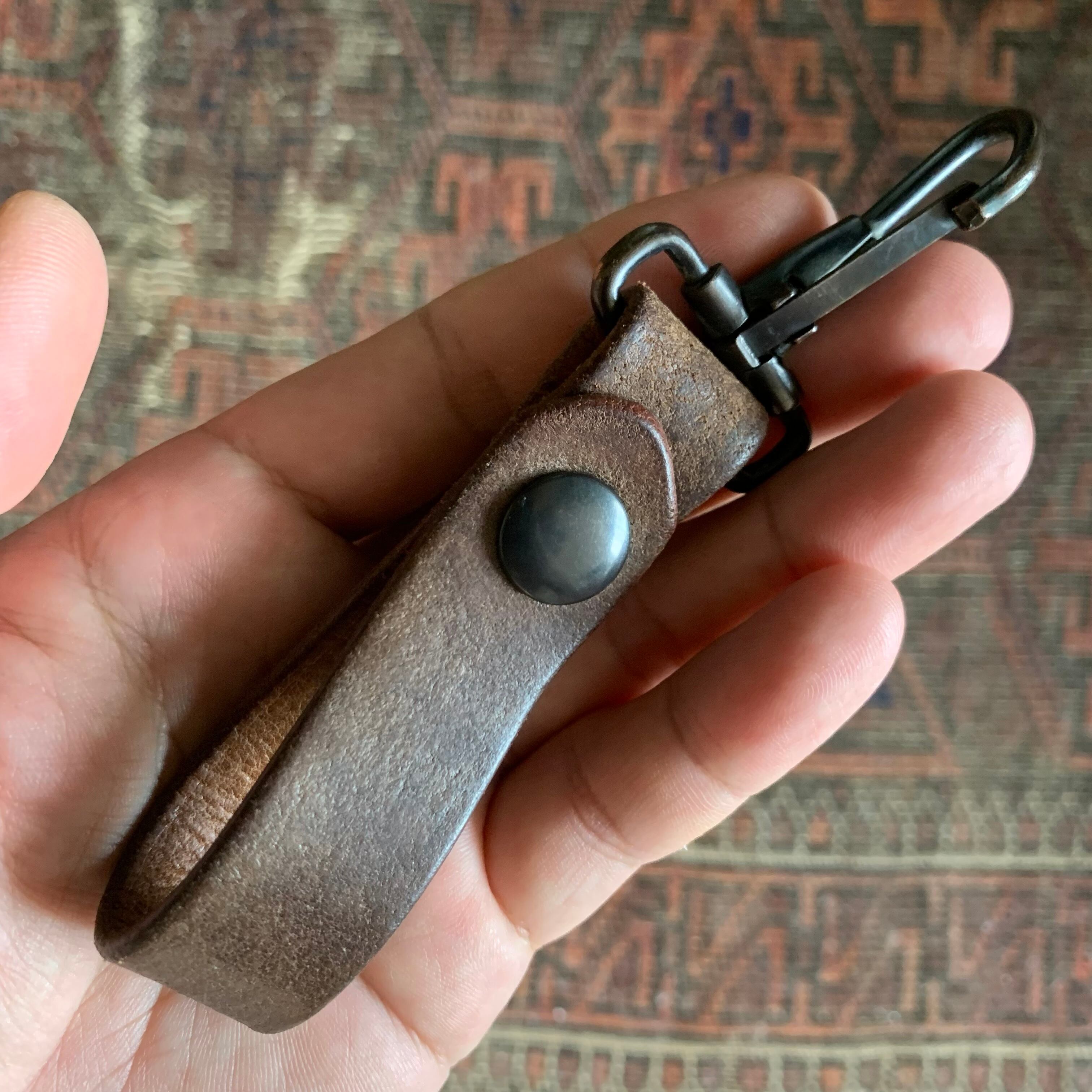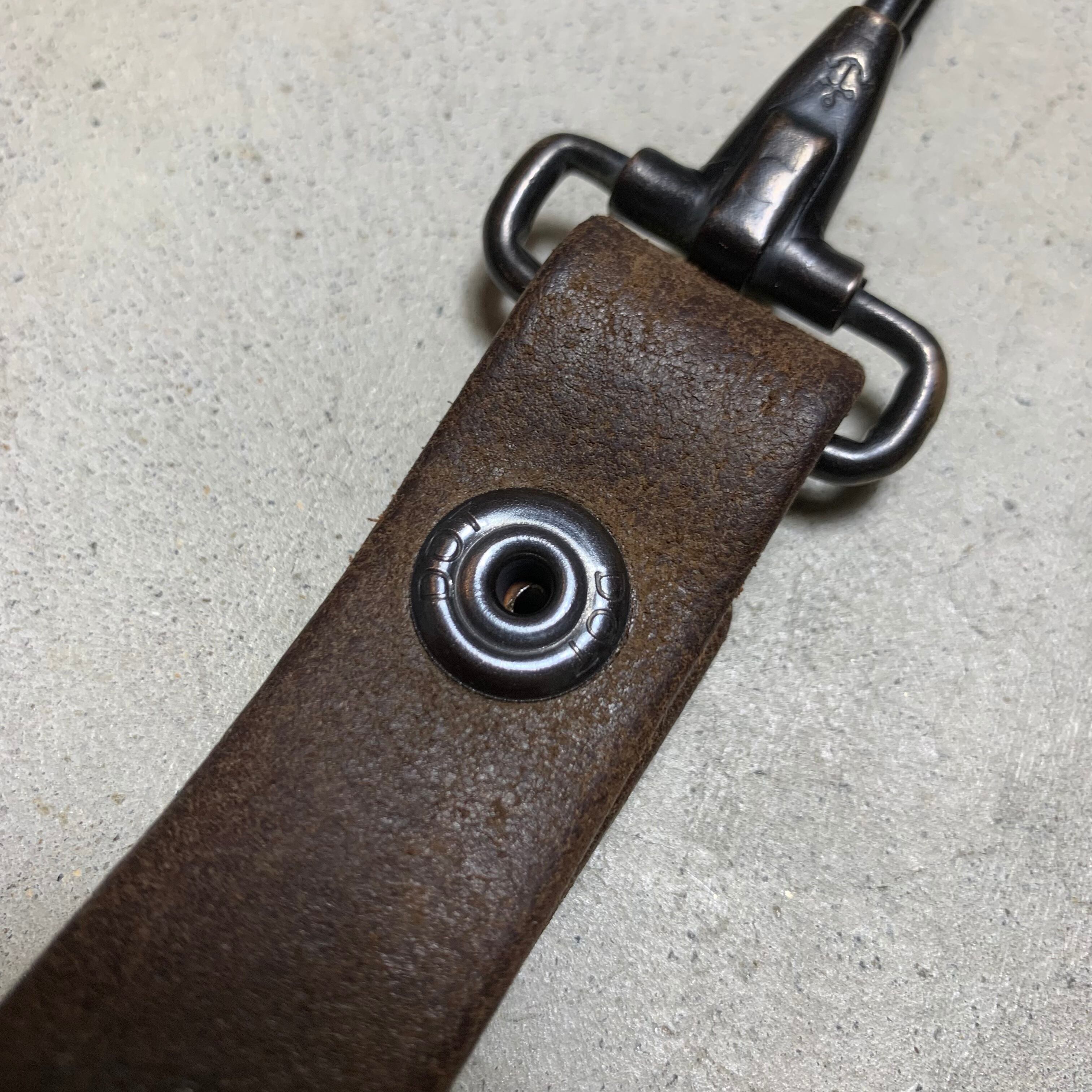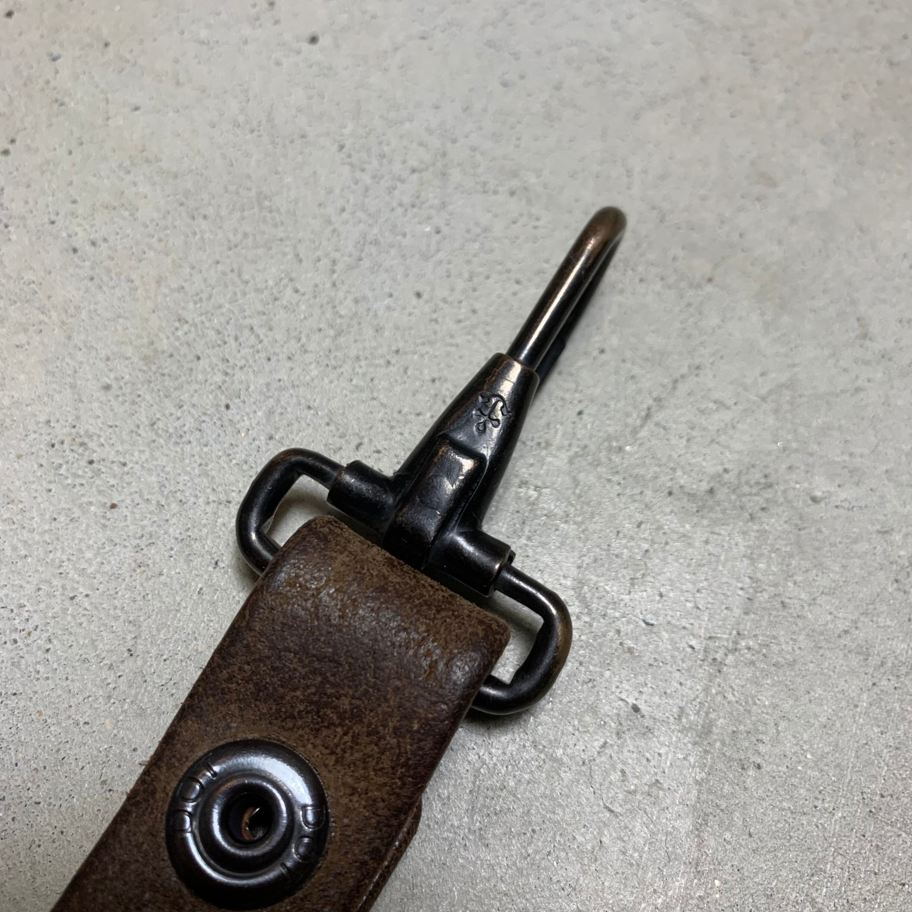 60~70年代頃のユーロミリタリーのレザーベルトを使用しキーホルダーを作りました。ナスカンは60年代の米軍の物で、アンカーマークで有名なNorth&Judd社が納品したナスカンです。ドットボタンも米軍で、70年代のデッドストックの物を使用しております。