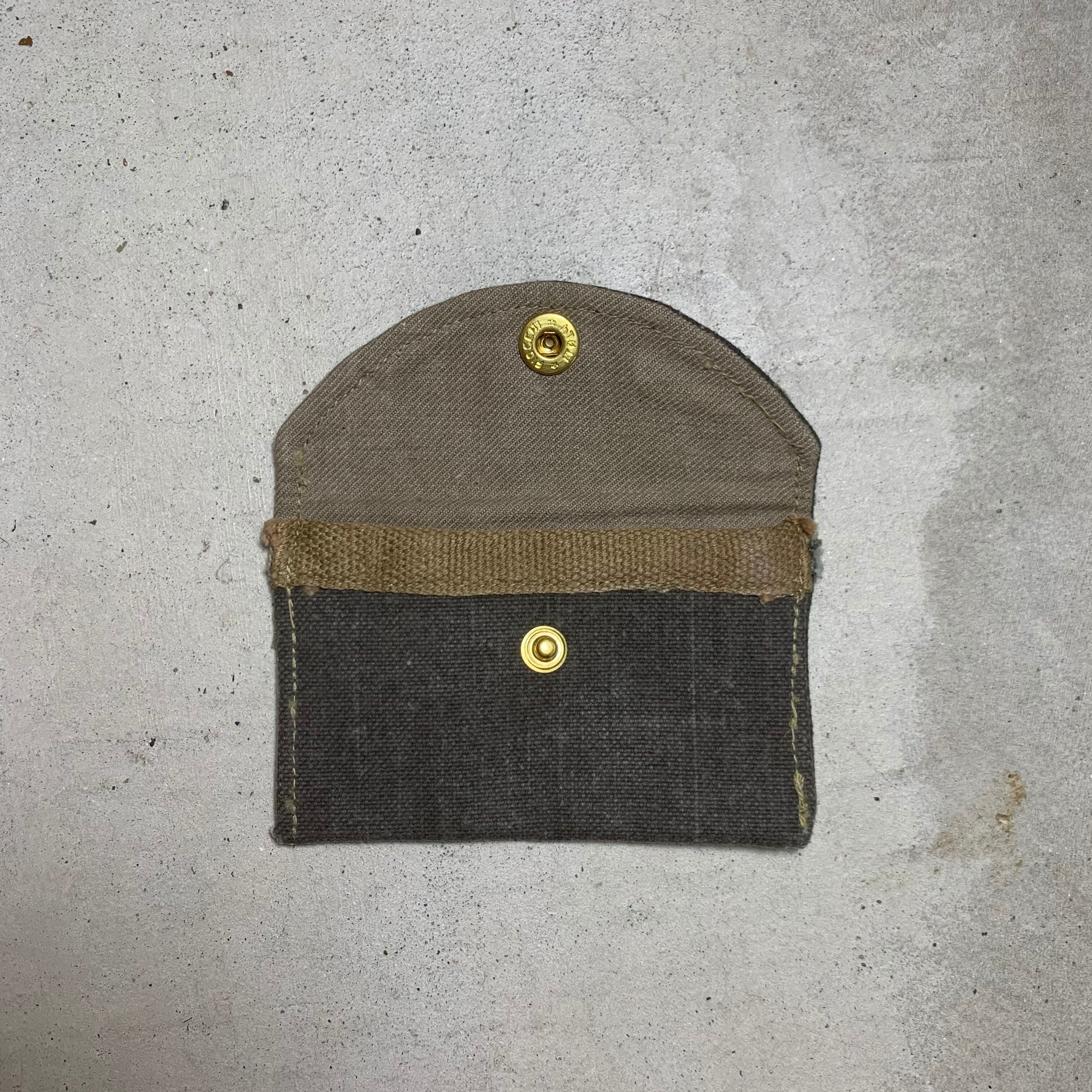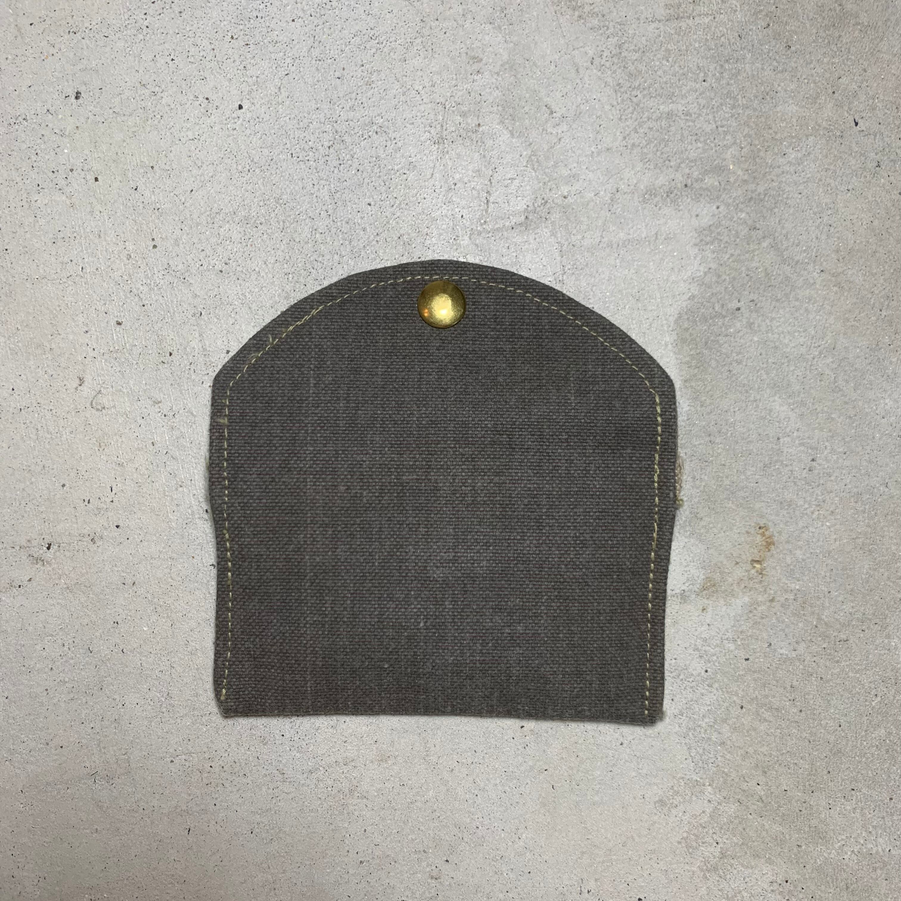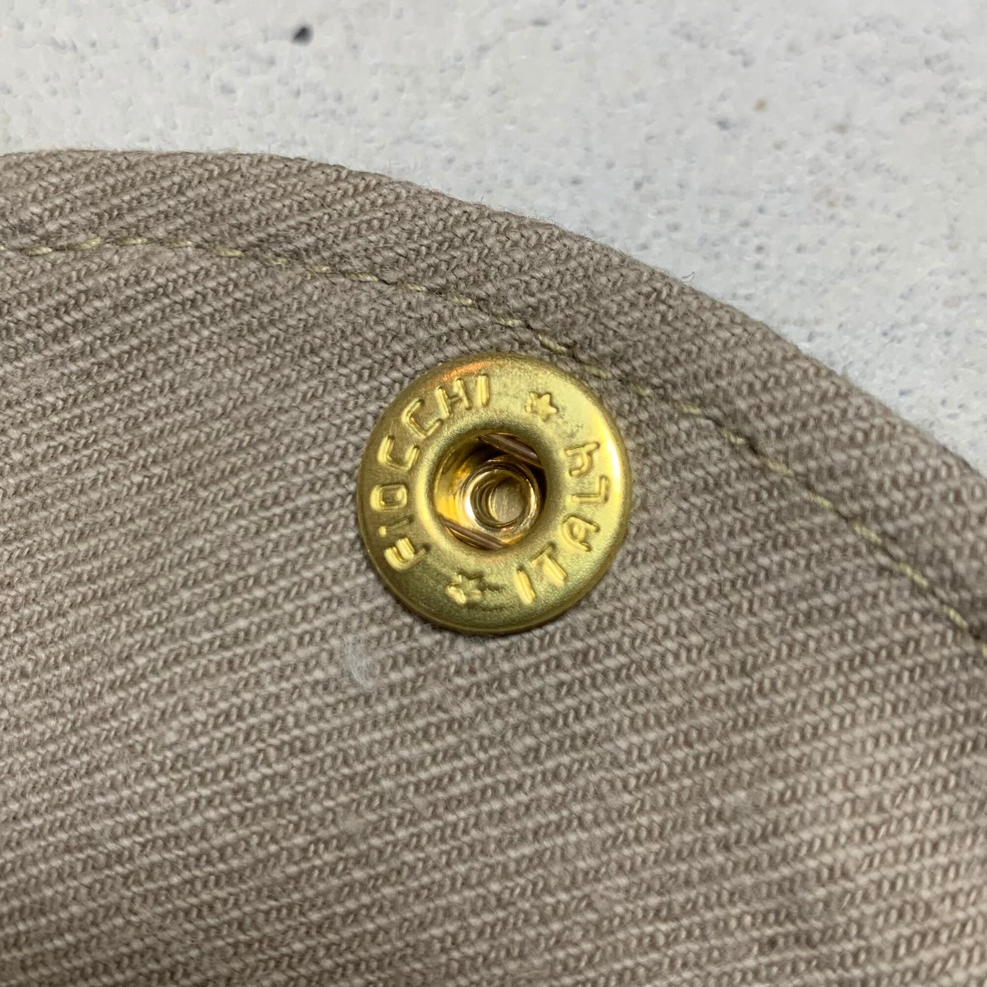 表側は60年代のスウェーデン軍のバッグで使用されていた固めのキャンバスを使用。裏地は30年代のスウェーデン軍のパンツの生地を使用。パイピングテープも同じくスウェーデン軍の物で、こちらは50年代頃に使われていた素材になります。バネホックはイタリアの『FIOCCHI(フィオッキ)』の物を使用。こちらはグッチやフェリージ、イルビソンテなどの高級ブランドが使用していた物ですが、今現在フィオッキは別会社に吸収合併され、生産されておらず、デッドストックのみの貴重な資材になります。素材は真鍮です。パチンと止めた感覚が非常に気持ちのいいバネホックです。