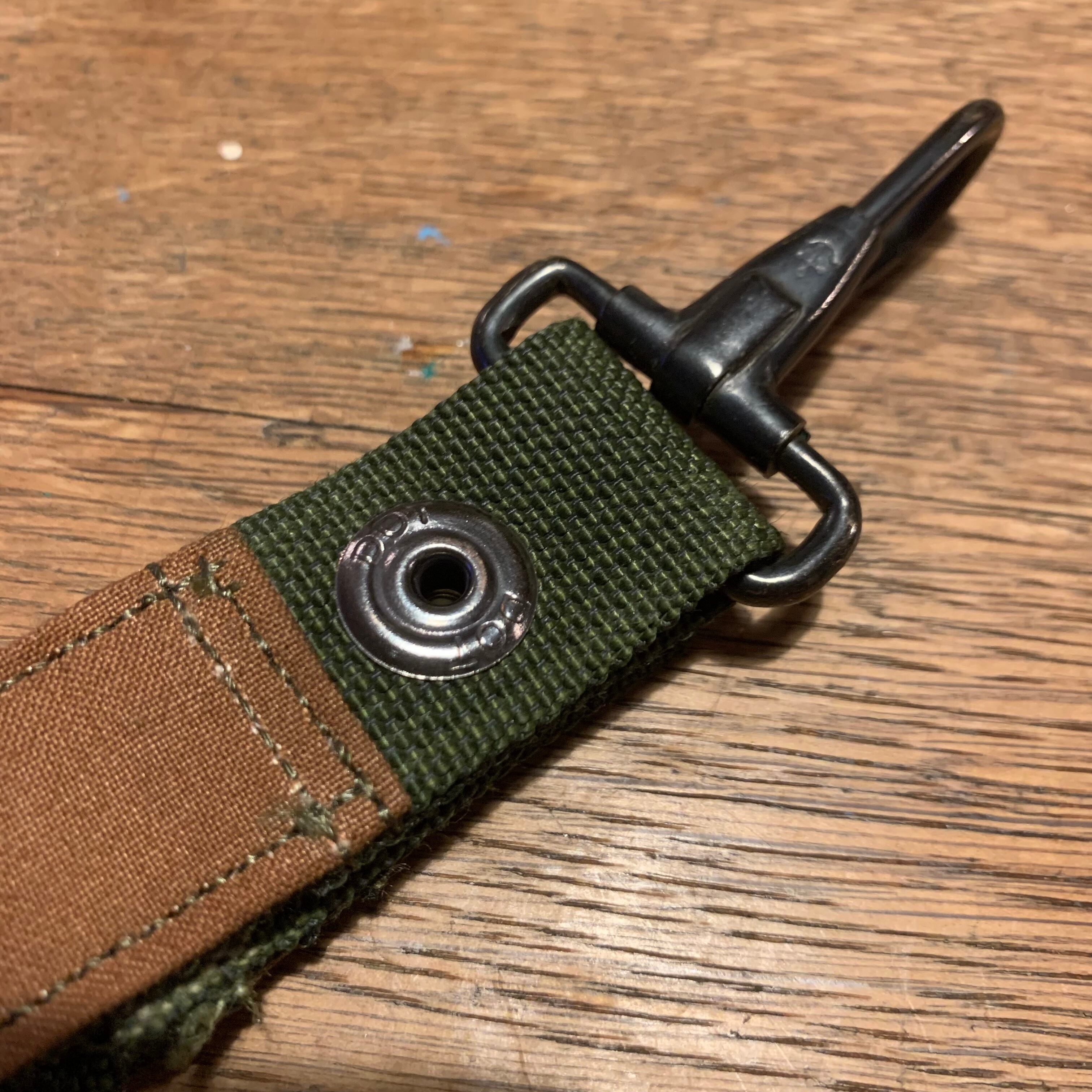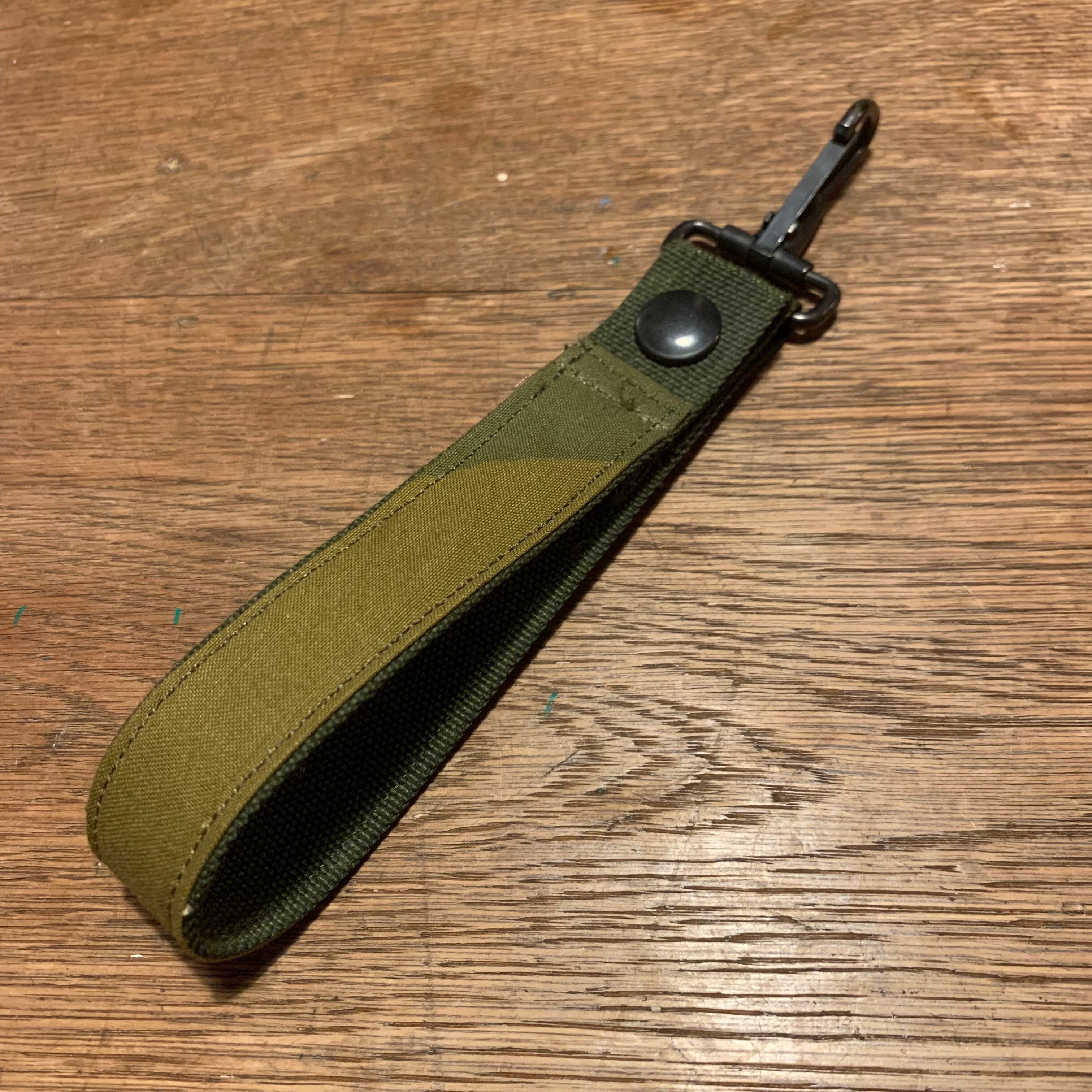80年代頃のUS ARMYのナイロンストラップを使用しキーホルダーを作りました。表側には60年代イタリア軍のサンマルコカモを縫い合わせています。ナスカンは60年代の米軍の物で、アンカーマークで有名なNorth&Judd社が納品したナスカンです。ドットボタンも米軍で、70年代のデッドストックの物を使用しております。