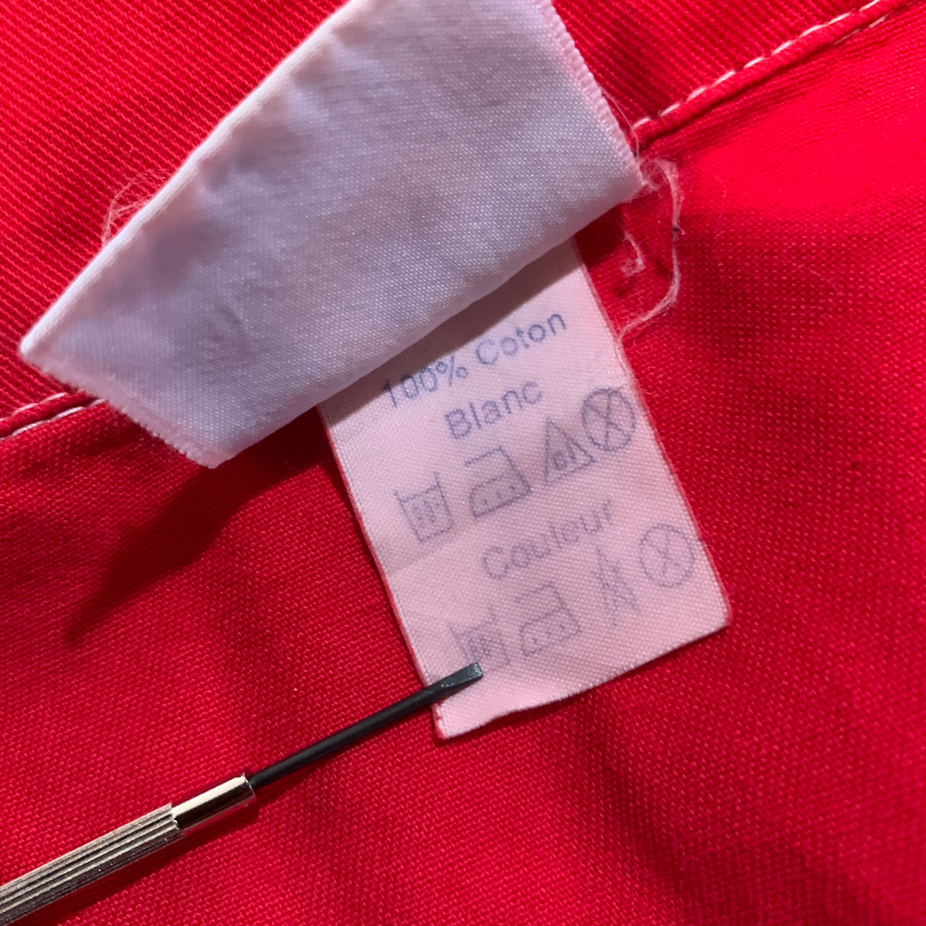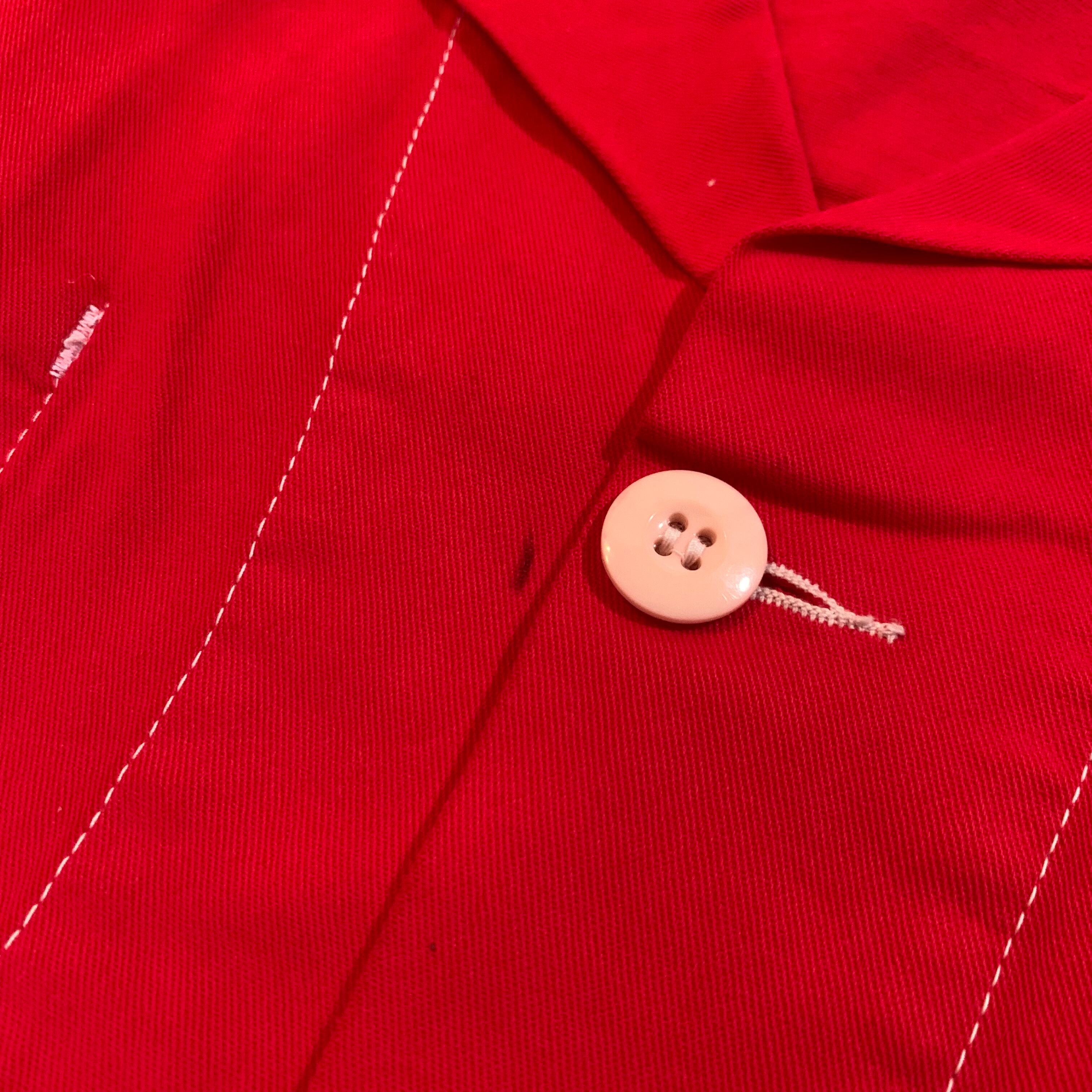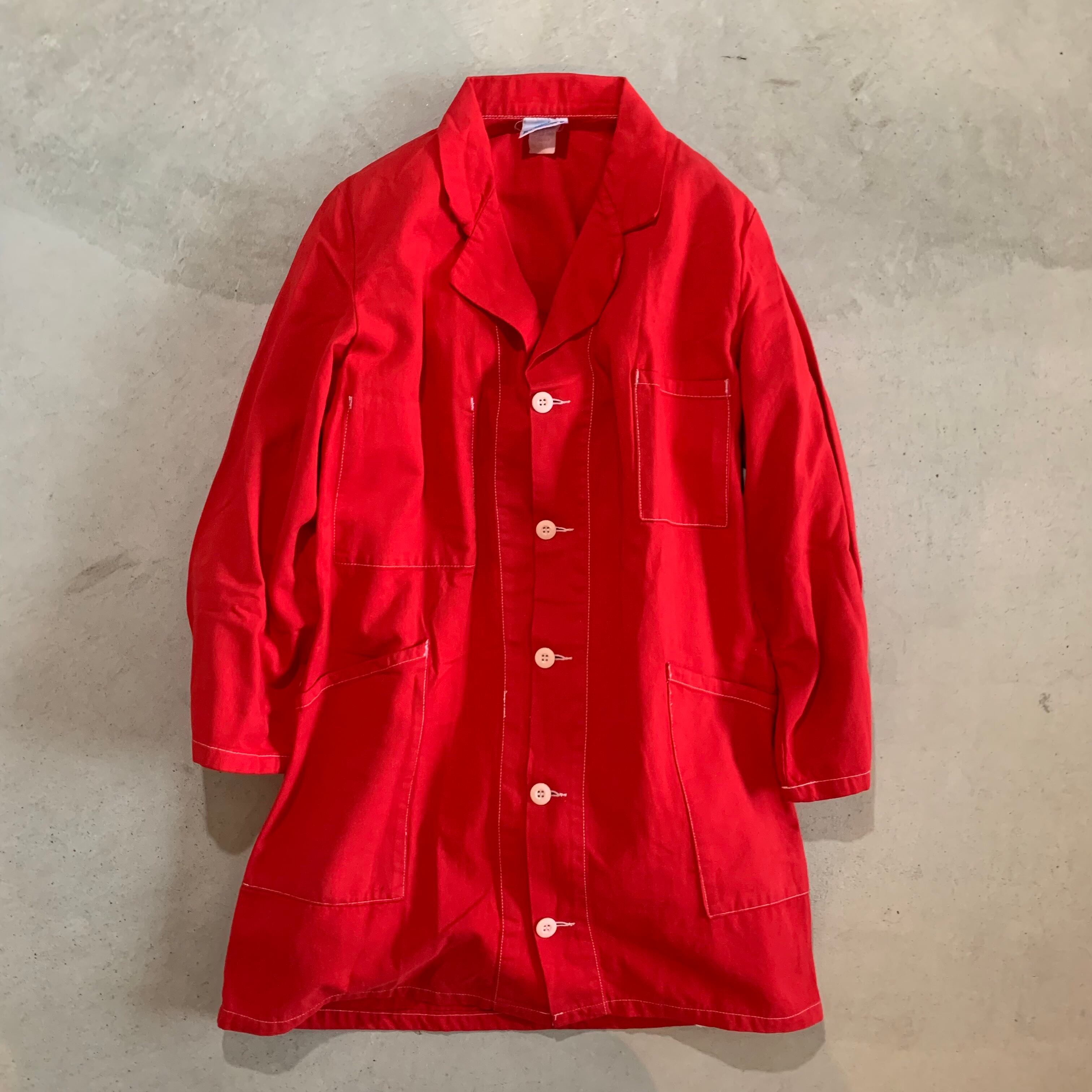 真っ赤に染まった、ユーロヴィンテージの後染めショップコートです。