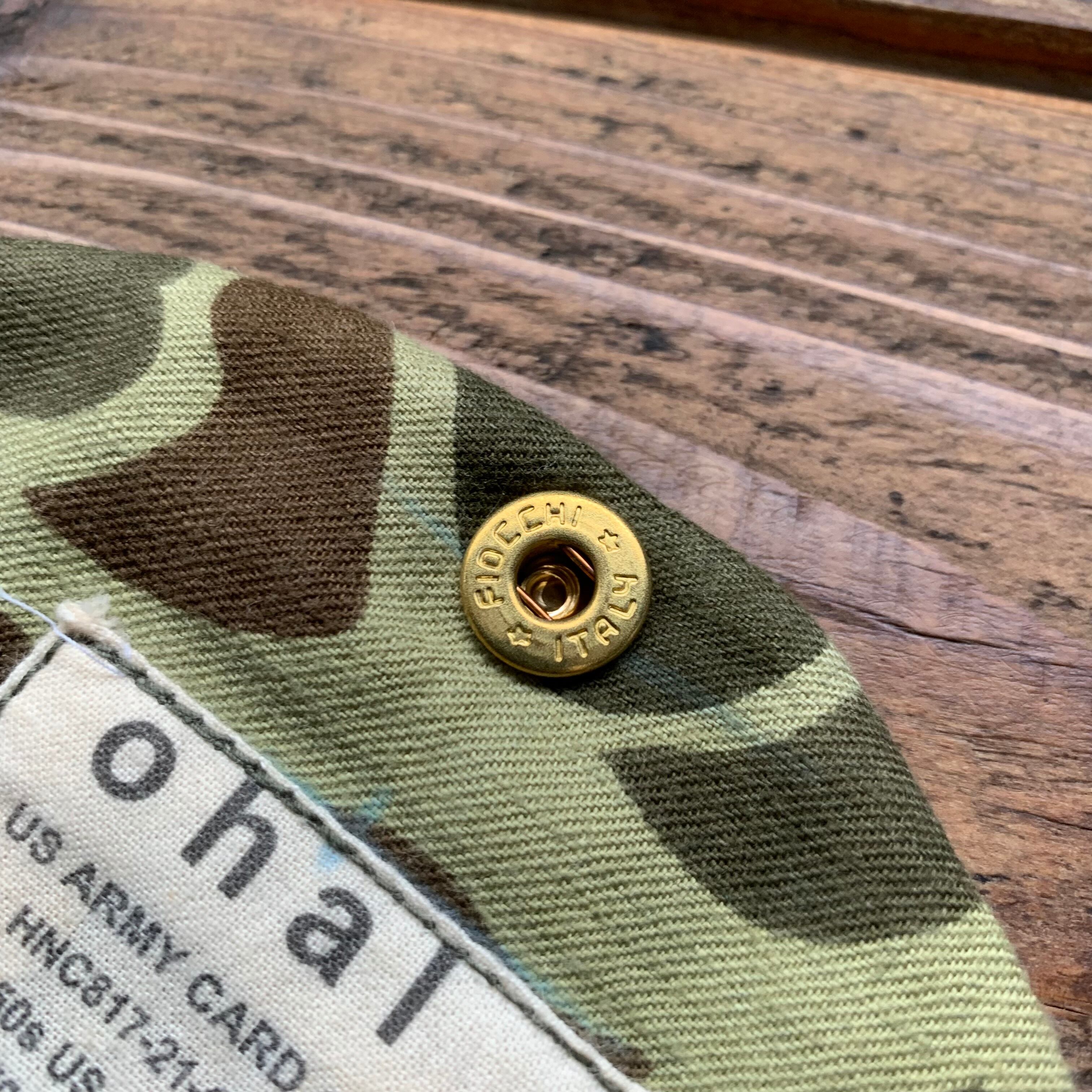 スナップボタンはイタリアの『FIOCCHI(フィオッキ)』の物を使用。こちらはグッチやフェリージ、イルビソンテなどの高級ブランドが使用していた物ですが、今現在フィオッキは別会社に吸収合併され、生産されておらず、デッドストックのみの貴重な資材になります。素材は真鍮です。パチンと止めた感覚が非常に気持ちのいいスナップボタンです。