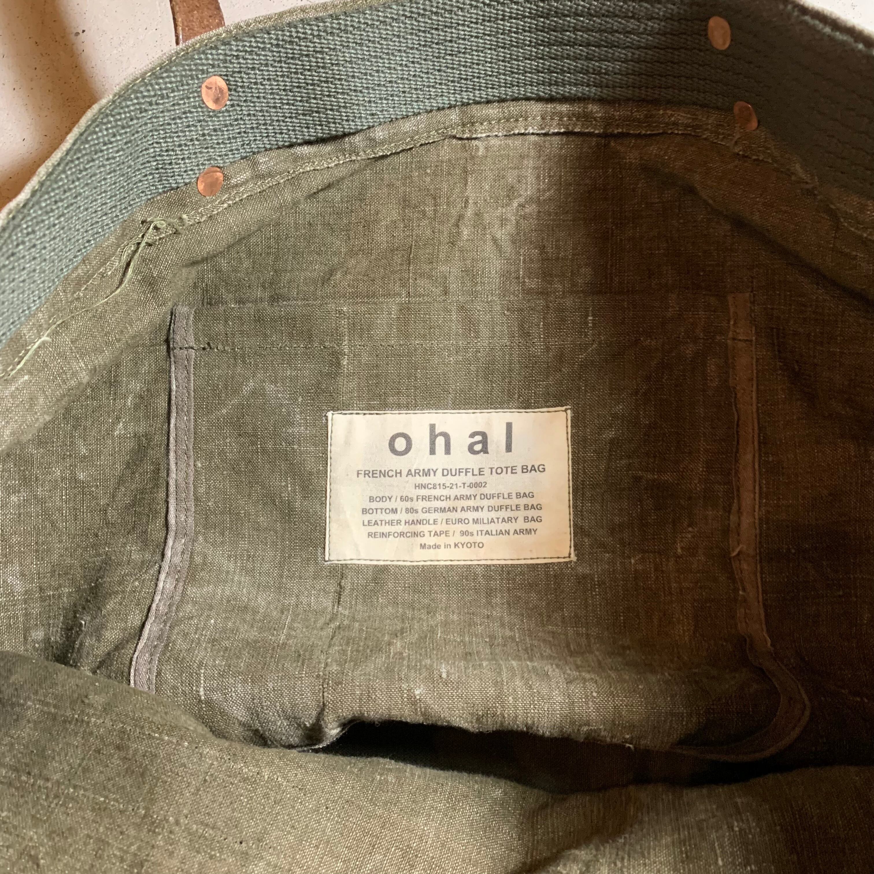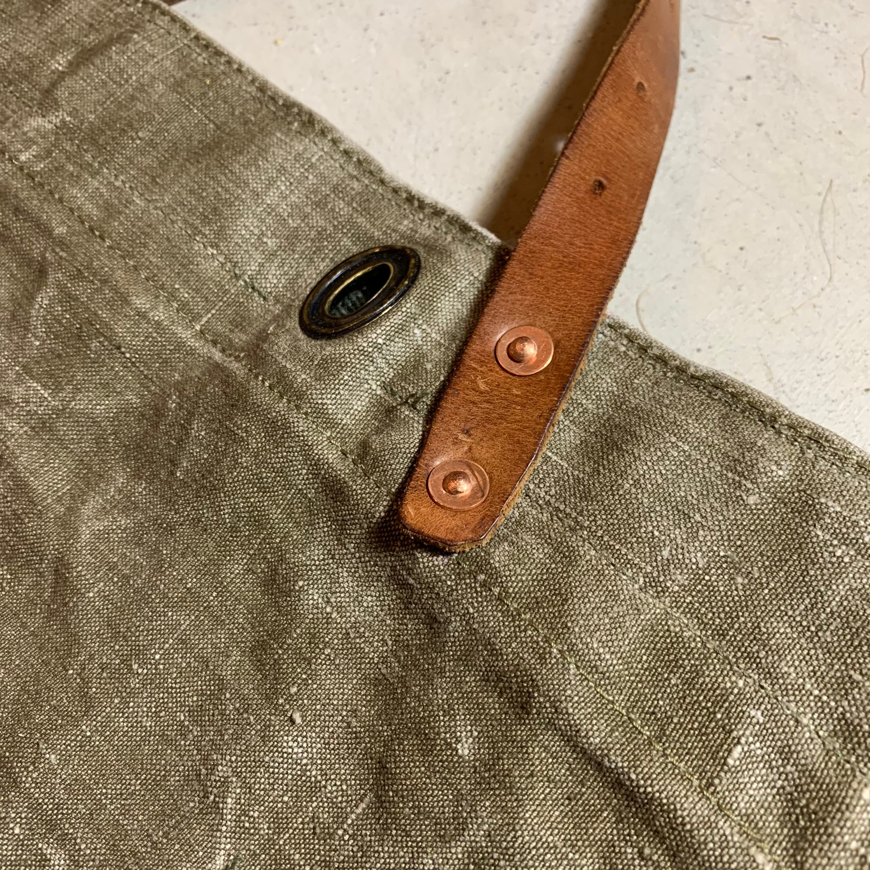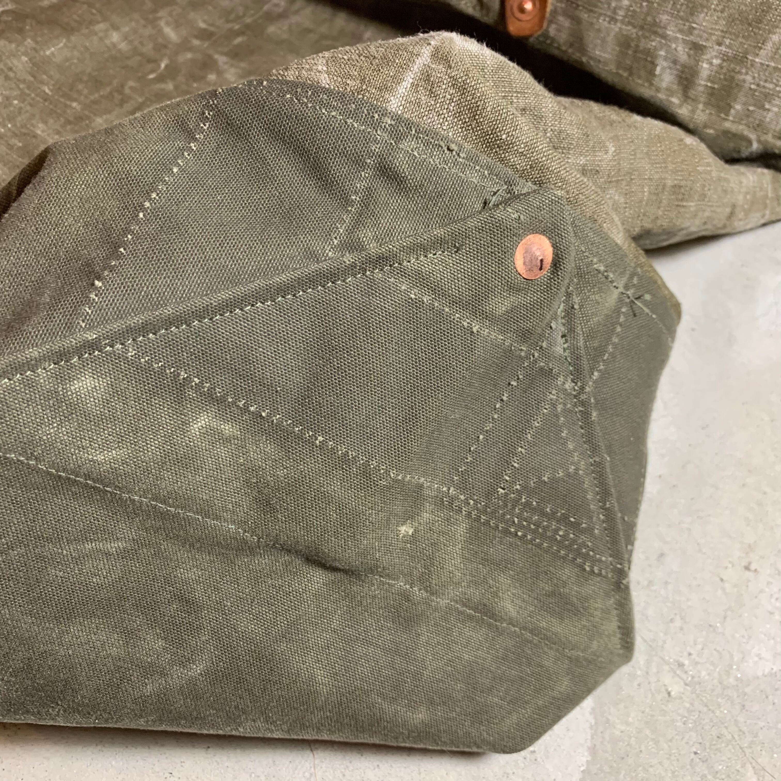 ボディーは60年代のフランス軍のダッフルバッグ。この時代の独特なクタッとしたリネン素材が特徴。中央部あたりにあるタグには手書きで何か書かれています。開口部にキャンバステープを縫い付けることで、クタッとした素材感ですが形が崩れません。こちらのキャンバステープも90年代のイタリア軍の物になります。ボトムは80年代ドイツ軍のダッフルバッグの素材を使ってます。持ち手は70年代頃のヨーロッパミリタリー のバッグに使われていたレザーショルダーを磨いた物を使用しています。中にはポケットが一室ございます。