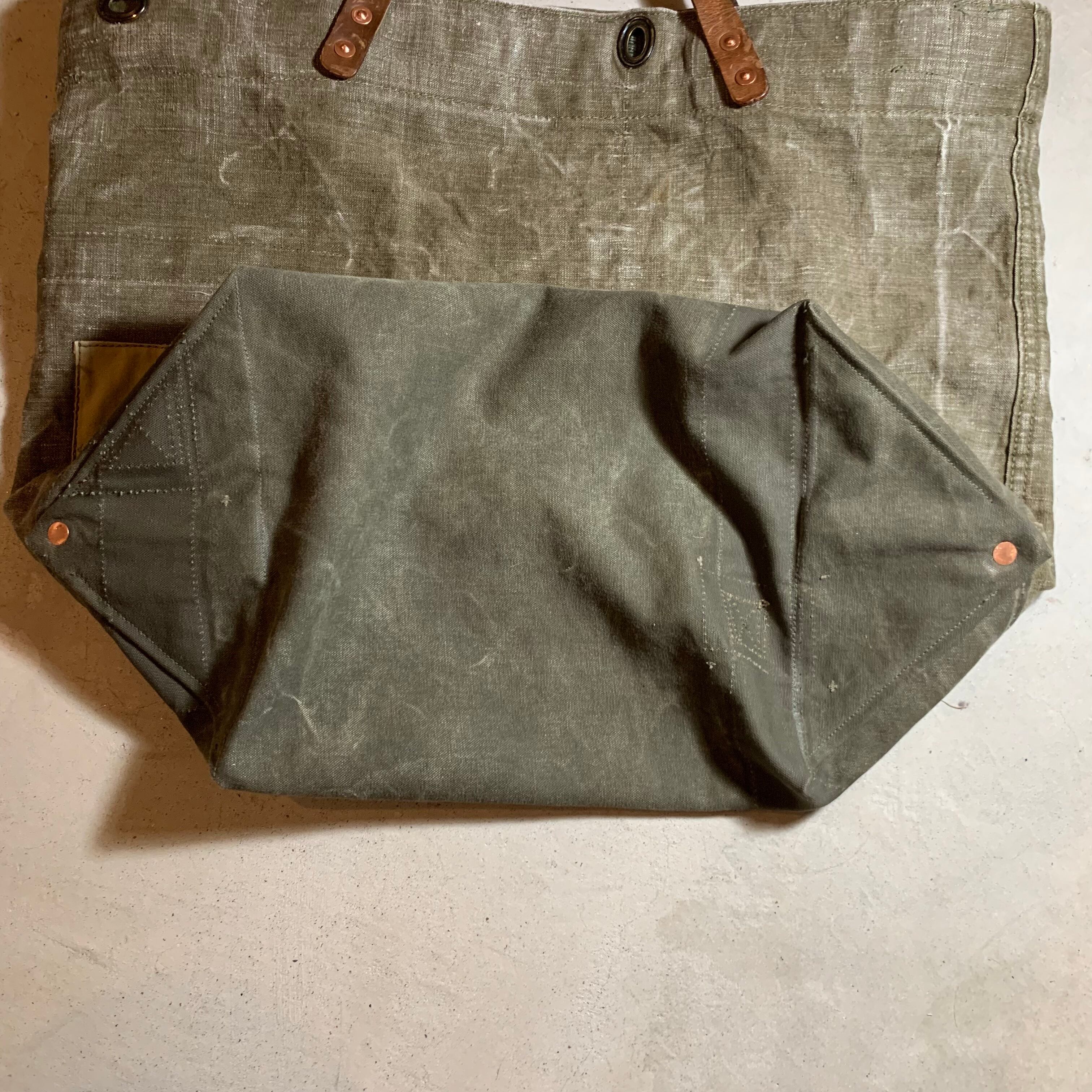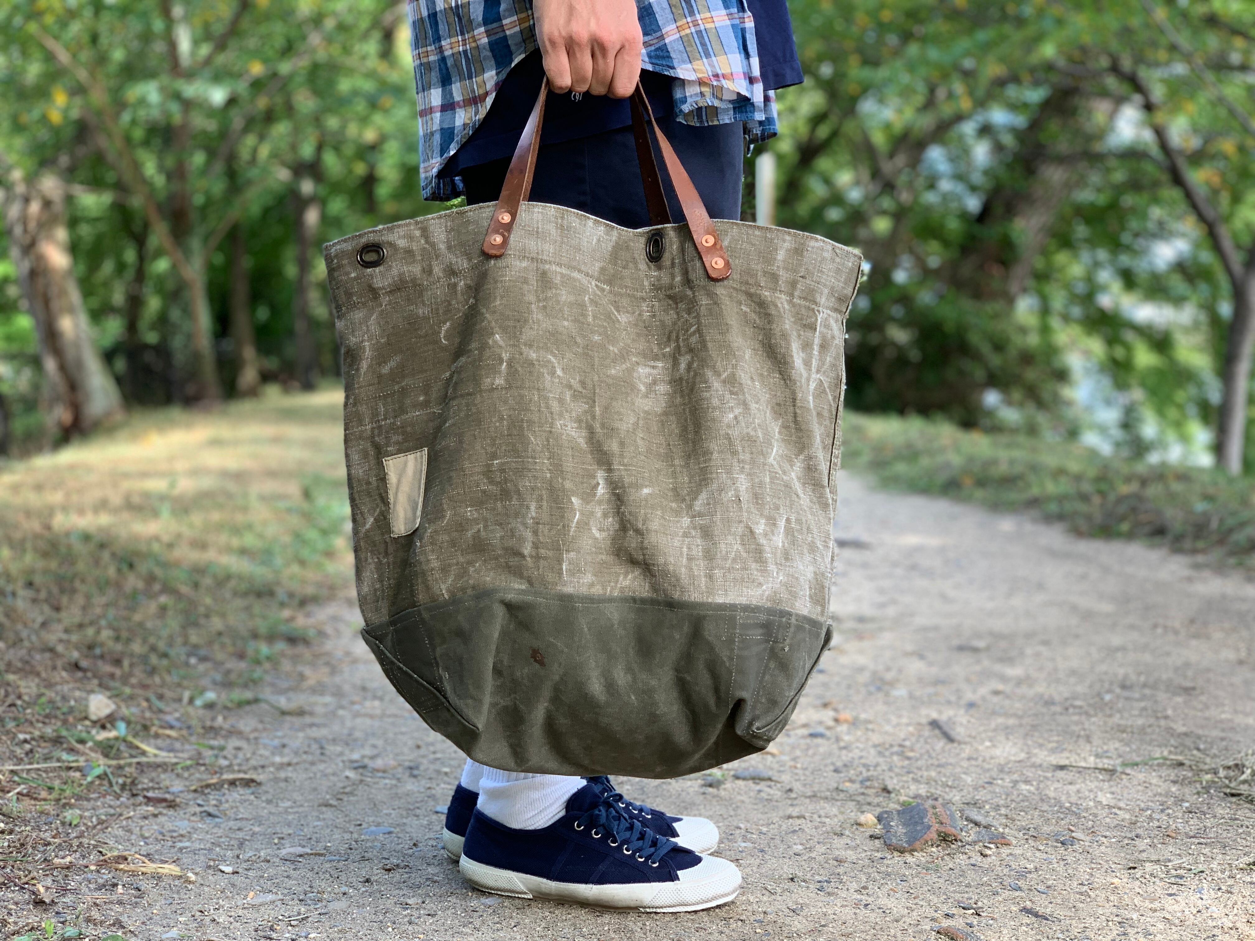 ミリタリーのダッフルバッグをベースに、ヴィンテージ素材を組み合わせてトートバッグを作成しました。