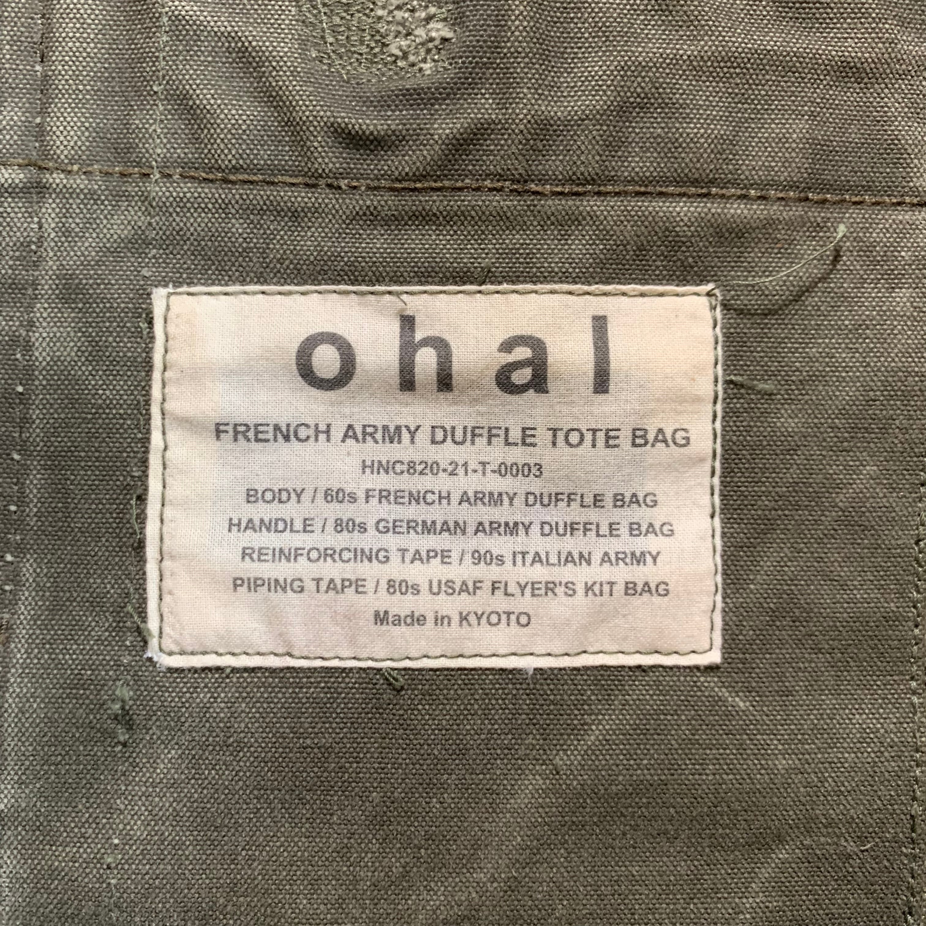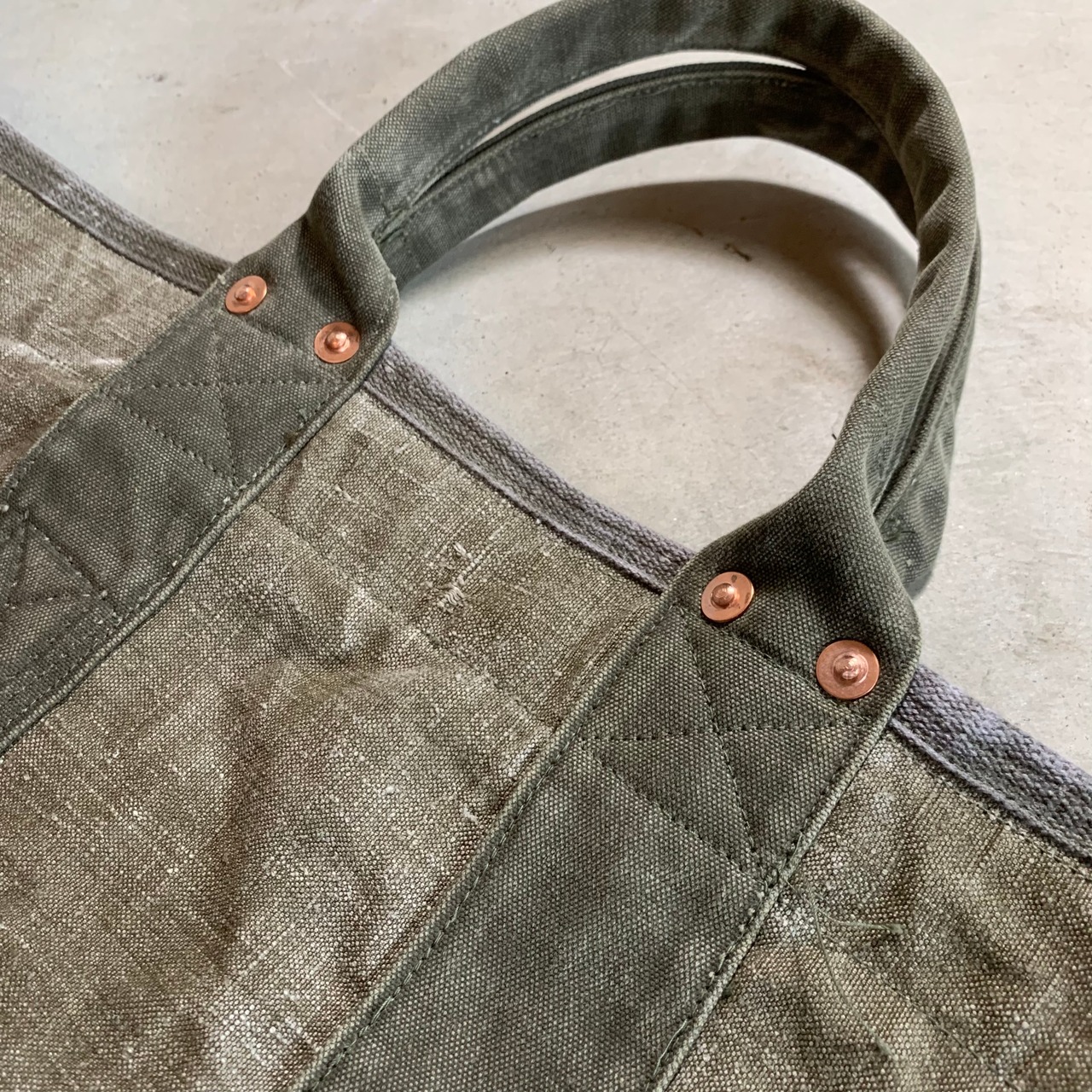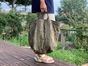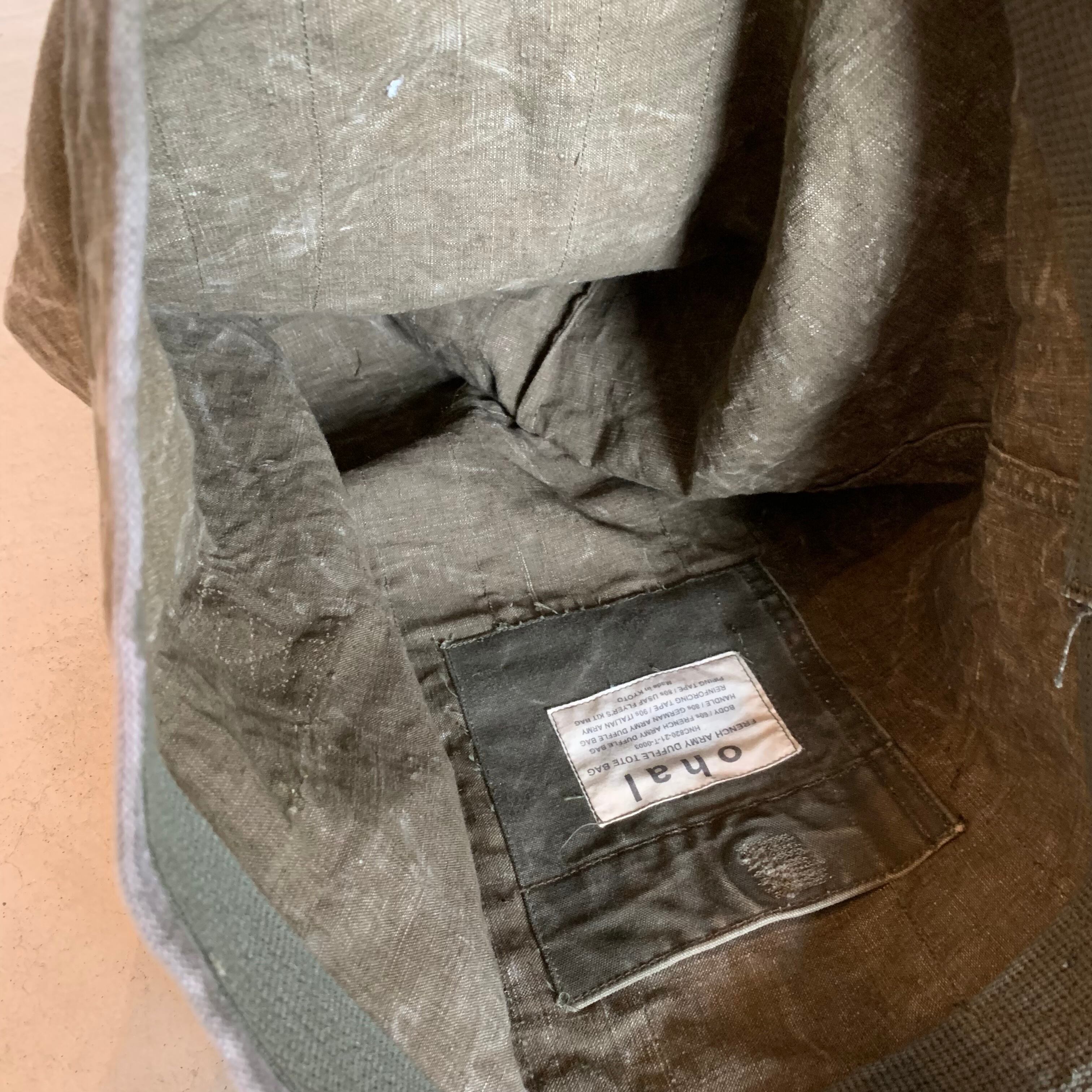 ボディーの生地は50〜60年代のフランス軍のリネン素材のダッフルバッグの生地を、使っております。持ち手は80年代のドイツ軍の生地を使って作成しております。