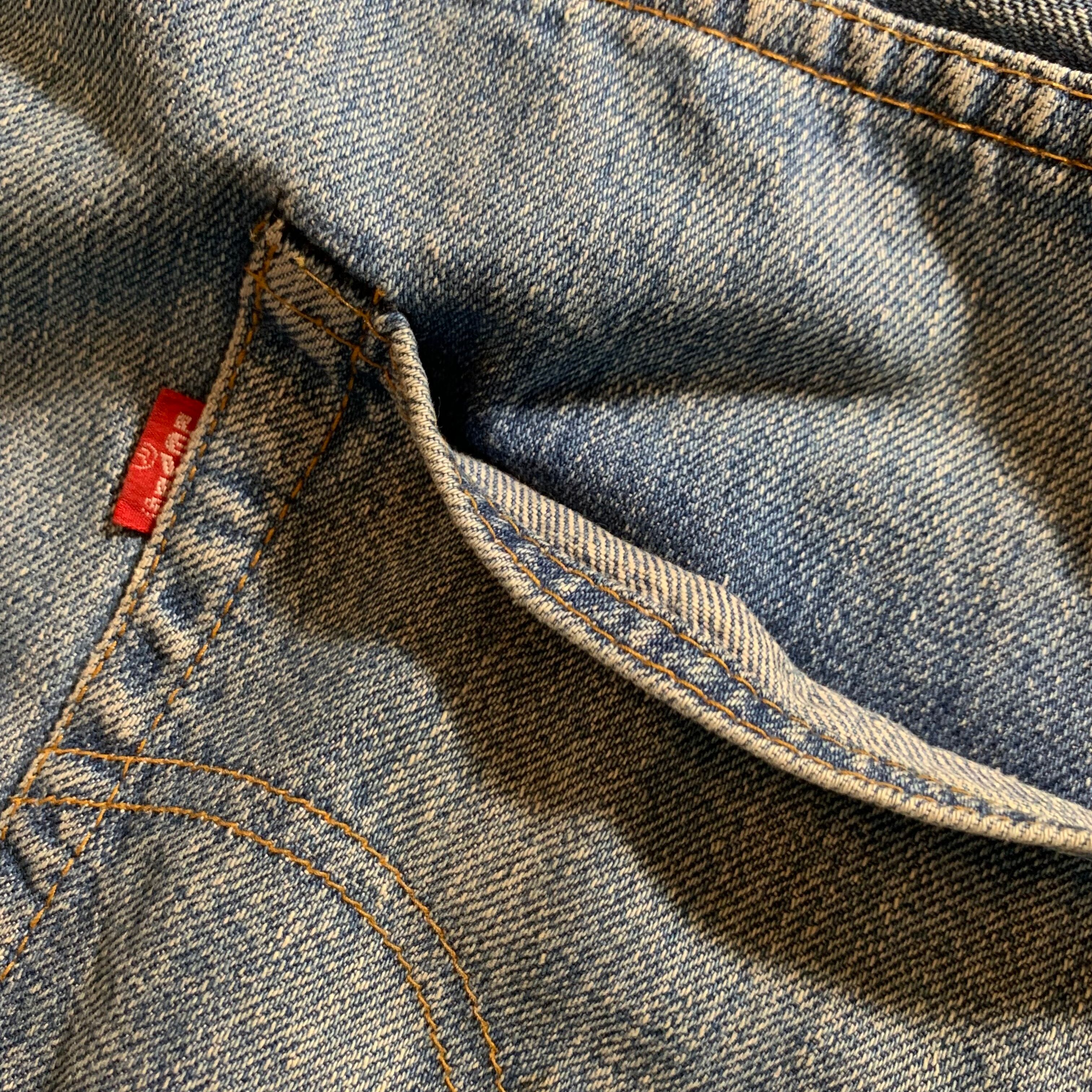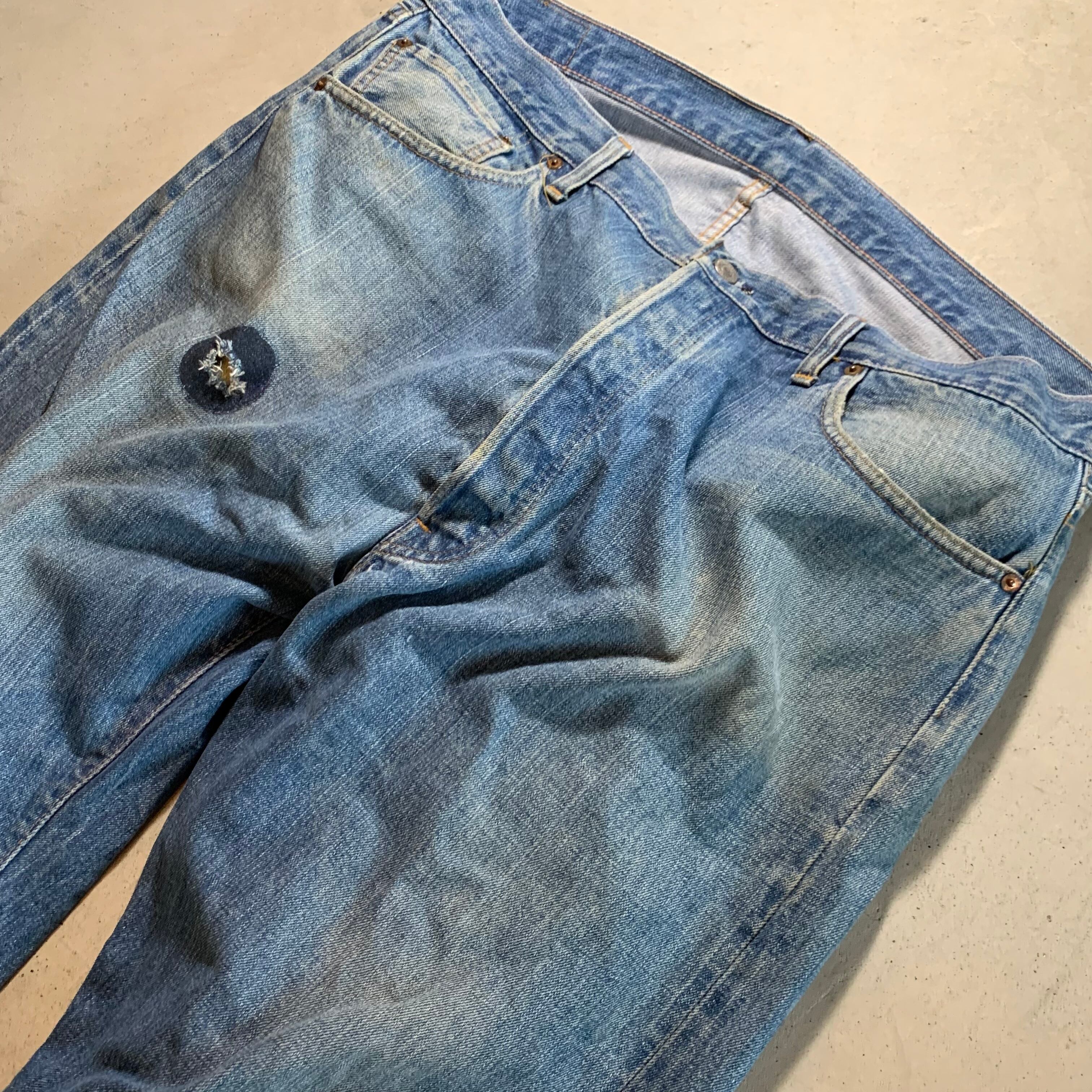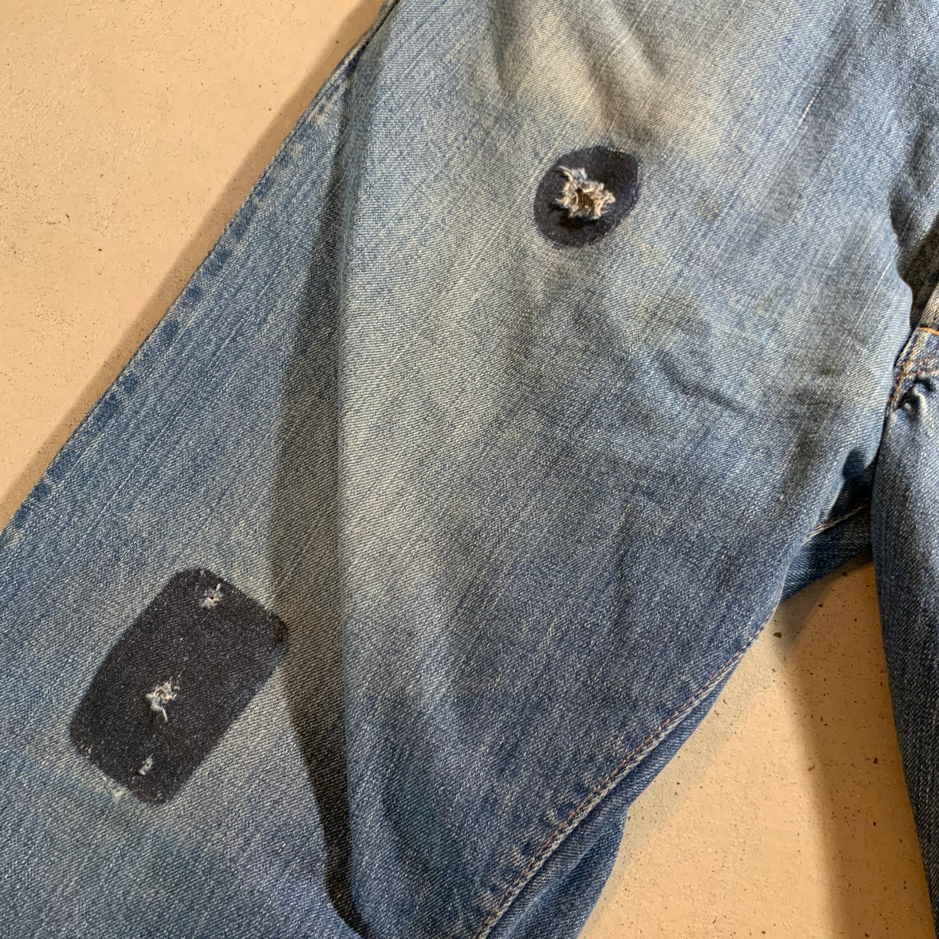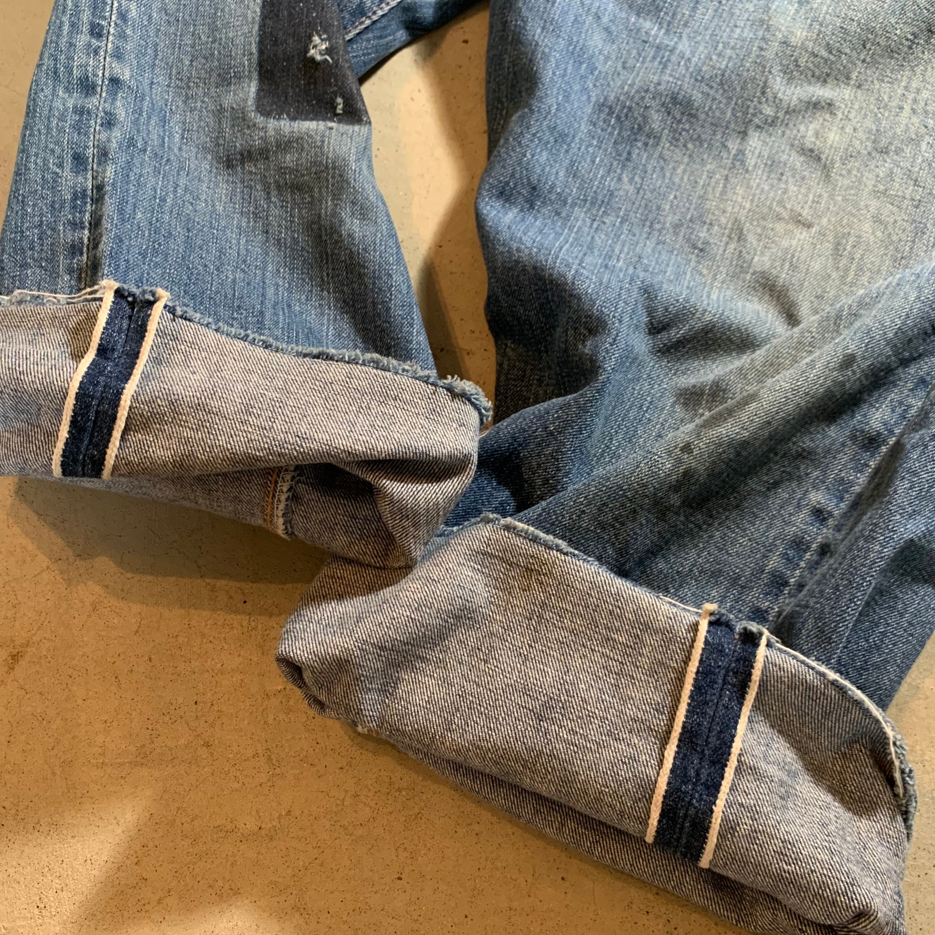 70年代、501のヒップポケットシングルステッチの66前期になります。サイズは大きめなのでワイドな雰囲気で、丈はクロップド丈でセルフカットされており、独特な雰囲気です。右足にダメージがあります。画像でご確認ください。