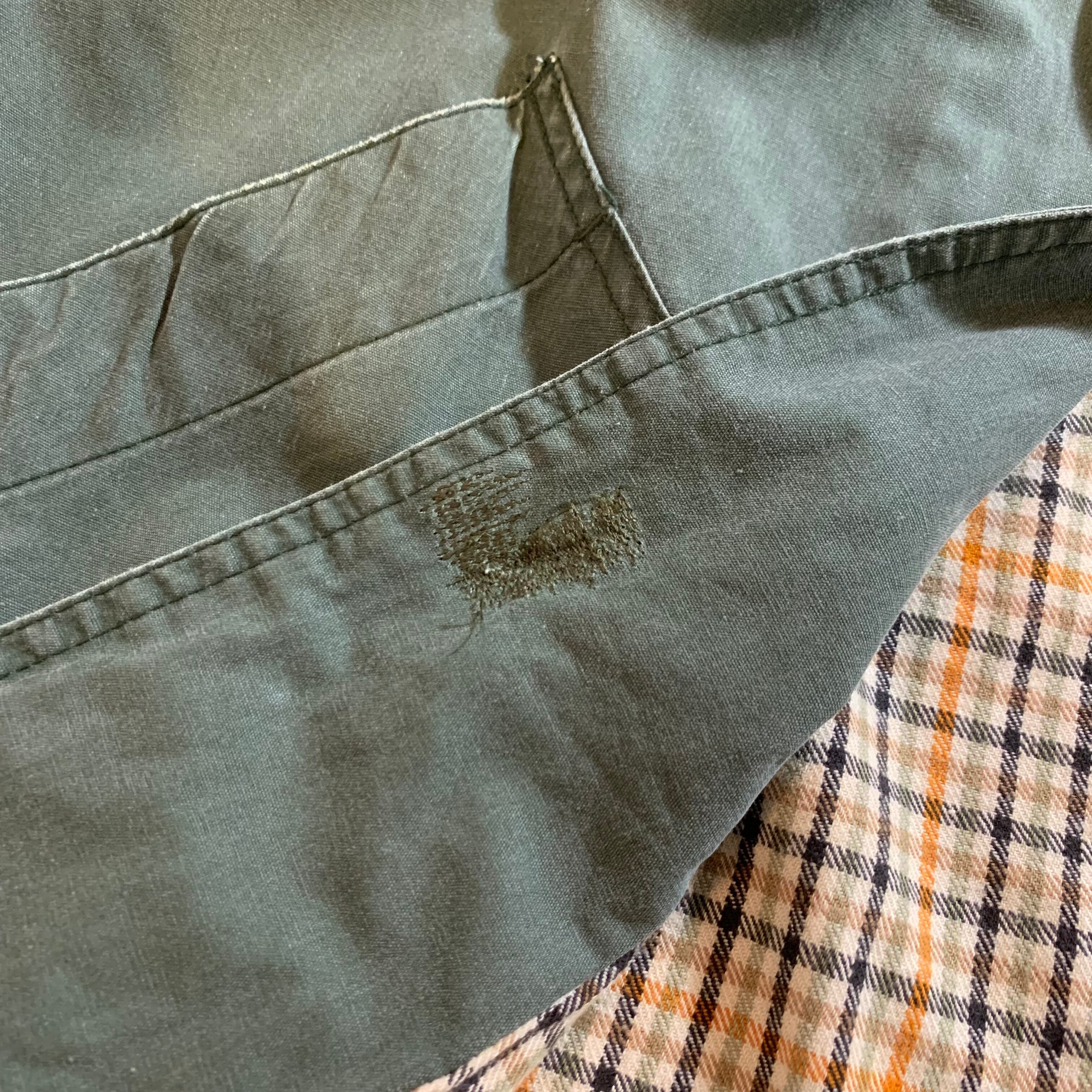 前見頃のボタン下、左のポケット縫い付け箇所に補修跡がございます。