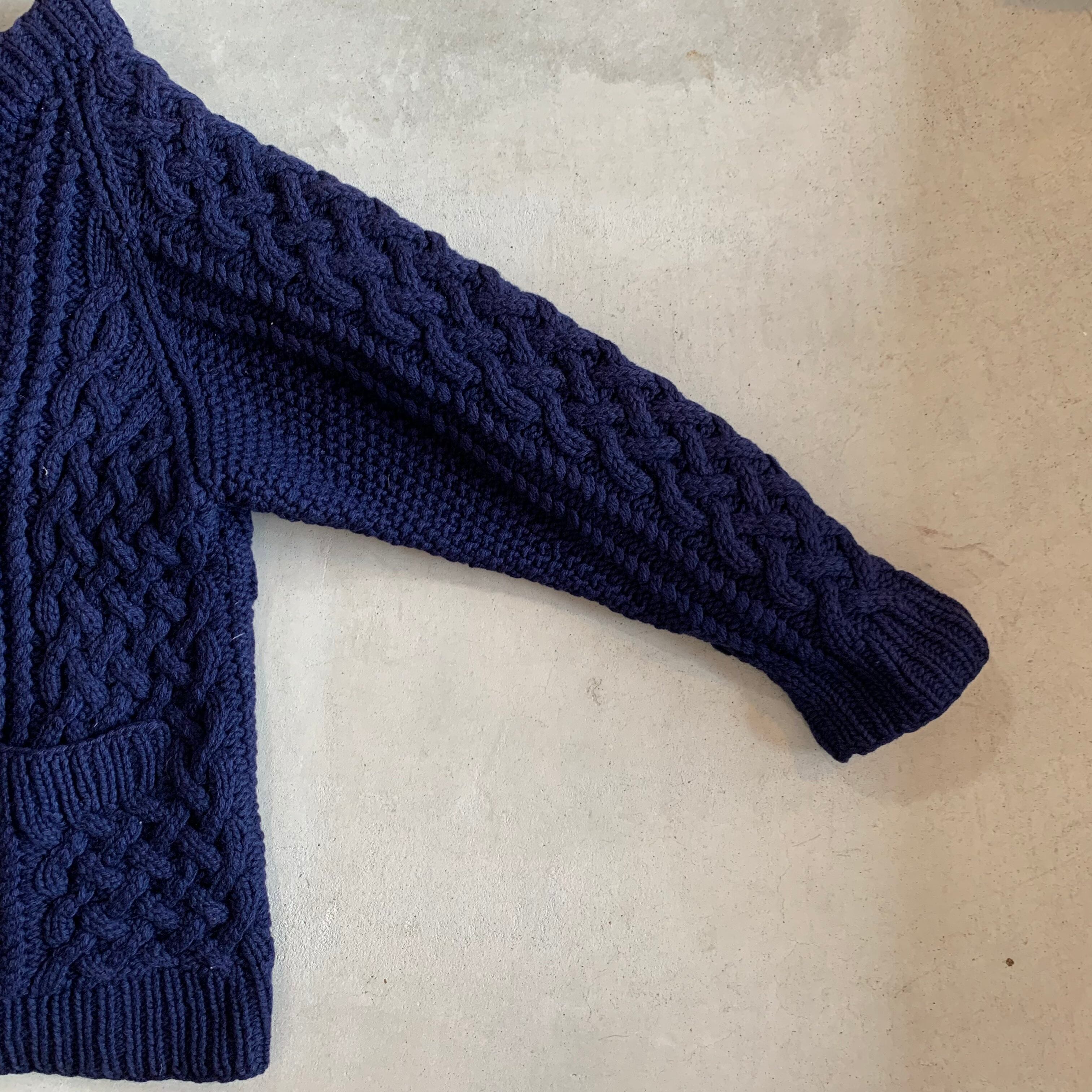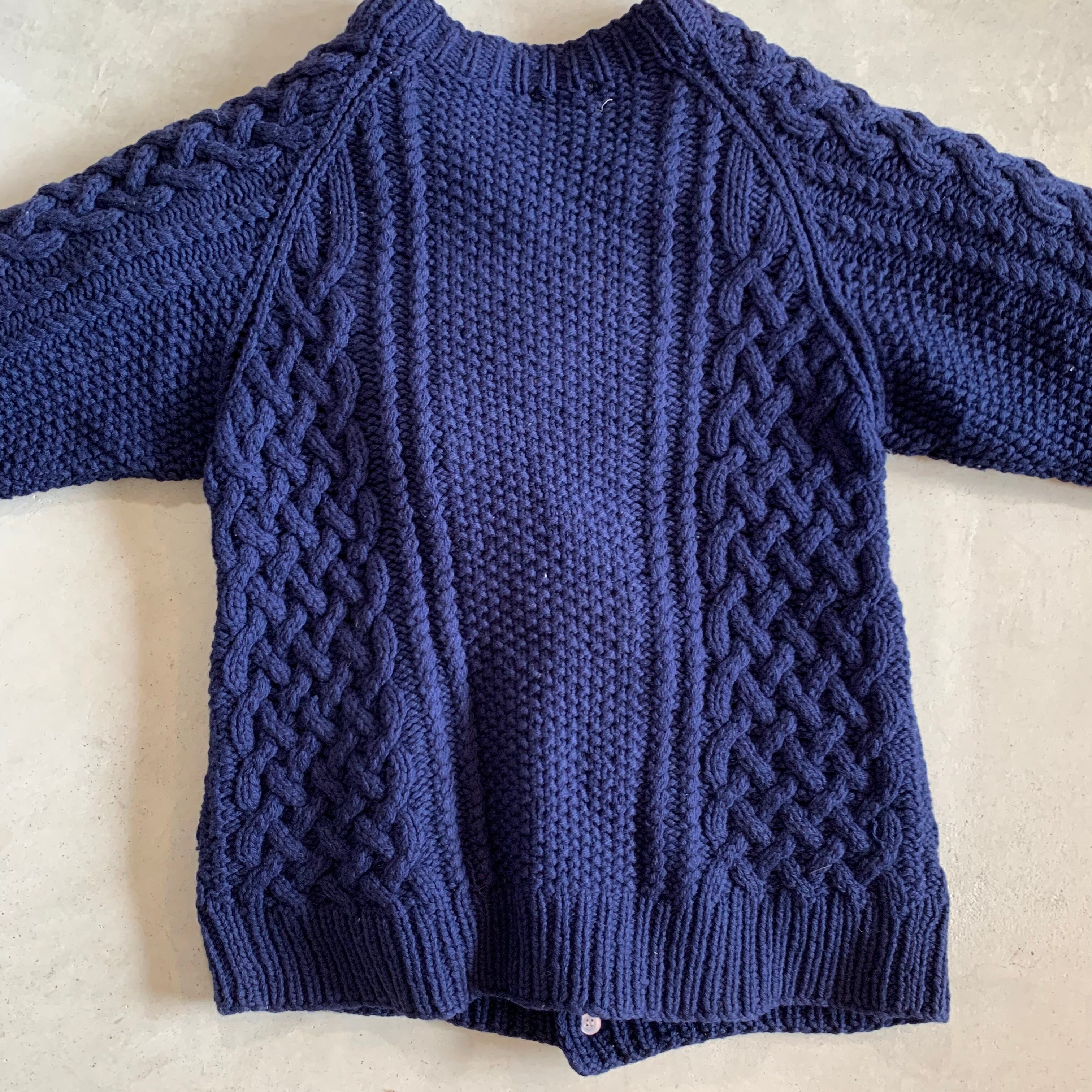 80〜90年代のウールニットのケーブルカーディガンです。ボタンホールが広がっており、ボタンが止めにくい状態です。開けて着用する分には問題はありません。