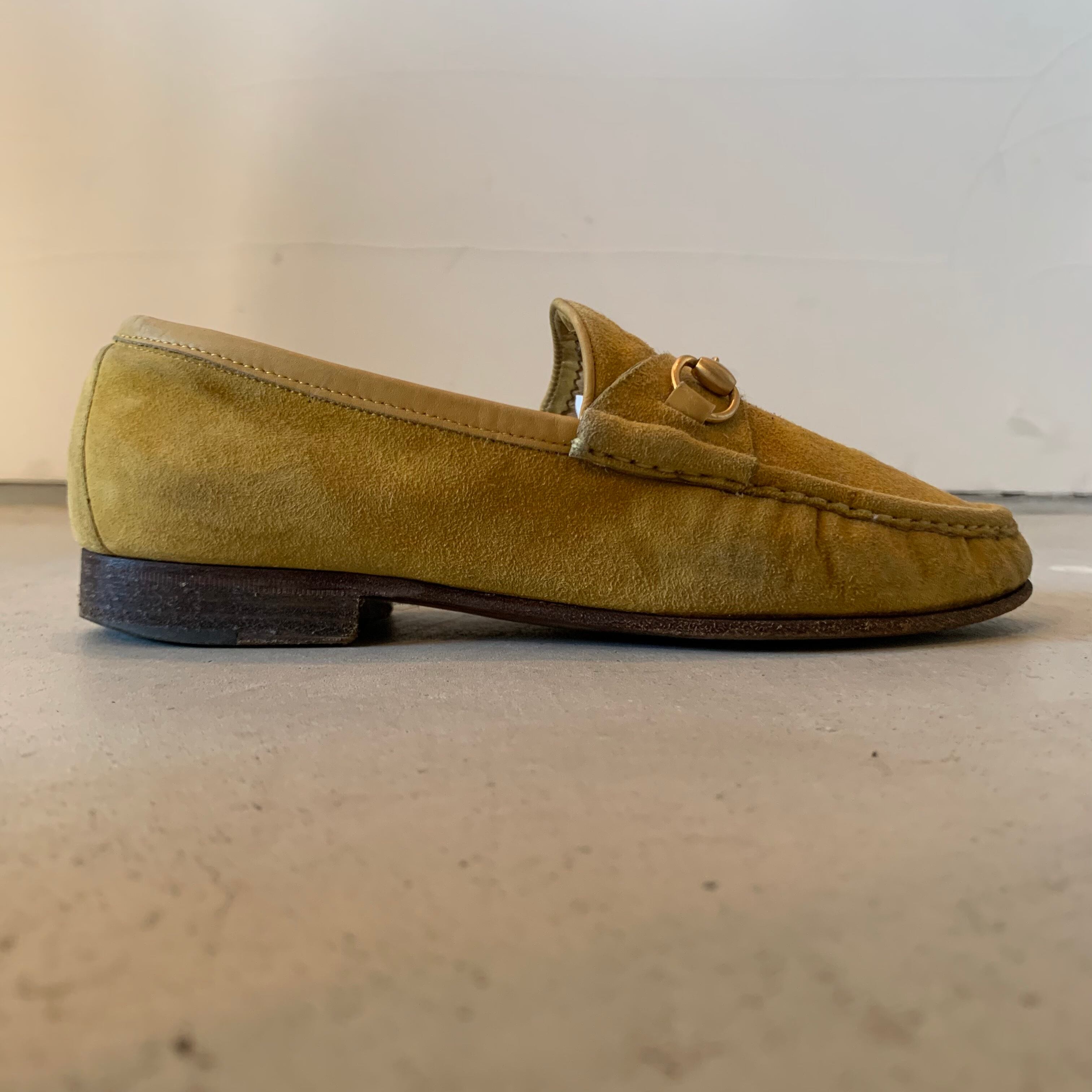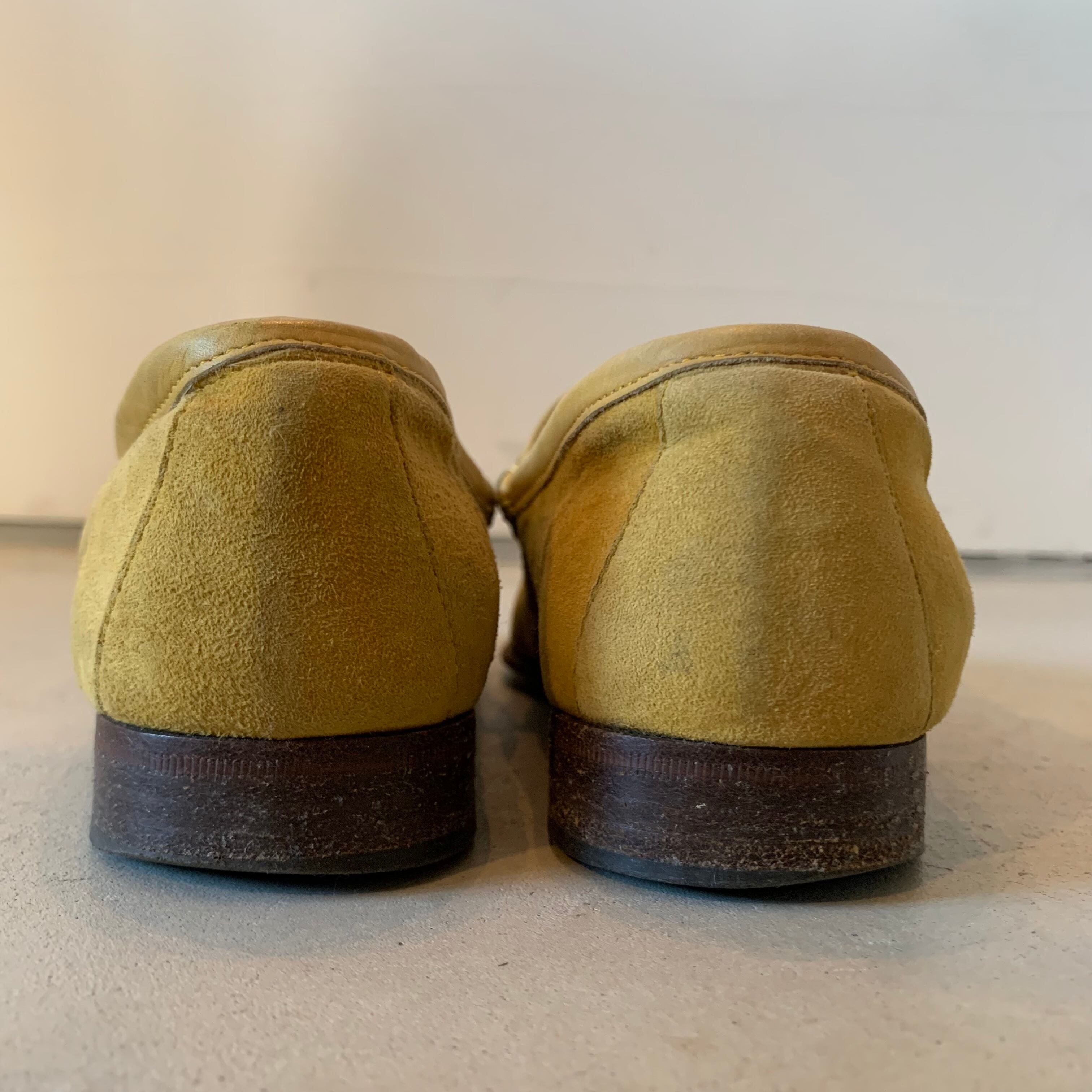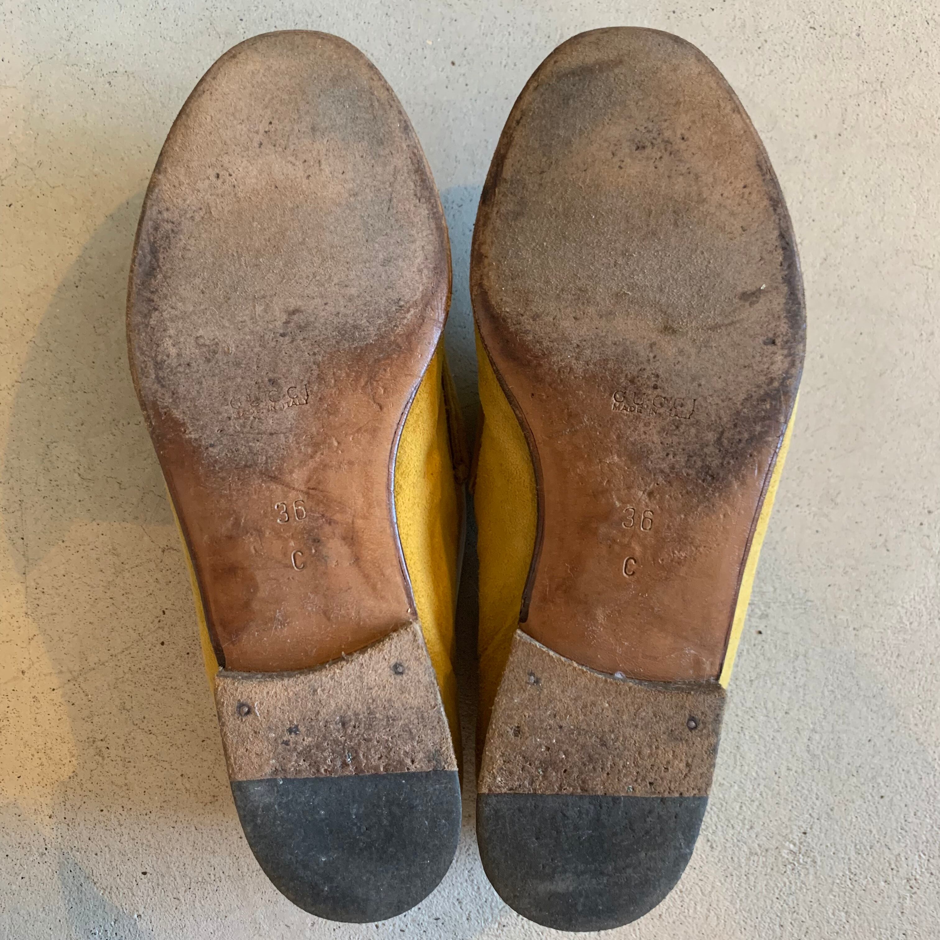 マスタードカラーのスエード素材で秋らしいカラーです。全体的に使用感があり、ダメージがございます。画像でご確認ください。