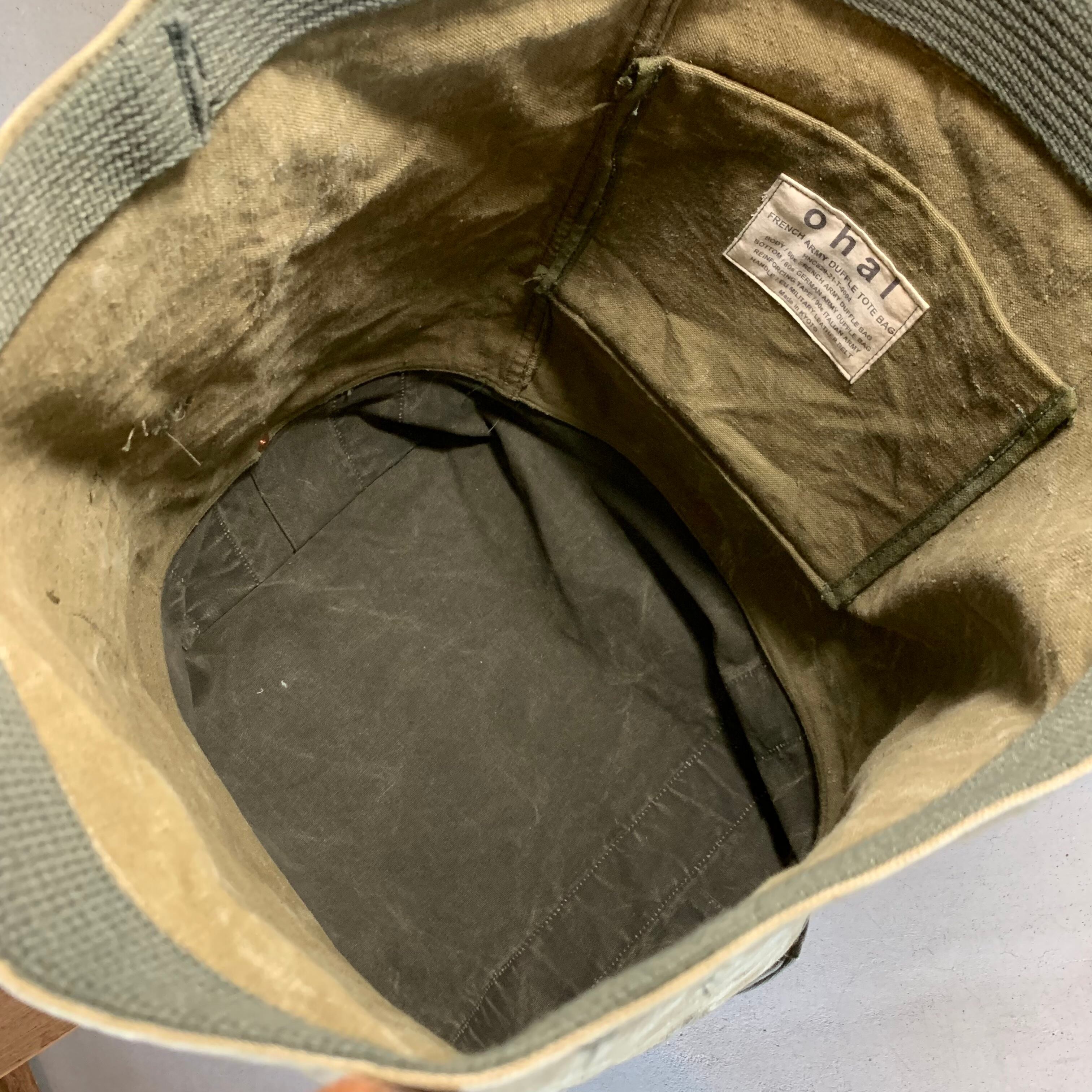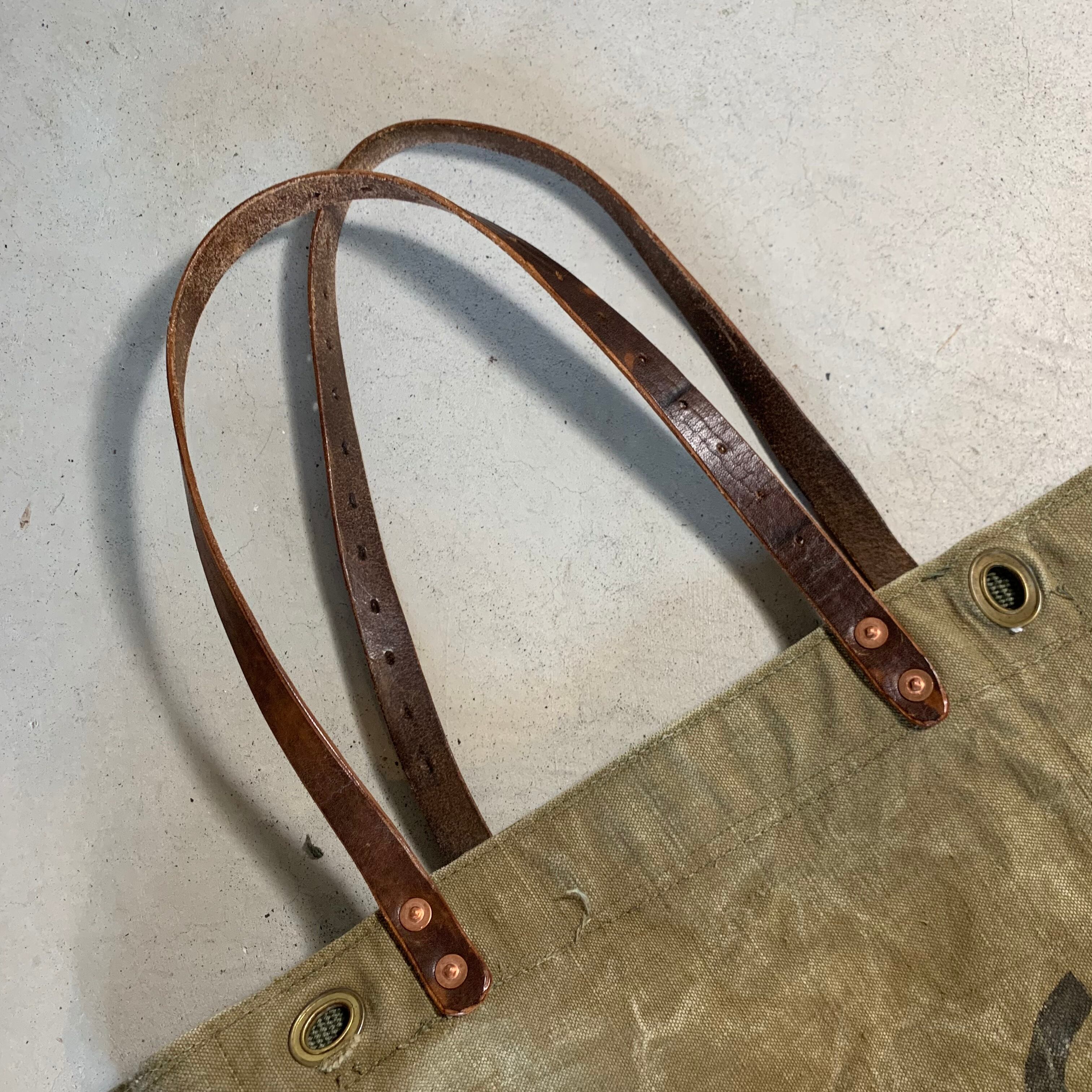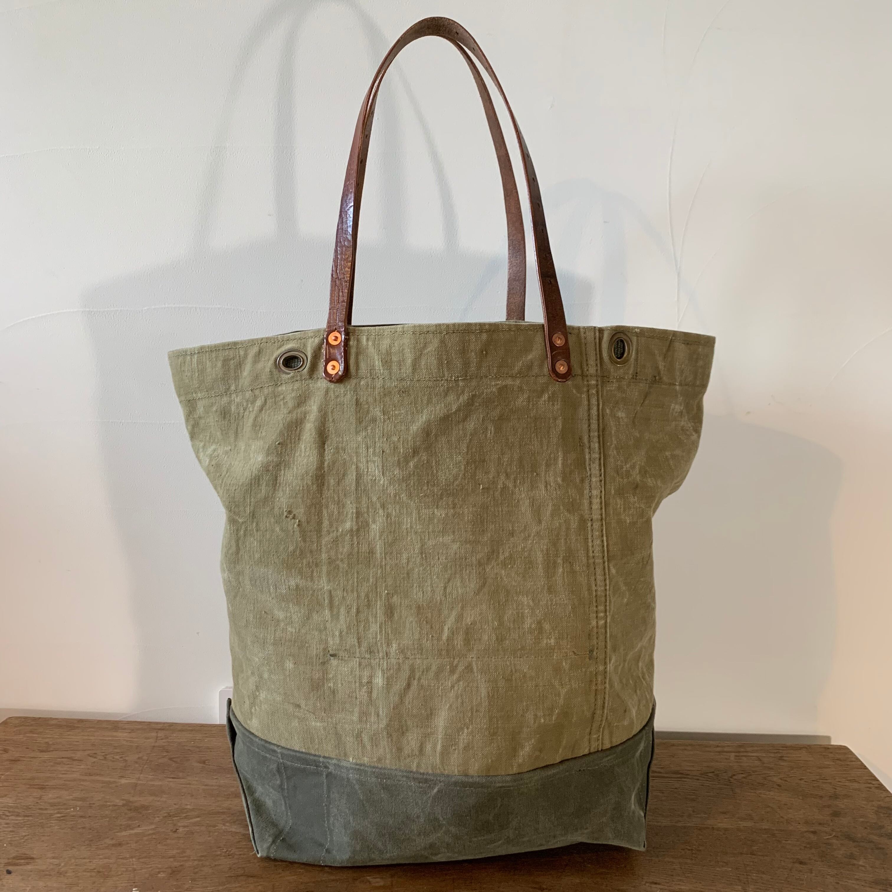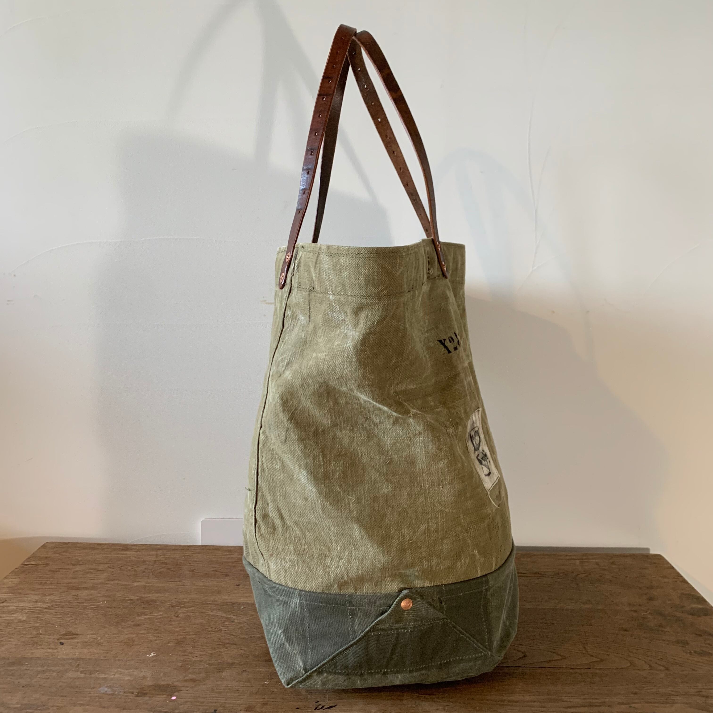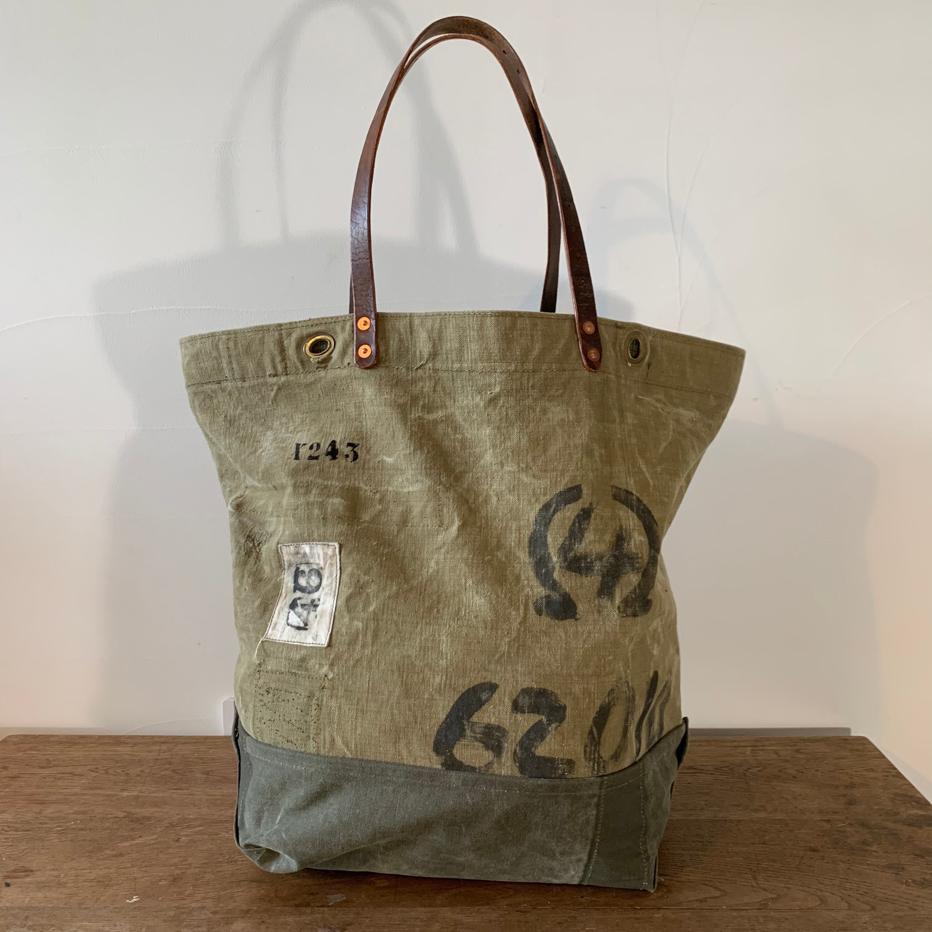ミリタリーのダッフルバッグをベースに、ヴィンテージ素材を組み合わせてトートバッグを作成しました。