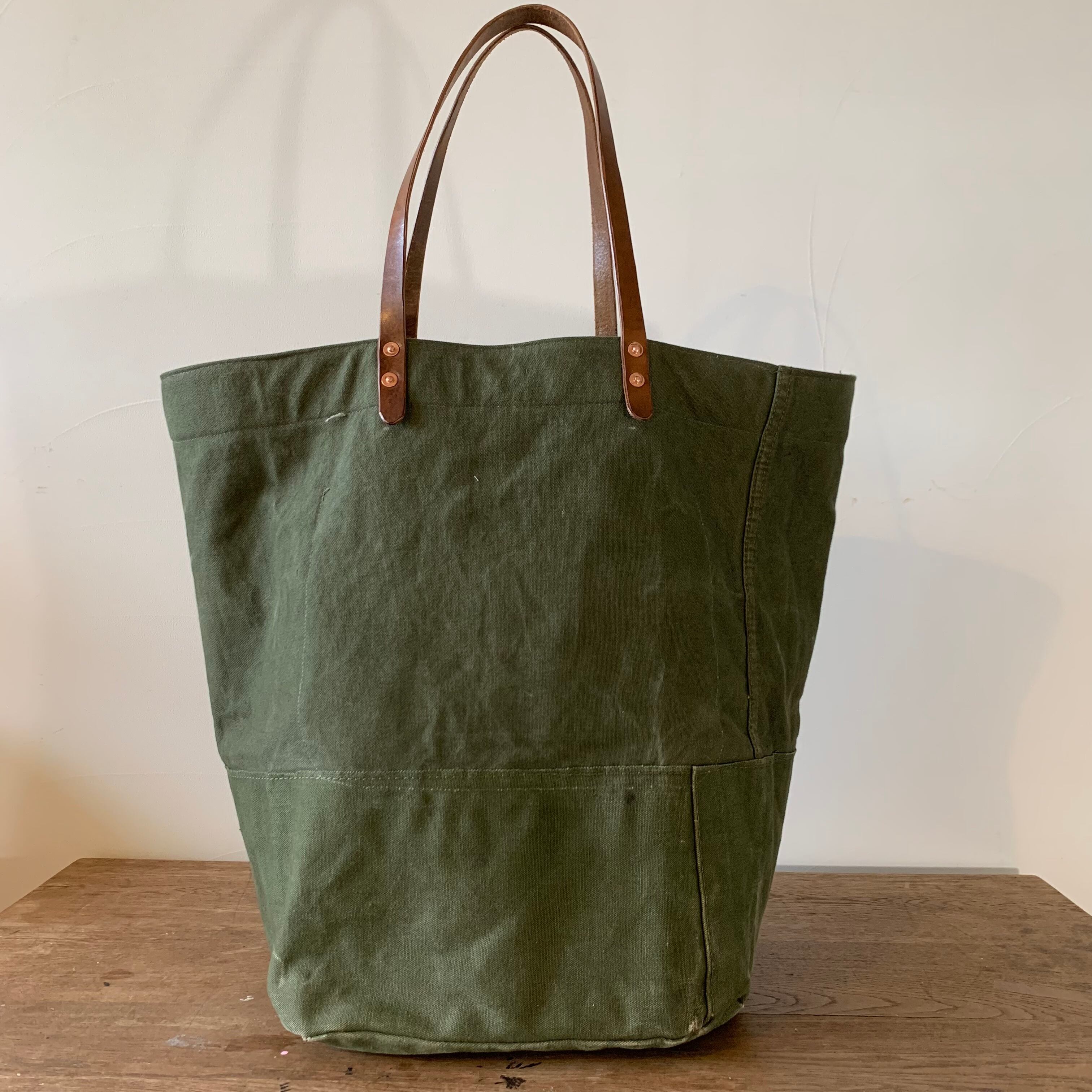 ミリタリーのダッフルバッグをベースに、ヴィンテージ素材を組み合わせてトートバッグを作成しました。