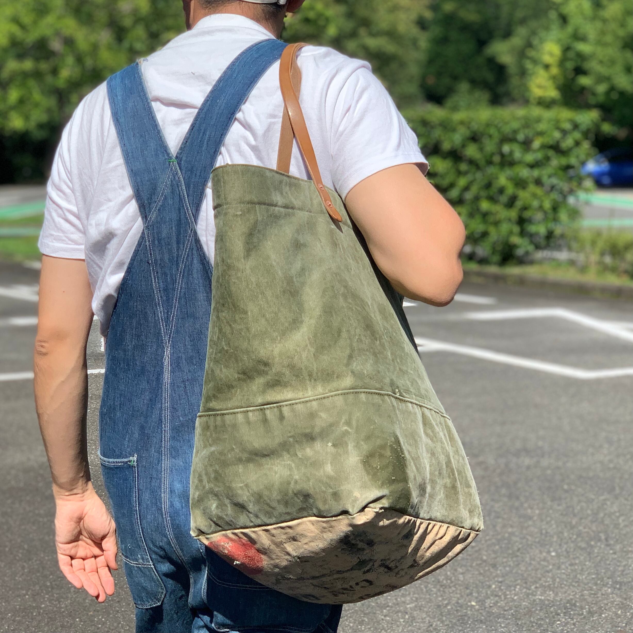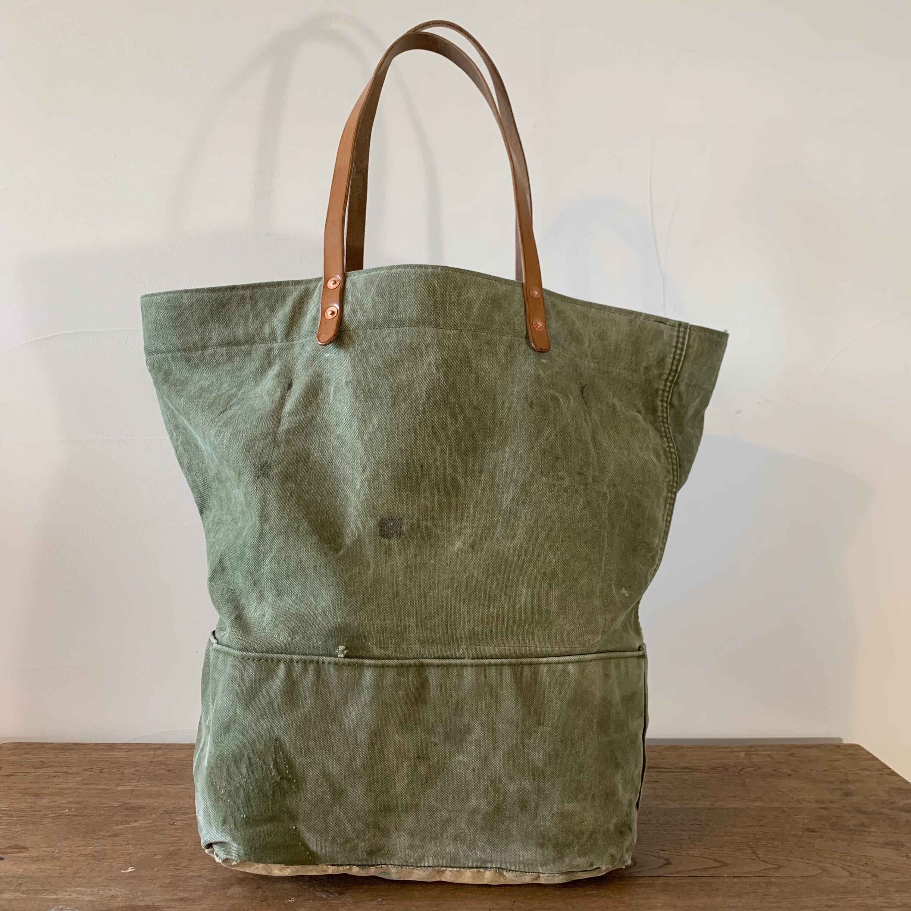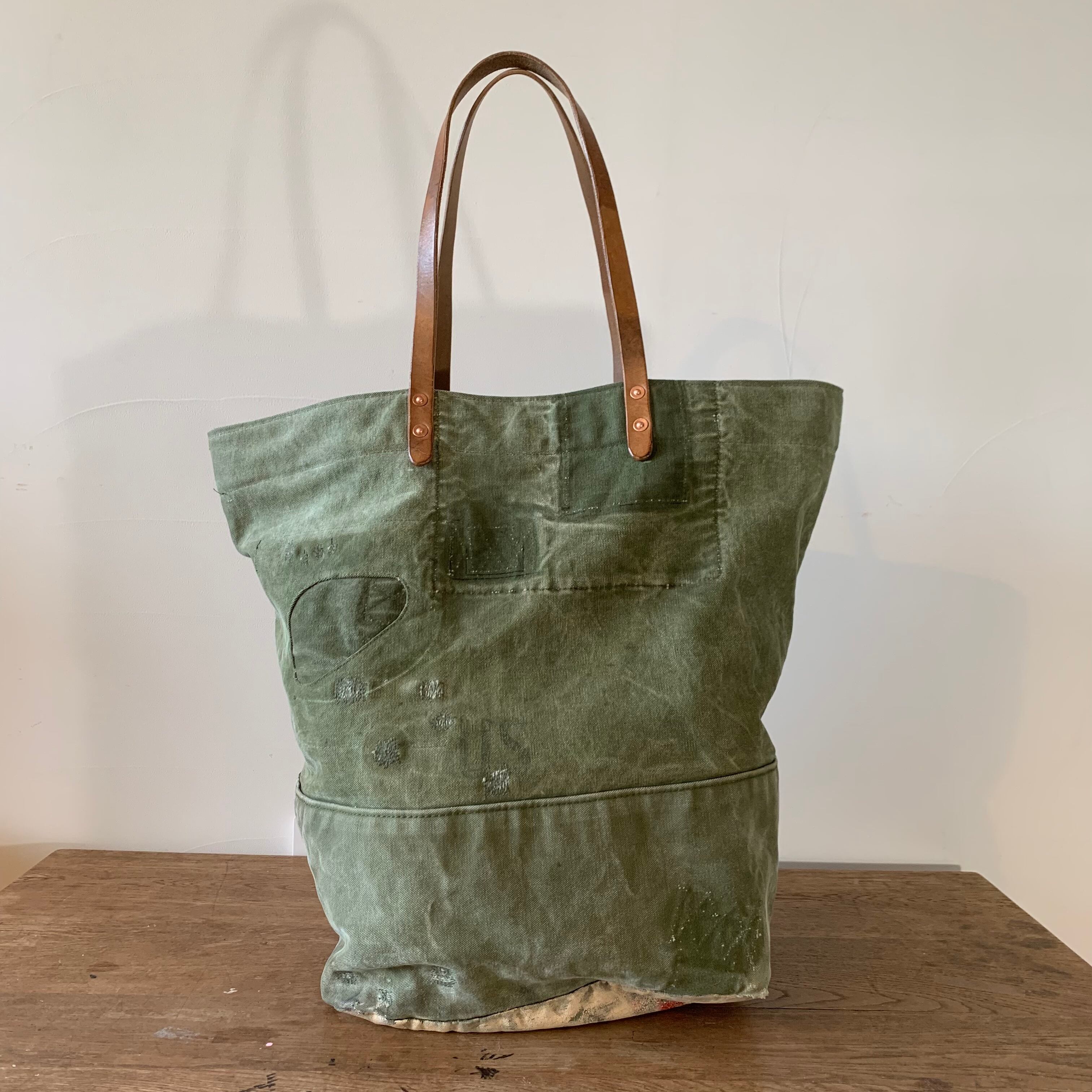 ミリタリーのダッフルバッグをベースに、ヴィンテージ素材を組み合わせてトートバッグを作成しました。