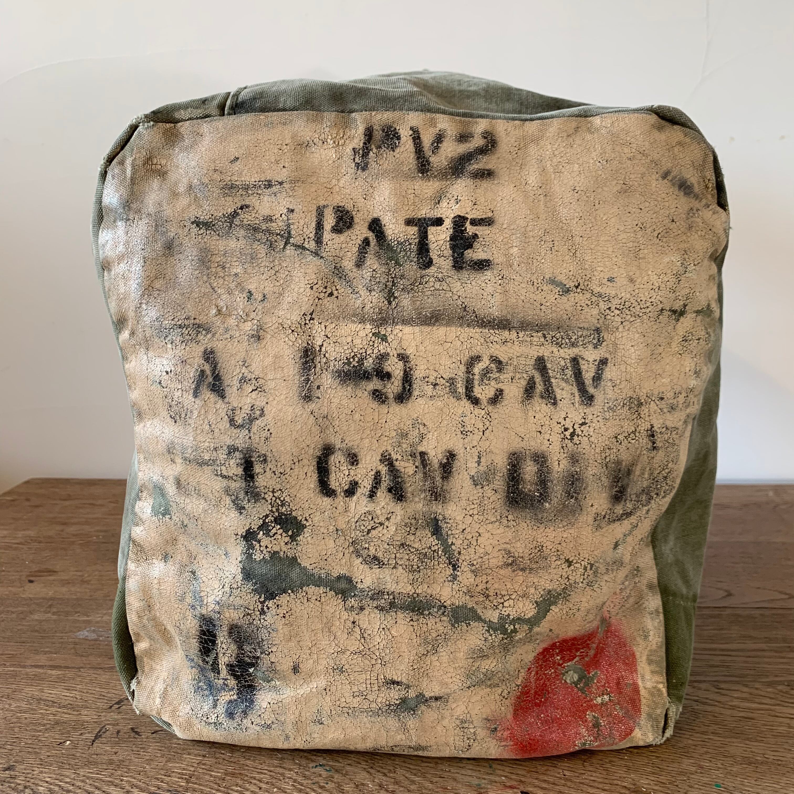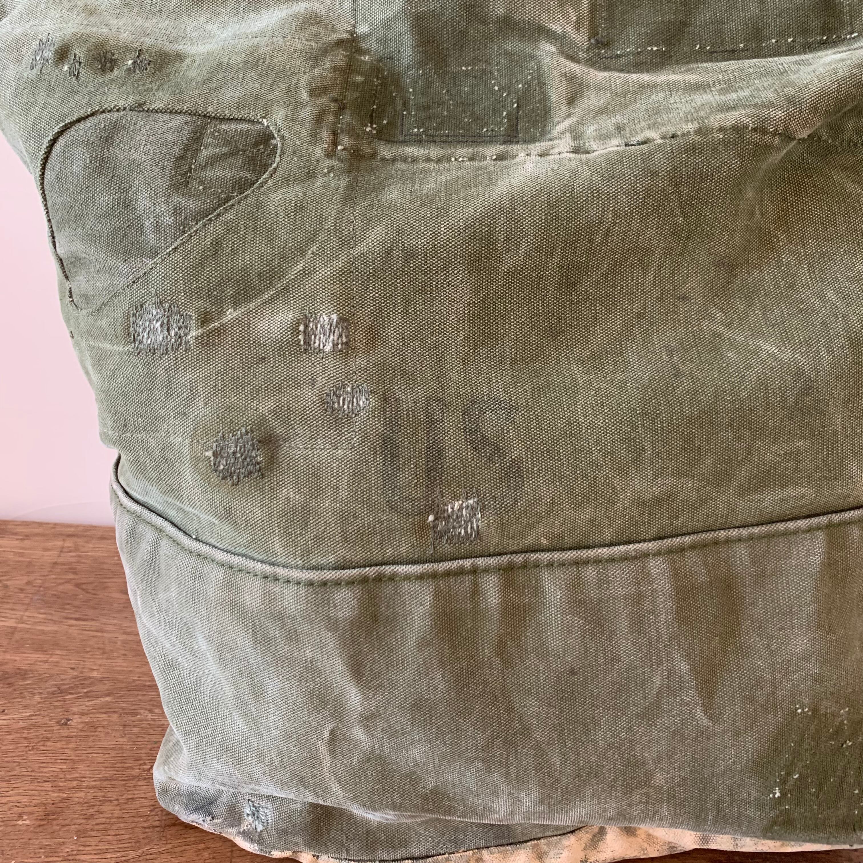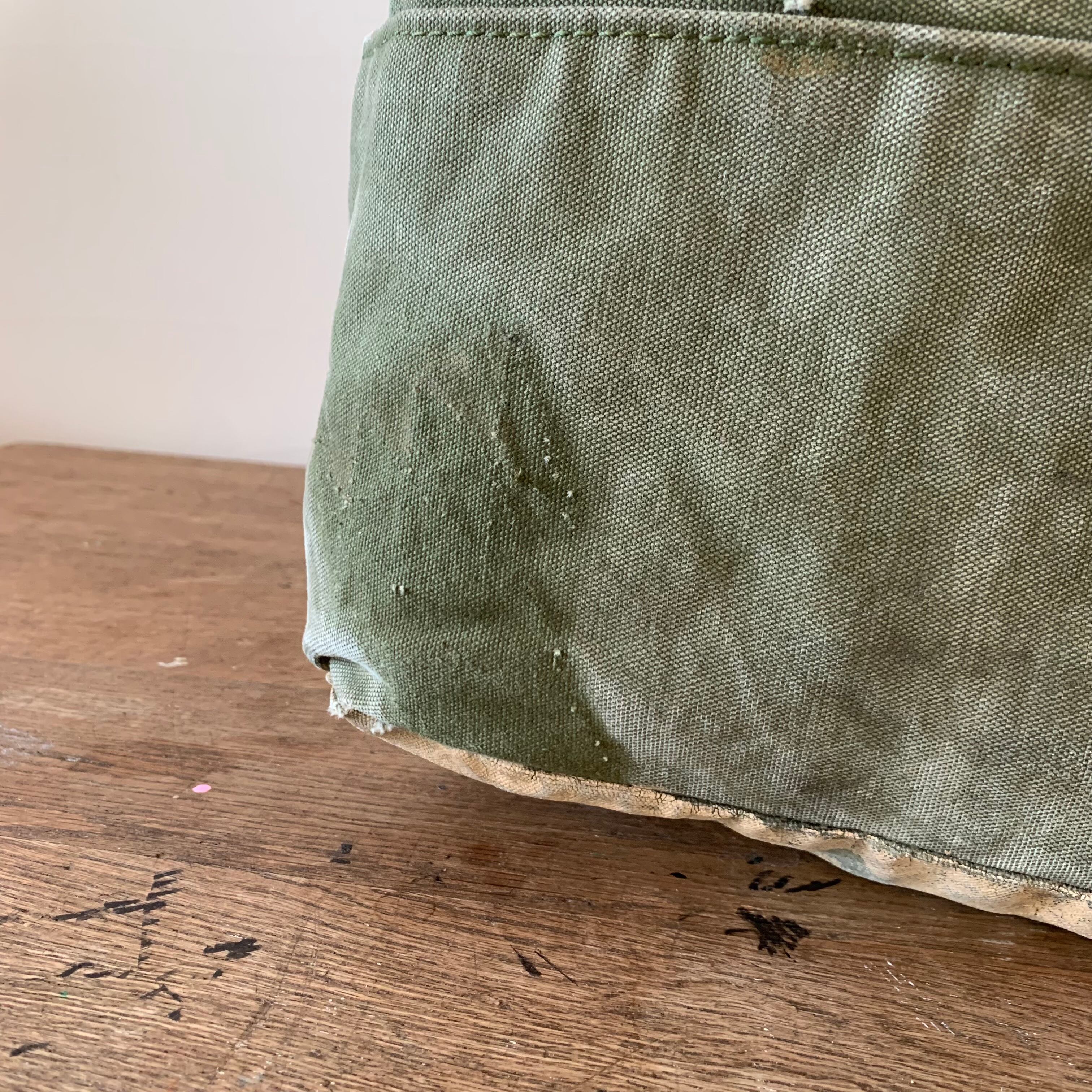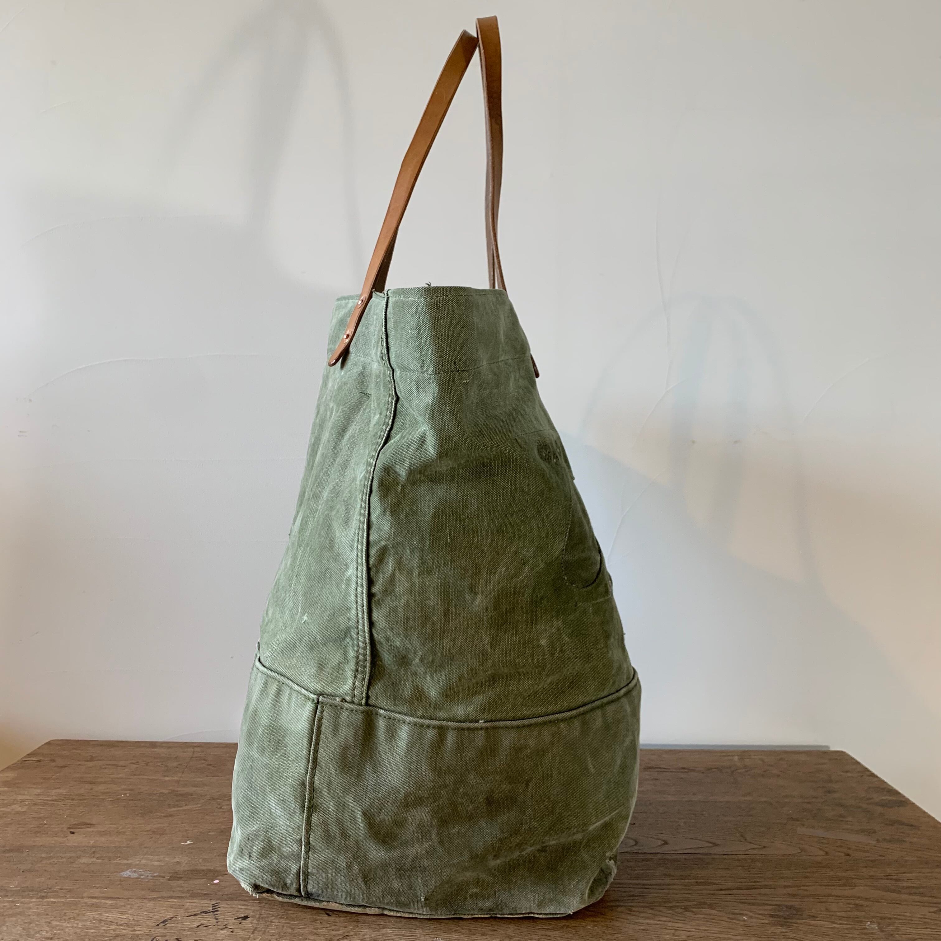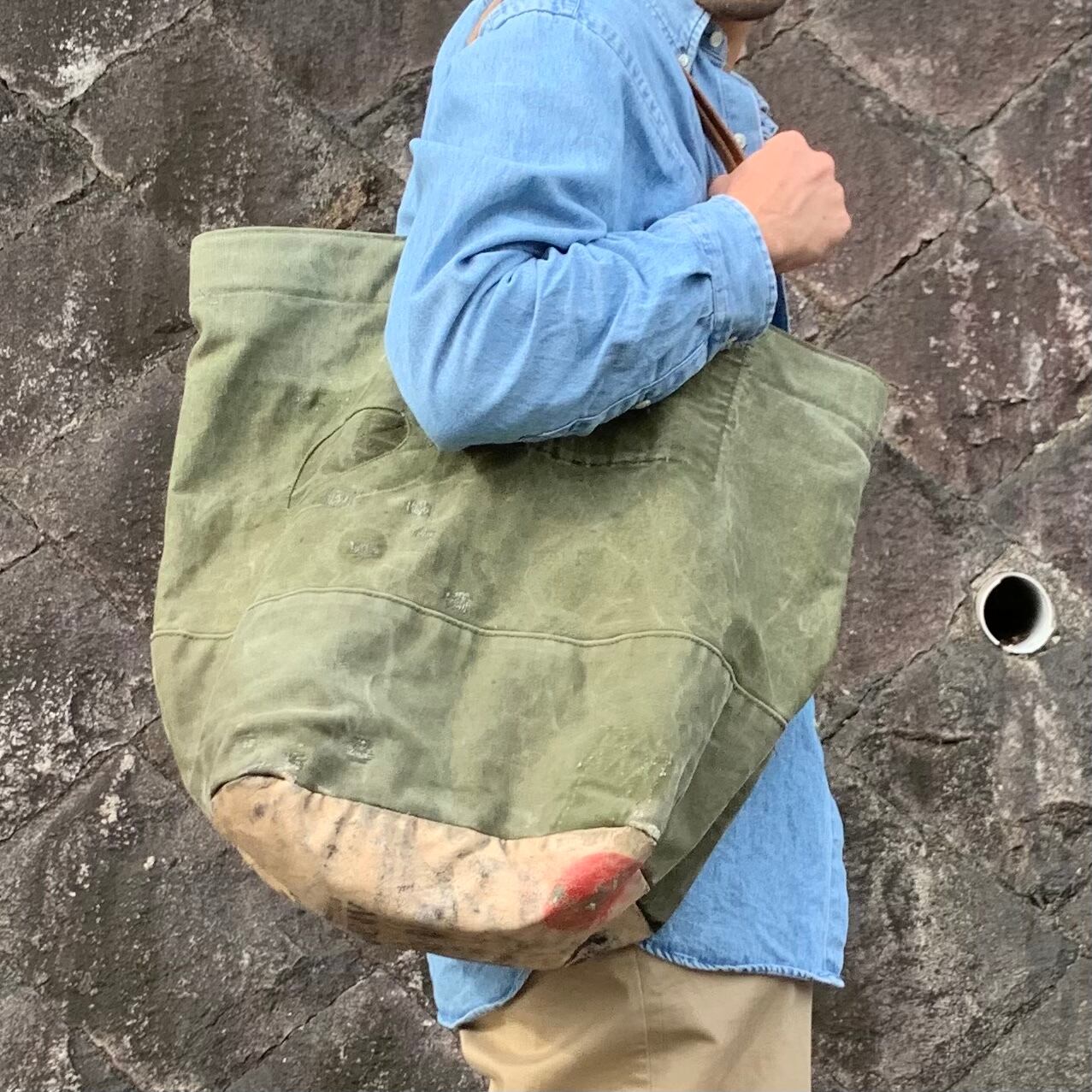 ボディーは70年代のアメリカ軍のダッフルバッグ。かすれたUSのステンシルが、さりげなくかっこいい。ダメージ、補修跡もあり、ヴィンテージならではの雰囲気が楽しめます。