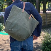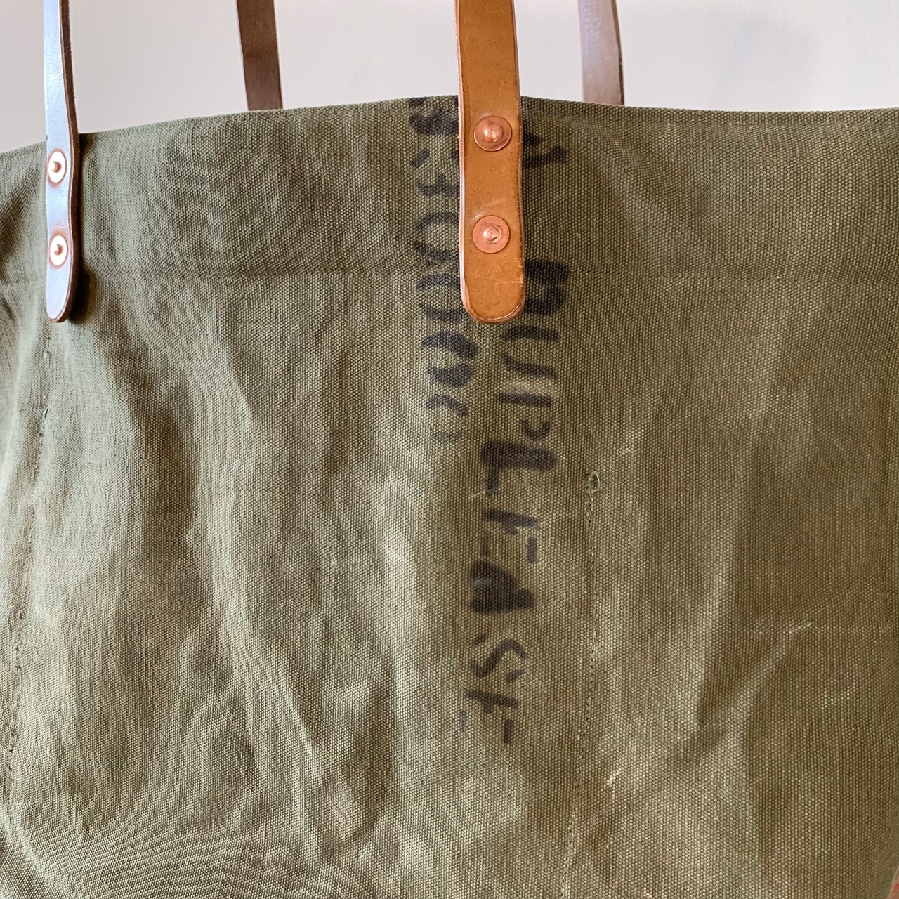ミリタリーのダッフルバッグをベースに、ヴィンテージ素材を組み合わせてトートバッグを作成しました。