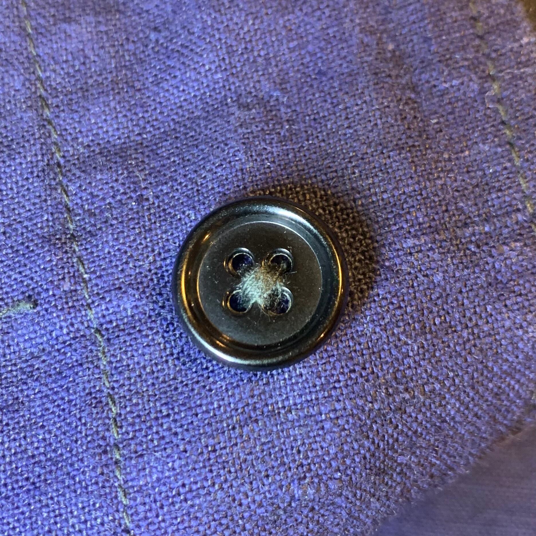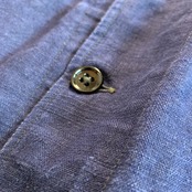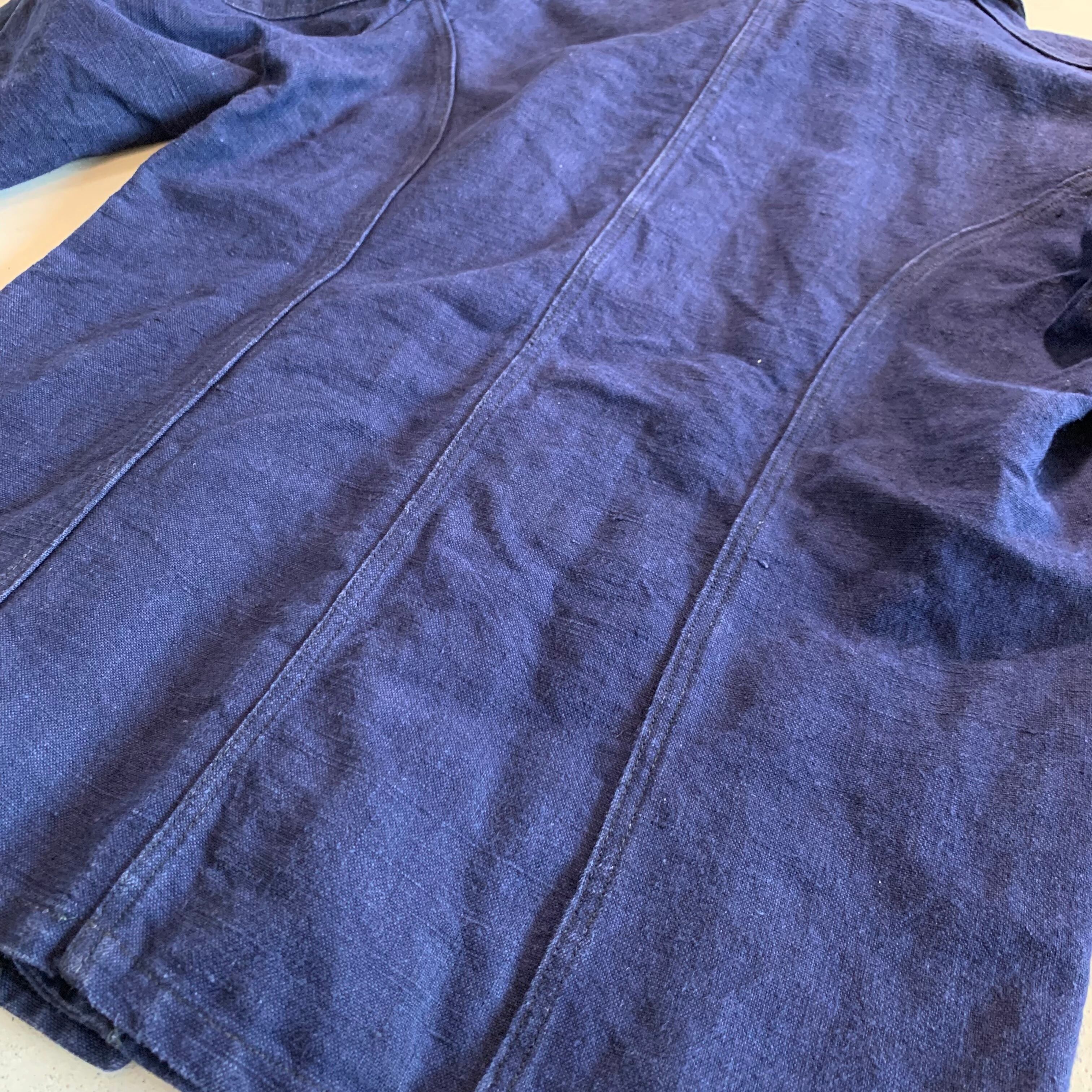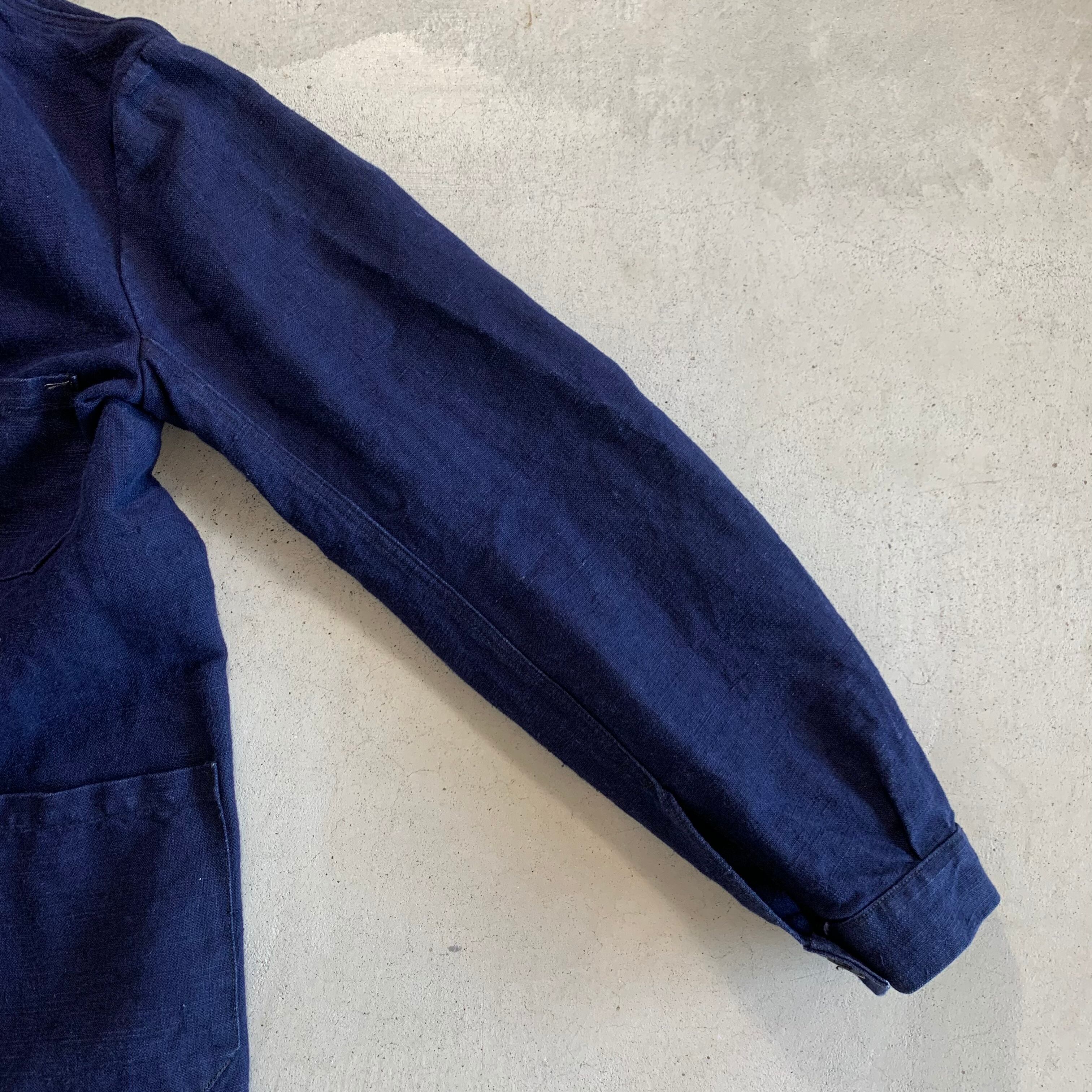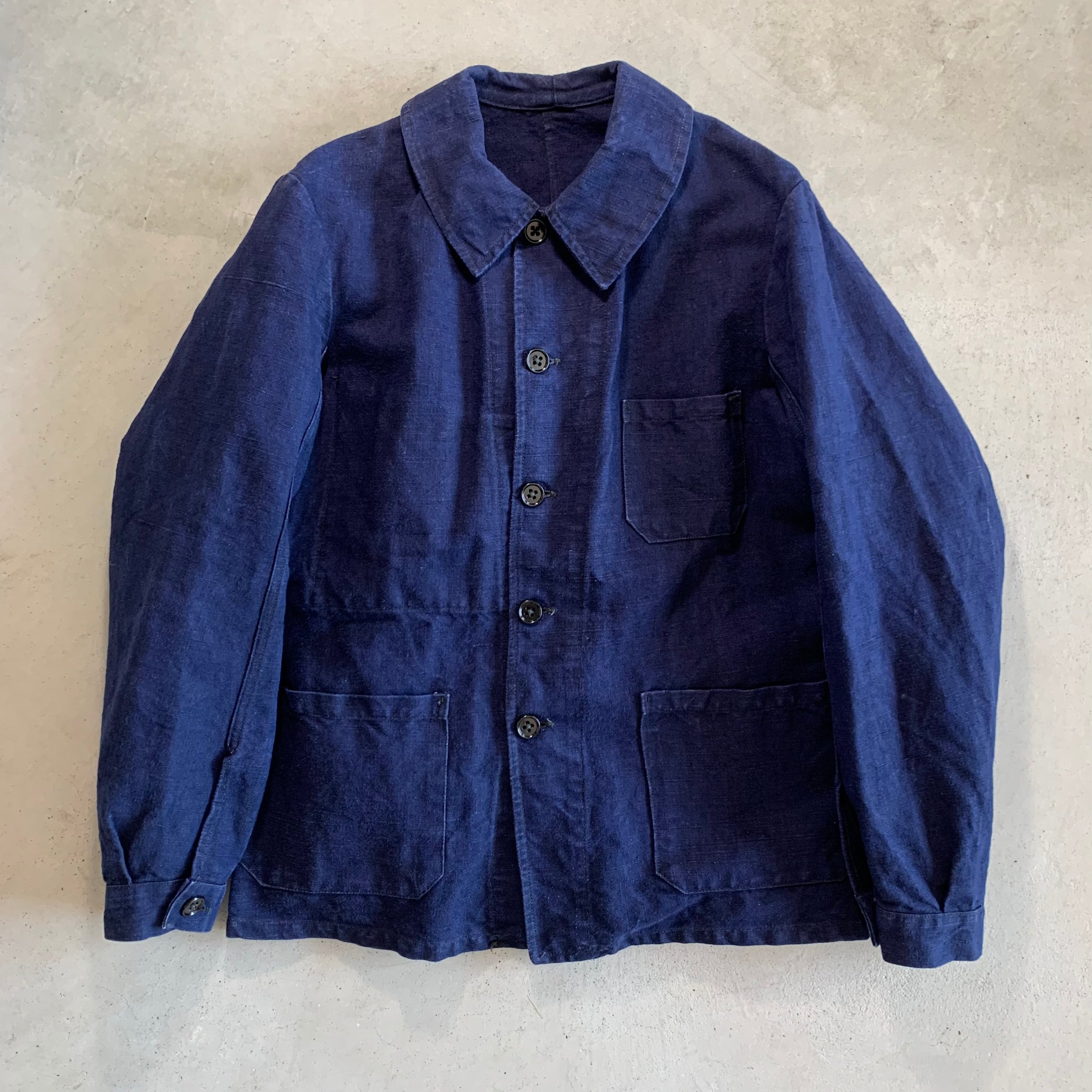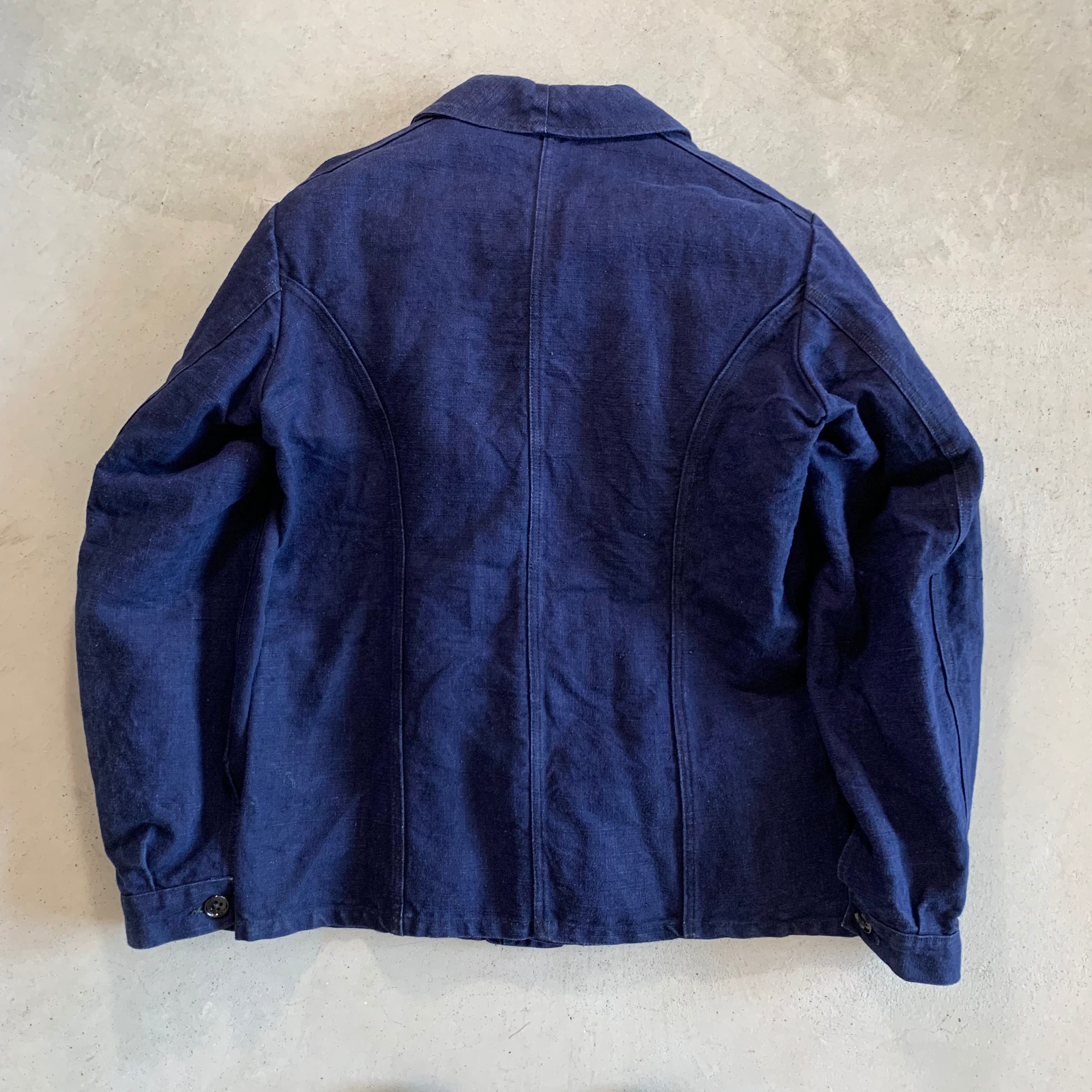 コットンとリネンが50%ずつ使用されたメティス素材のフレンチワークジャケット。ブランドはAUMOLINEI。ボタンはプラスティックになります。おそらく50年代頃の一品かと思います。目立ったダメージもなく、綺麗な濃紺で色落ちも楽しめます。