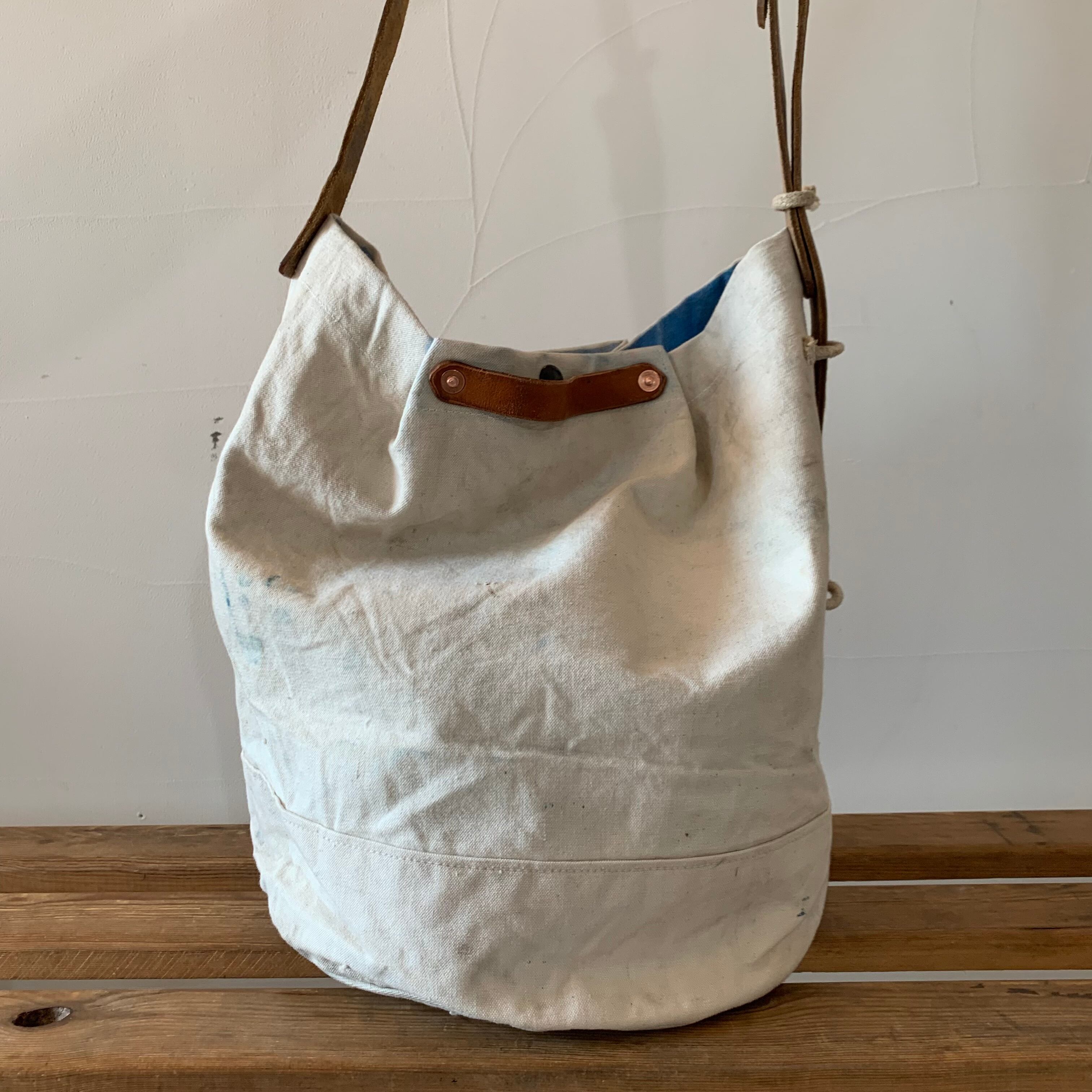 素材は40年代の英軍、ロイヤルエアフォース(RAF)のダッフルバッグ。RAFのダッフルバッグといえば、ブルーのラインが入ってますが、そのラインが開口部の内側に残っており、当時の雰囲気を醸し出します。