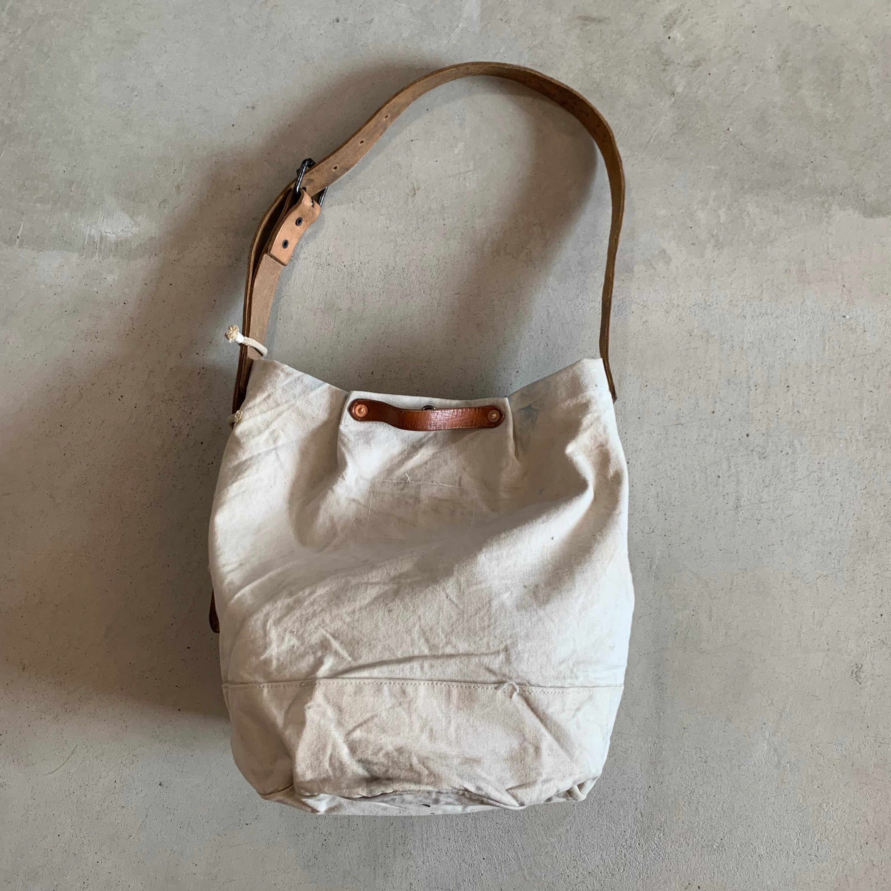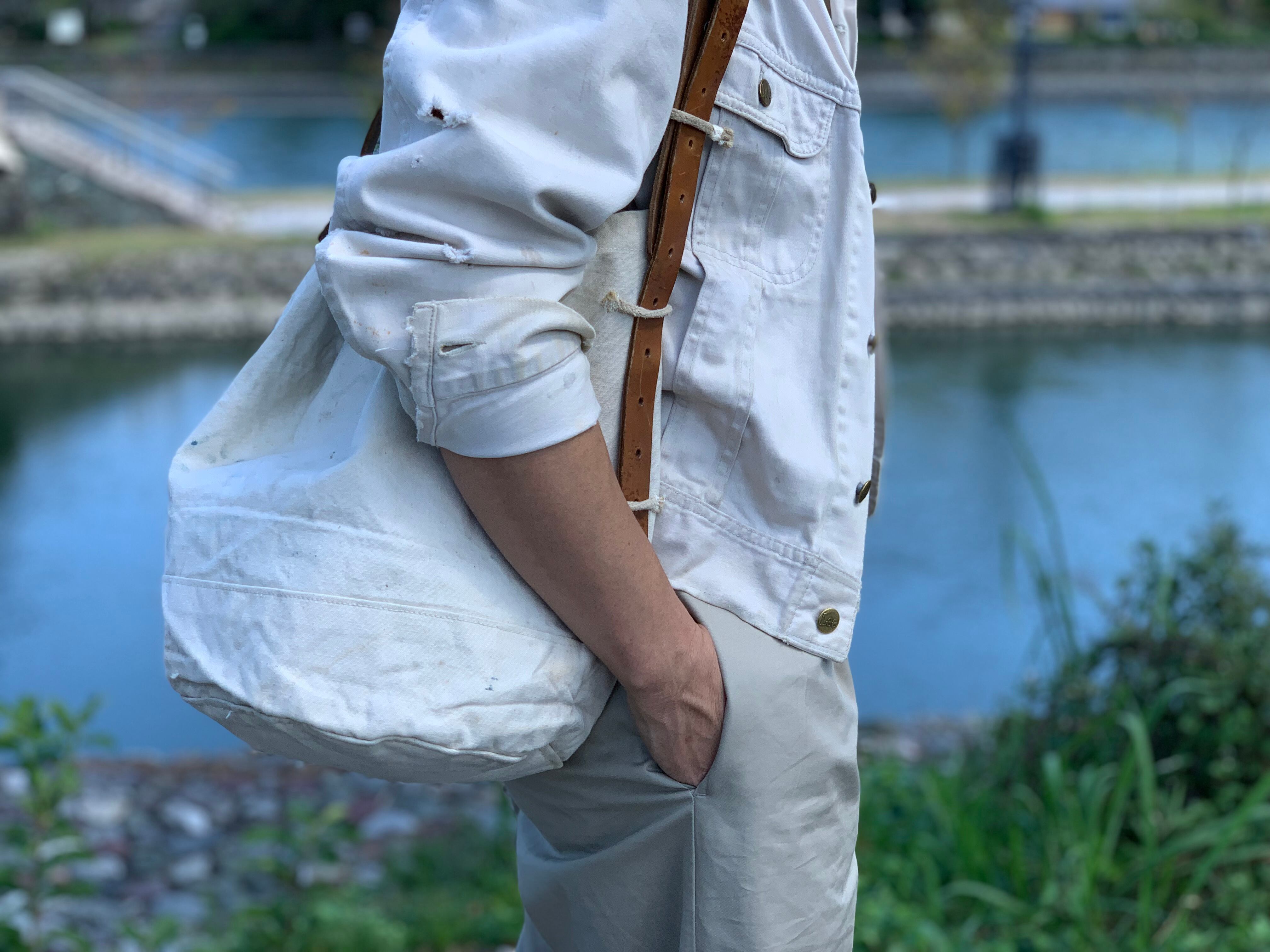 ショルダーベルトはヴィンテージのイタリア軍のレザーベルトを使用。ショルダーベルトは長さ調整可能です。