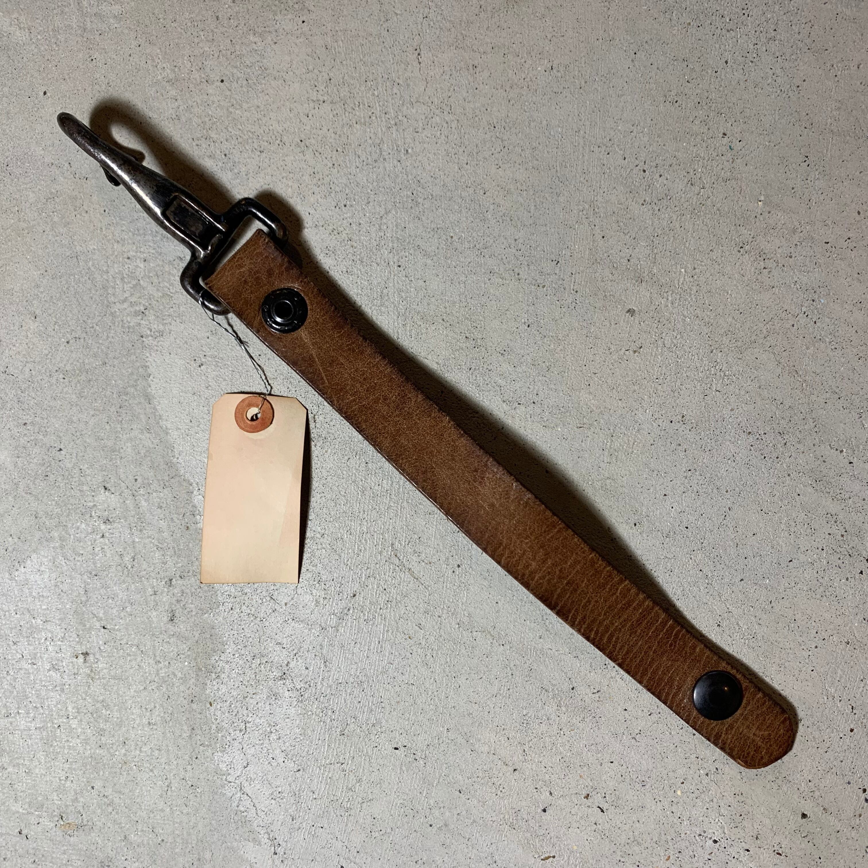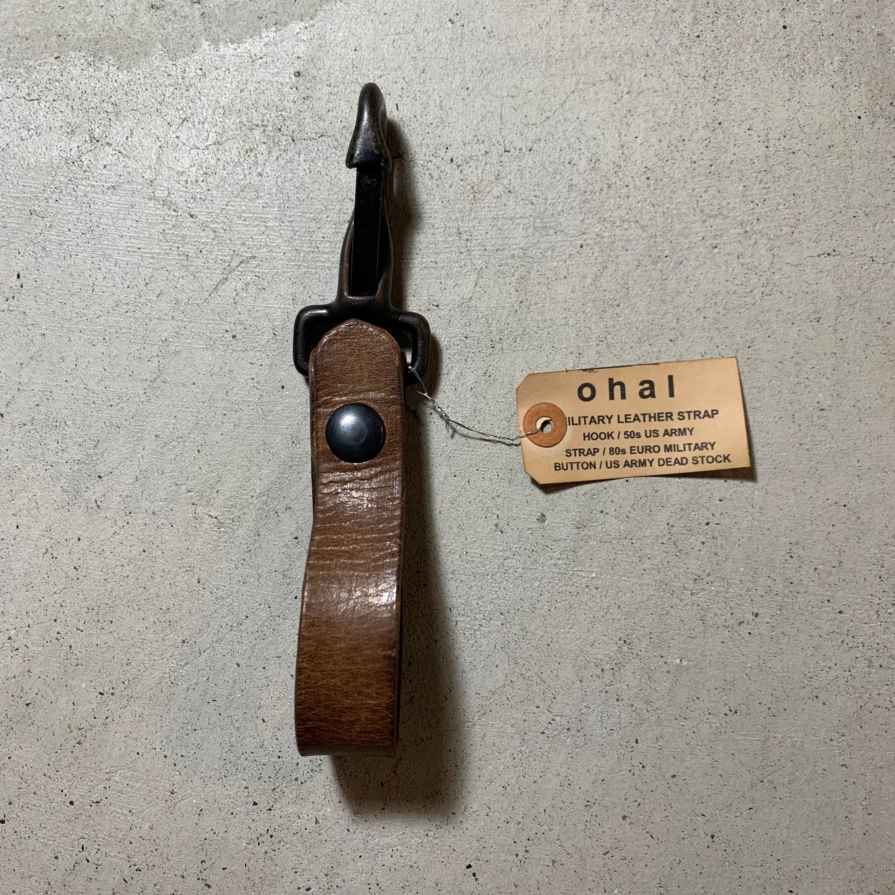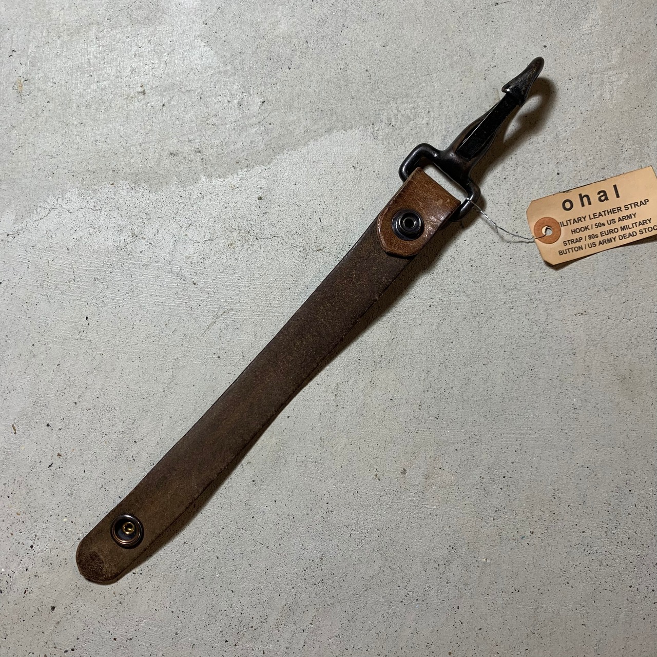 大ぶりのナスカンは、50年代のUS ARMYのダッフルバッグに使われていたヴィンテージのナスカンを使用。レザーストラップは70〜80年代頃のユーロミリタリーレザーベルトをカットし磨いた物をつけています。