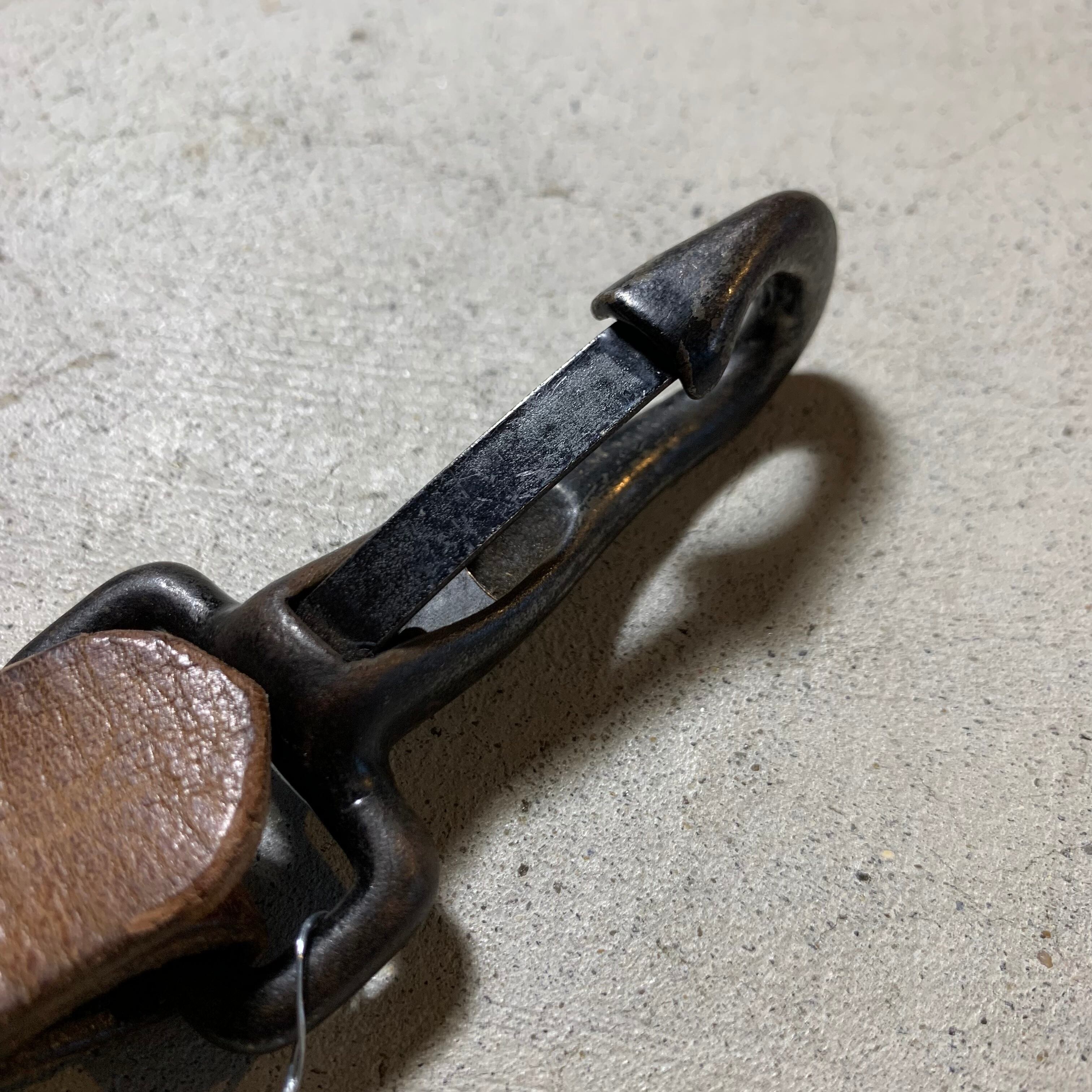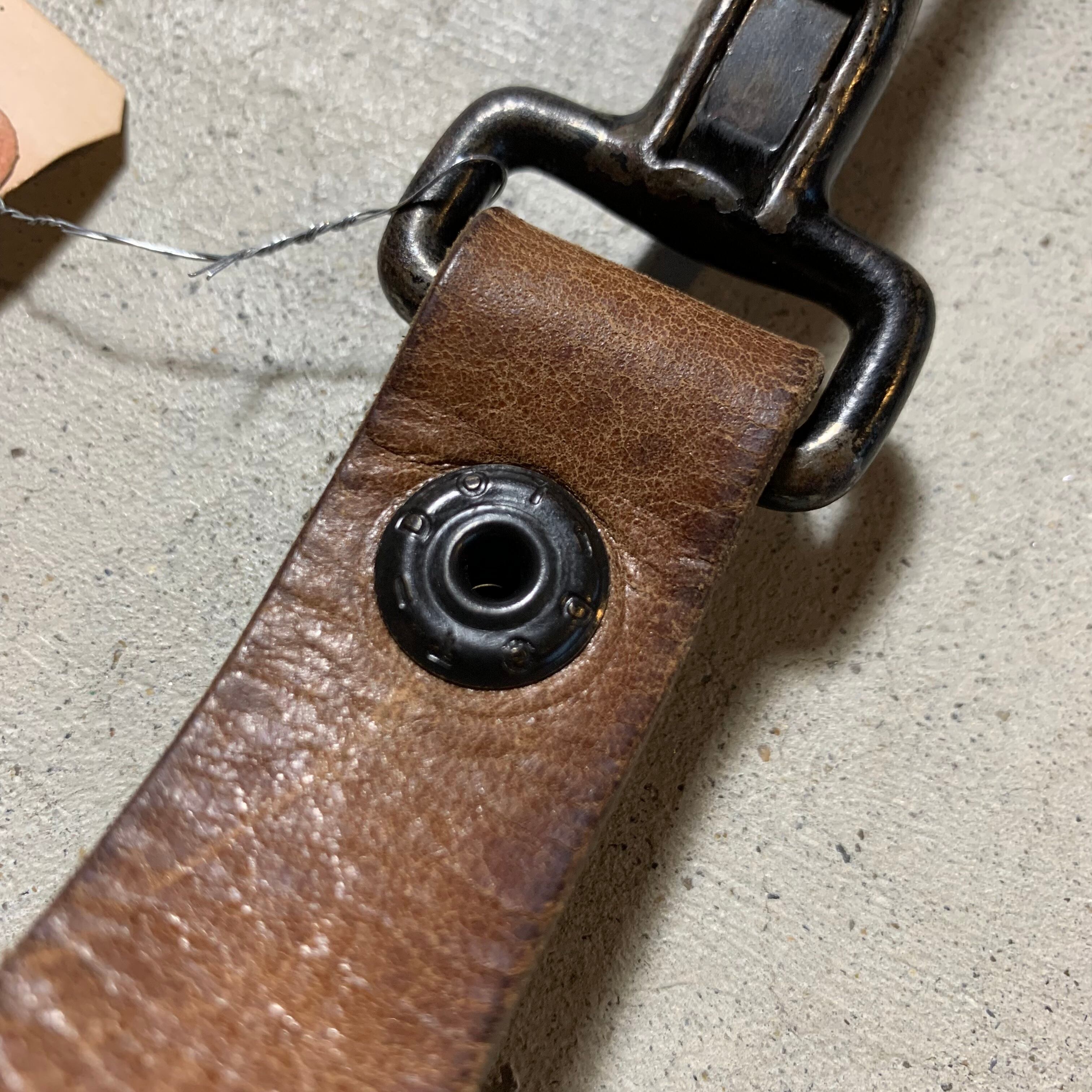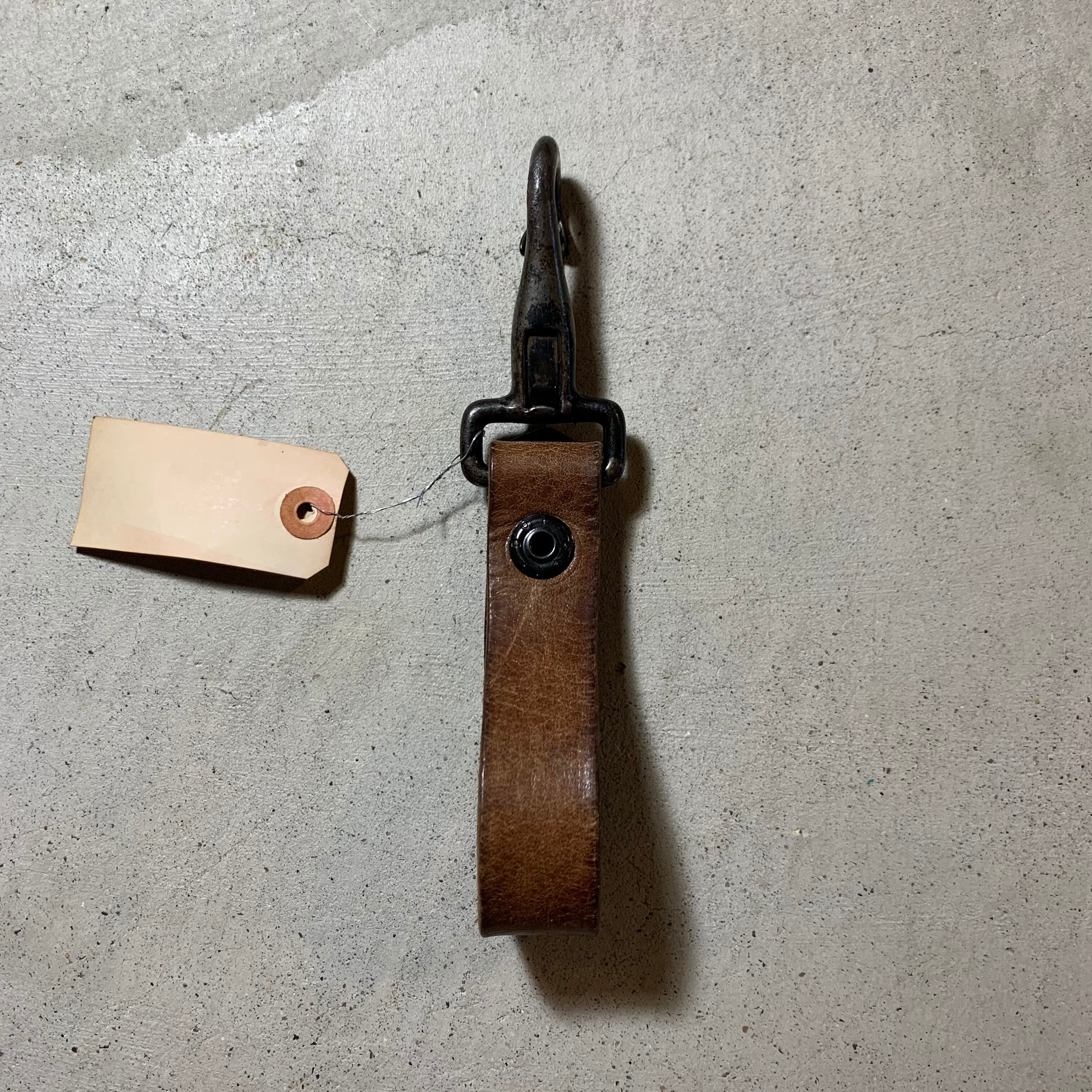 大ぶりのナスカンは、50年代のUS ARMYのダッフルバッグに使われていたヴィンテージのナスカンを使用。レザーストラップは70〜80年代頃のユーロミリタリーレザーベルトをカットし磨いた物をつけています。