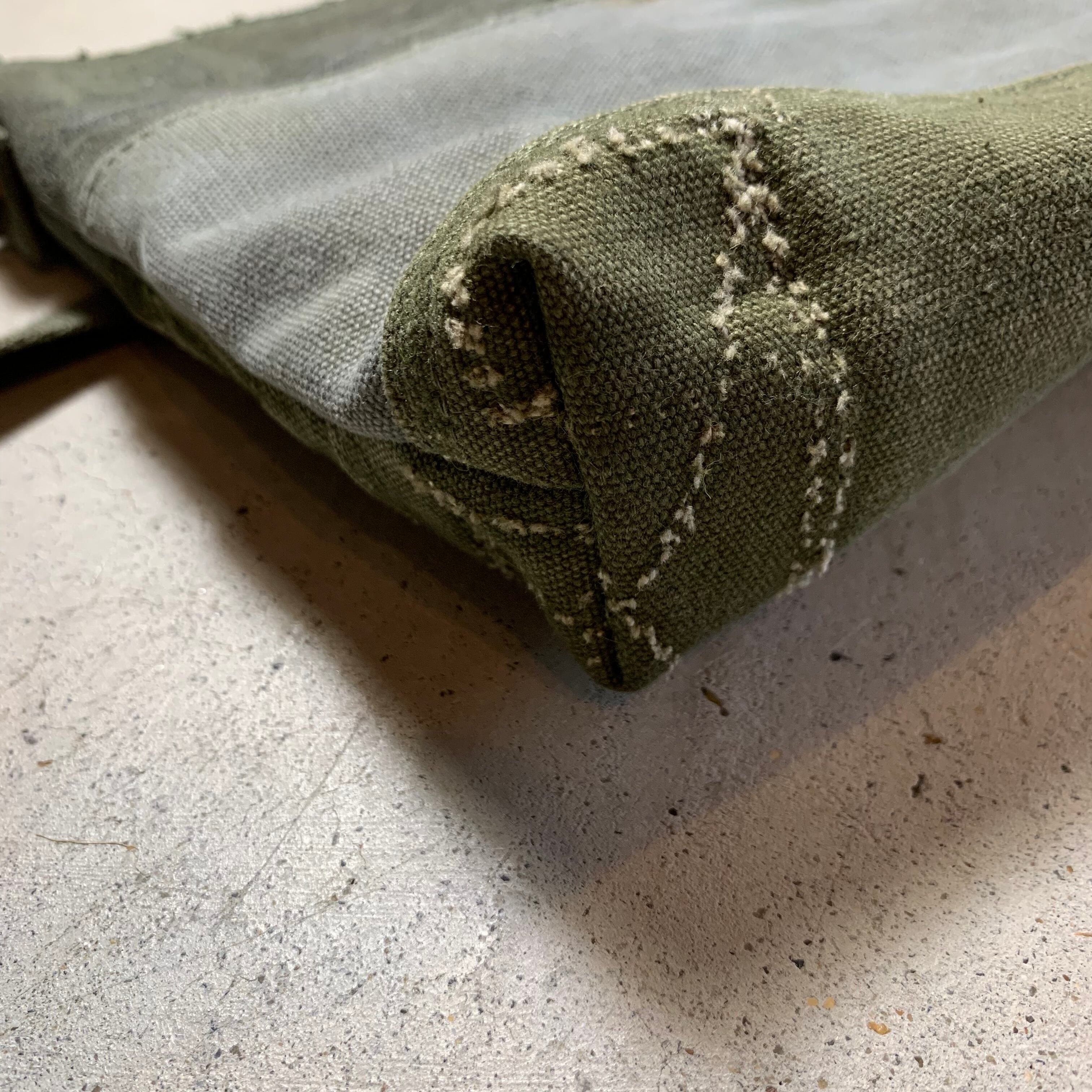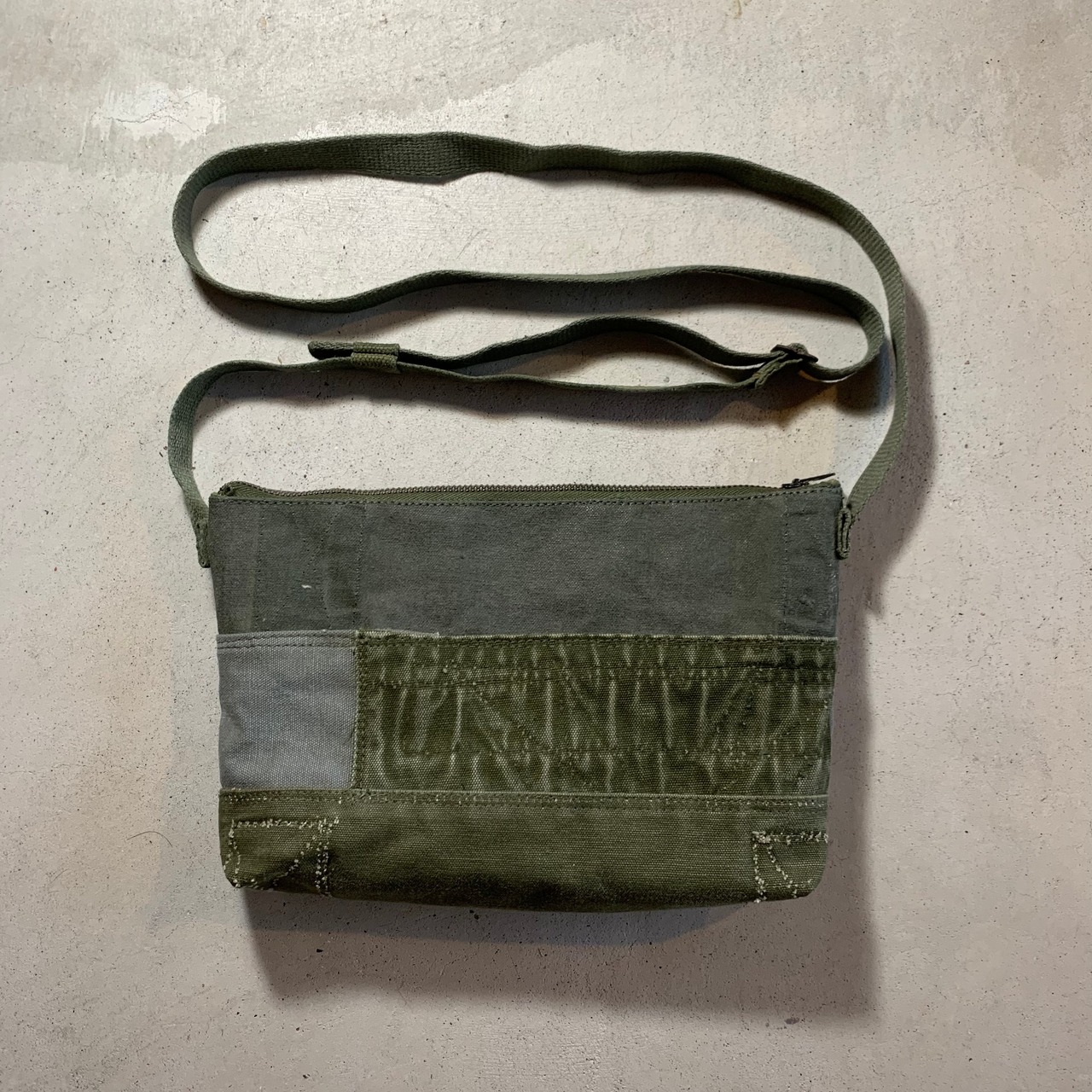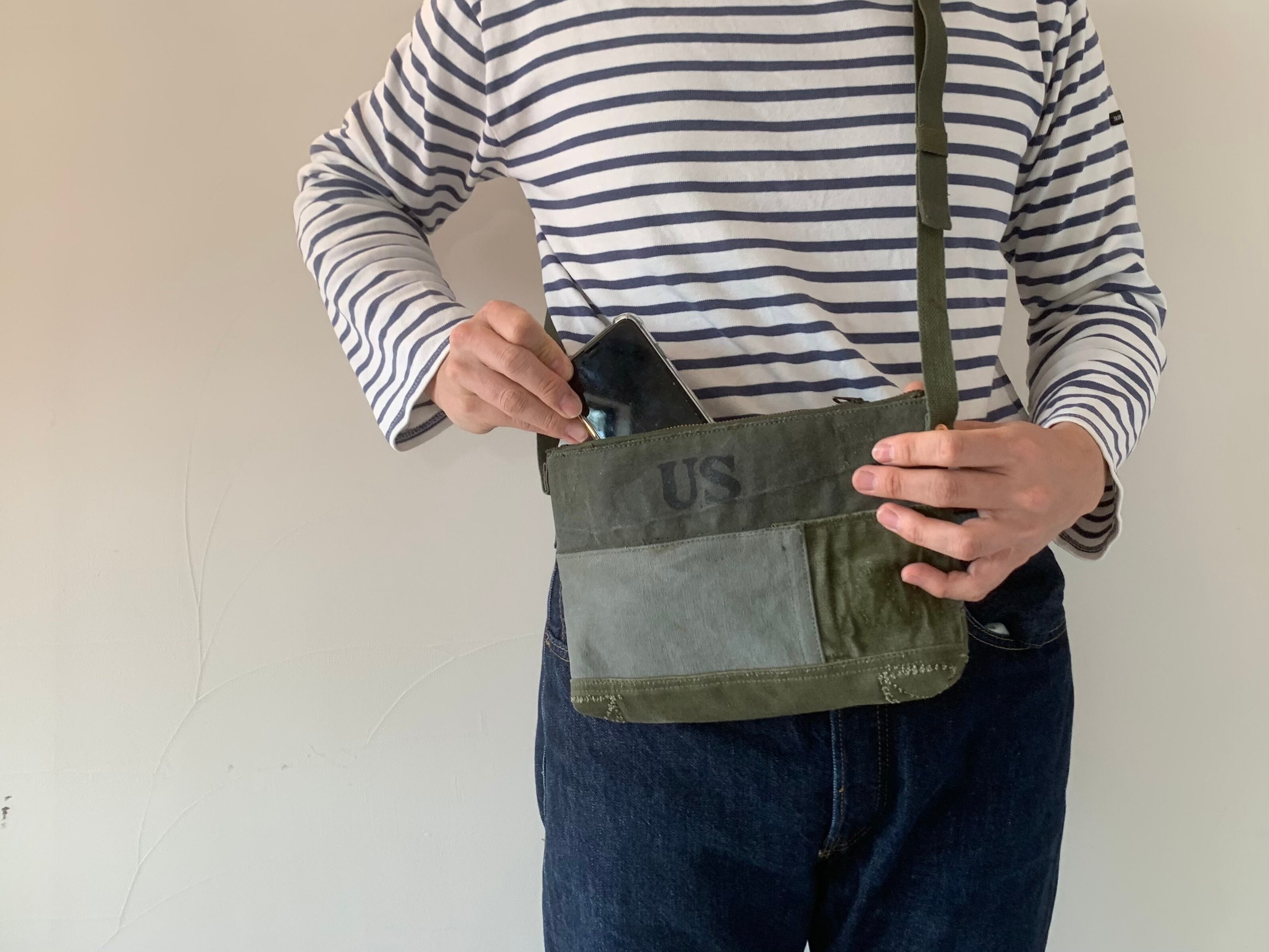 米軍の60〜80年代のミリタリーバッグの端切れをつなぎ合わせパッチワークにしております。