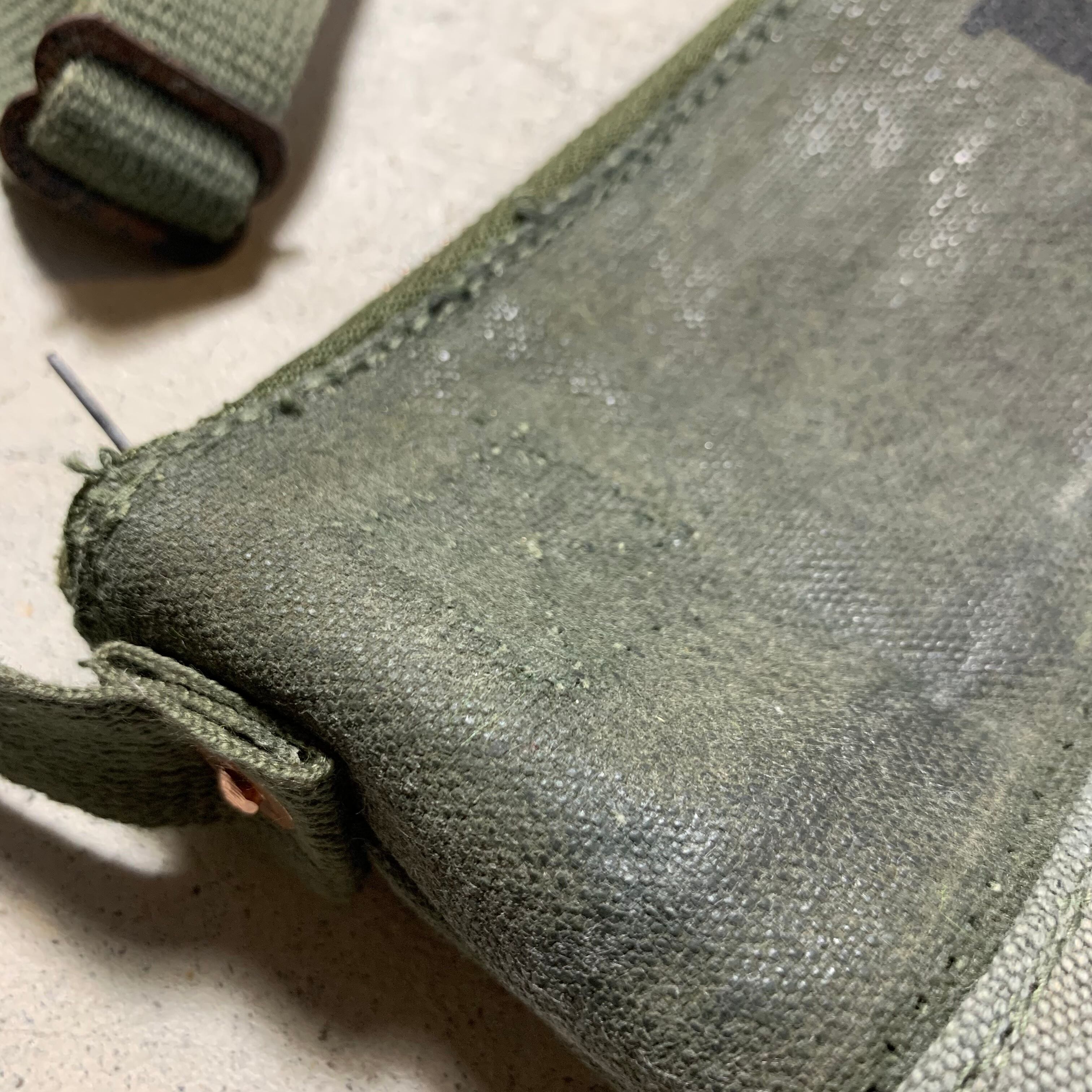 ショルダーベルトは、米軍の60年代頃のギャンバステープ。金具も当時の物で少し錆びているのもヴィンテージ資材の魅力の一つです。