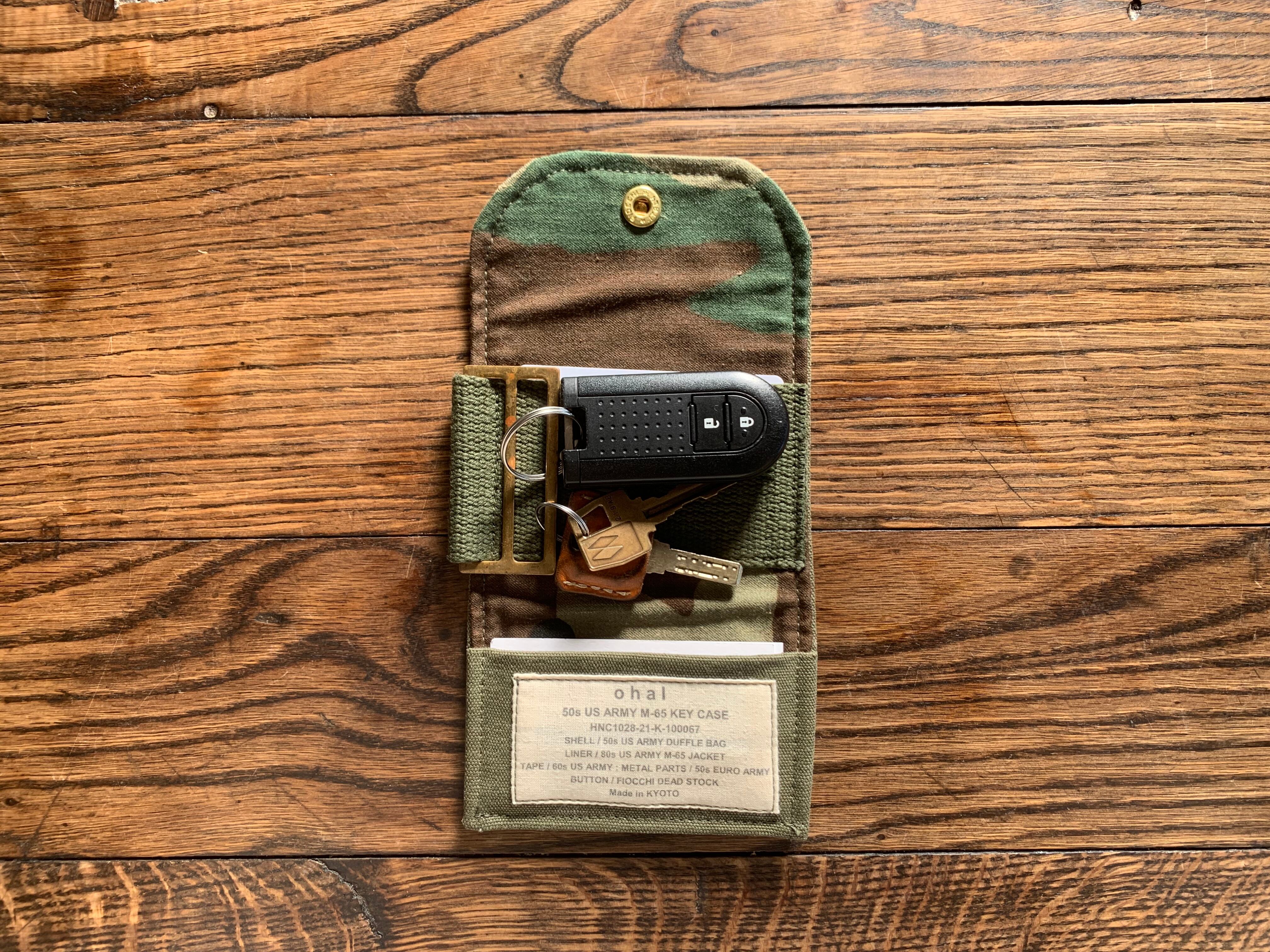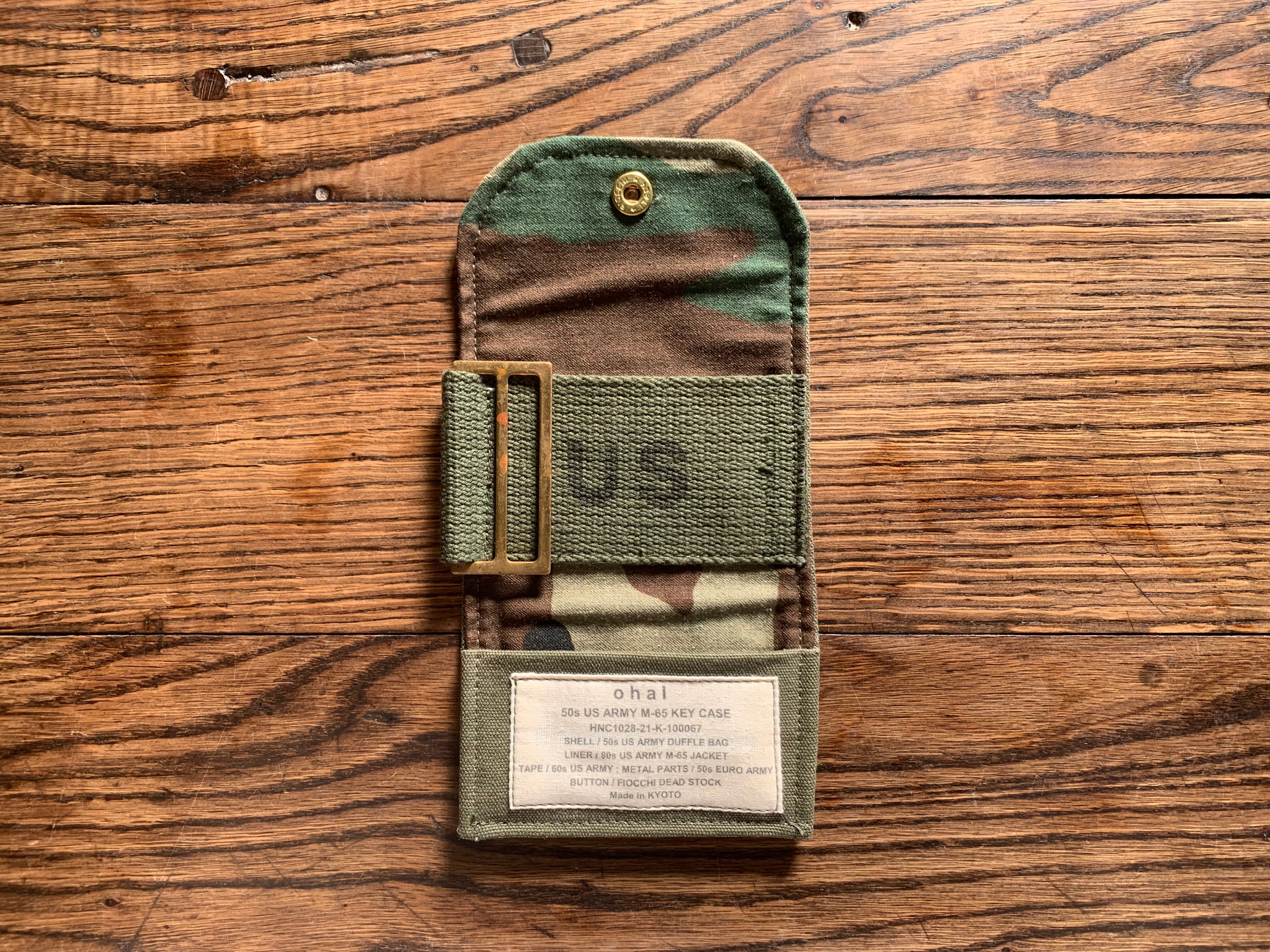 表地は50年代の米軍のダッフルバッグの生地を使用。背面には当時のステンシルの一部が残っております。裏地は80年代のM-65フィールドジャケットのカモフラージュ生地を使用しております。