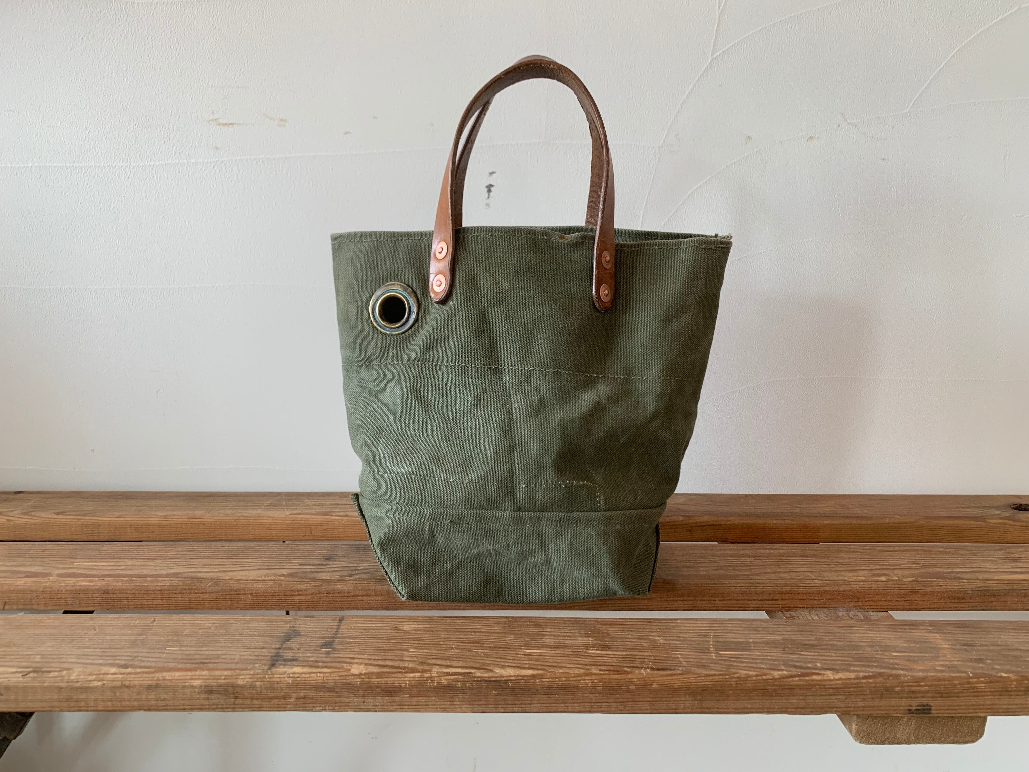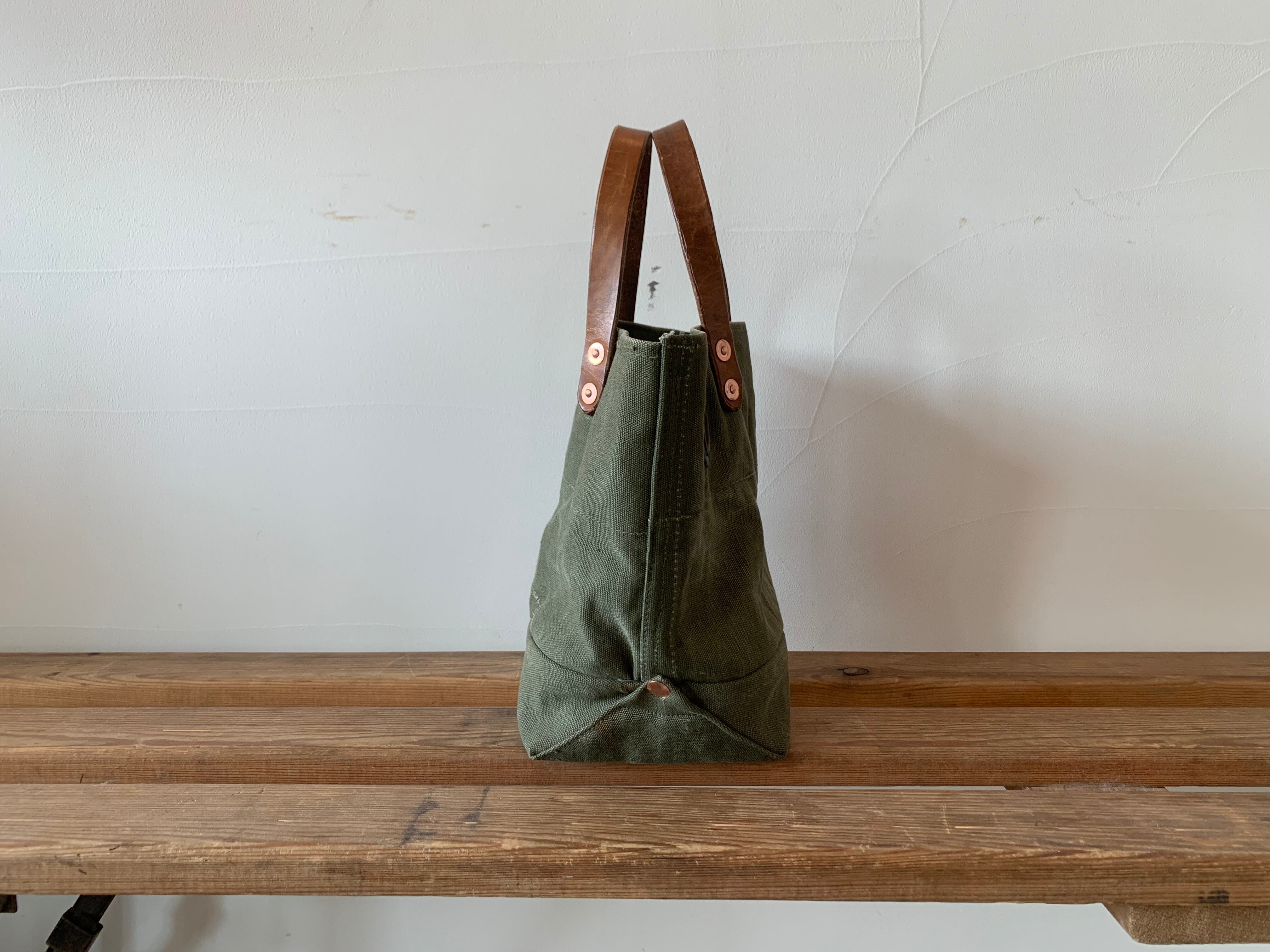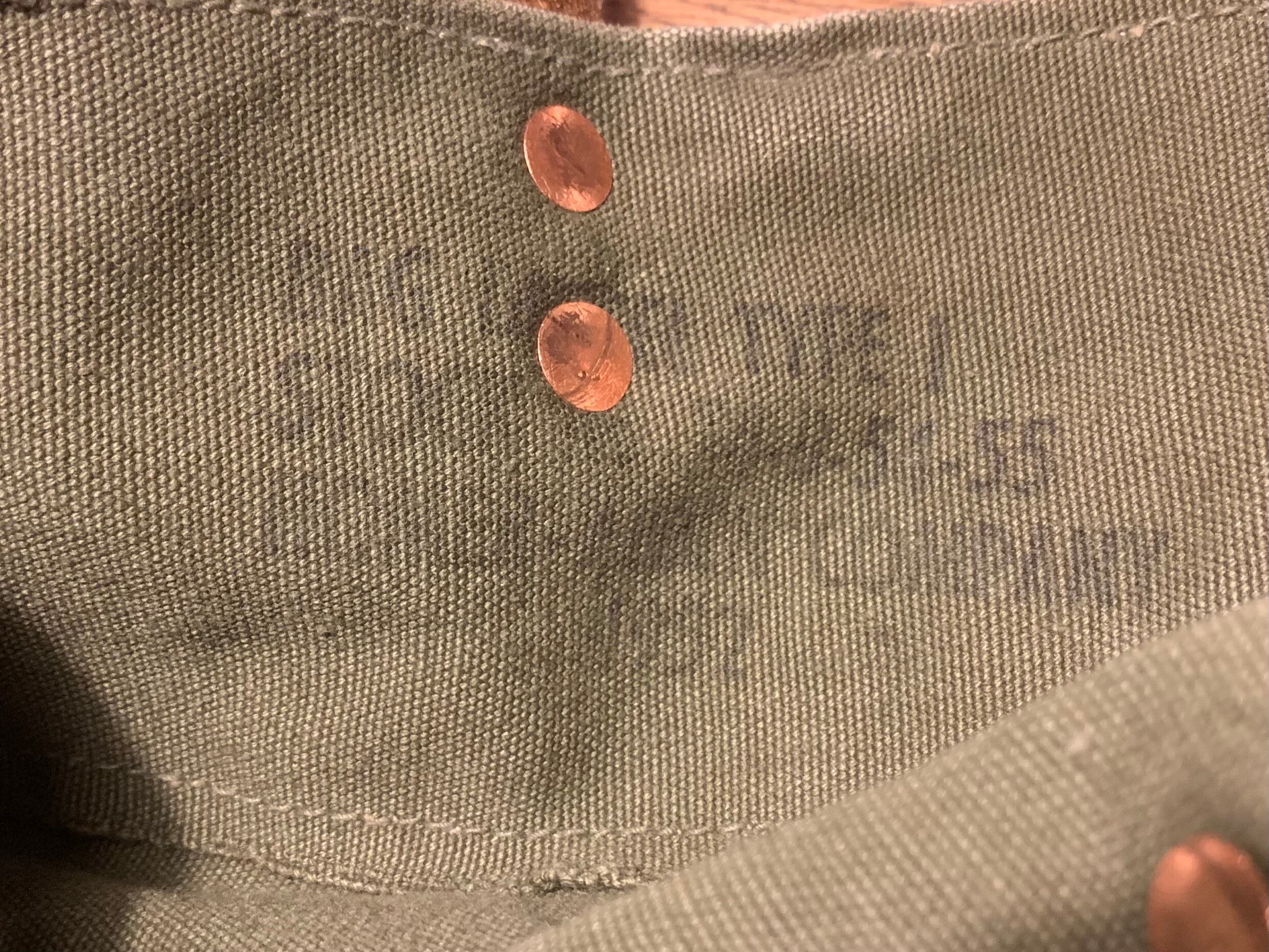 ボディーは、米軍の50年代のダッフルバッグの生地です。雰囲気抜群の経年変化をしておりカッコいい逸品。内側にミルスペックも残っており、1952年に納入されたことがわかります。