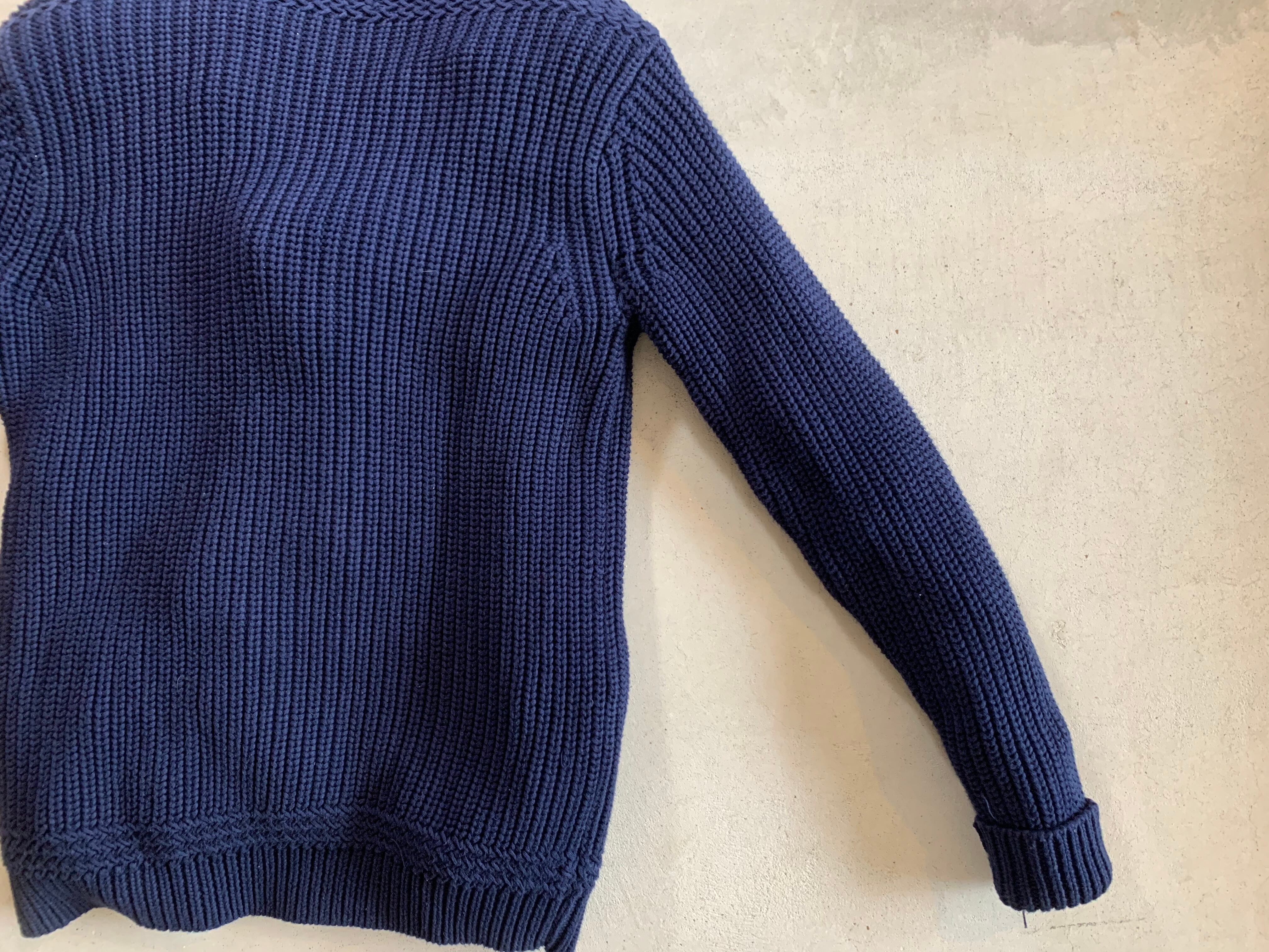 カラーはダークネイビー。素材がコットンなのでチクチクもしないので着やすい一着。