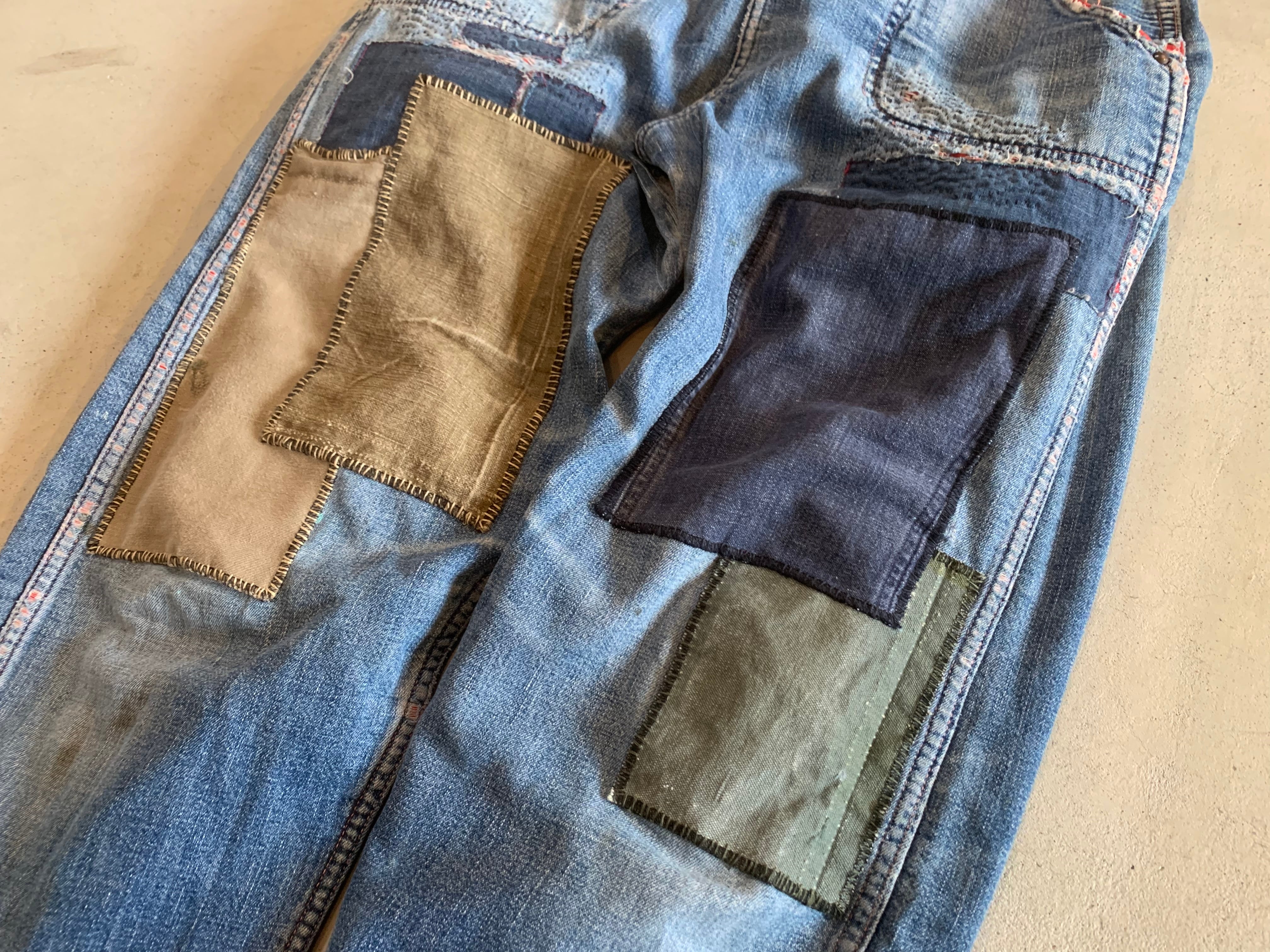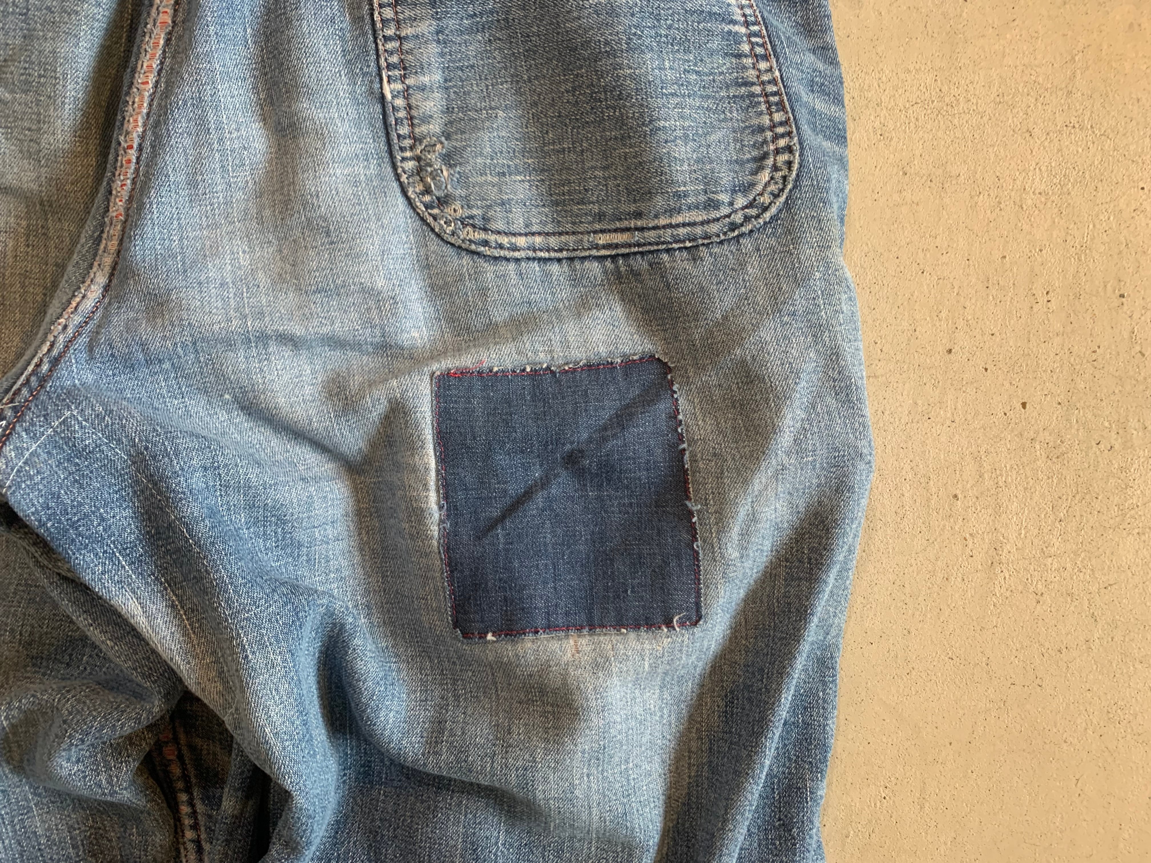 両膝がボロボロになっていたため、当て布をしております。こちらの当て布は右足のベージュの当て布は、30年代スウェーデン軍のプリズナーパンツの端切れ。その上に縫い付けられている麻素材のカーキの当て布は50年代のチェコ軍のバッグの端切れ。左足のカーキの当て布は80年代の米軍のフライヤーズキットバッグの端切れ。デニムの当て布は60年代のデニムパンツの端切れとなっております。全てヴィンテージの生地を使うことでかなり雰囲気のある一本に仕上がっております。