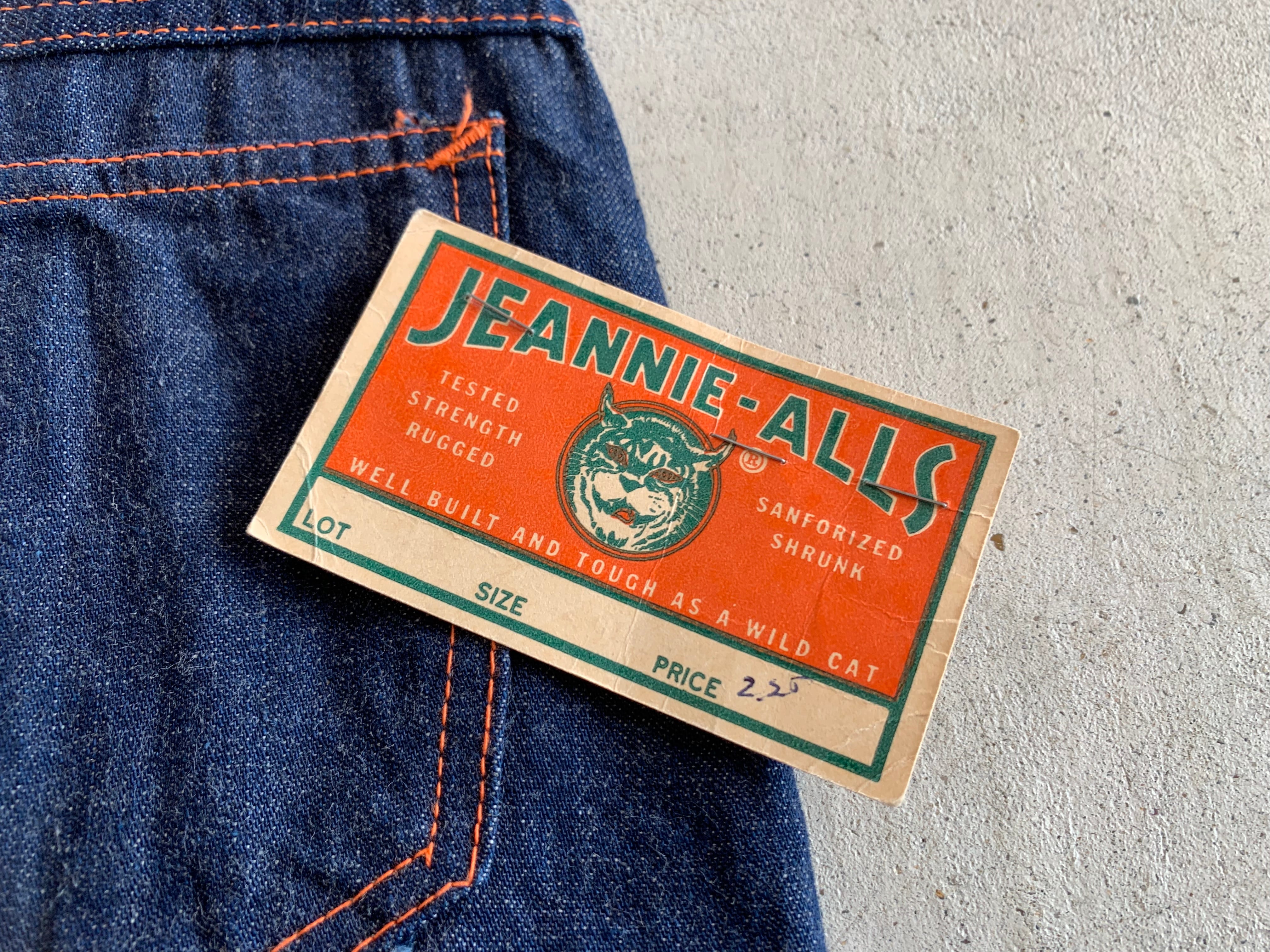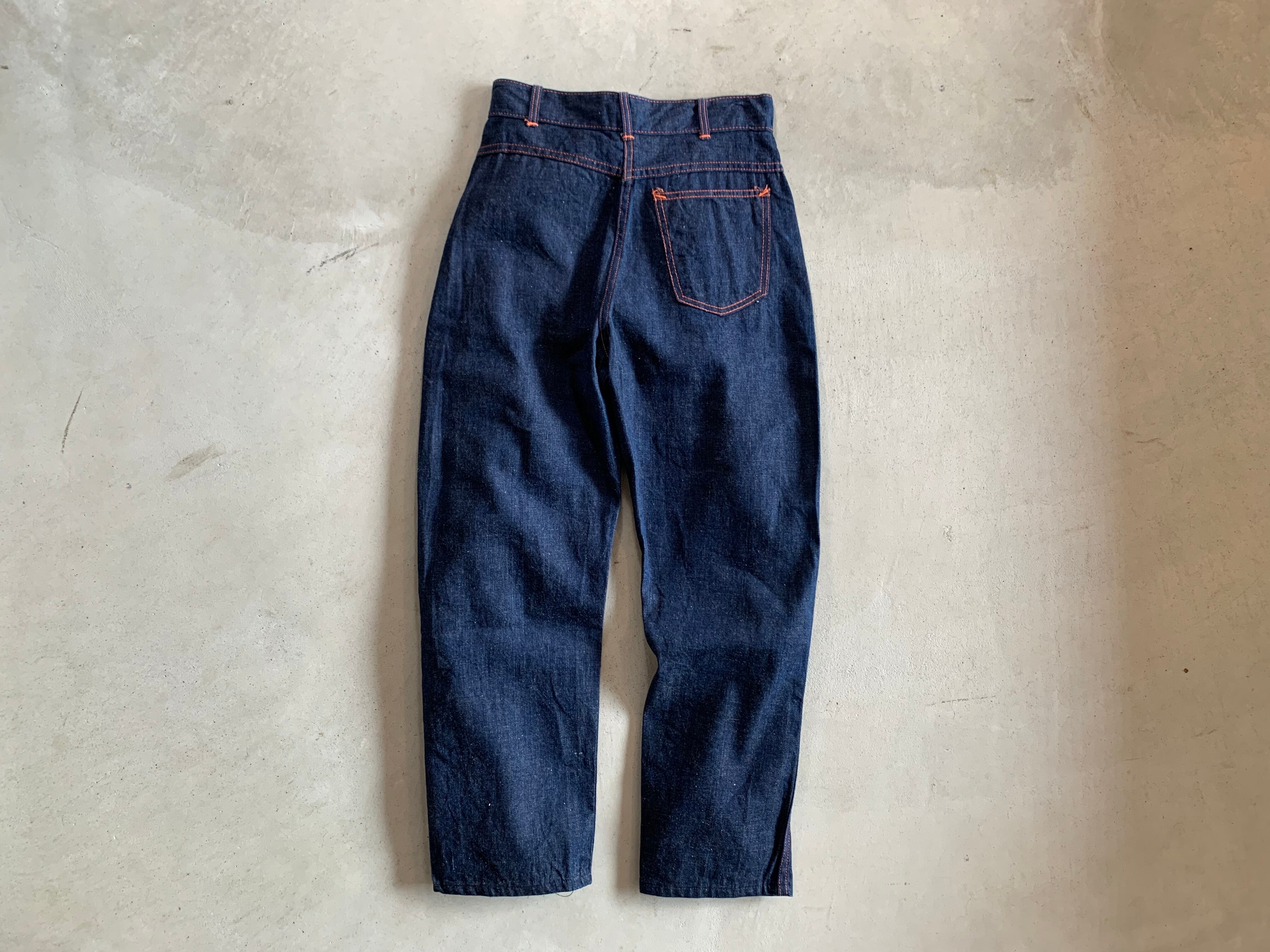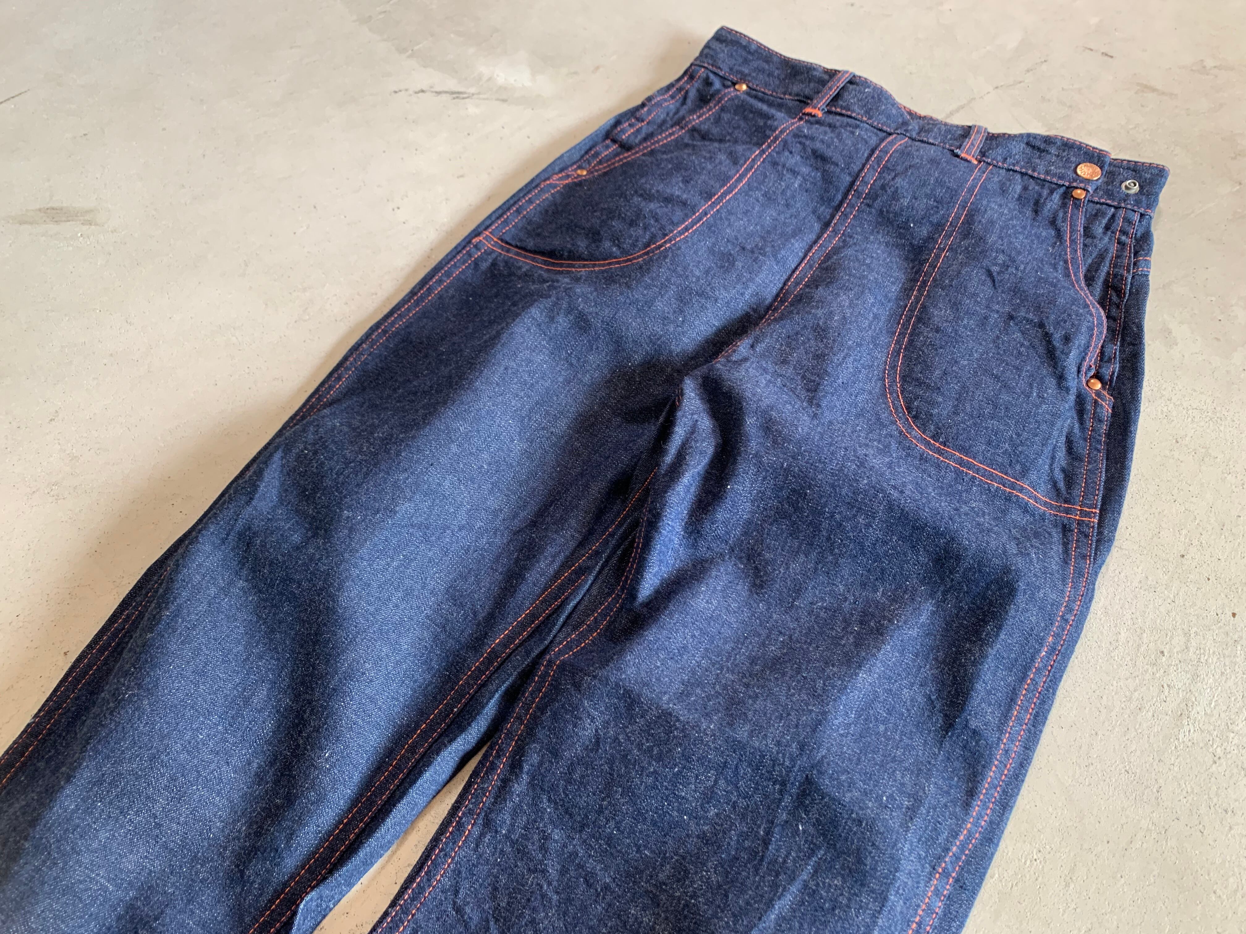 ライトオンスのデニムに赤が強めのオレンジ色のステッチが特徴的な、おそらく60年代のランチパンツ。ジップはSERVAL。