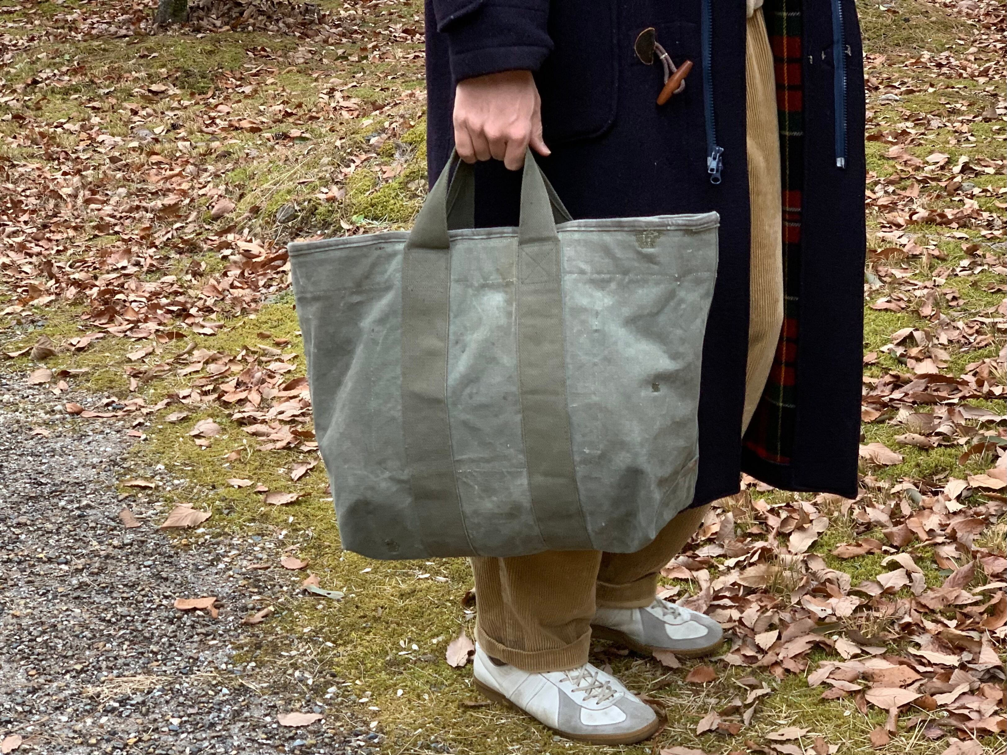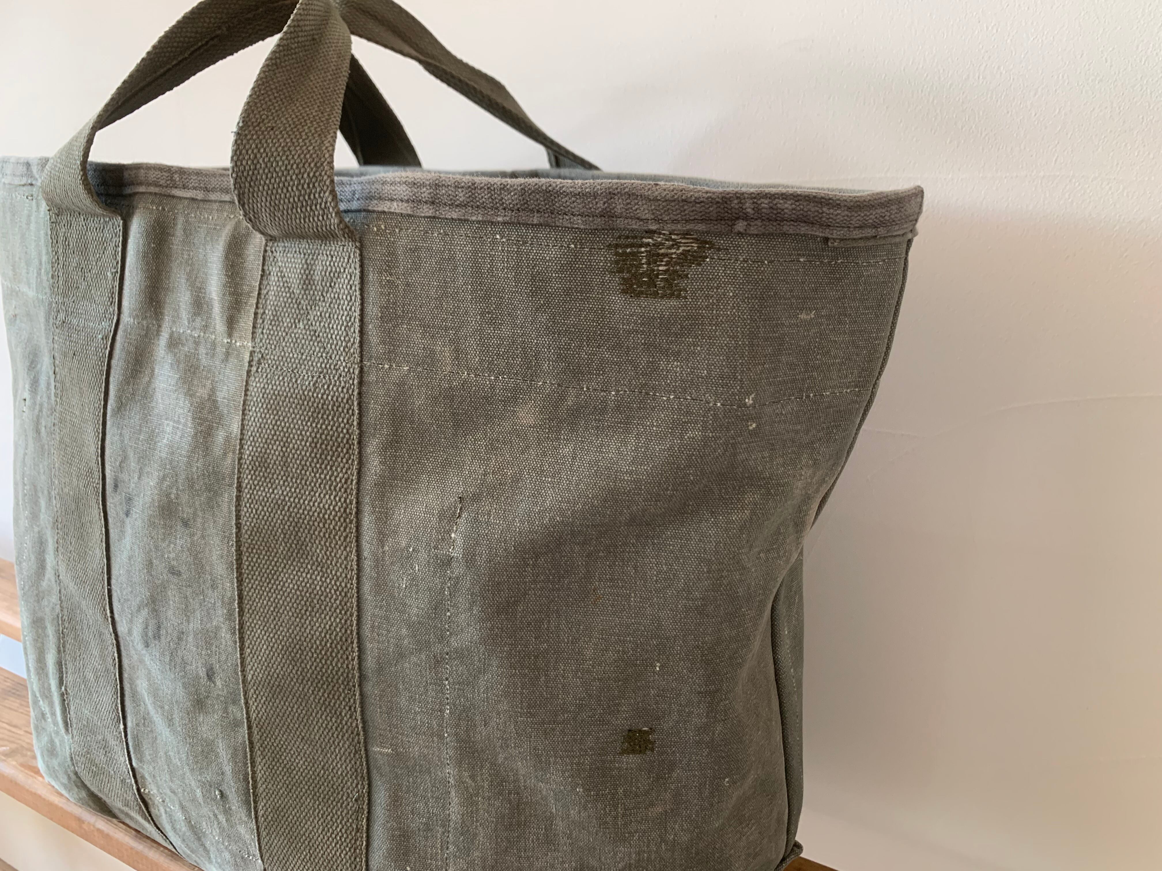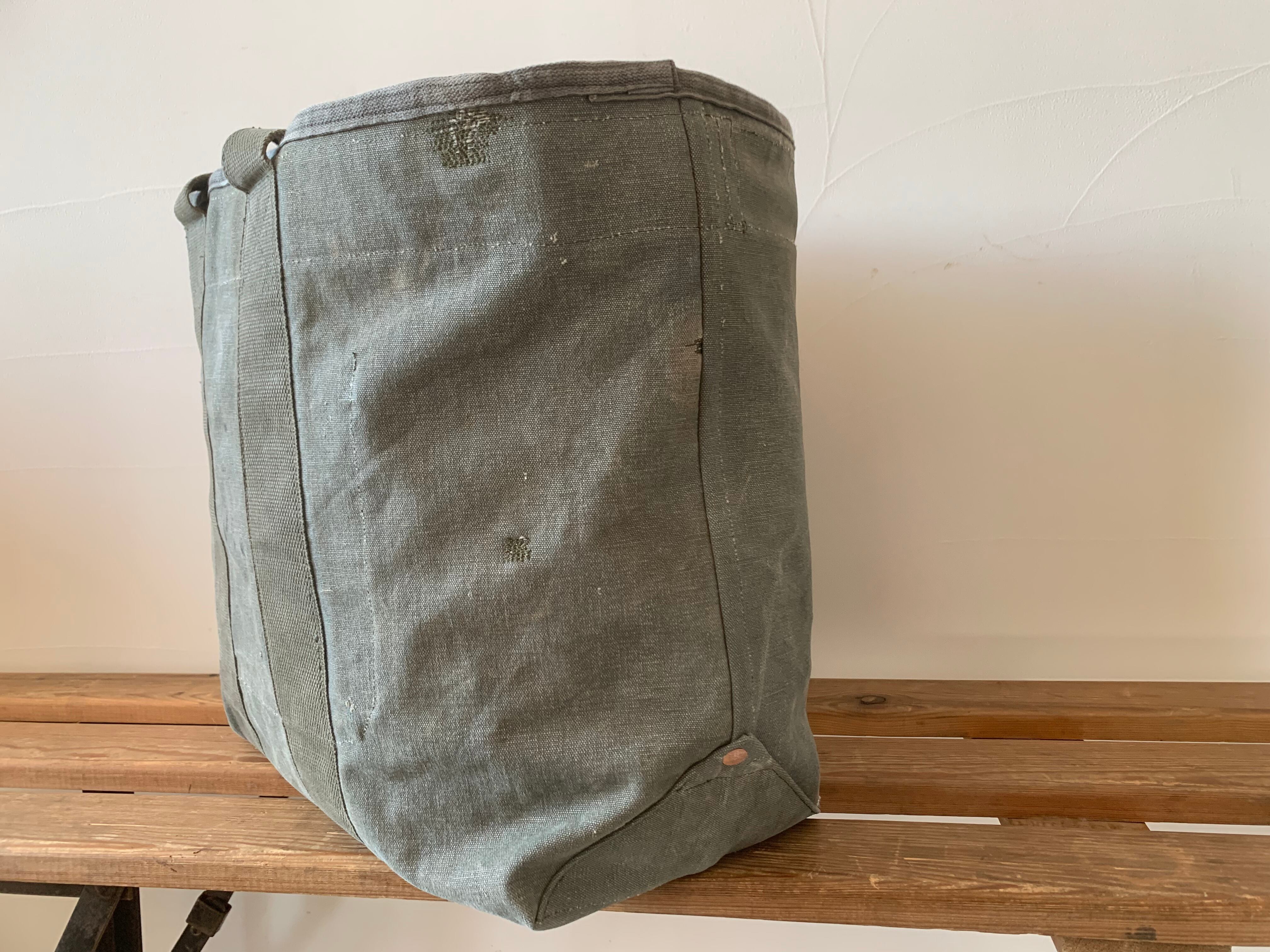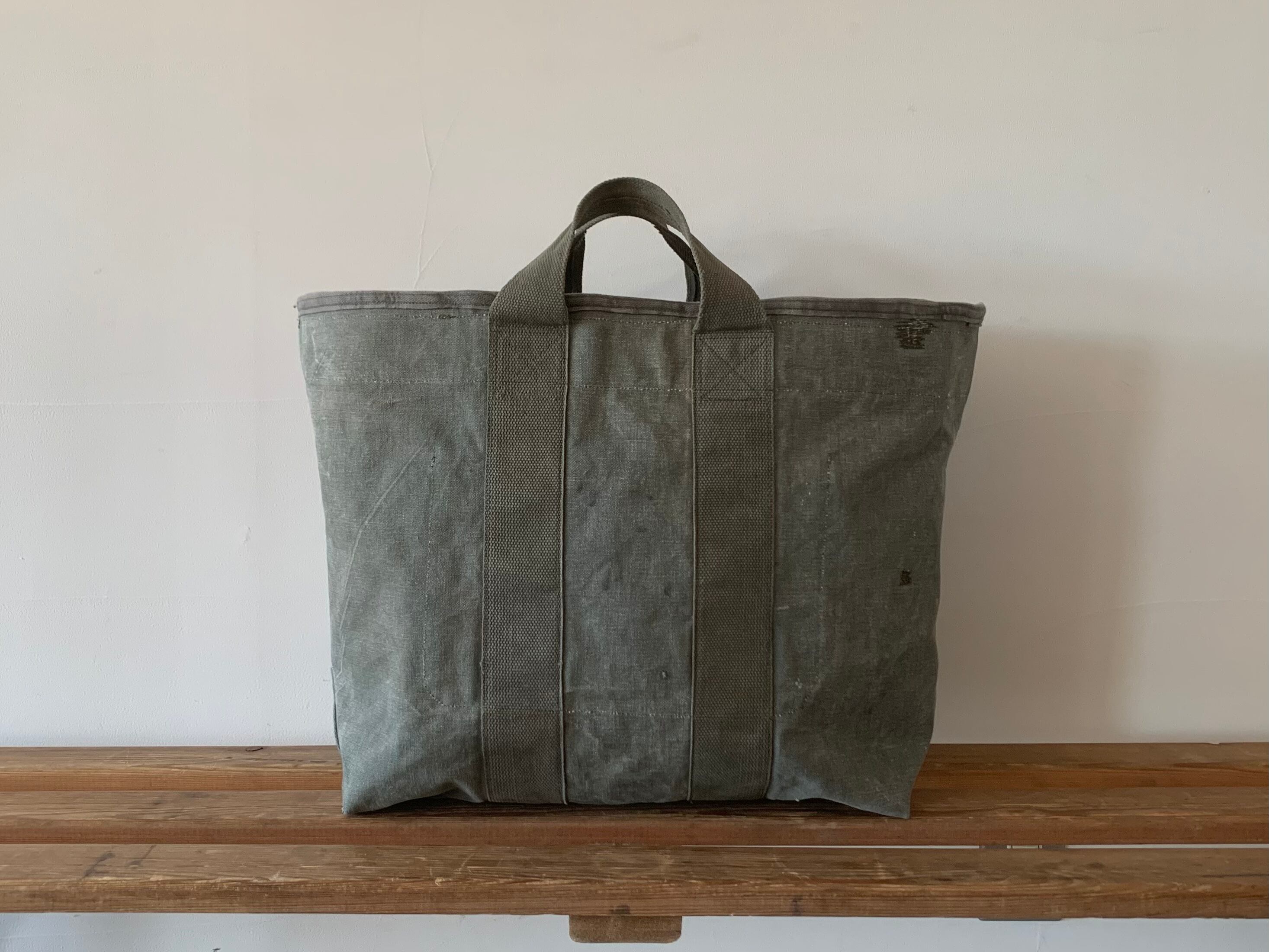 80年代の米軍、フライヤーズキットバッグを解体し、トートバッグを作成しました。開口部のパイピングテープもこのバッグに使われていた物を外し、付け直しております。開口部内側の補強用のキャンバステープは、50年代のフランス軍の物になります。