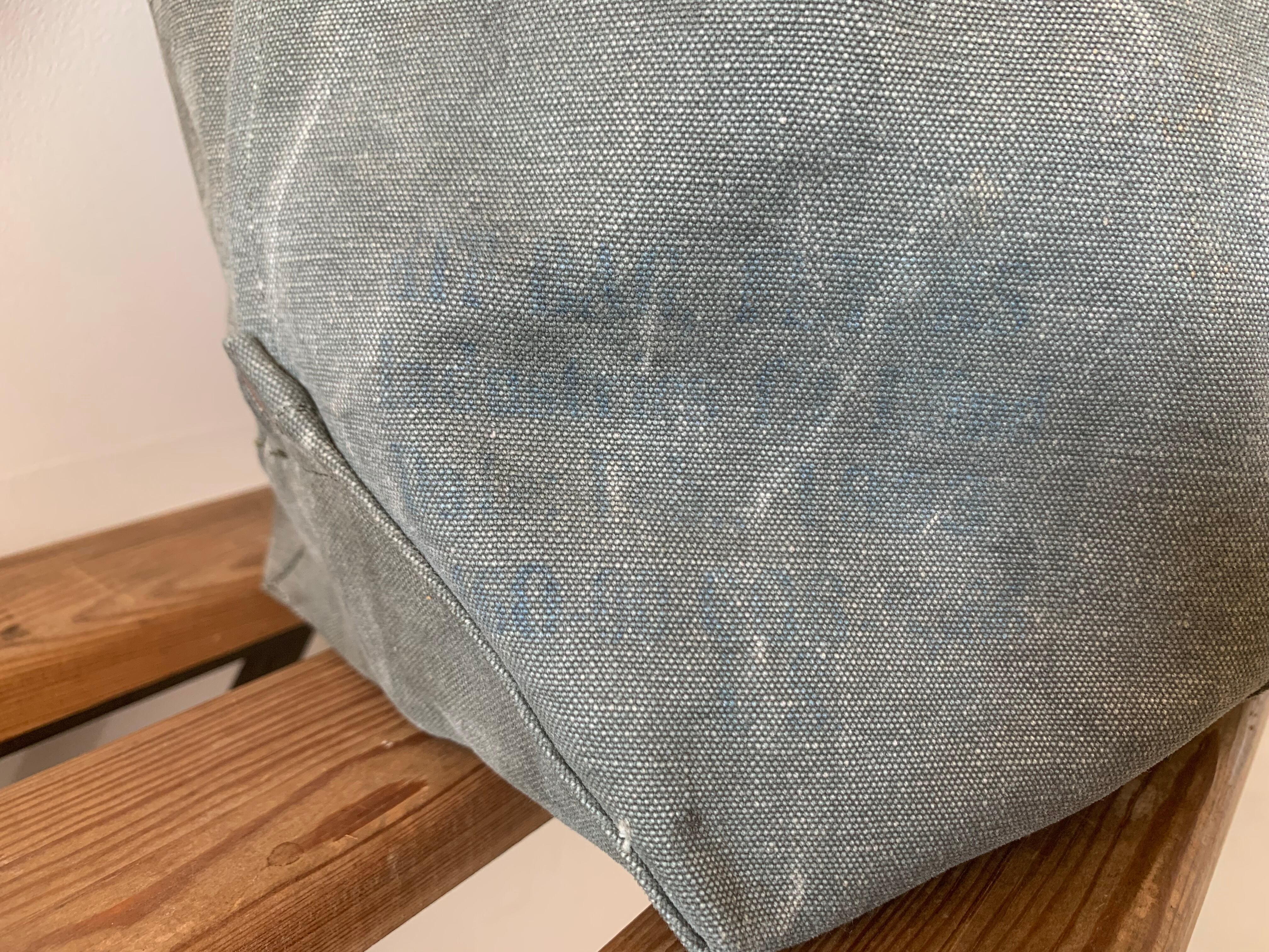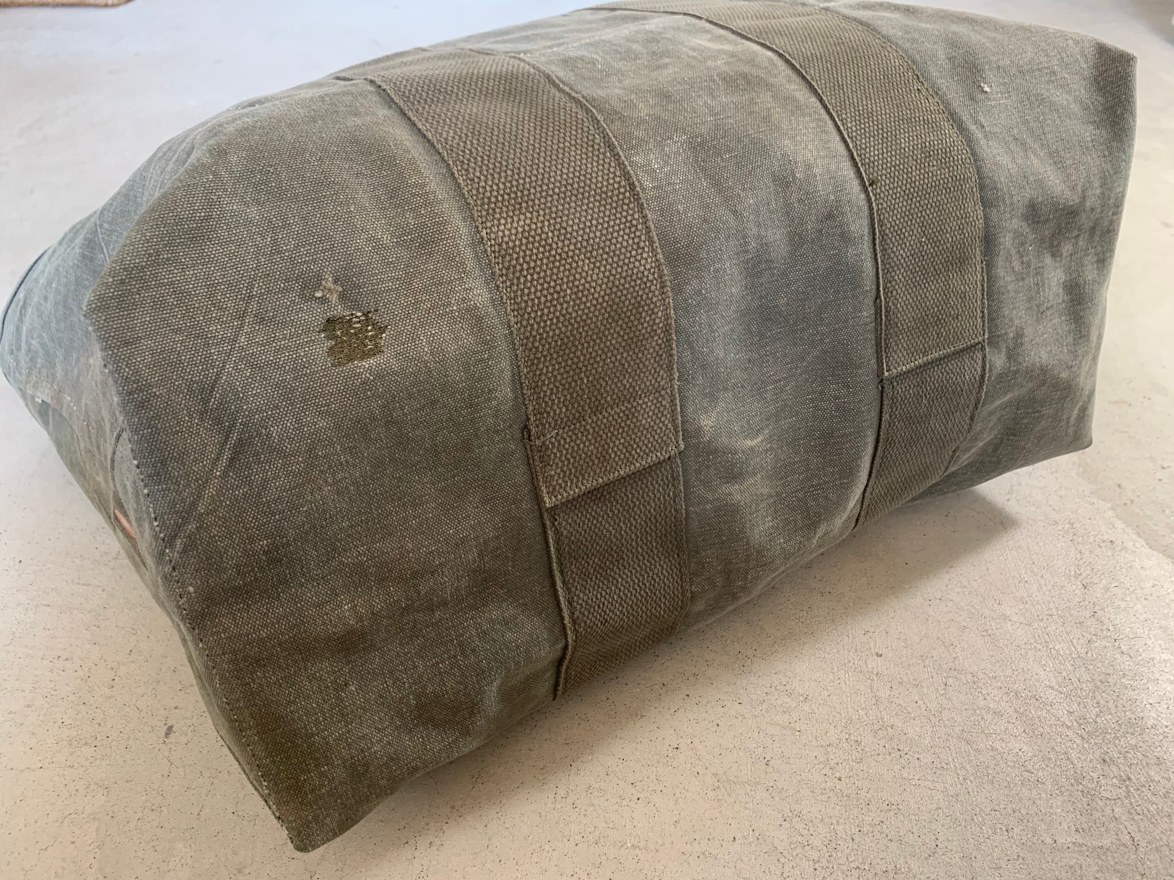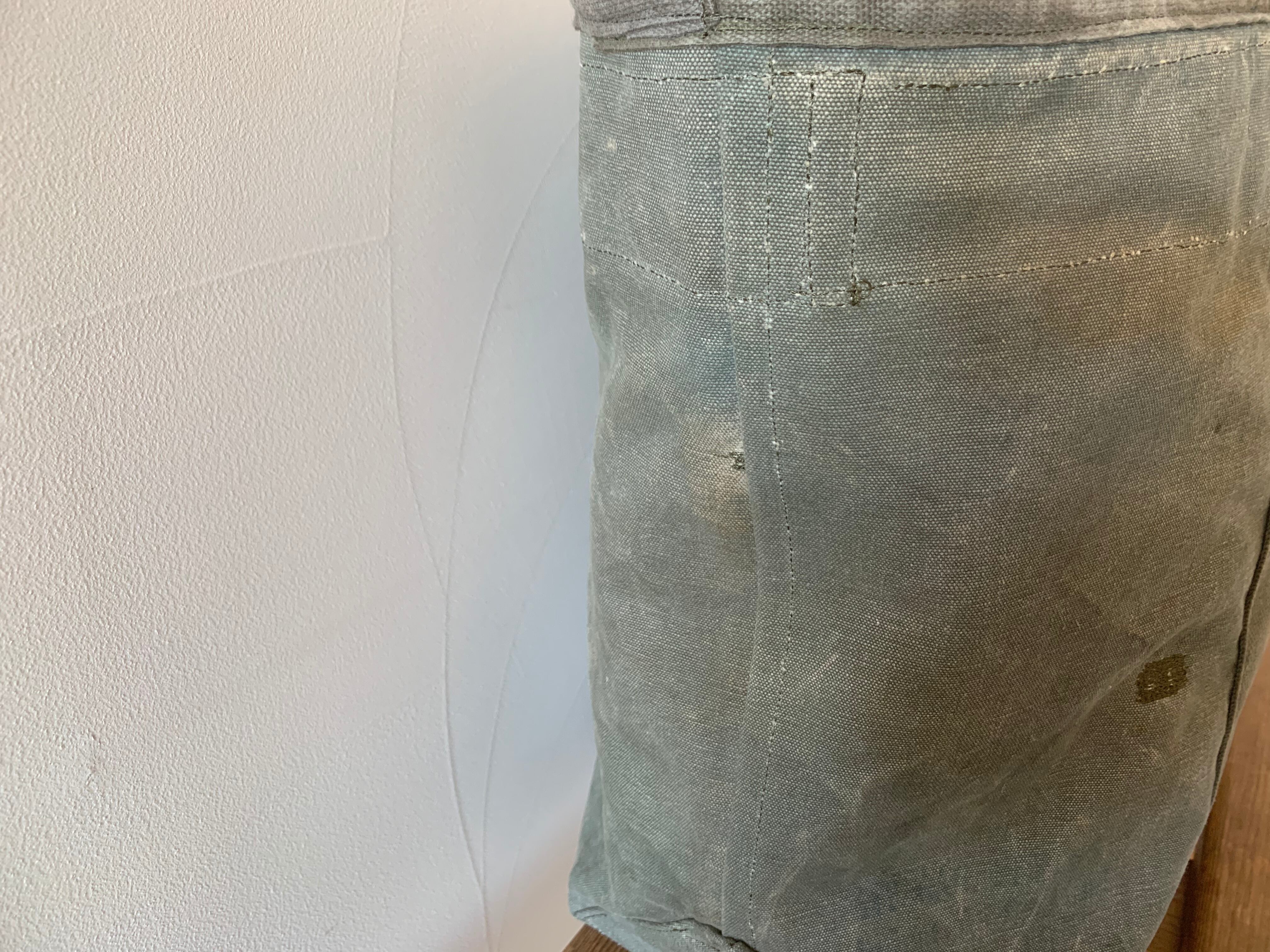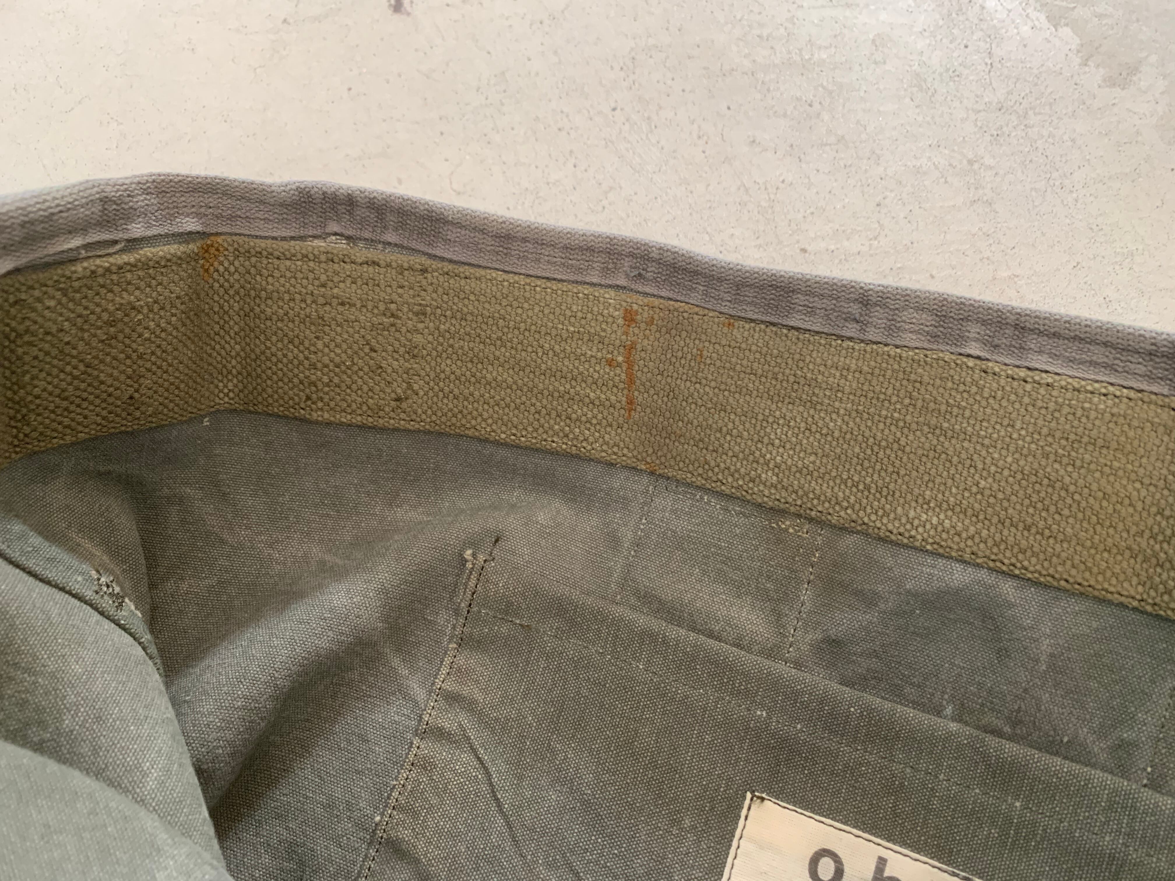 80年代の米軍、フライヤーズキットバッグを解体し、トートバッグを作成しました。開口部のパイピングテープもこのバッグに使われていた物を外し、付け直しております。開口部内側の補強用のキャンバステープは、50年代のフランス軍の物になります。