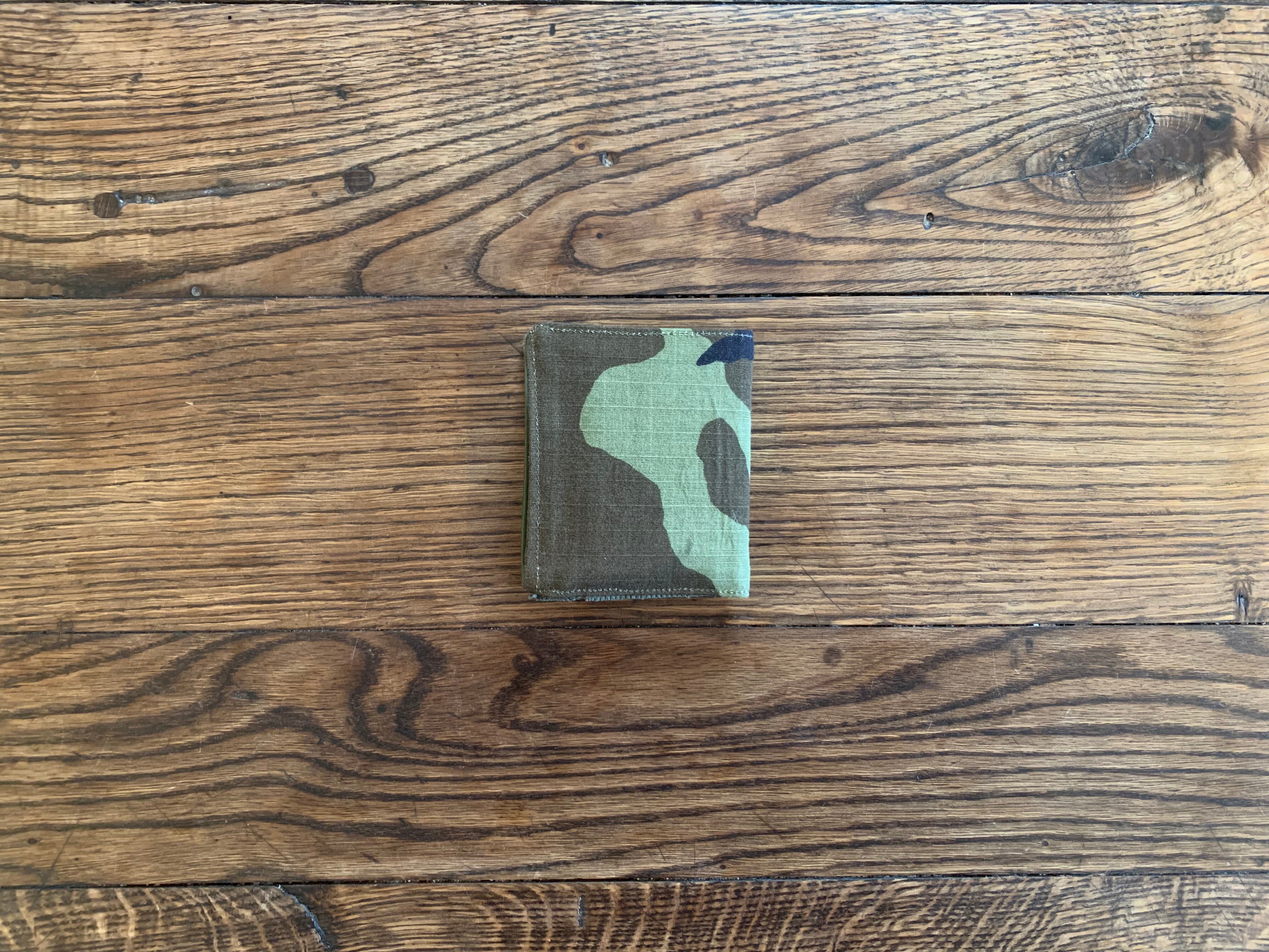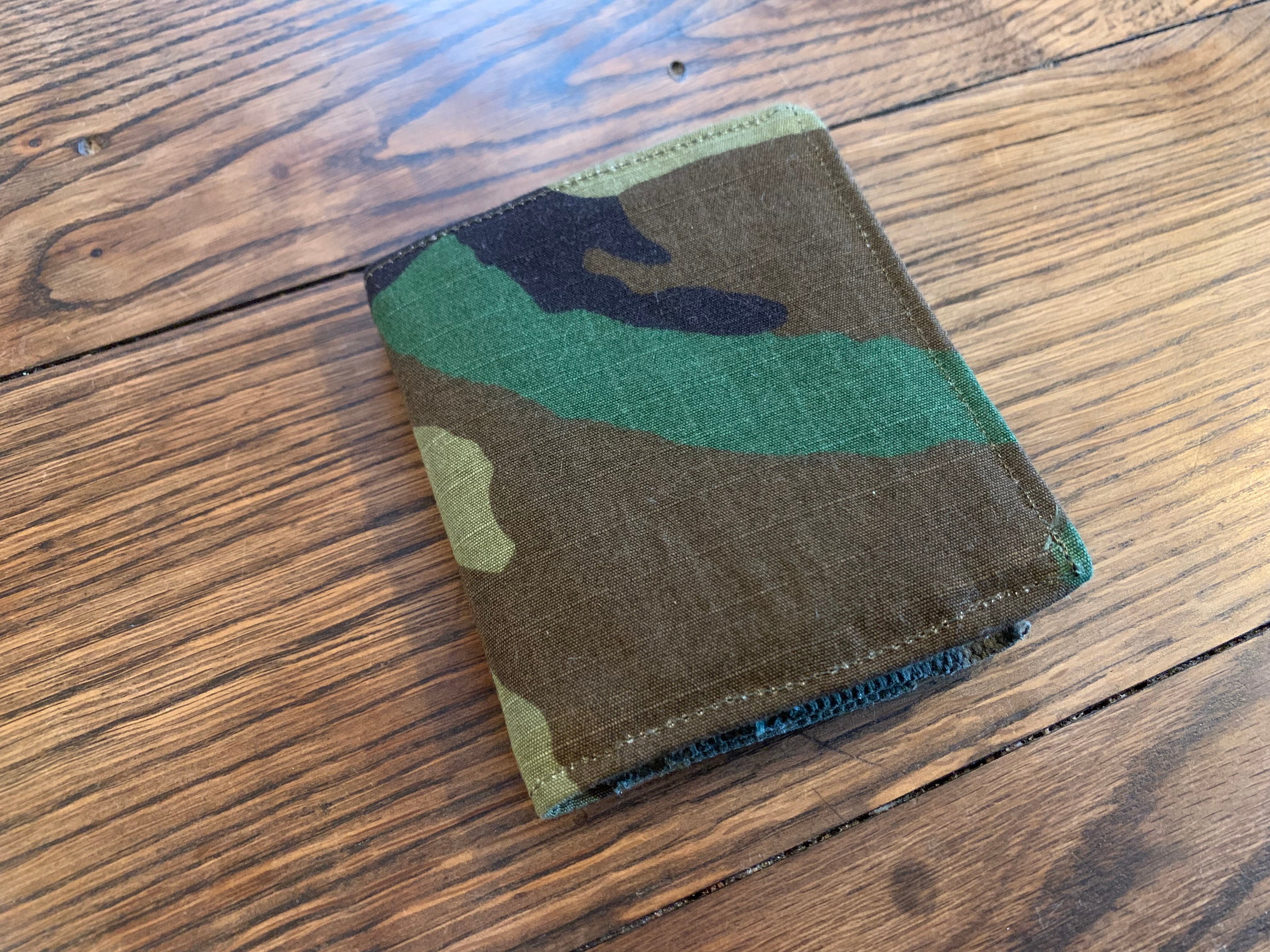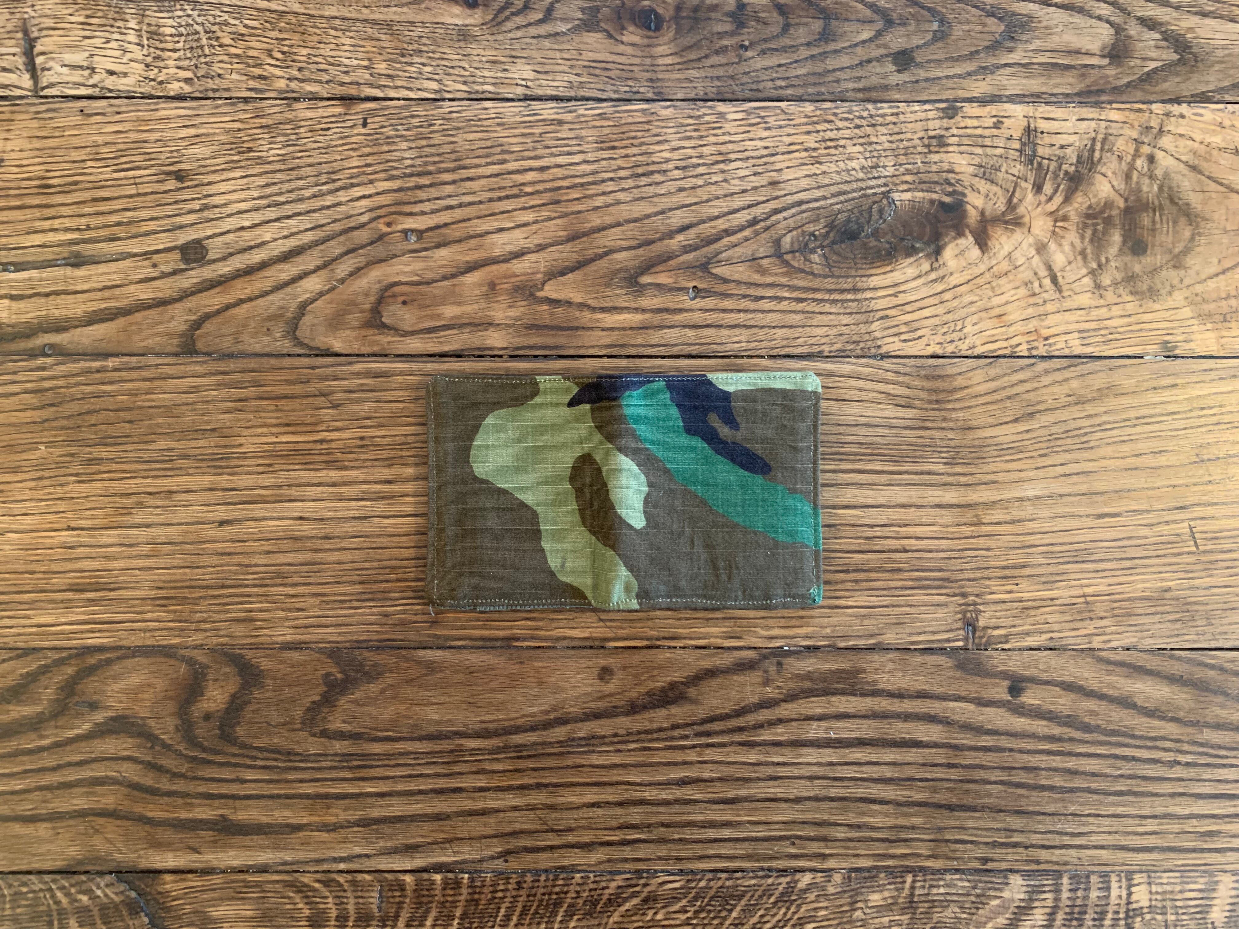 外側は米軍の90年代、ウッドランドカモのリップストップ生地のパンツを使用。内側は米軍の80年代のM-65 FIELD JACKETの裏地の生地です。