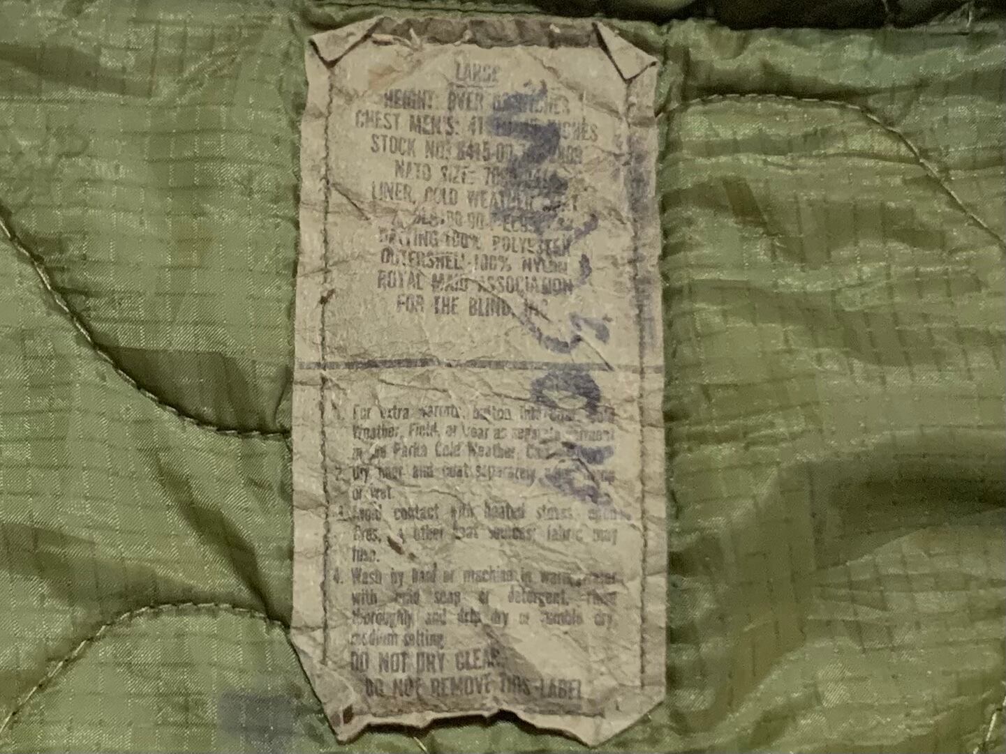 ボディーは米軍に1990年に納入された、M-65ジャケットの中に取り付ける、キルティングライナー。