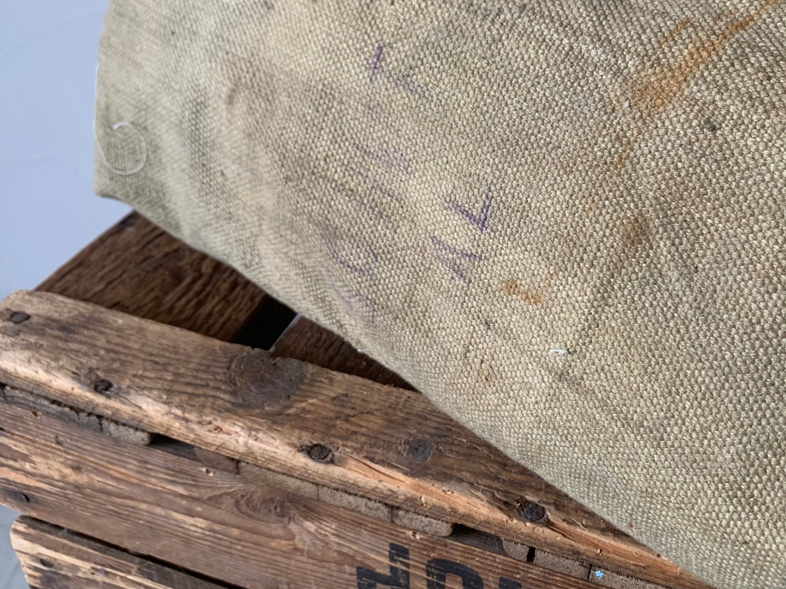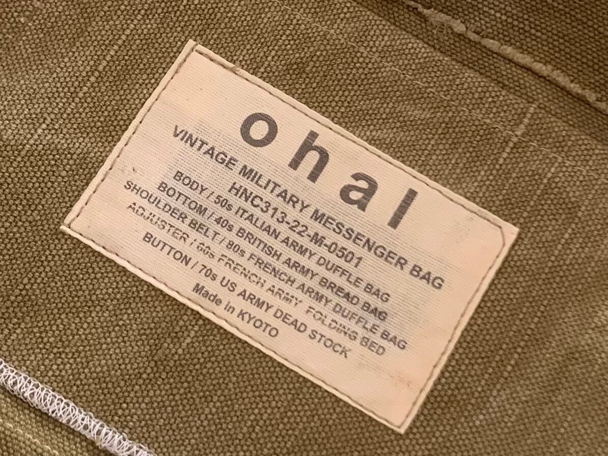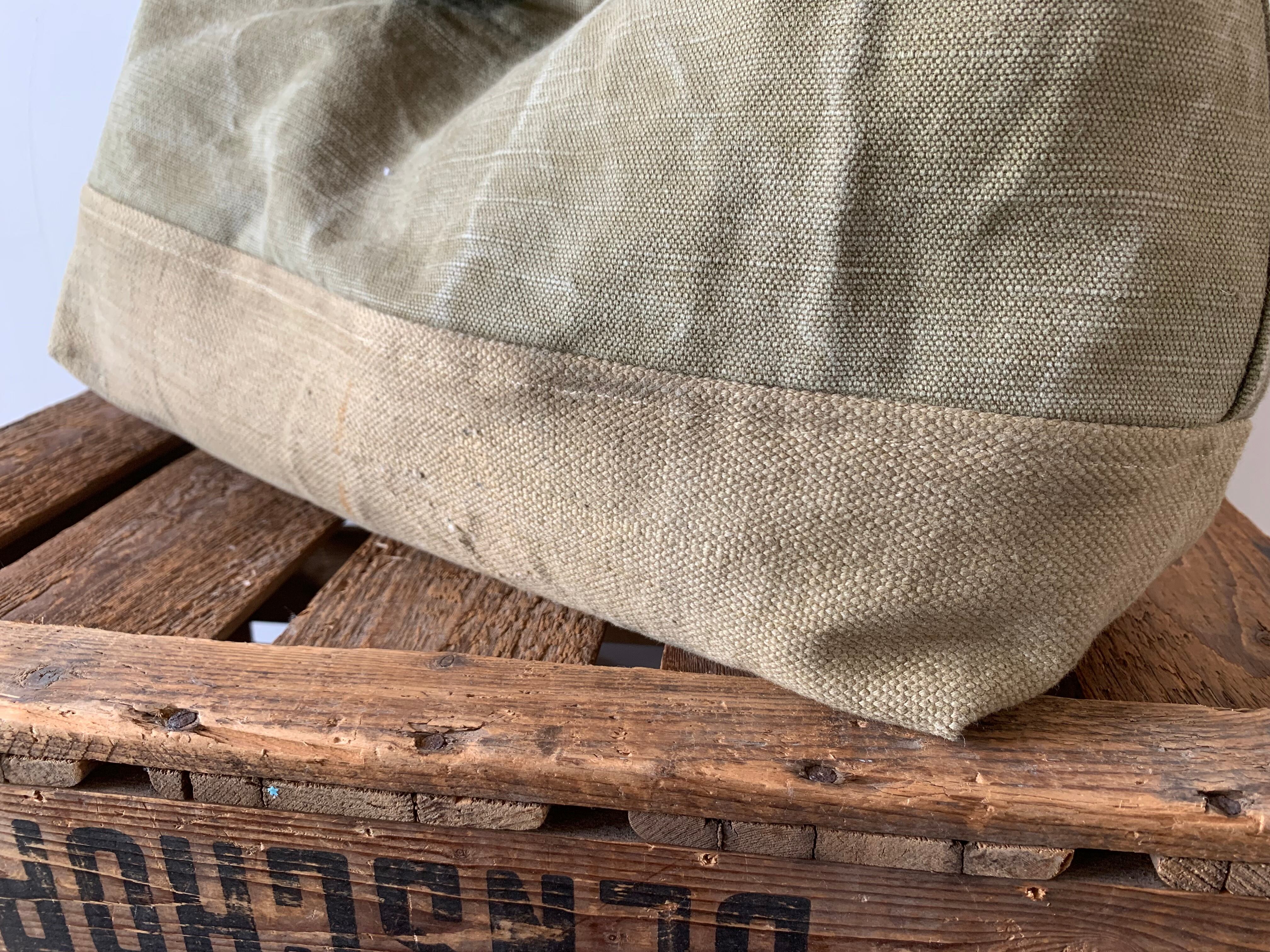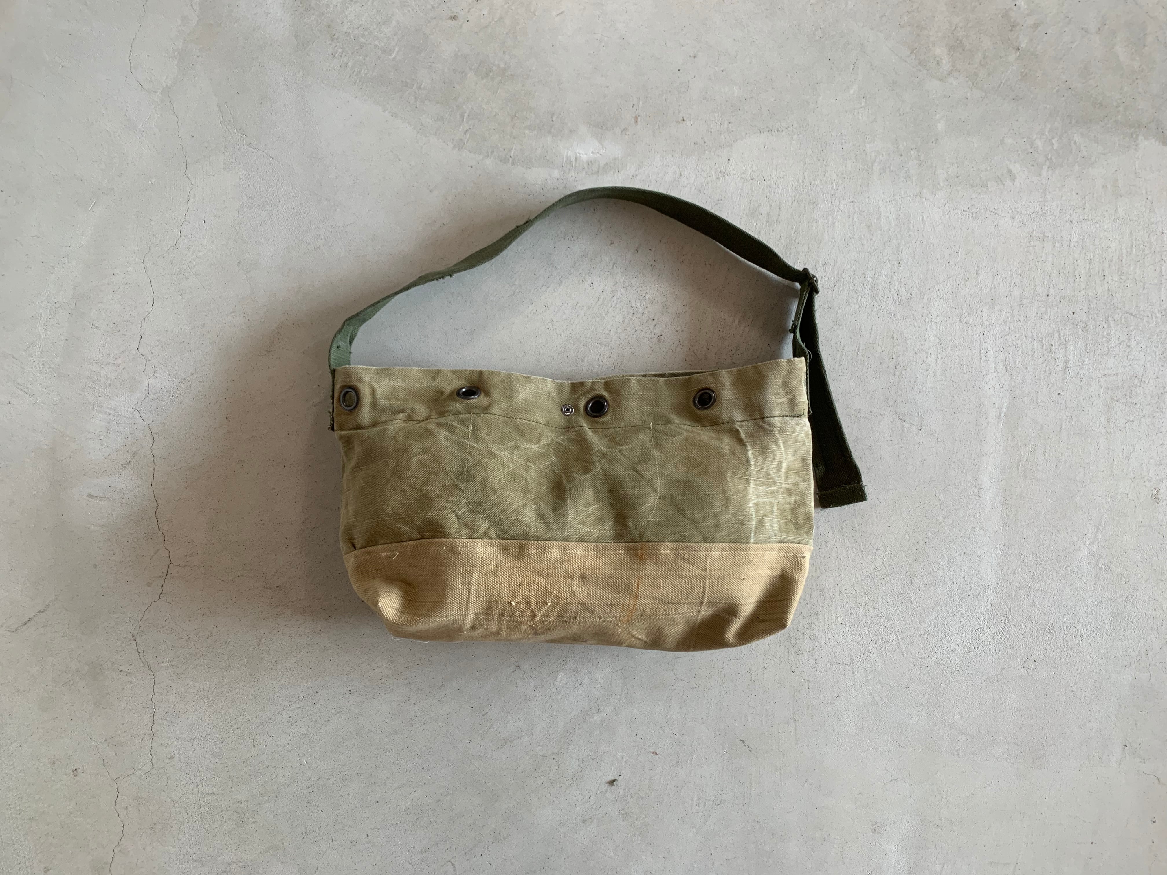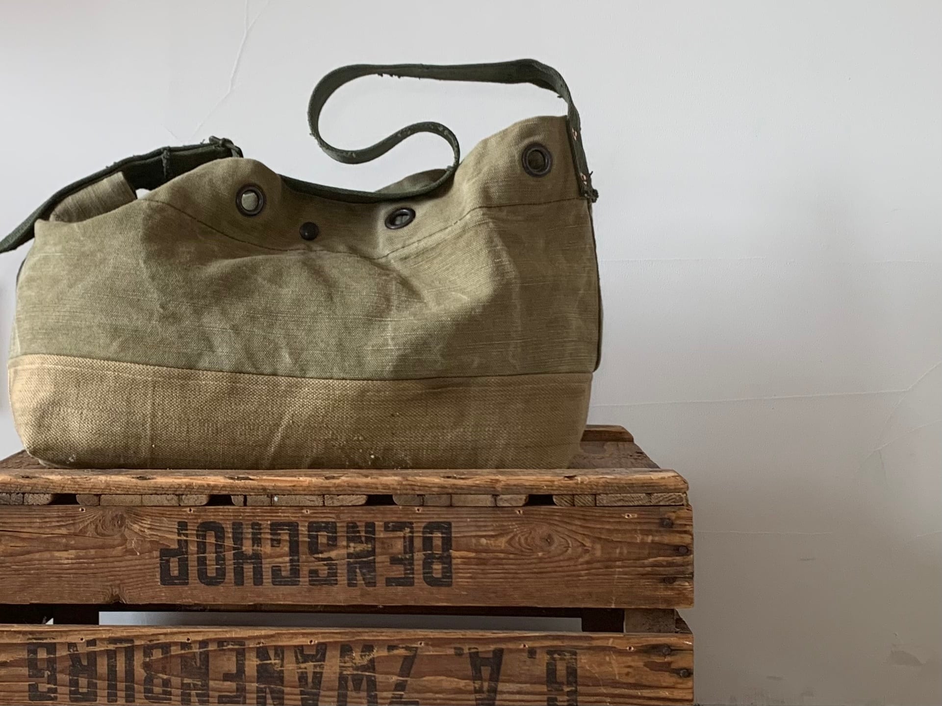 メインのボディーは50年代のイタリア軍のダッフルバッグ、ボトムには40年代イギリス軍のブレッドショルダーバッグの生地を組み合わせてます。ショルダーベルトは80年代フランス軍のダッフルバッグにつけられていたキャンバスショルダーベルト。ショルダーベルトのアジャスターは60年代頃のフランス軍のフォールディングベッドに使用されていた物。開口部に取り付けたドットボタンは、70年代にアメリカ軍に納入されたデッドストックのドットボタンです。